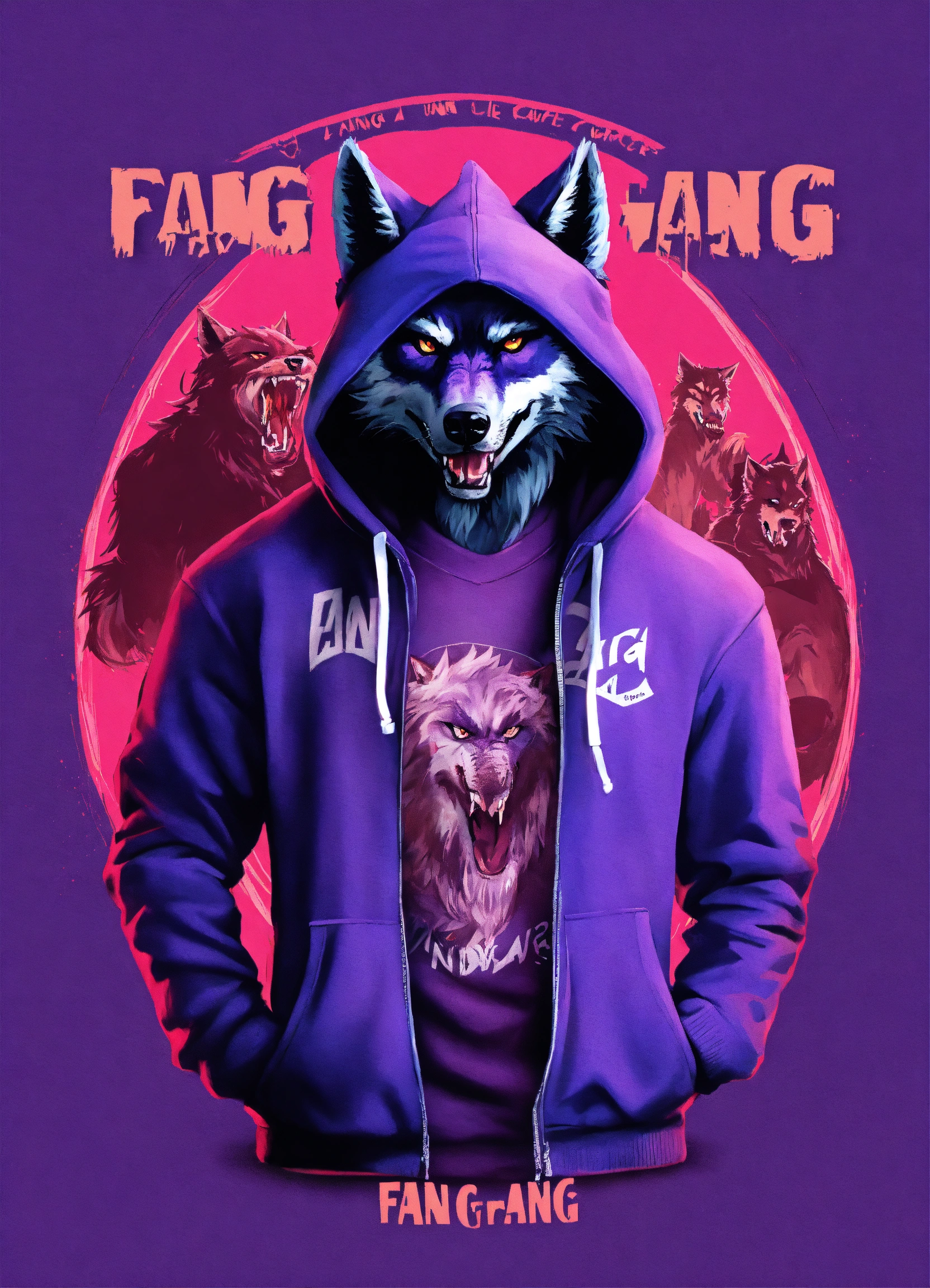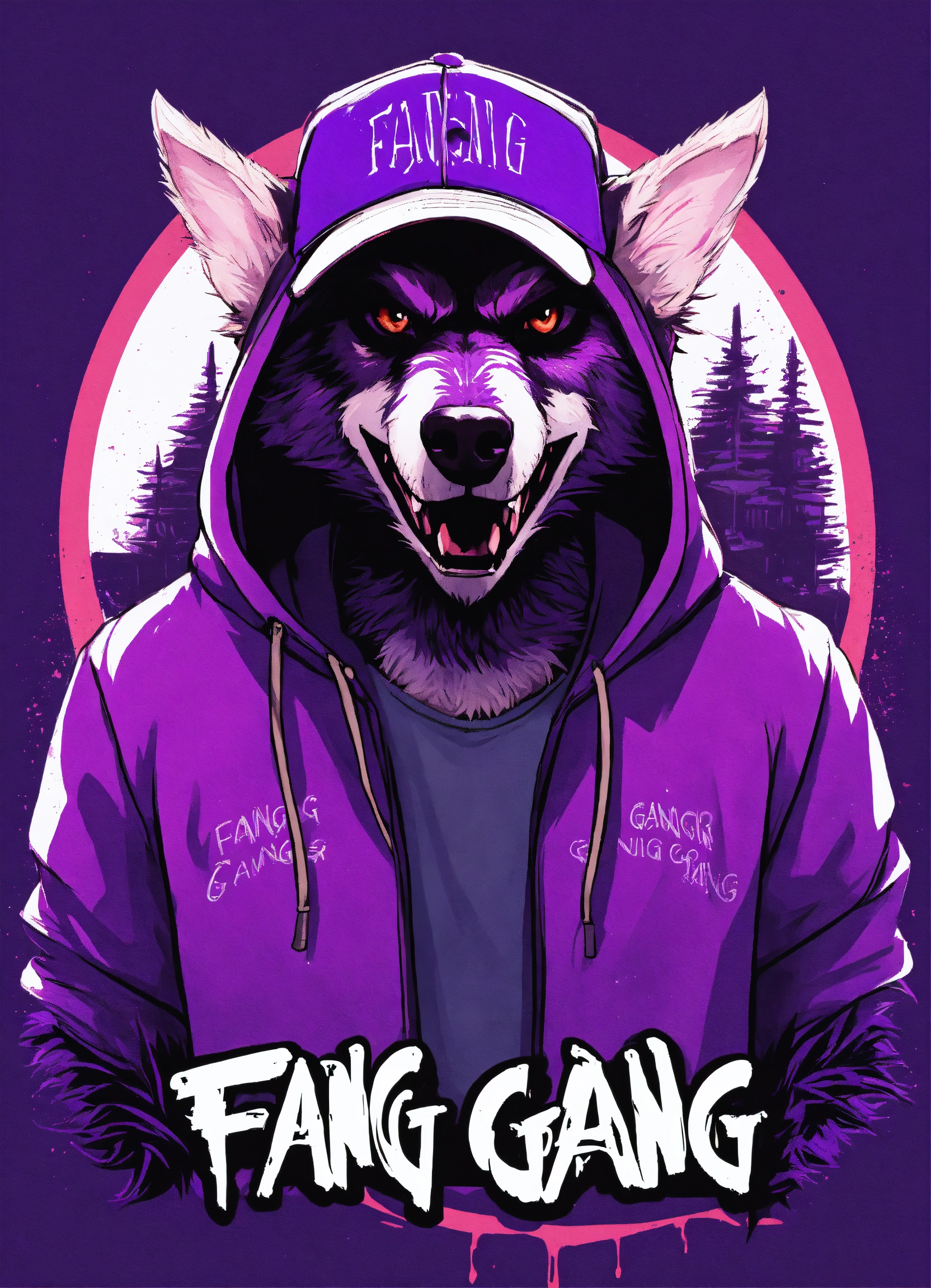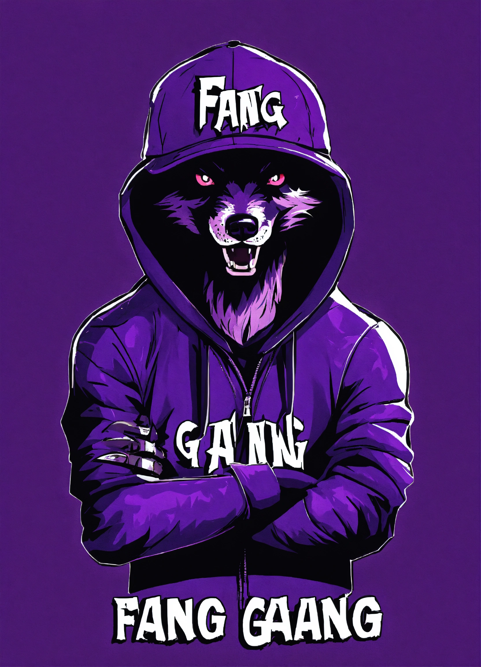 Gangster werewolf in hoodie and baseball cap with the words fang gang in purple