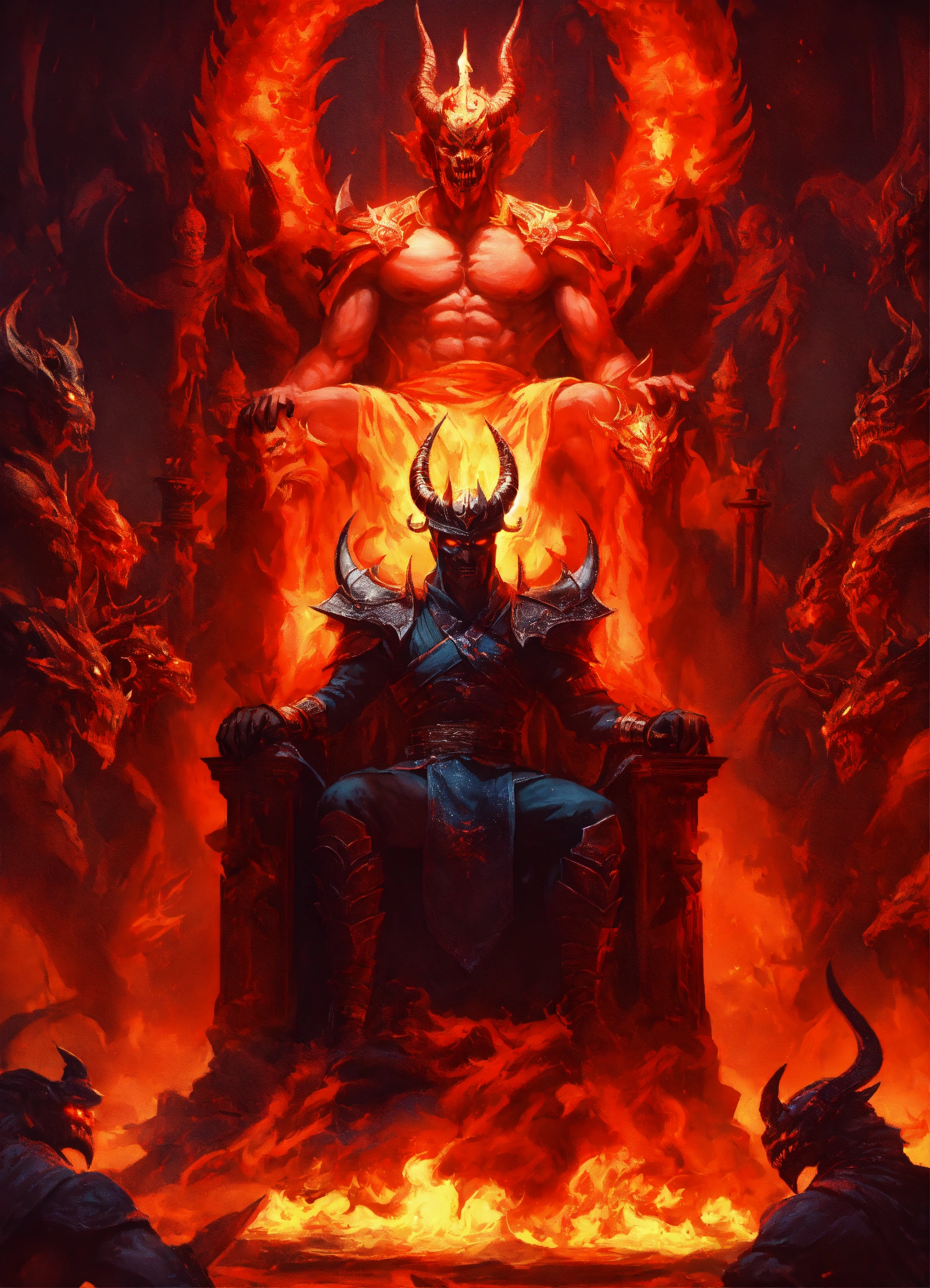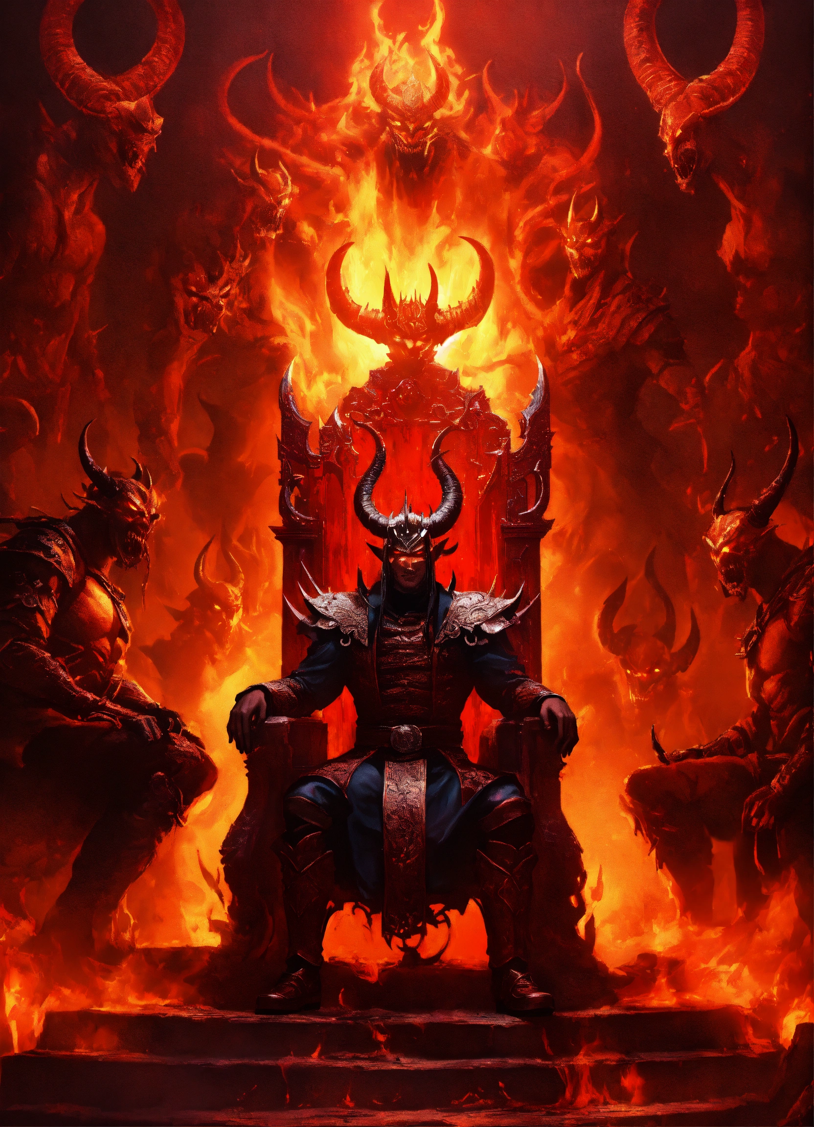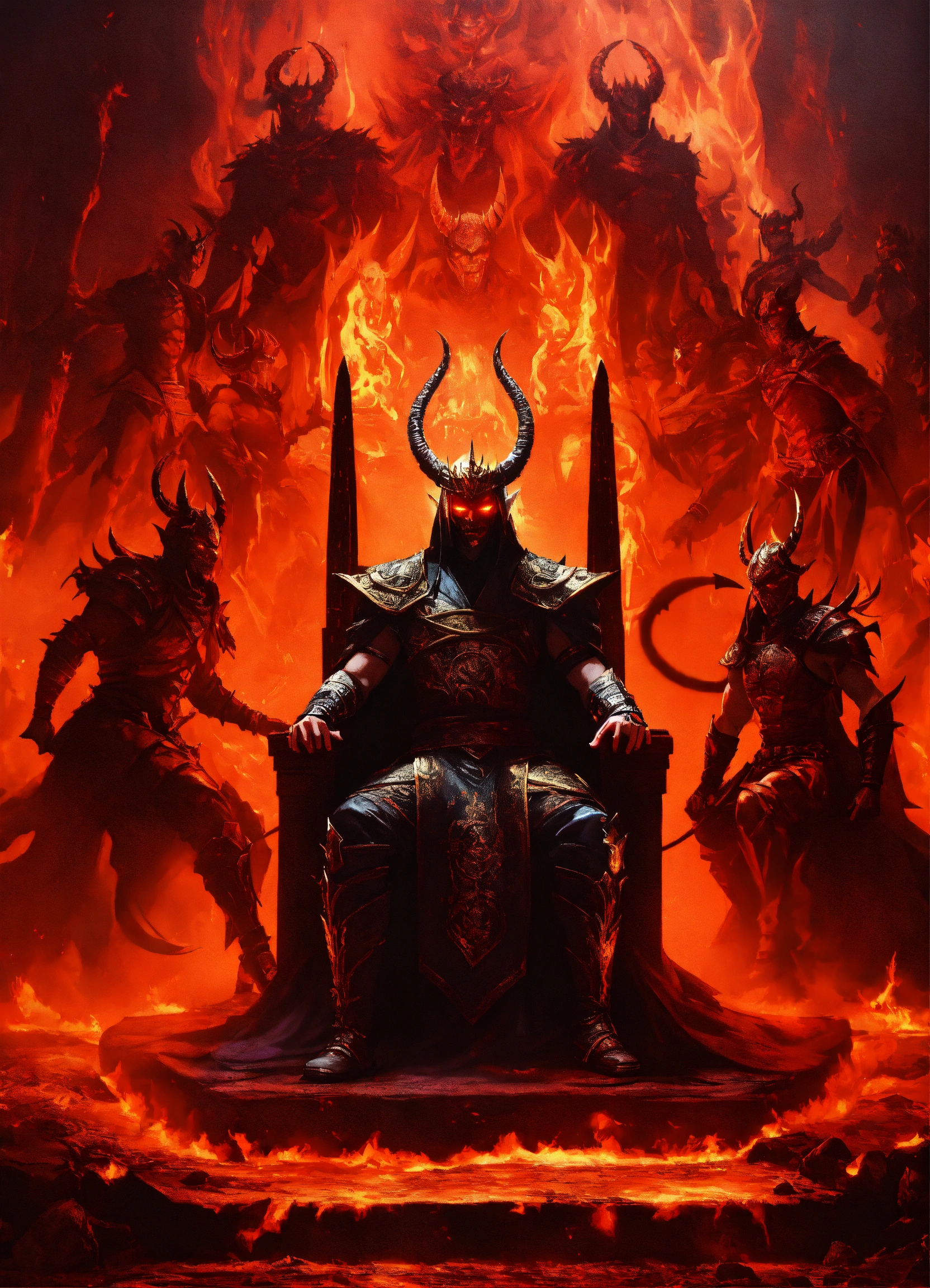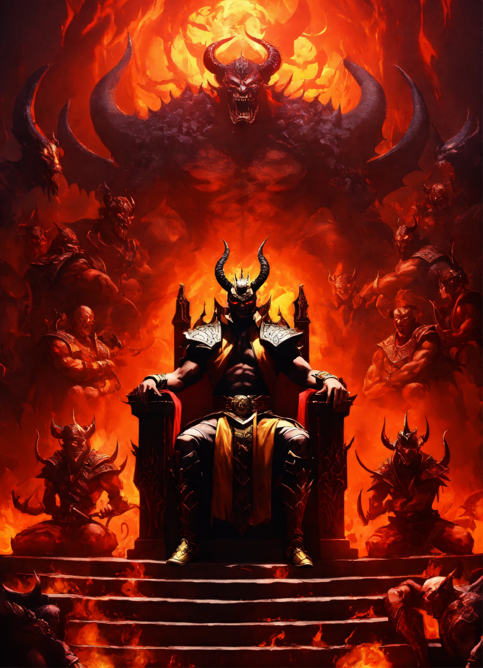 Demon king sitting on a throne in hell, surrounded by 7 demon generals, scary vibes, bright image, mortal kombat theme