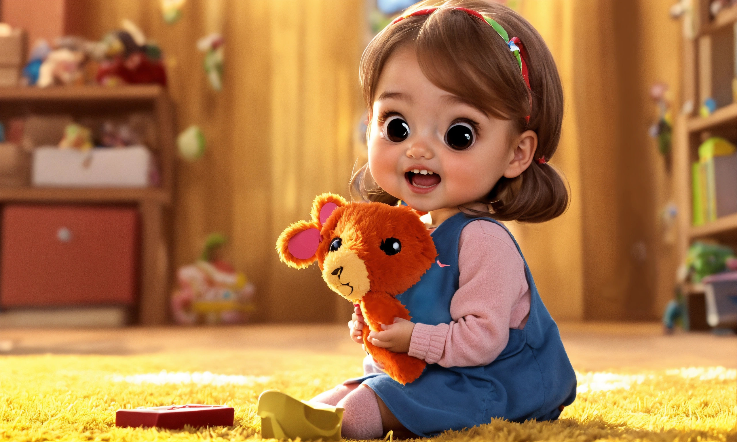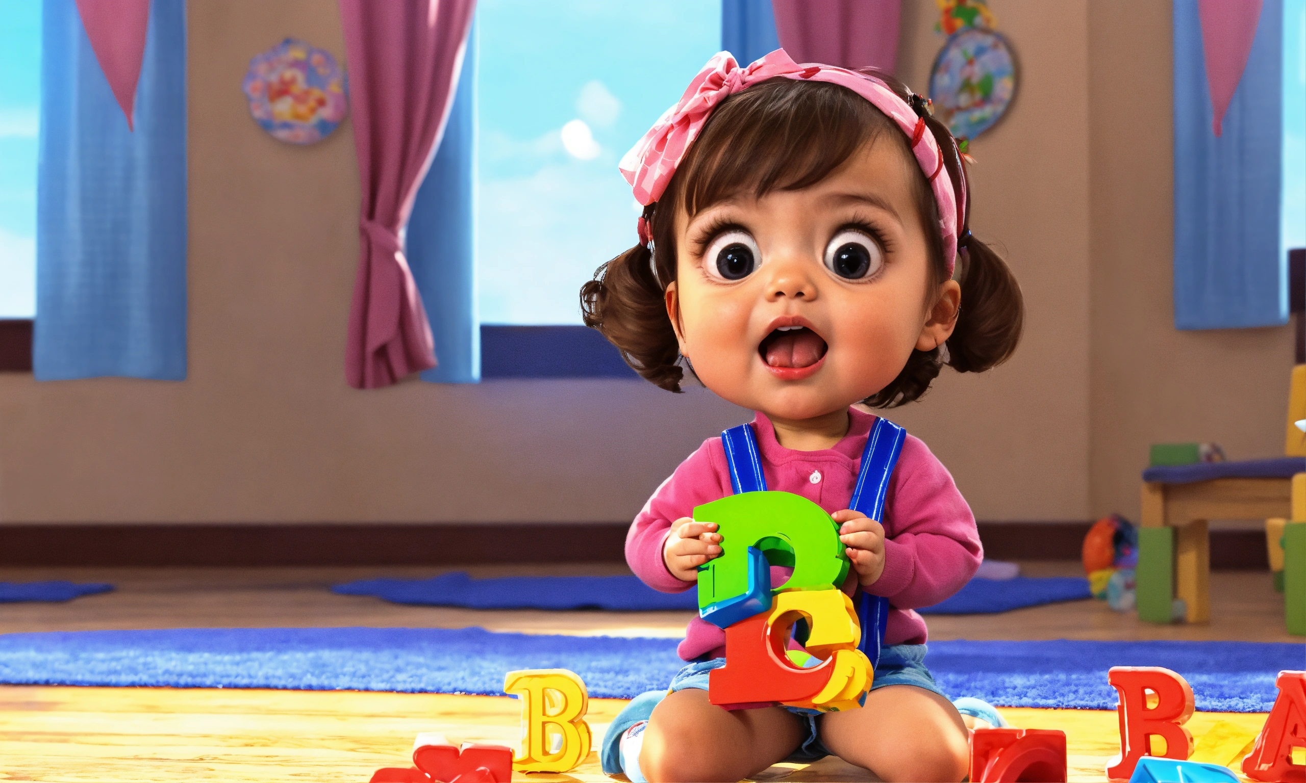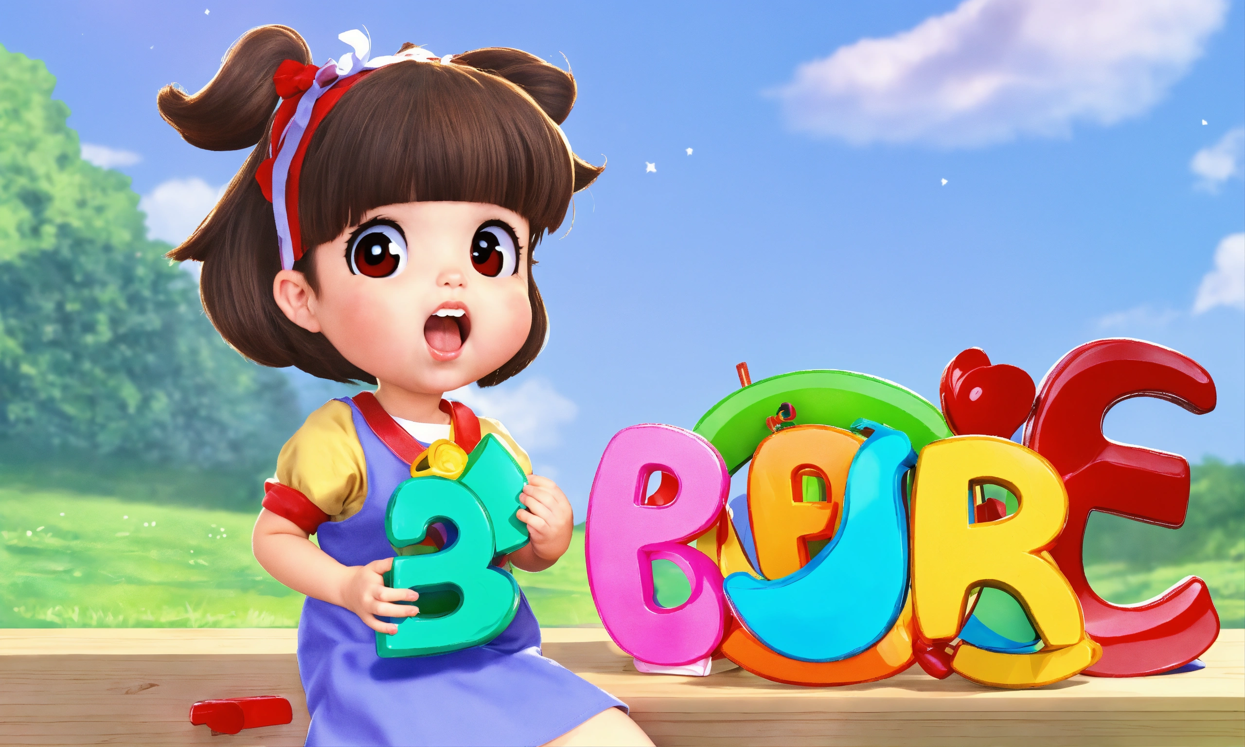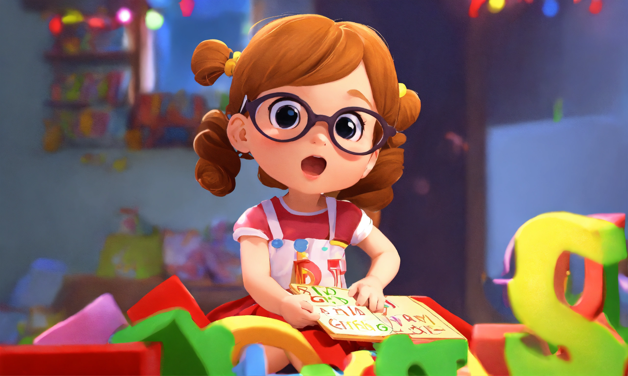 A cute little girl is singing while holding toy abc letters