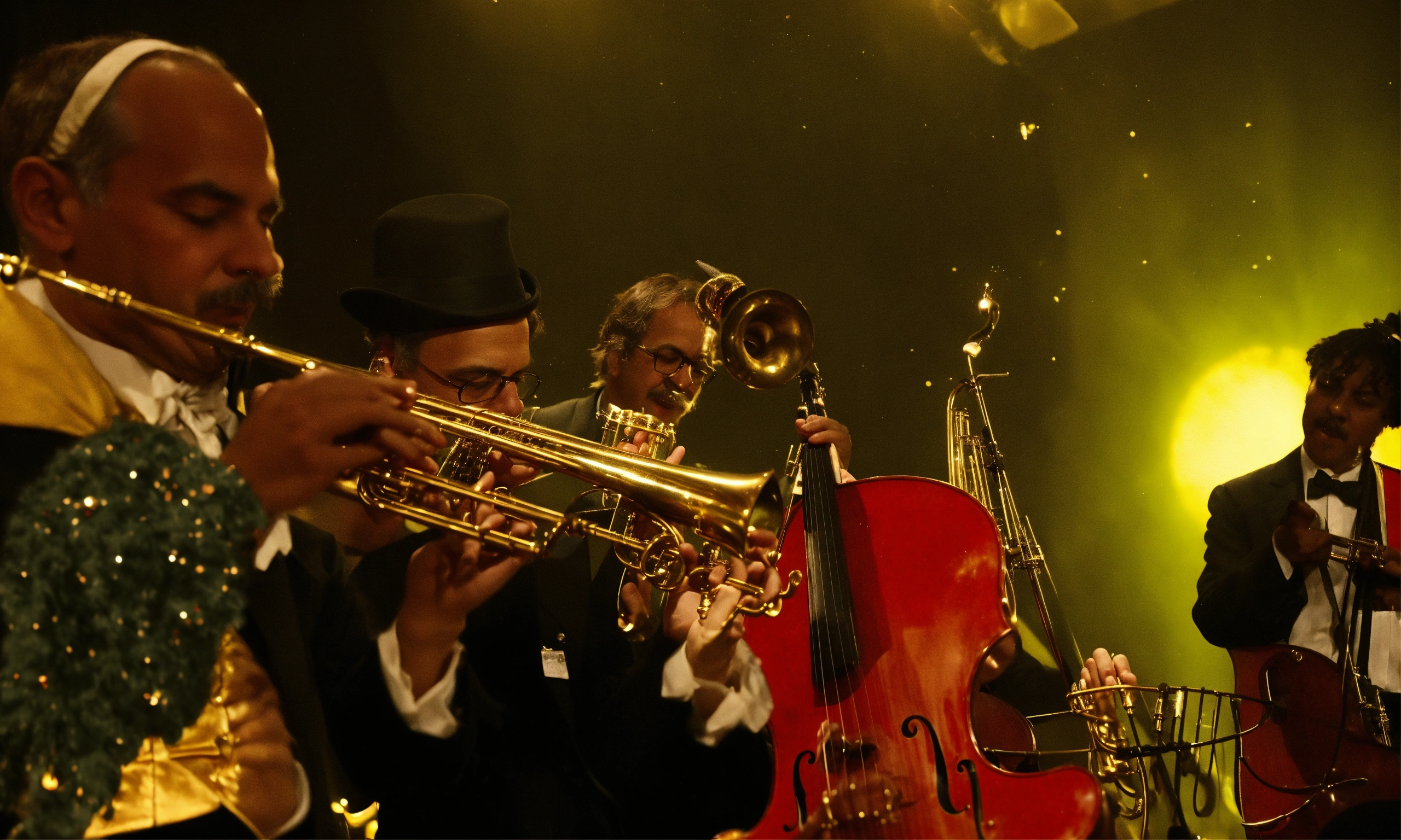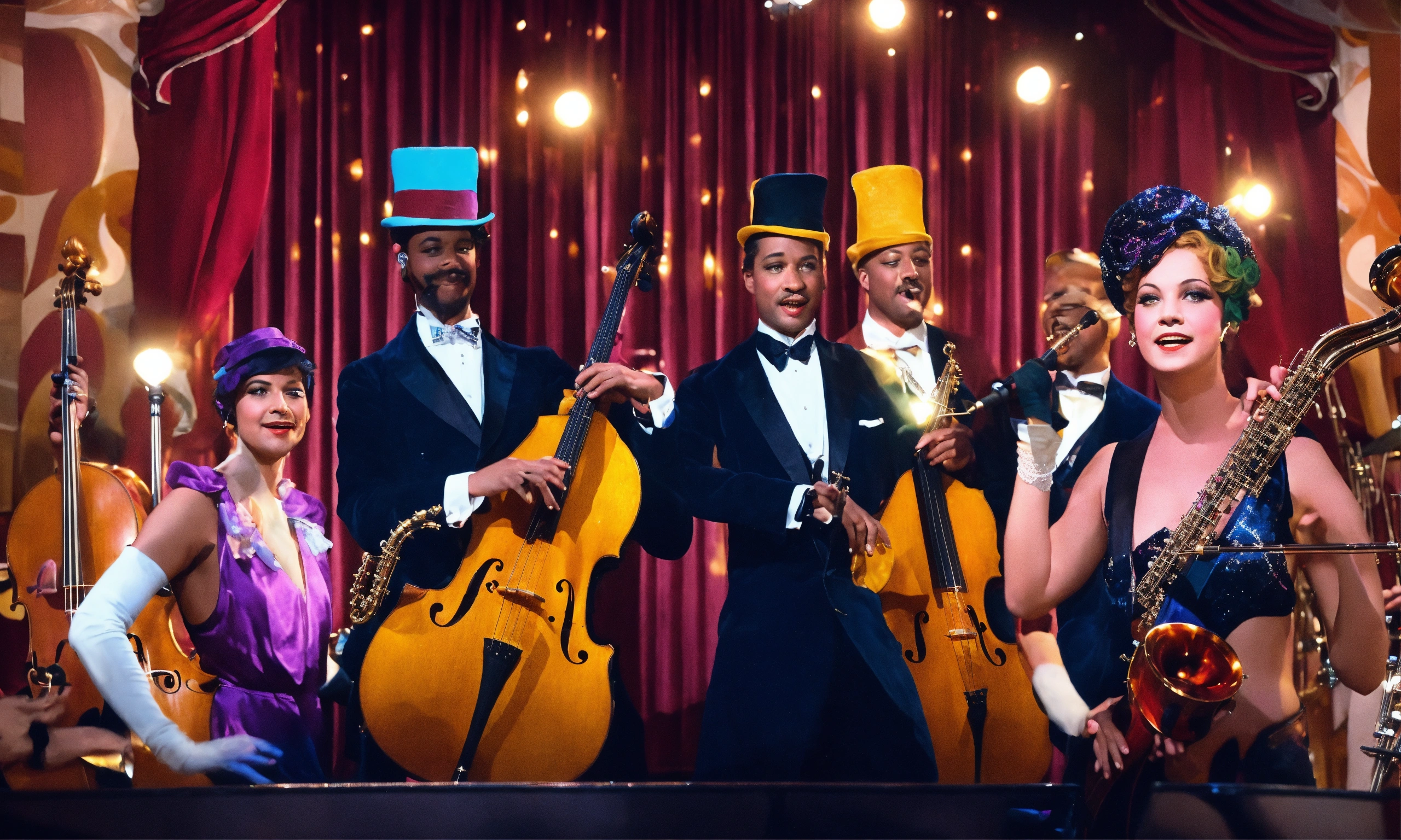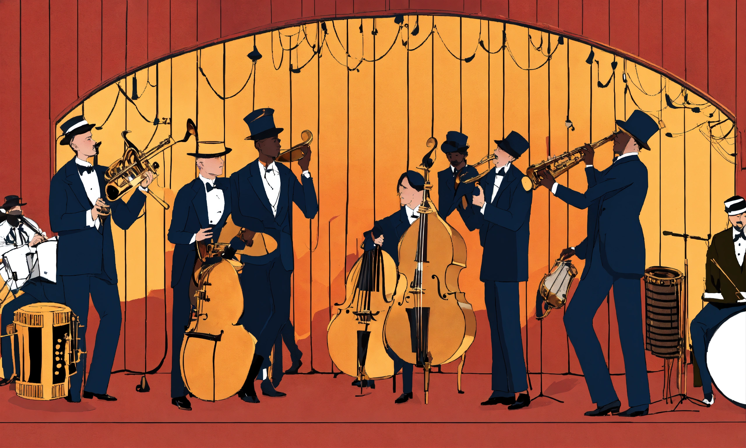 Créez une image inspirée par l'ère du jazz des années 1920, avec des personnages vêtus de costumes élégants, des instruments de musique rétro et une atmosphère de cabaret.