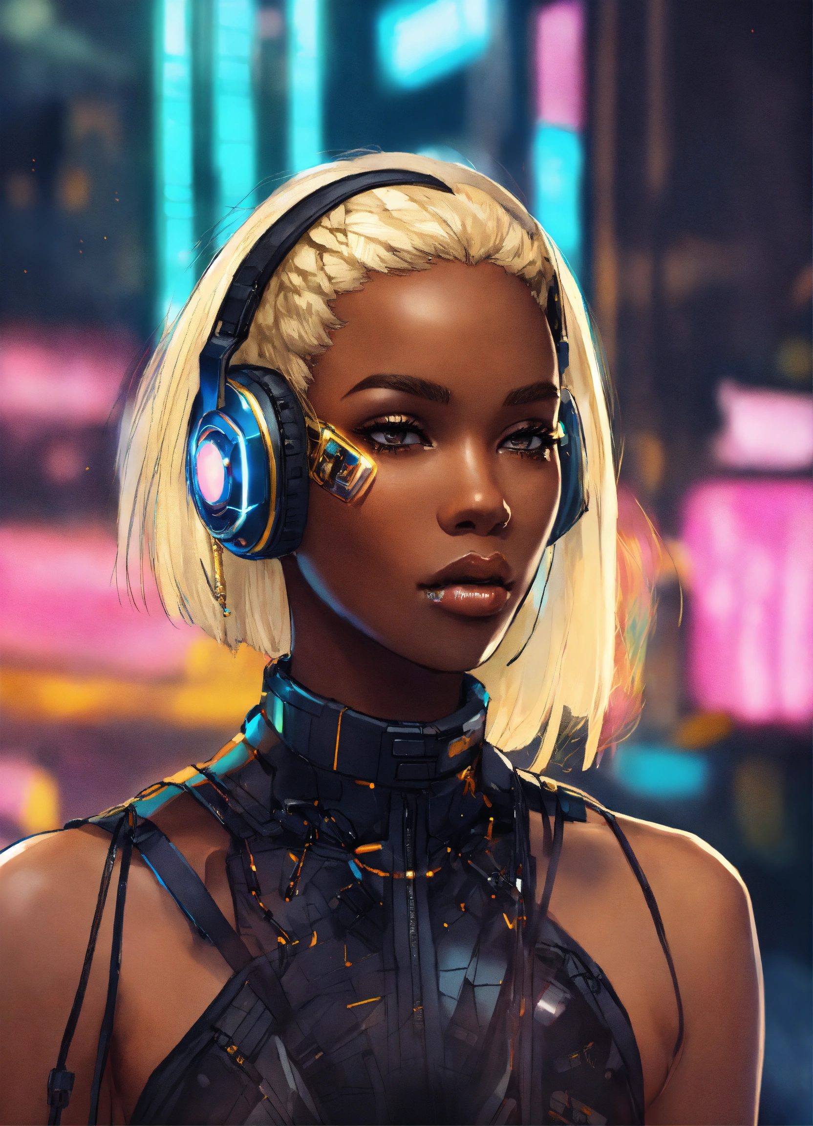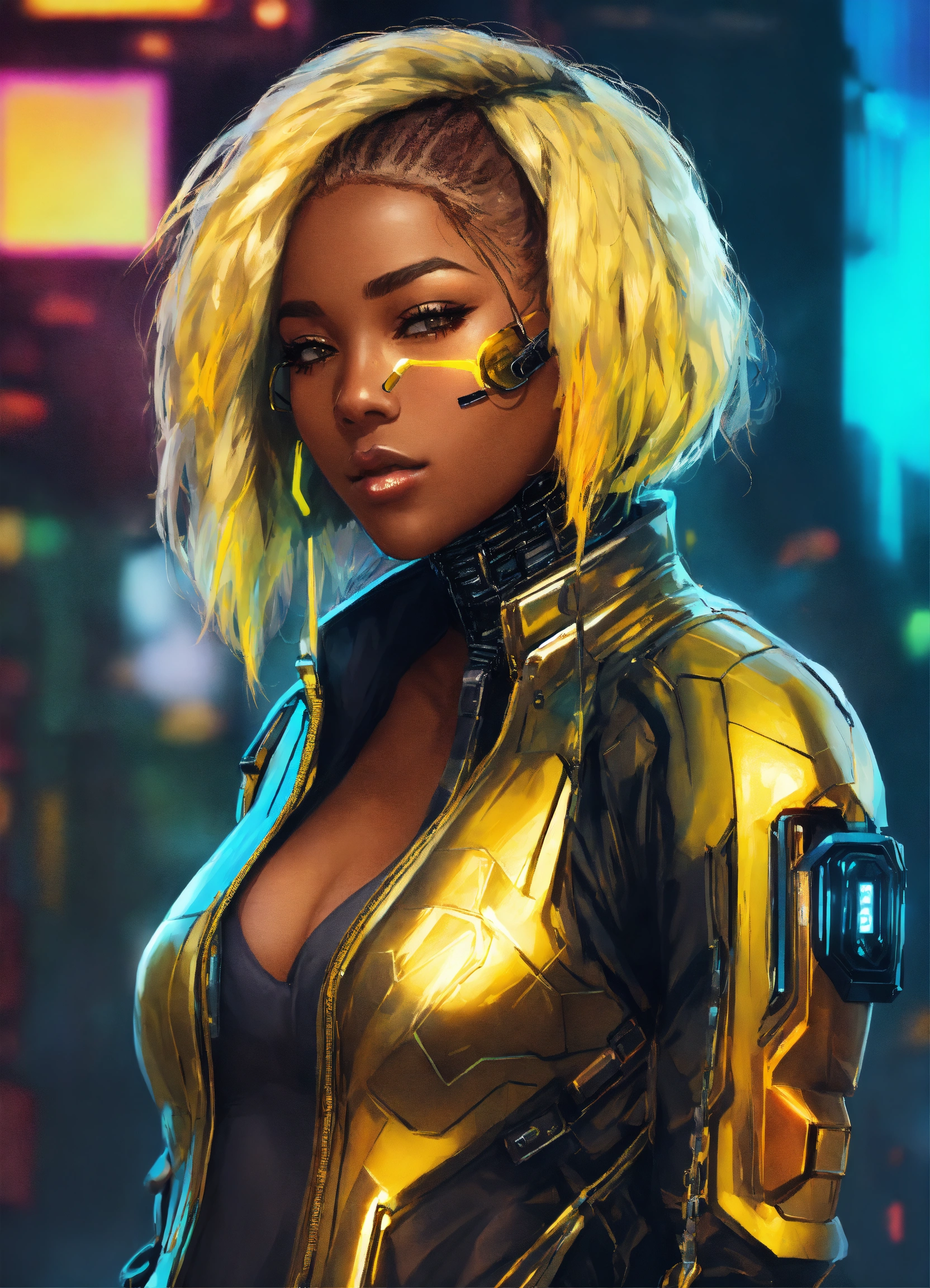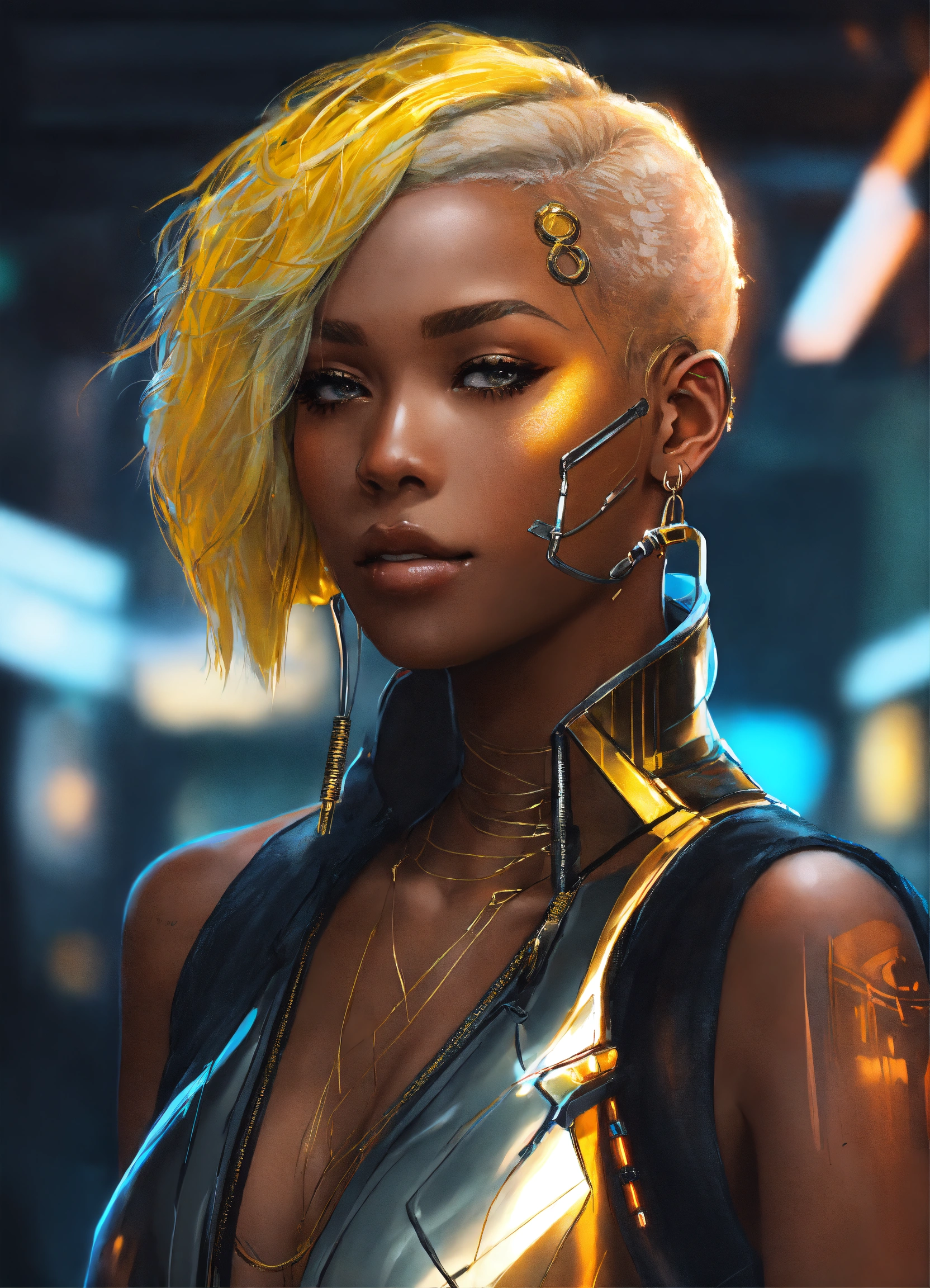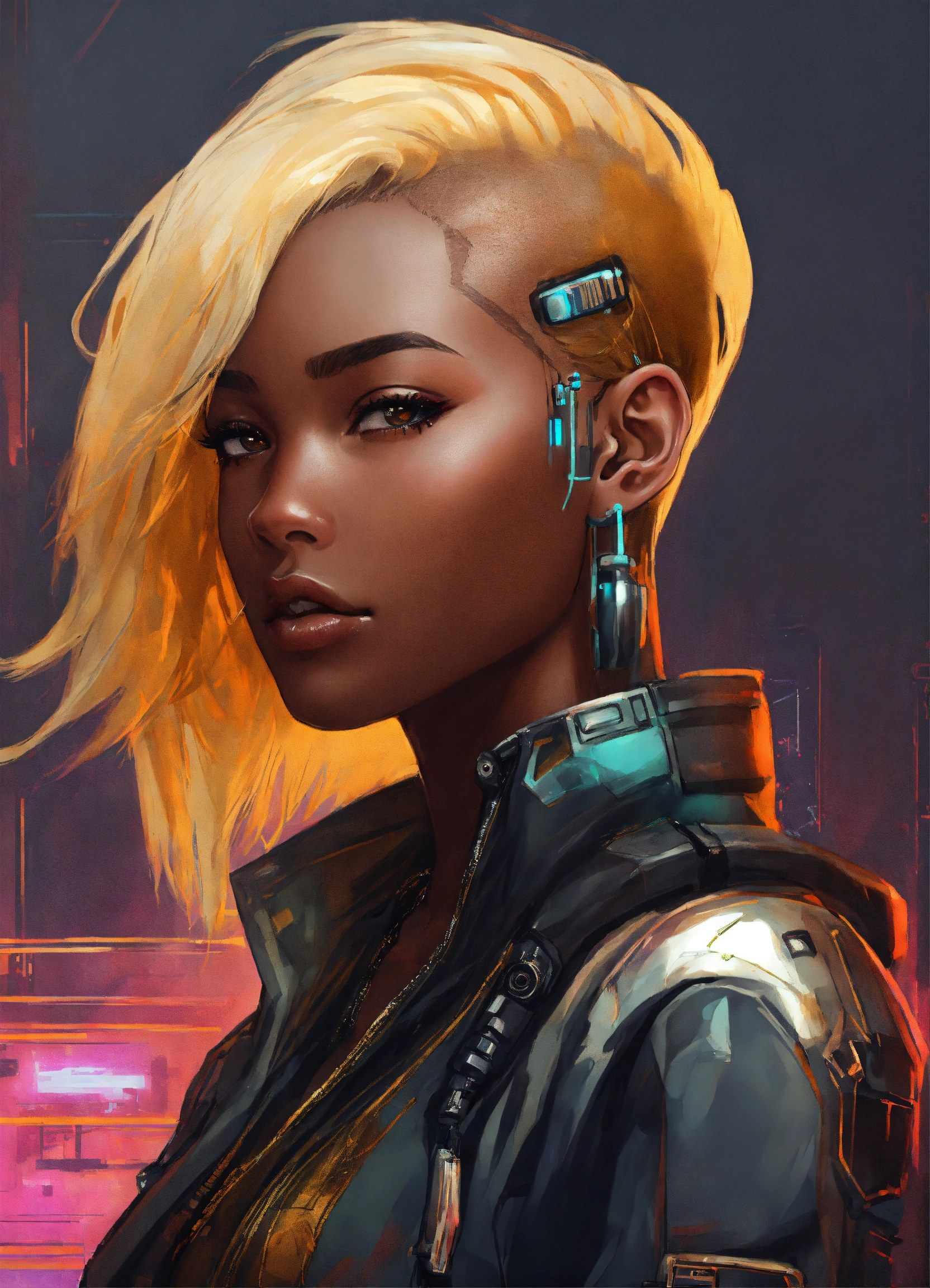 Draw a black woman with a blonde bob hairstyle with long side burns on each side, clothing is metallic cyberpunk