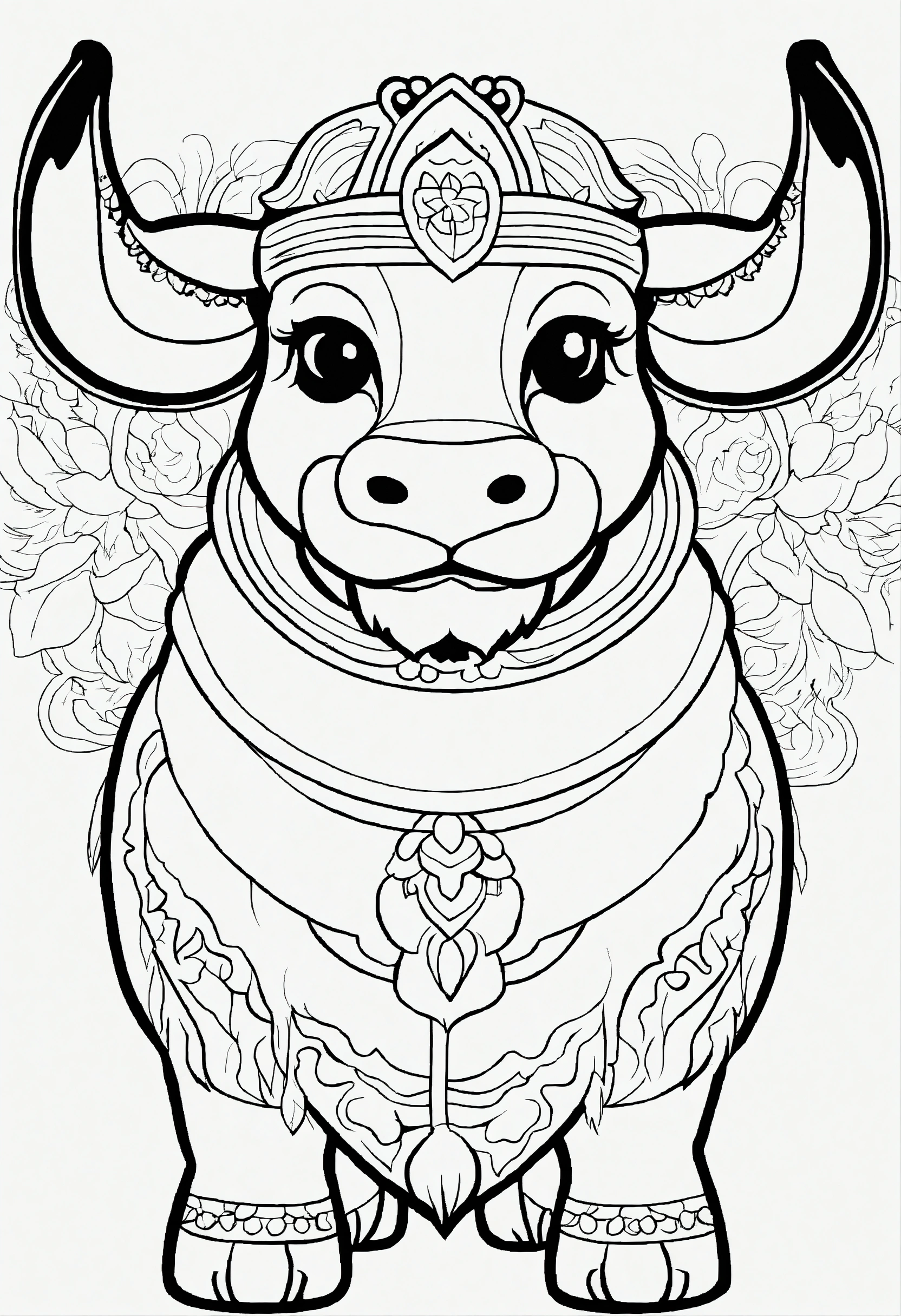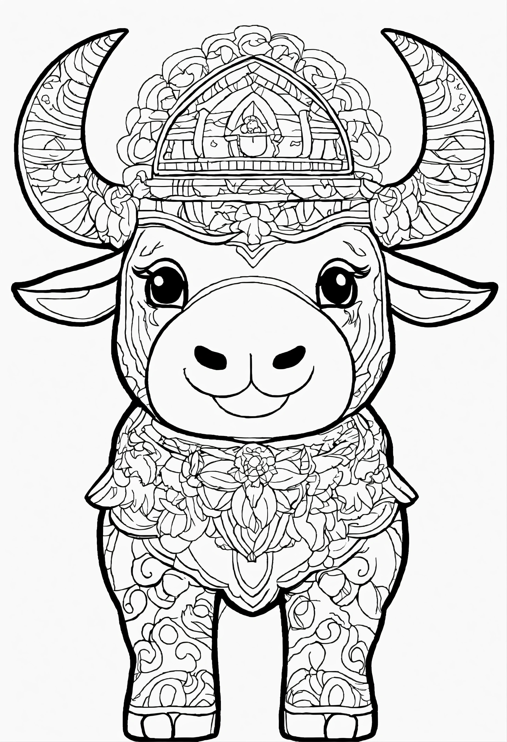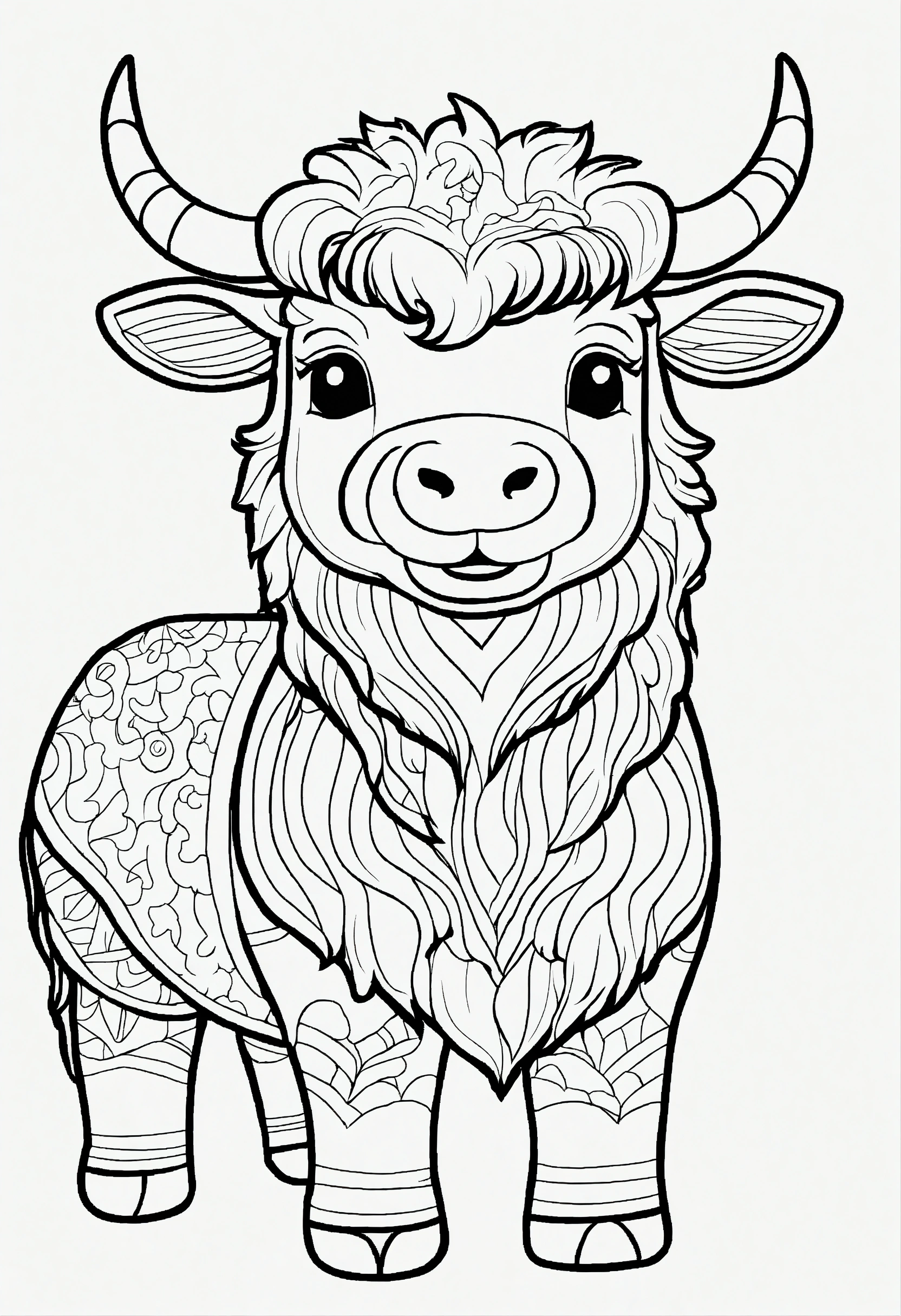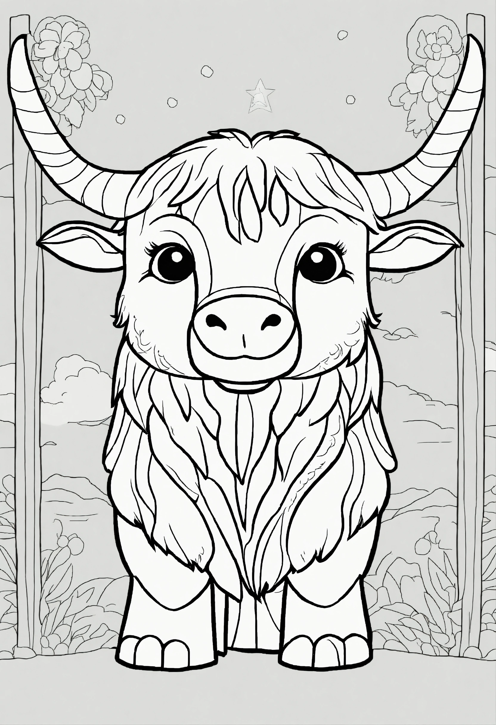 Coloring book for pre-k kids, simple lines drawings, no lines inside of the drawing, baby yak, cartoon, full body, outline of the drawing in bold line, symmetrical, white background., no background image.