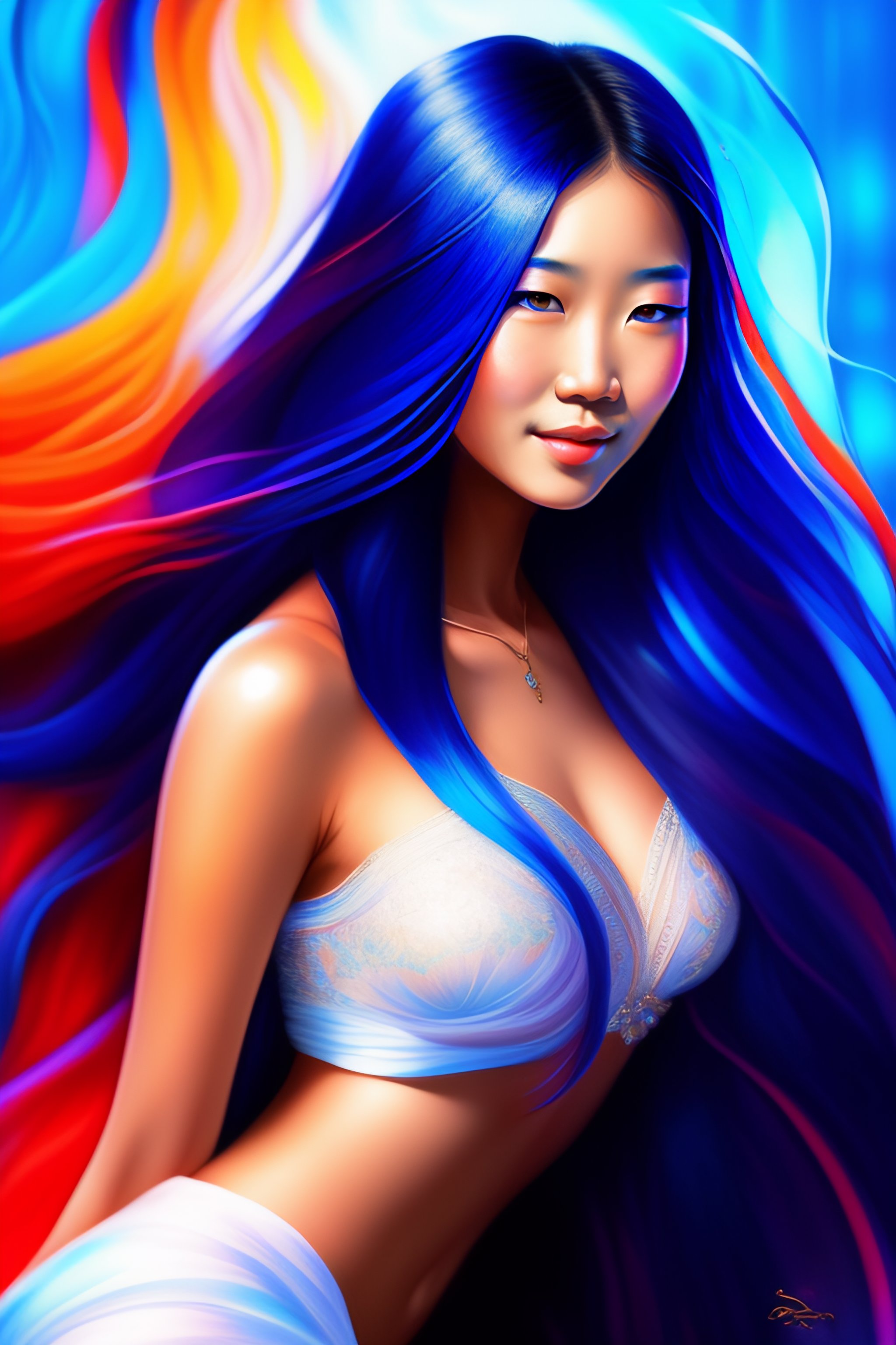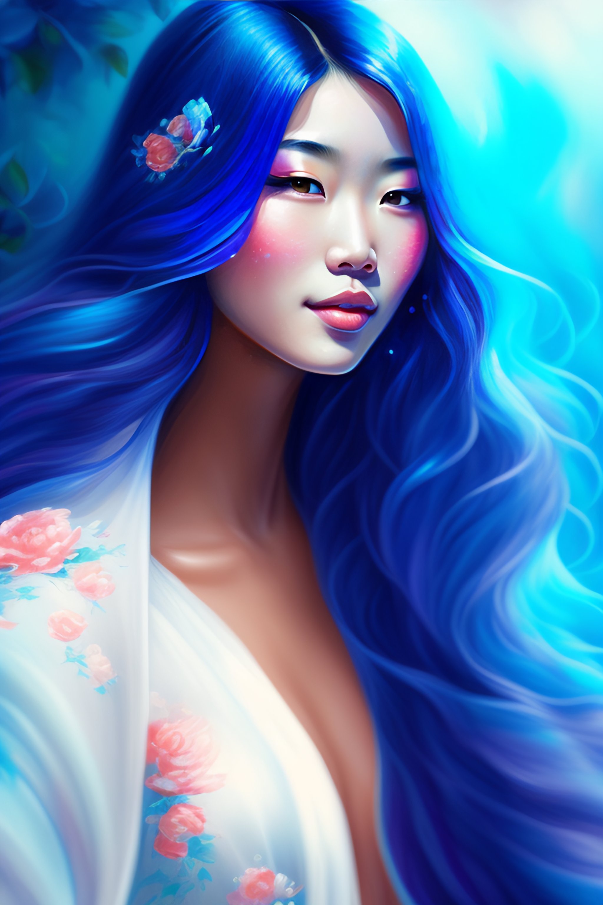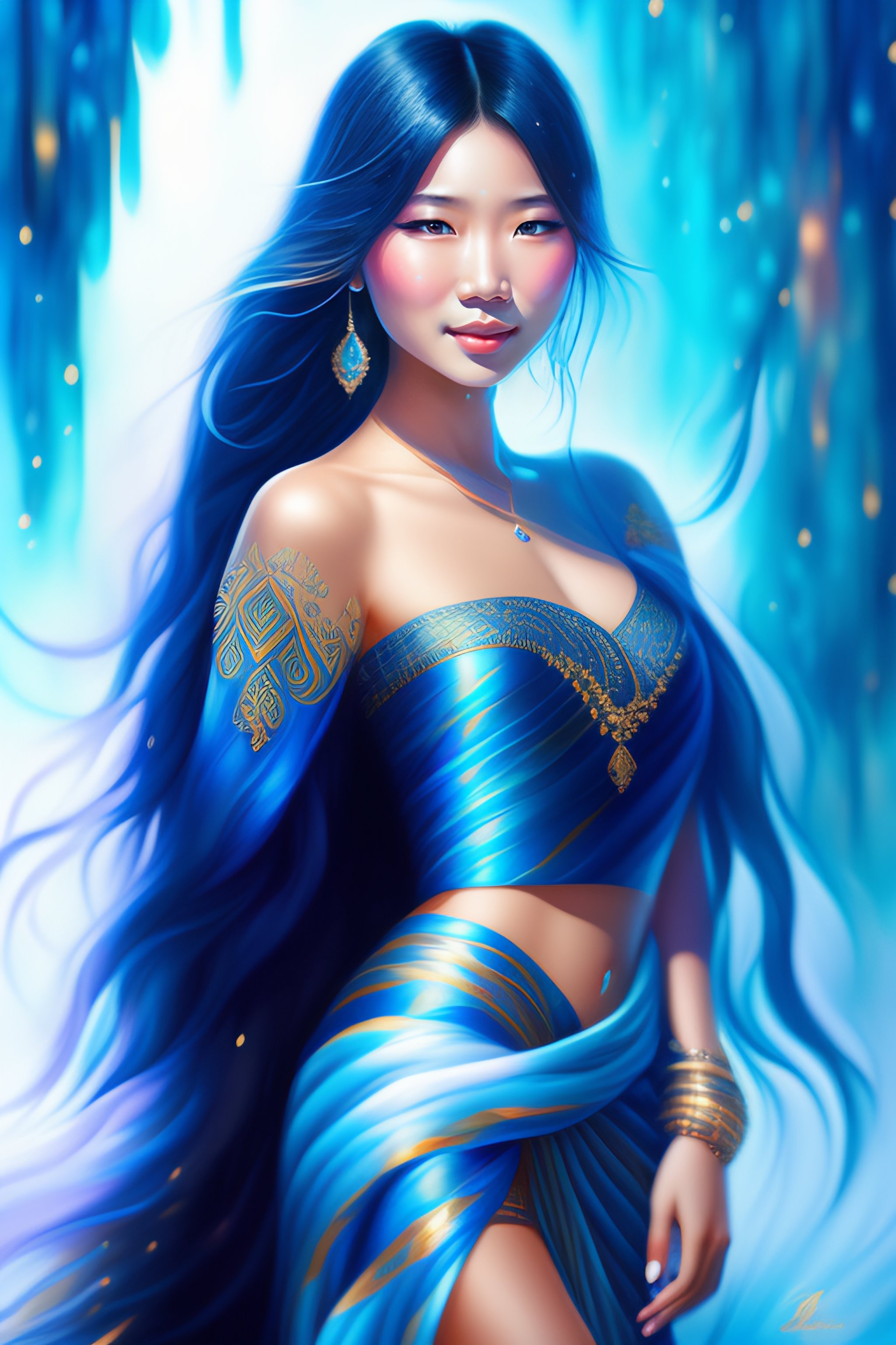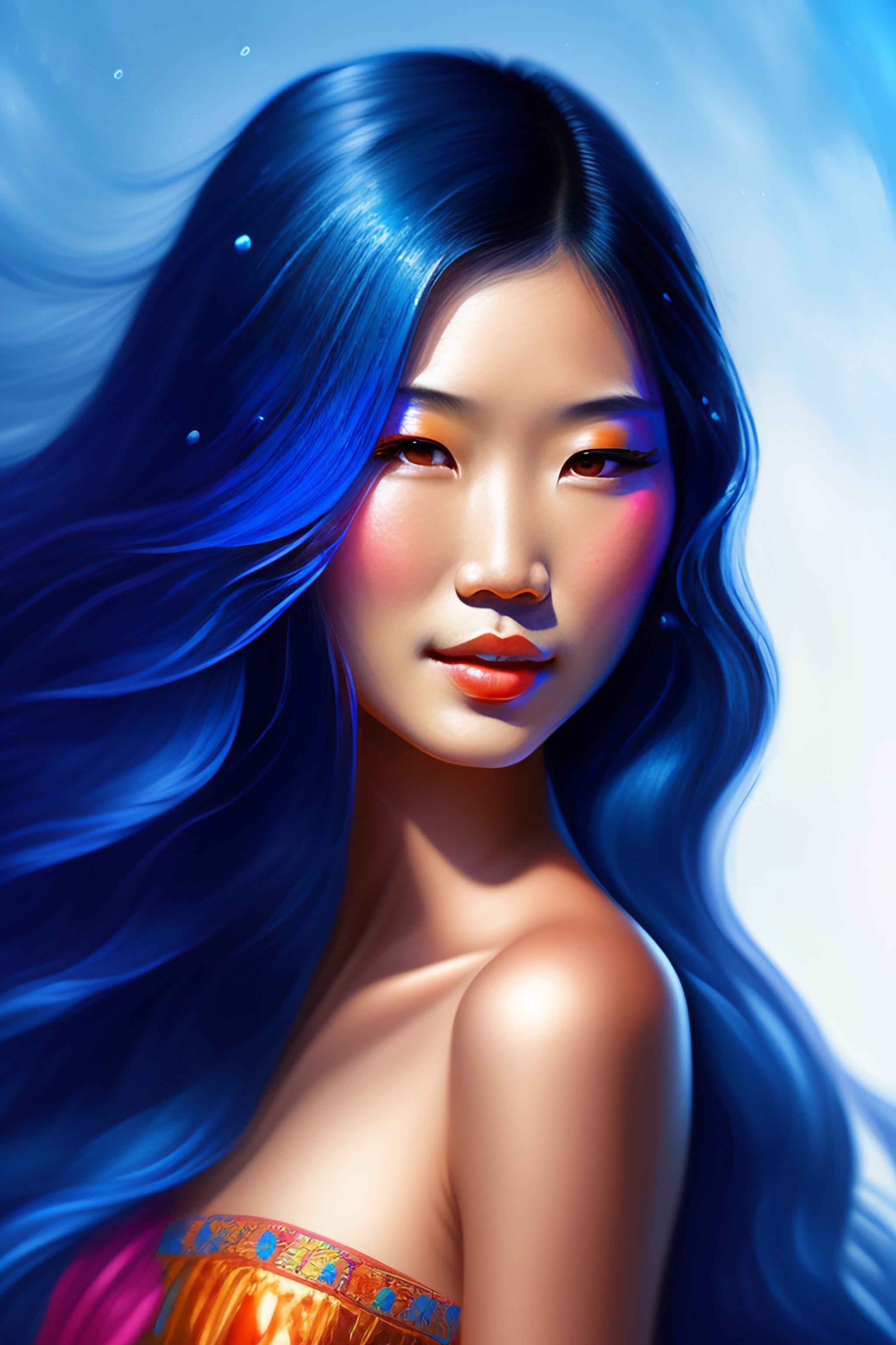 Girl with blue asian woman long hair intricate, elegant, highly detailed, digital painting, splash art