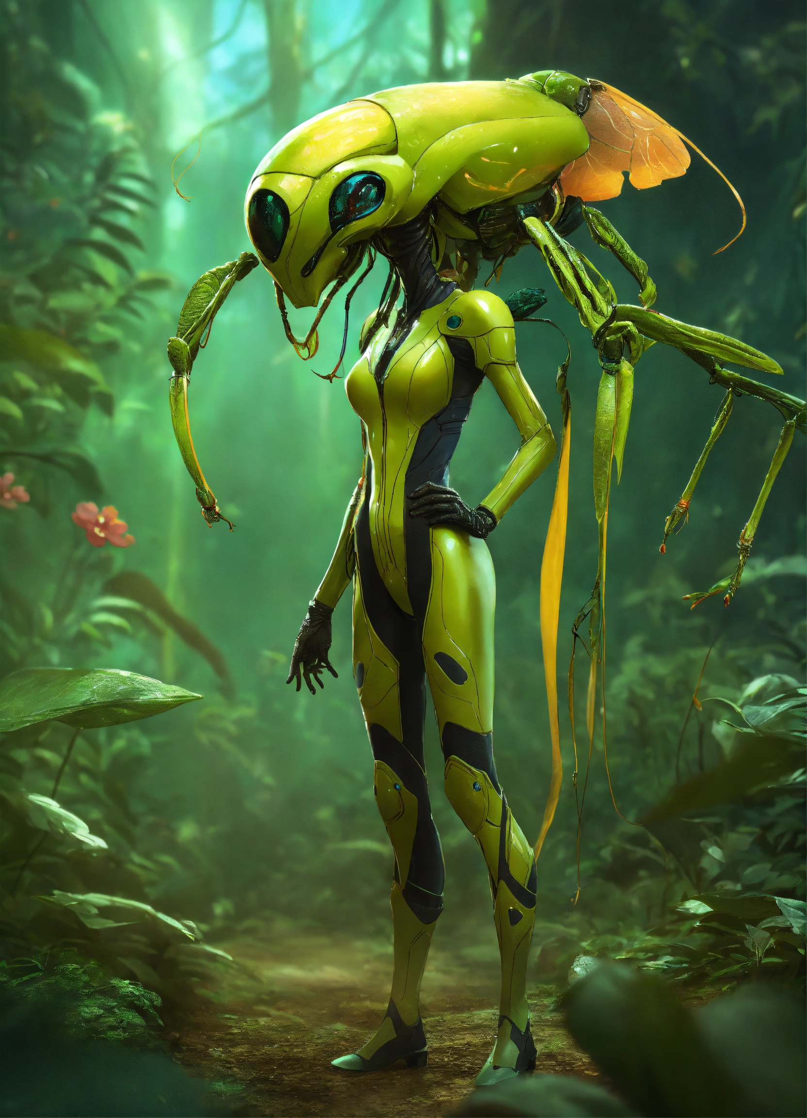 A alien female woman with the head of a insect and insect arms and legs, looking alien_style, colored ivony and olive green, full body wide shot backdrop a fantastic fantasy jungle with alien_platns and alien_flowers, concept_art, intrincate sharp_focus, characterdesign