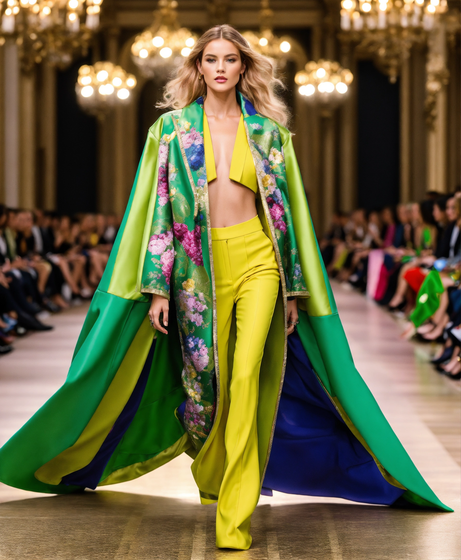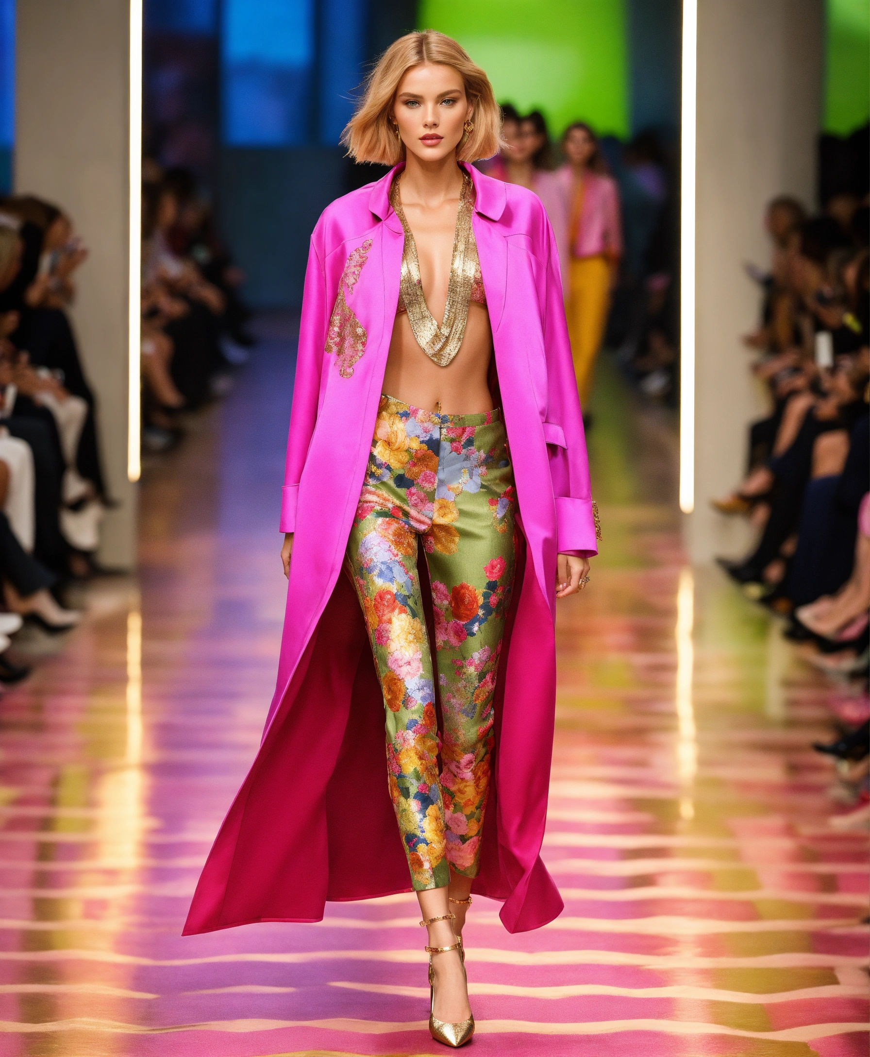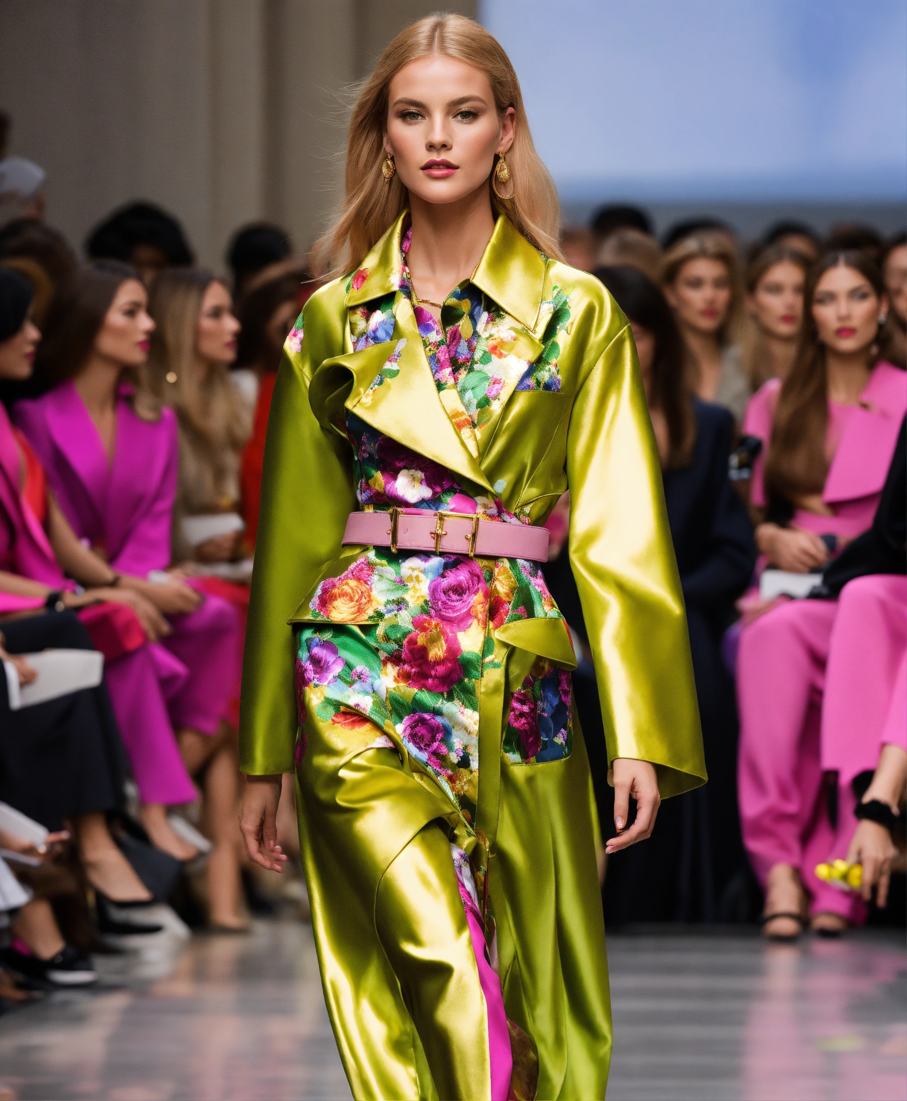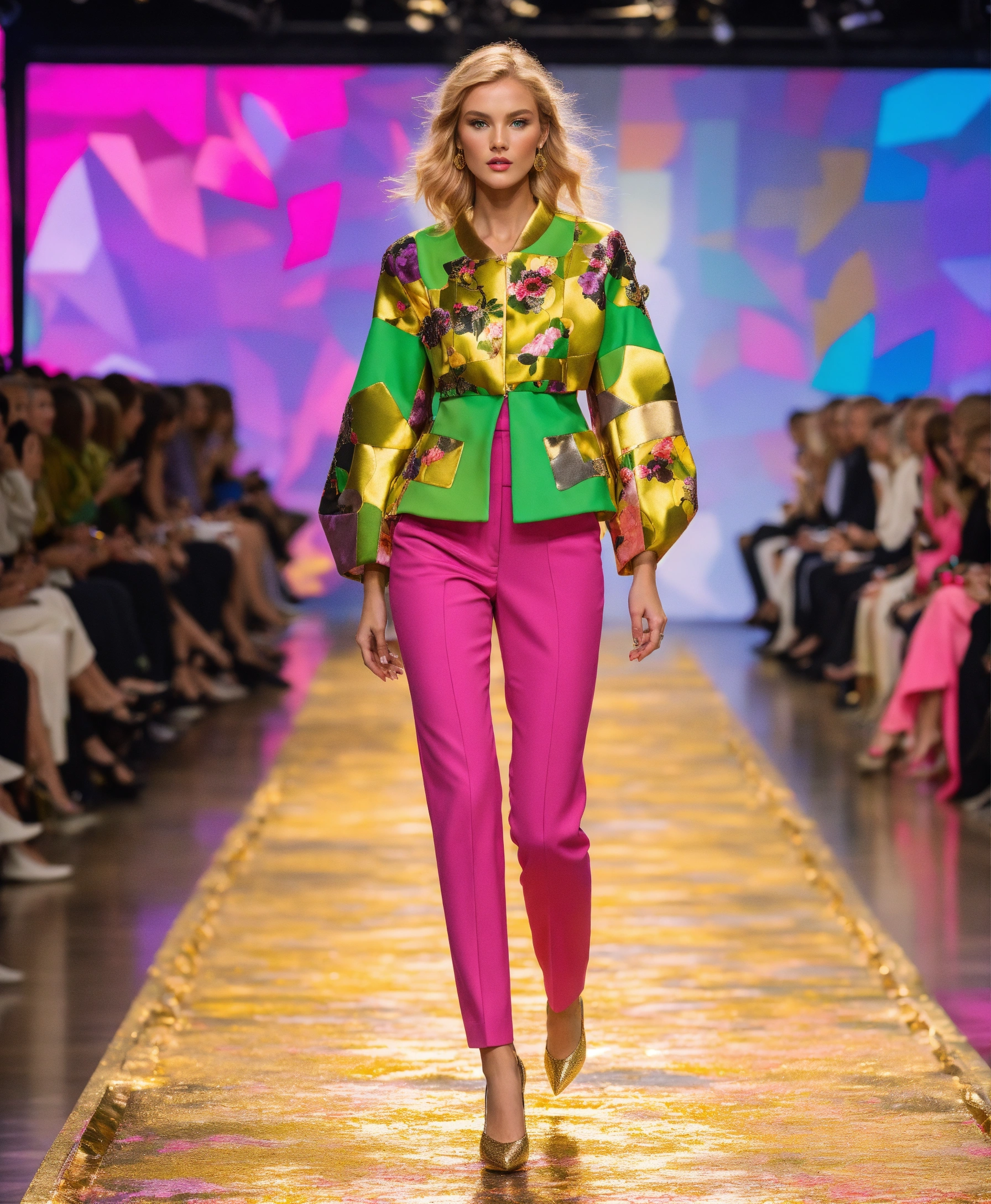 Ultra realistic full body photo of an fashionable german blonde model walking the runway modeling summer designer novelty interesting complex unusual street sporty classy modern dolman sleeve outfit brave, paris fashion week versailles details cutouts and and gold geometric pattern floral structured tailored jacket pink gold green lilac peridot silver magenta lime fuchsia yellow blue black gray copper mauve bronze haute couture ultimate elegance beautiful luxurious awesome wealthy resplendent magnificent sublime 12k