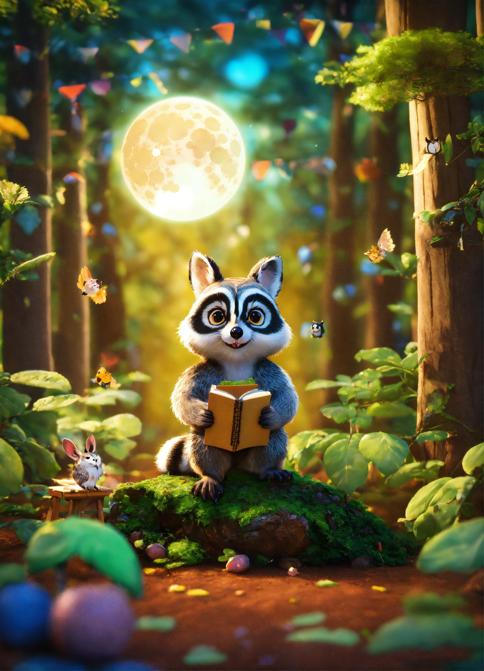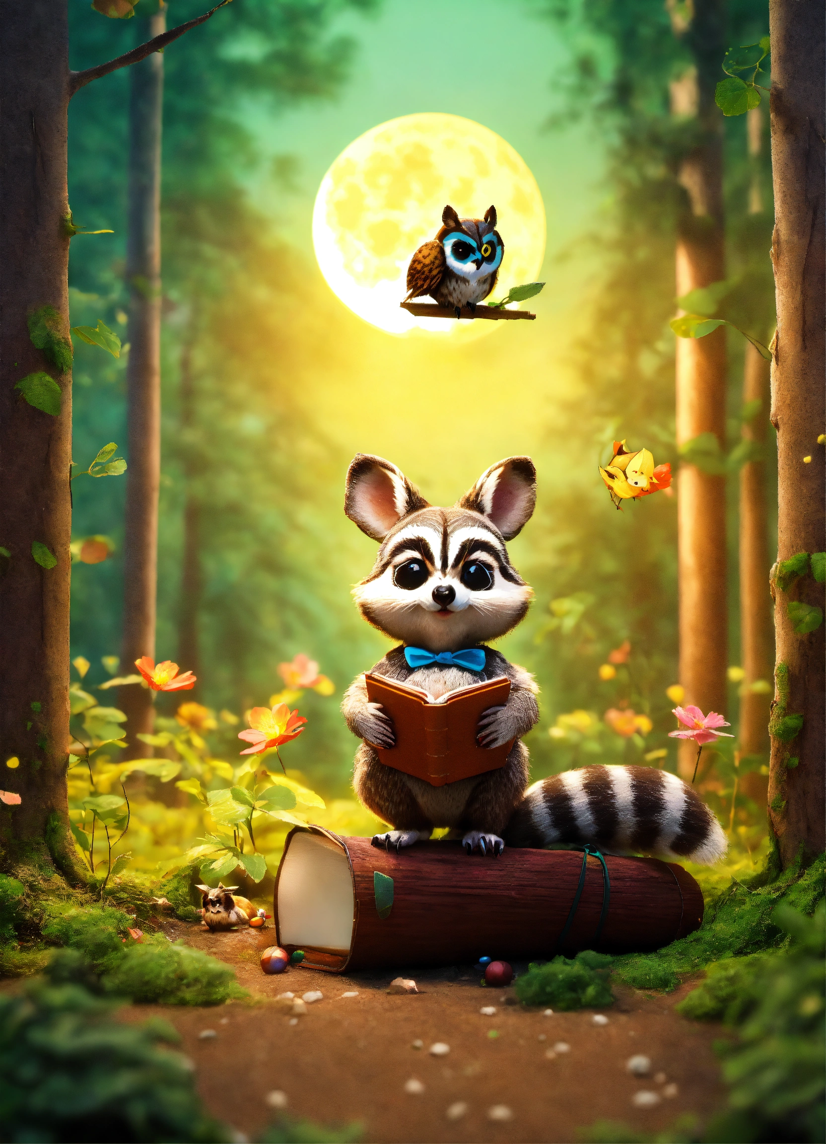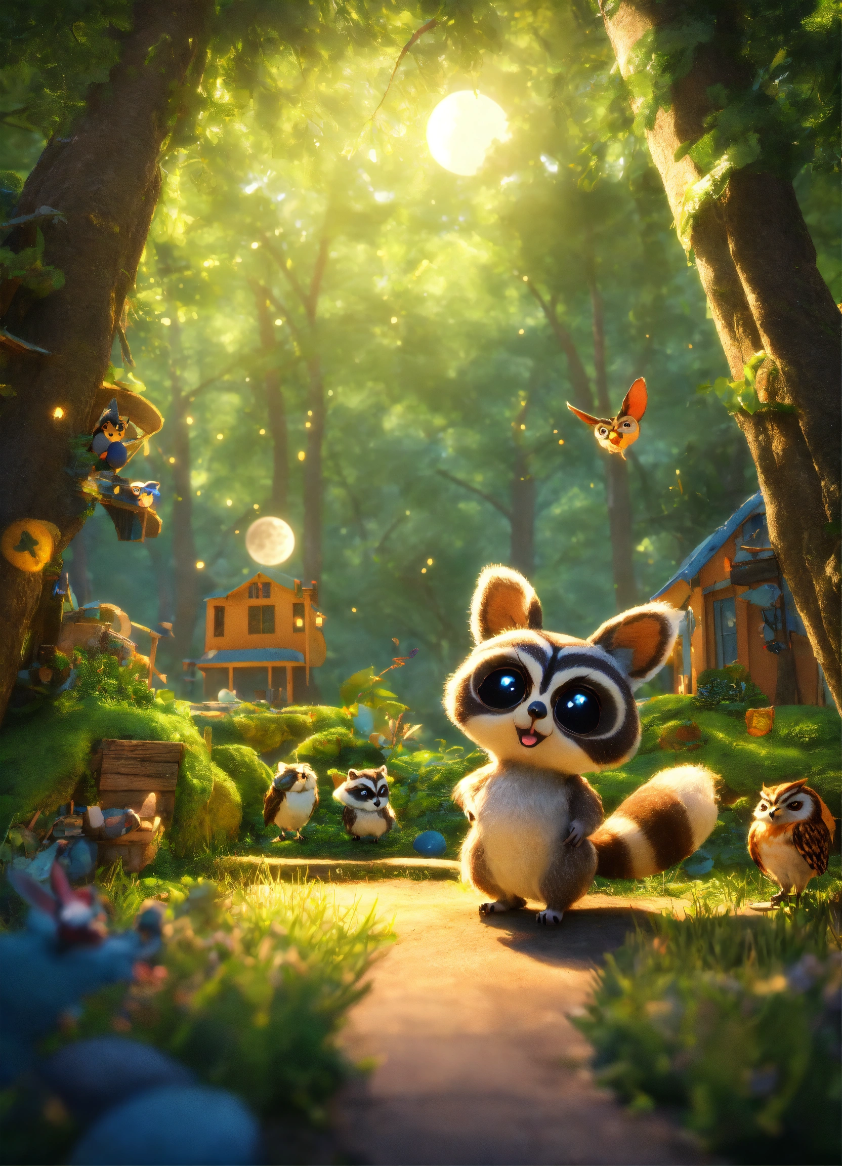 Creating a story raccoon rabbit and owl in the middle of the forest, in the image there must be a large beautiful and bright school, over the school a moon, image in 3d resolution