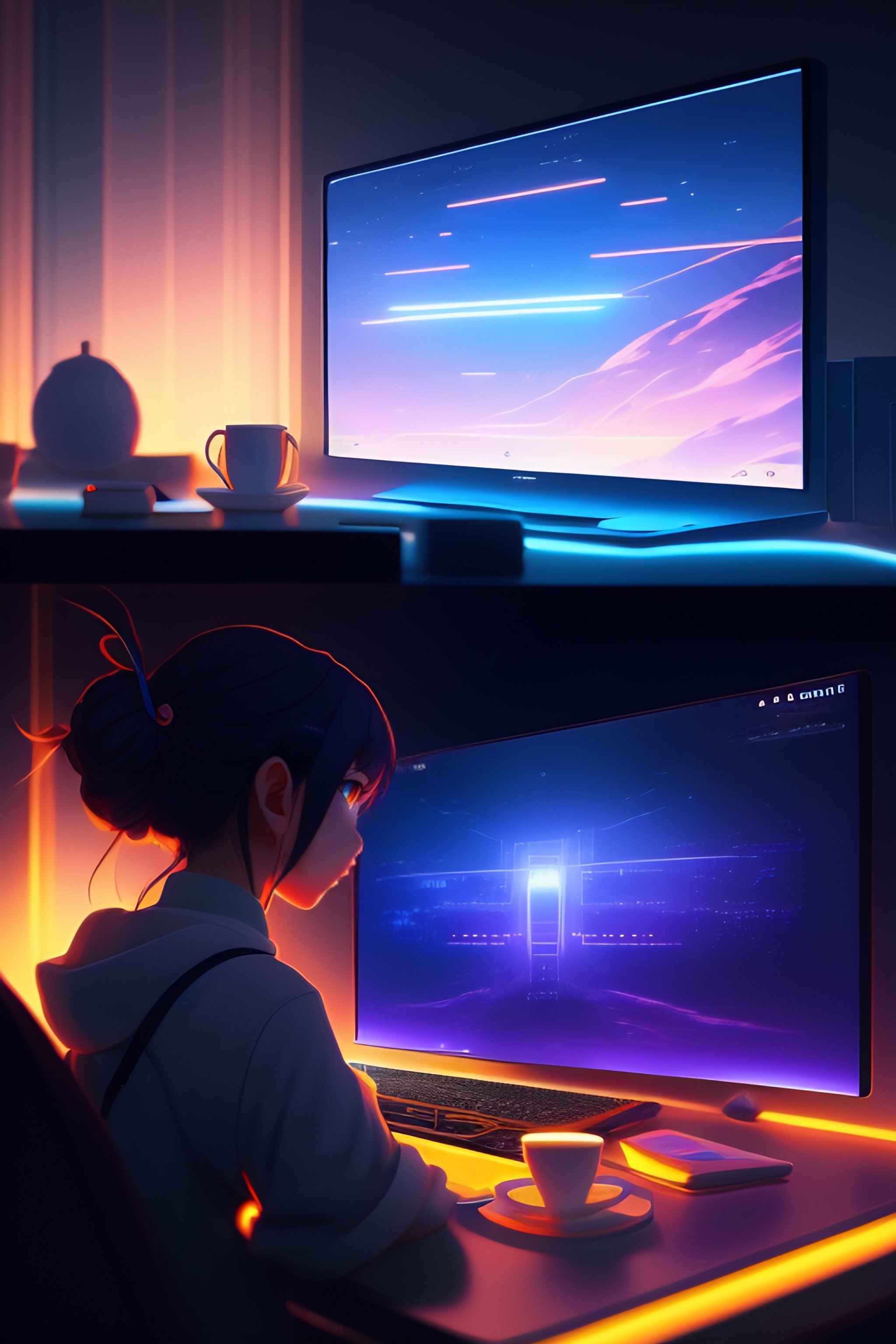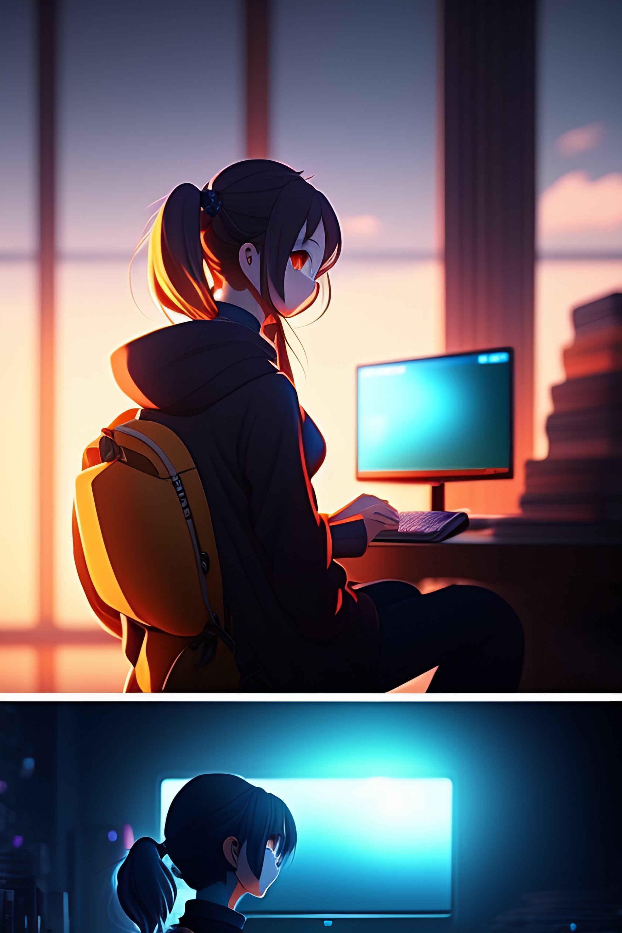 Create a high resolution artwork of anime girl is programming at a laptop in a room, web developer, by makoto shinkai and ghibli studio, outlined silhouettes, dramatic lighting, highly detailed, incredible quality, trending on artstation, masterpiece, 8k