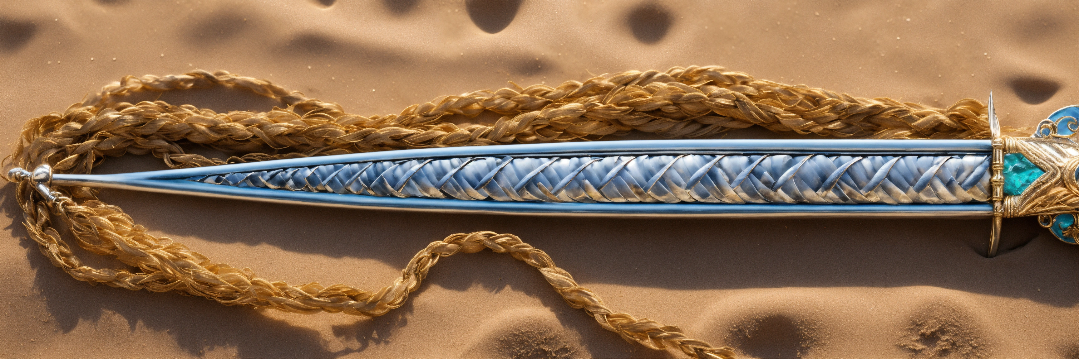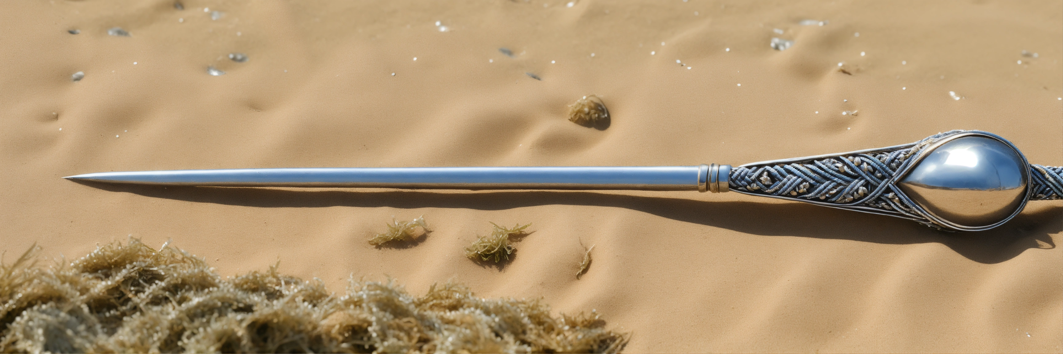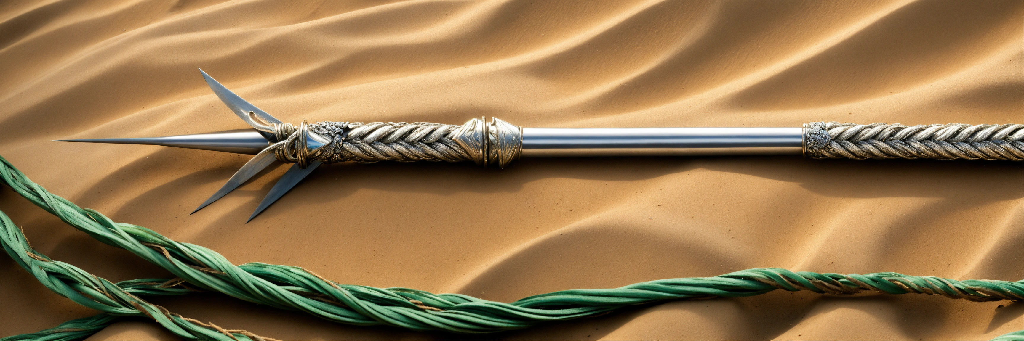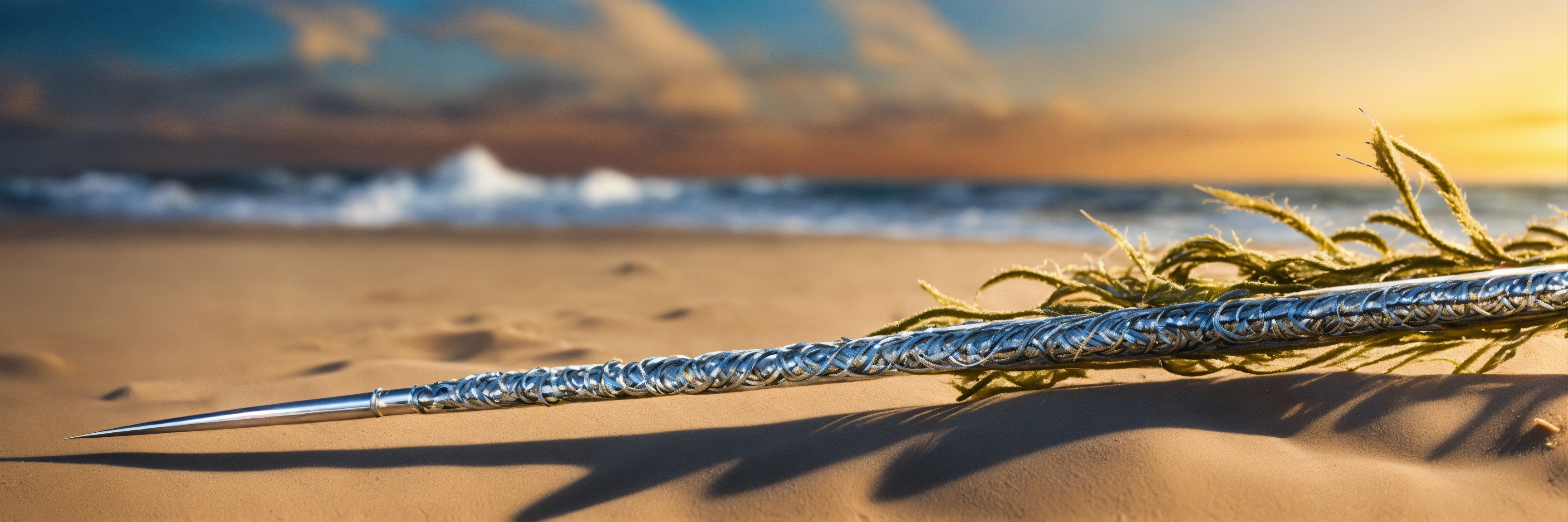 8k, picture of a narrow and delicate toothed spear with barbs made of lunar-silver, highly ornamented, at the bottom there is an eyelet to which a twenty meter long tow line made of braided seaweed is attached, very detailed, ultra realistic, lays on the beach in the sand, fantasy