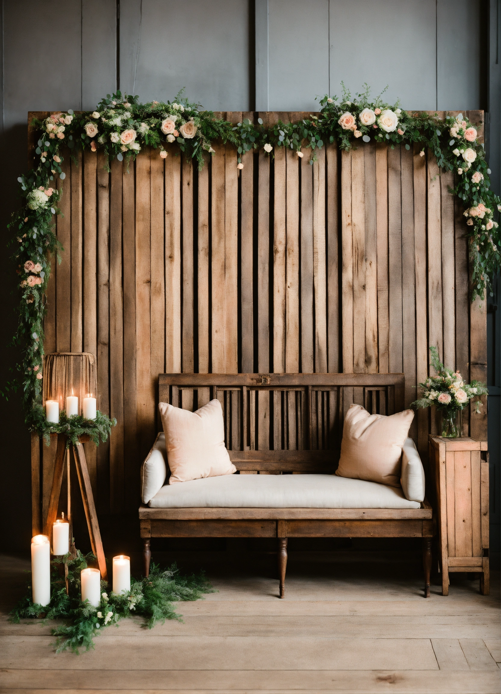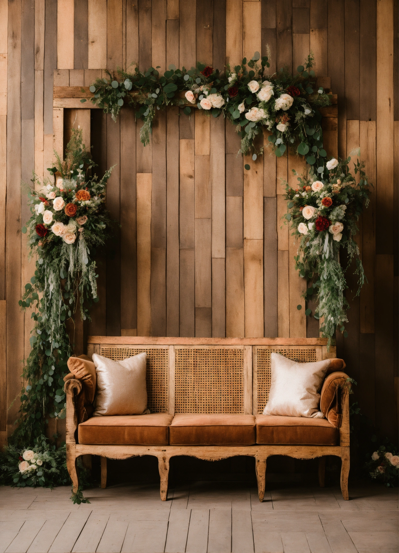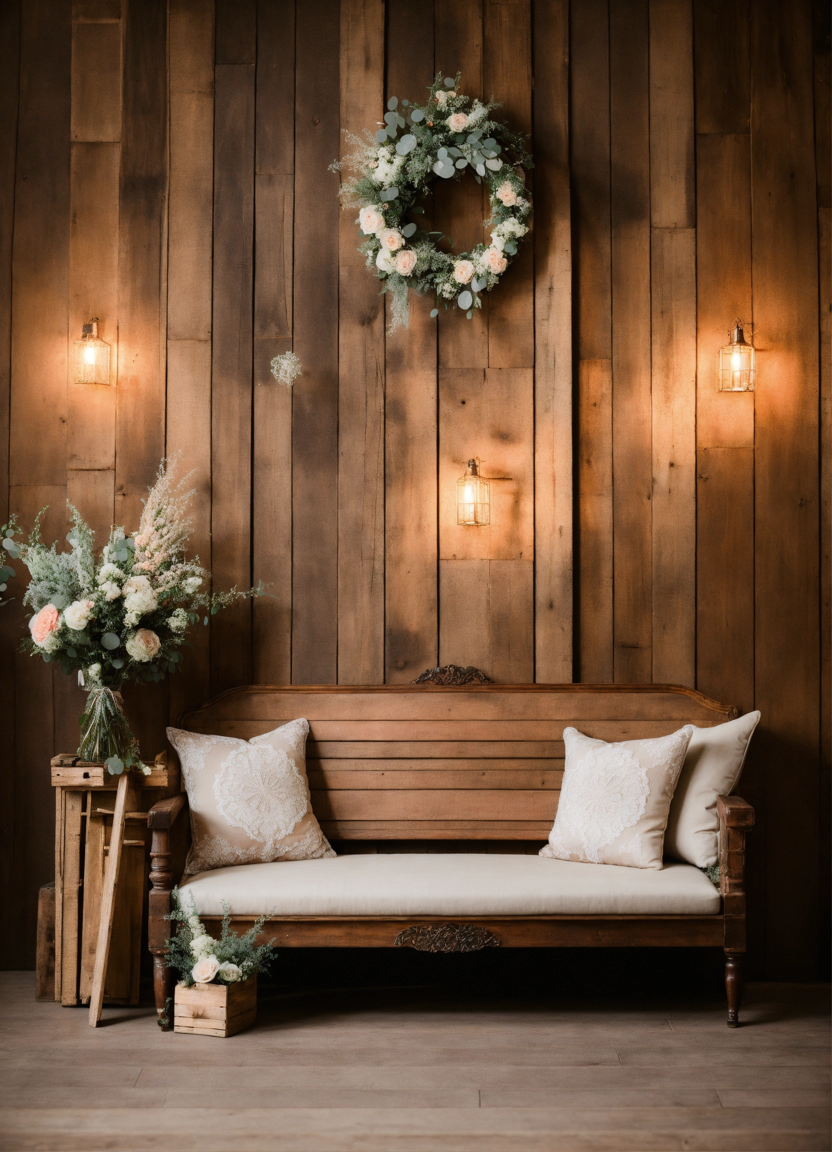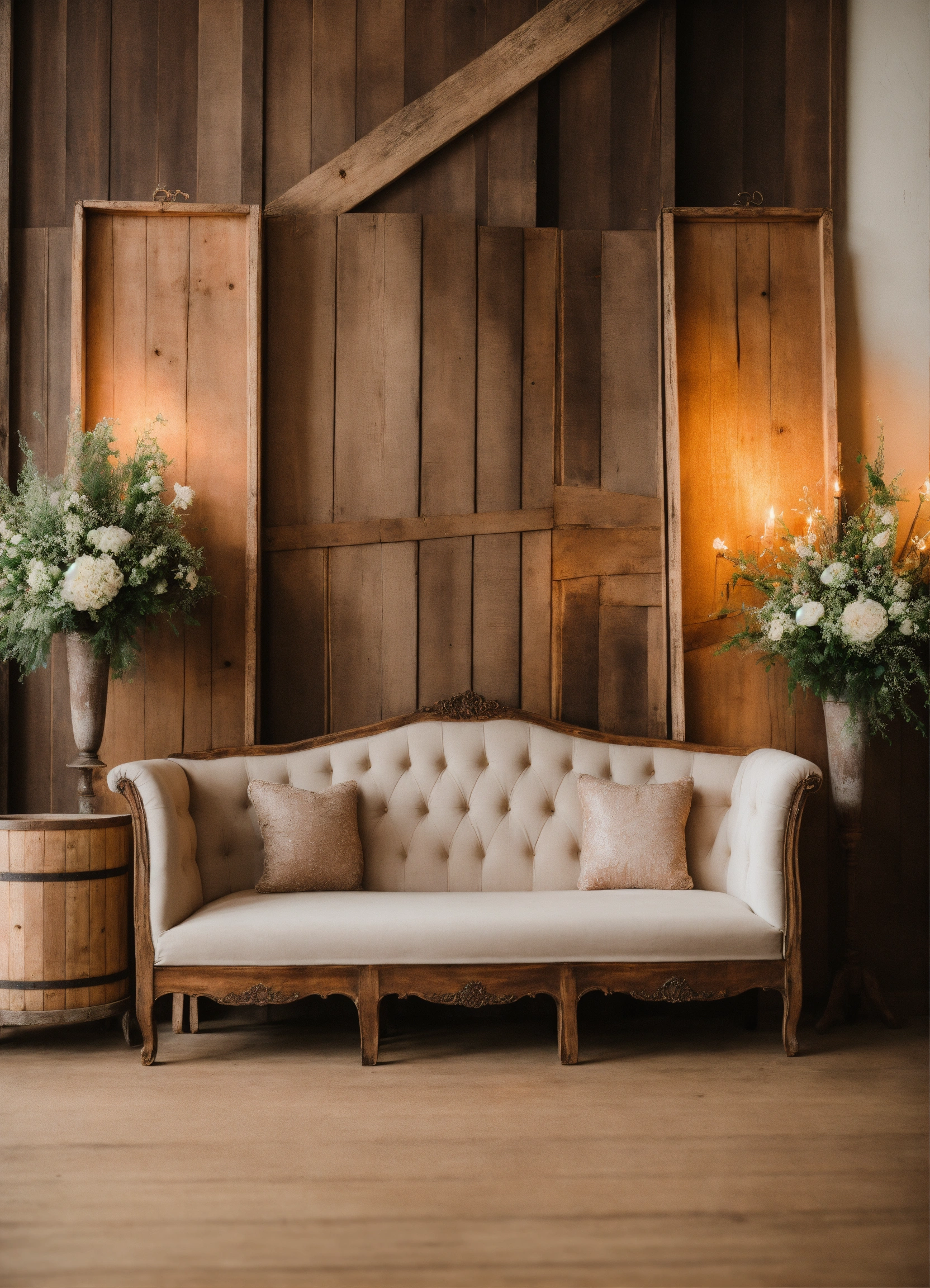 A rustic and elegant wooden wedding backdrop, with 3 vintage mirors, with a sofa, with wooden crates, a beautiful design, for photographie, realistic image