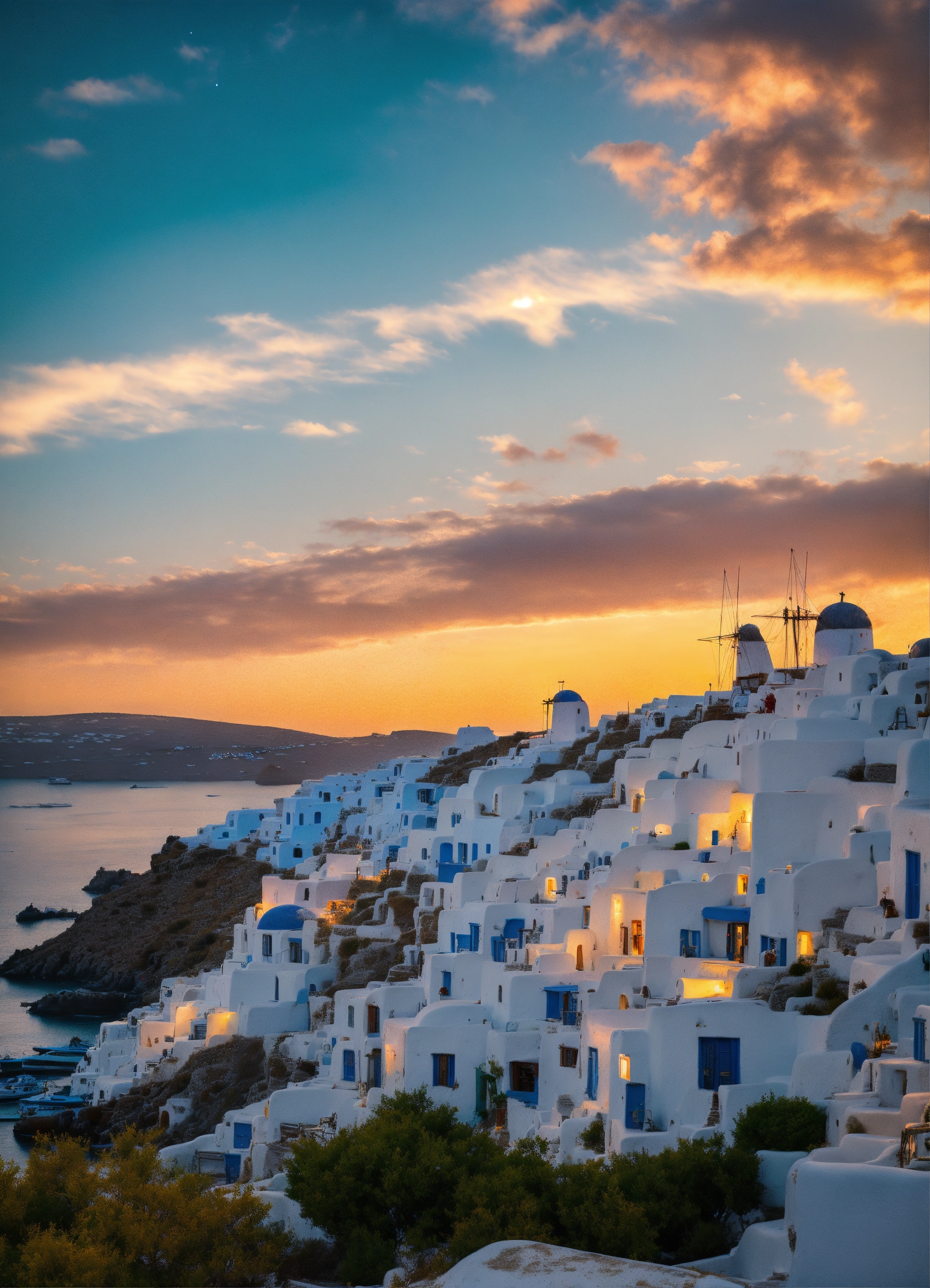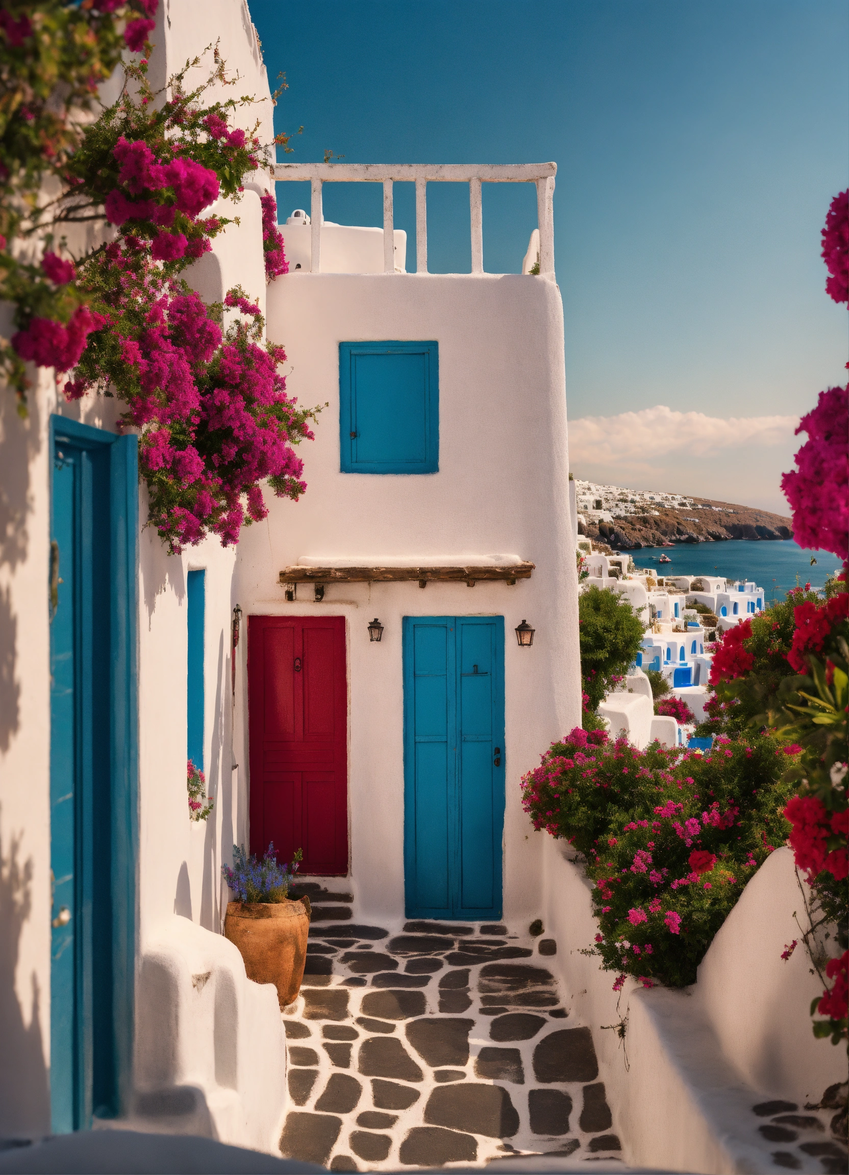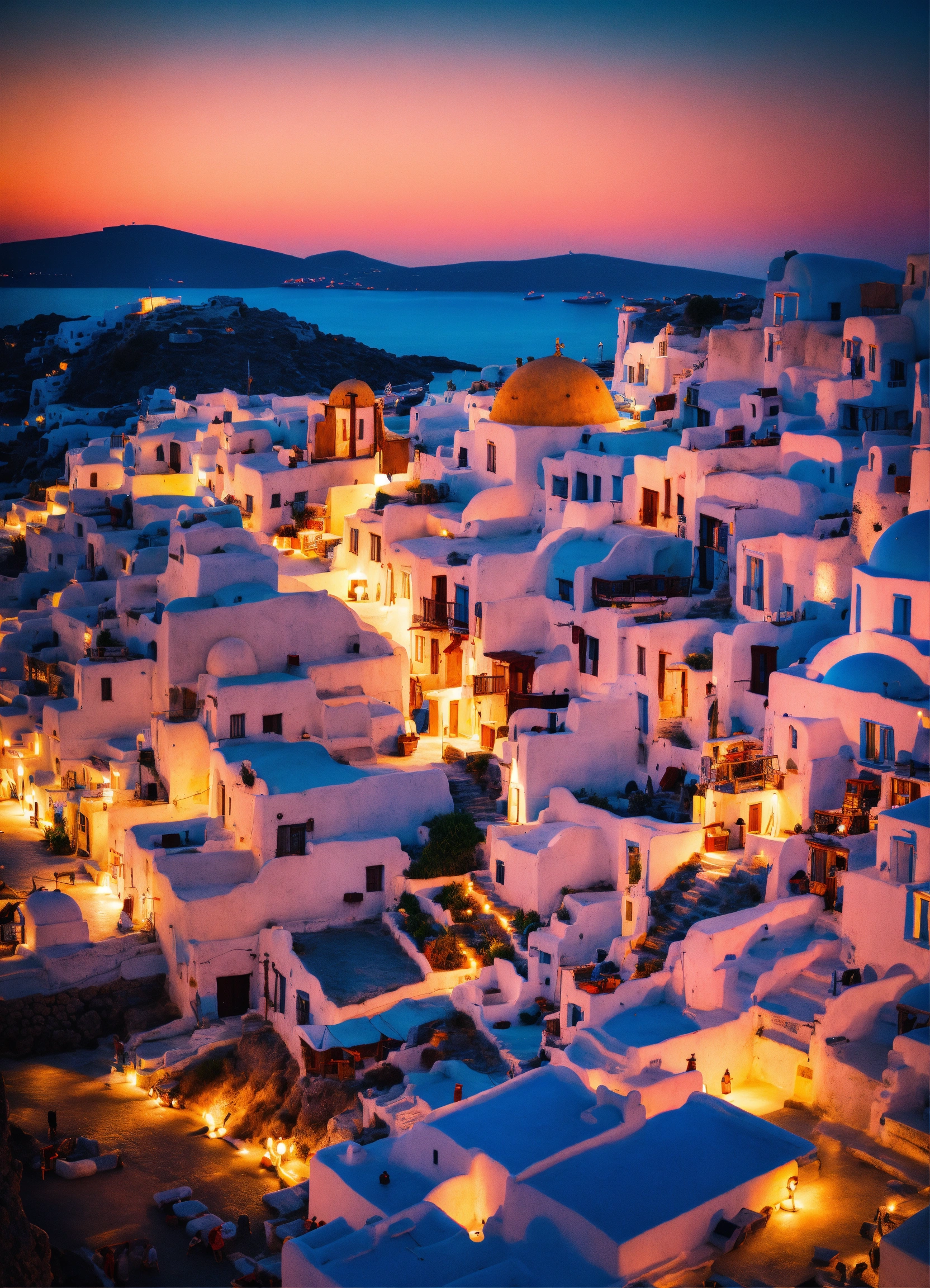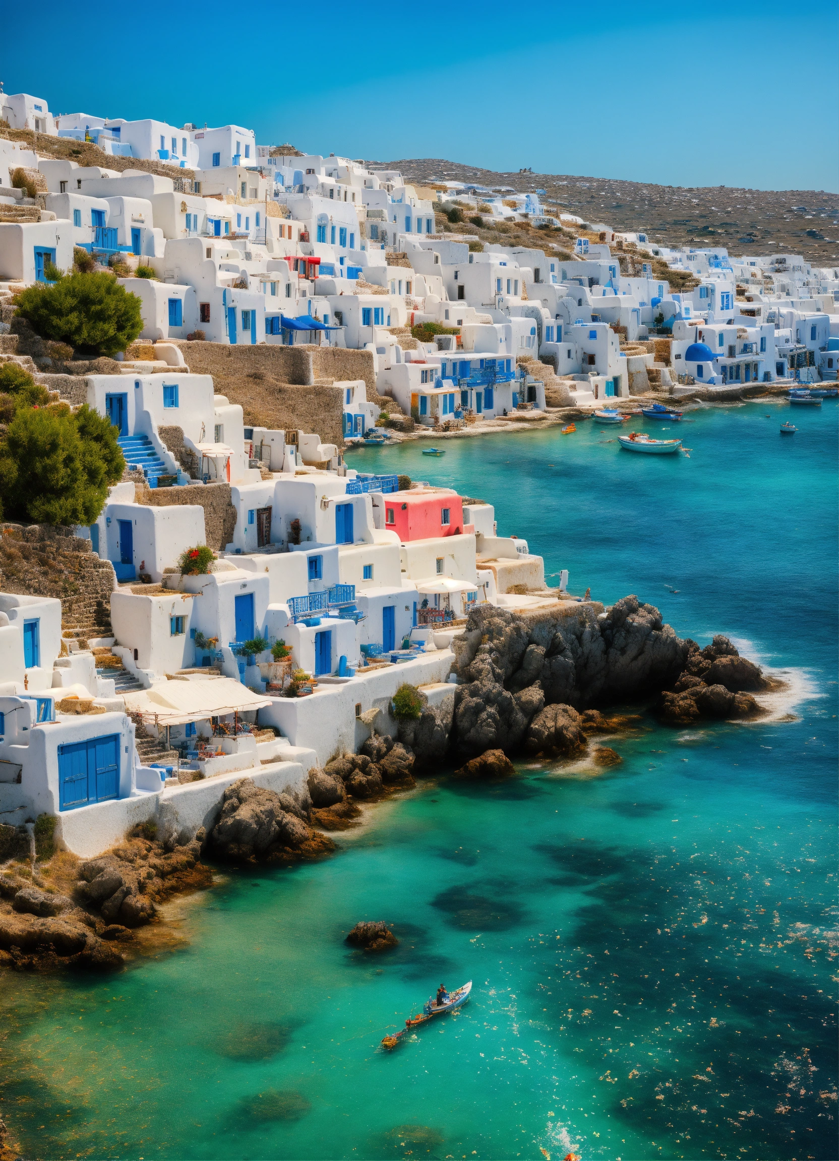 High quality, 8k ultra hd, masterpiece, realistic photo, wash technique, colorful, pale touch, smudged outline, ttartisan tilt 50mm lens, greater depth of field, mykonos wide view, crowded, awesome full sharp colors, summer sky