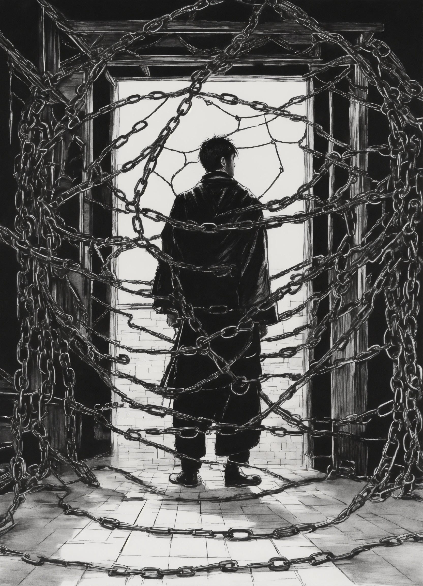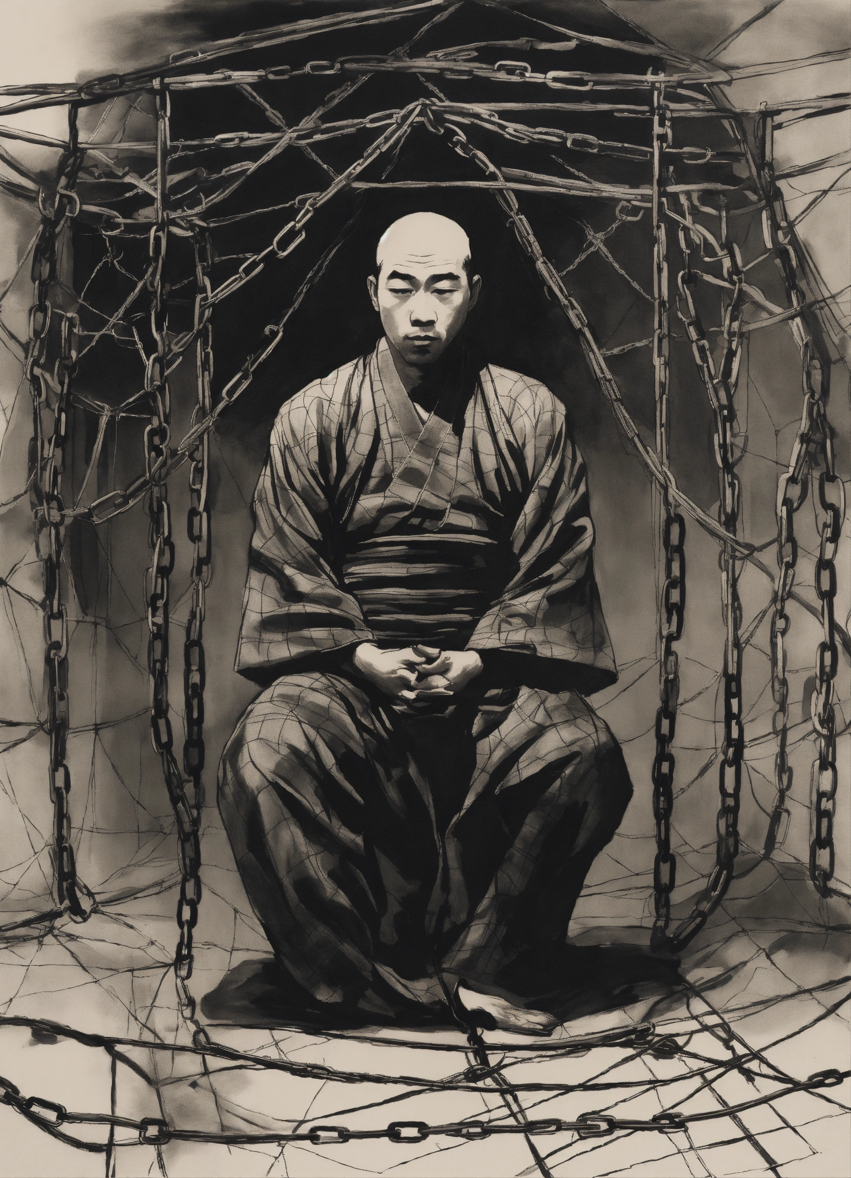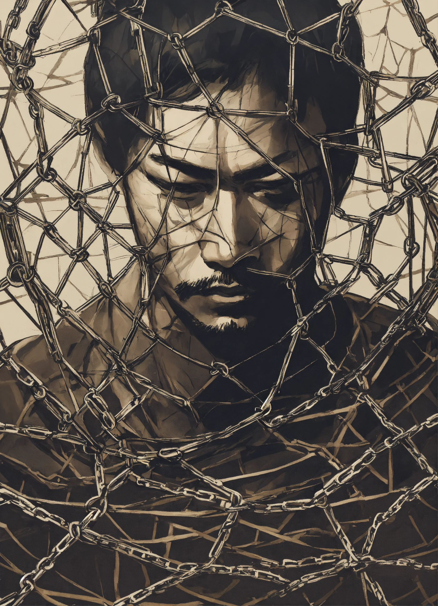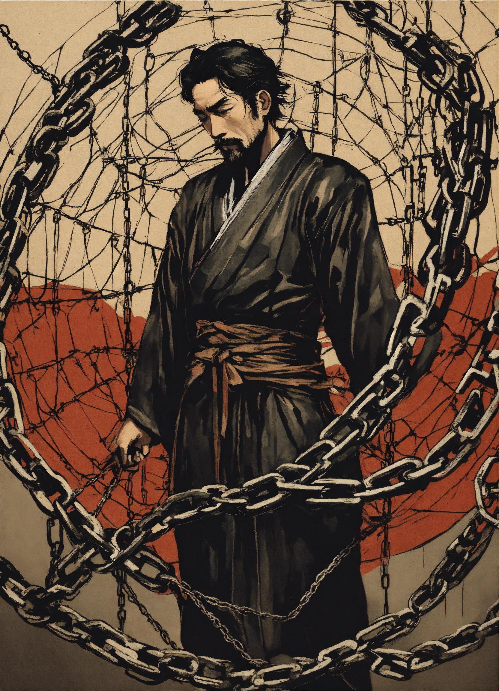 A man in a web of chains in the style of japanese ink drawing