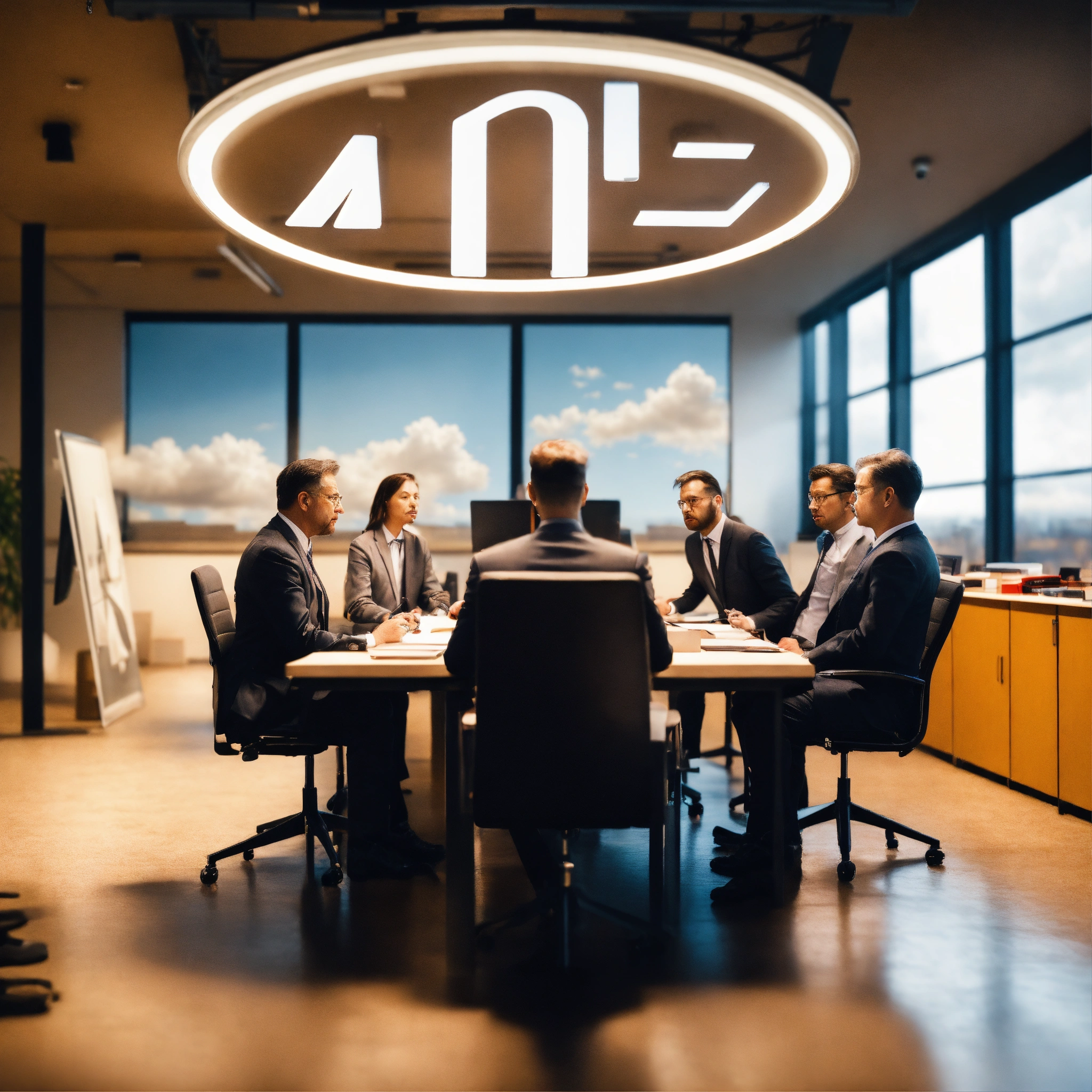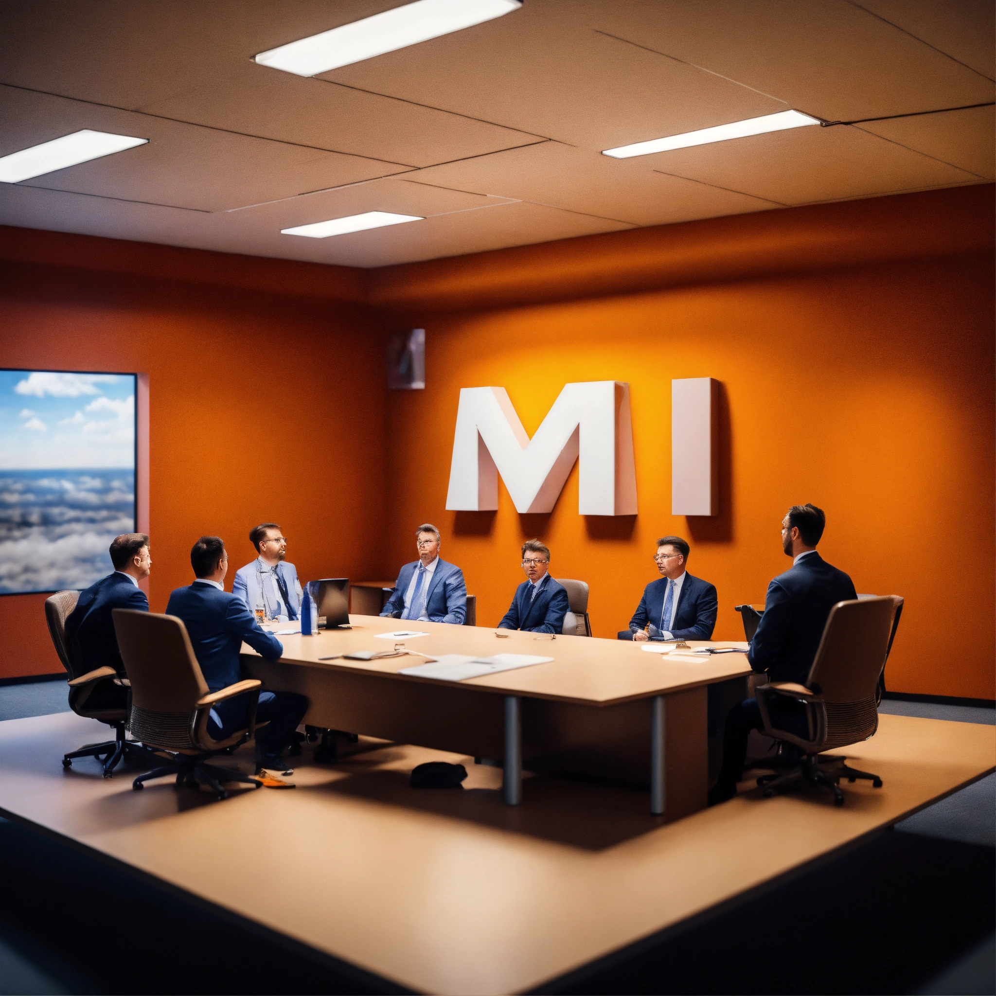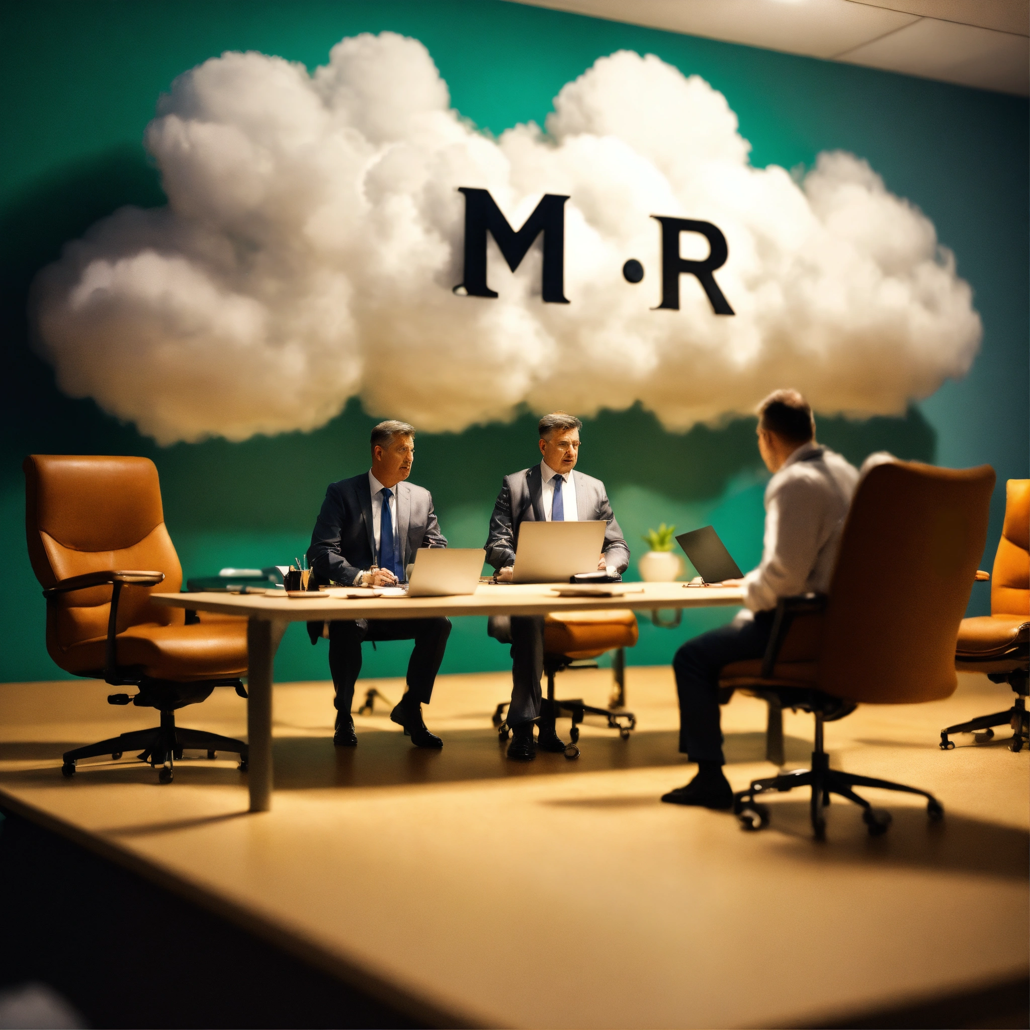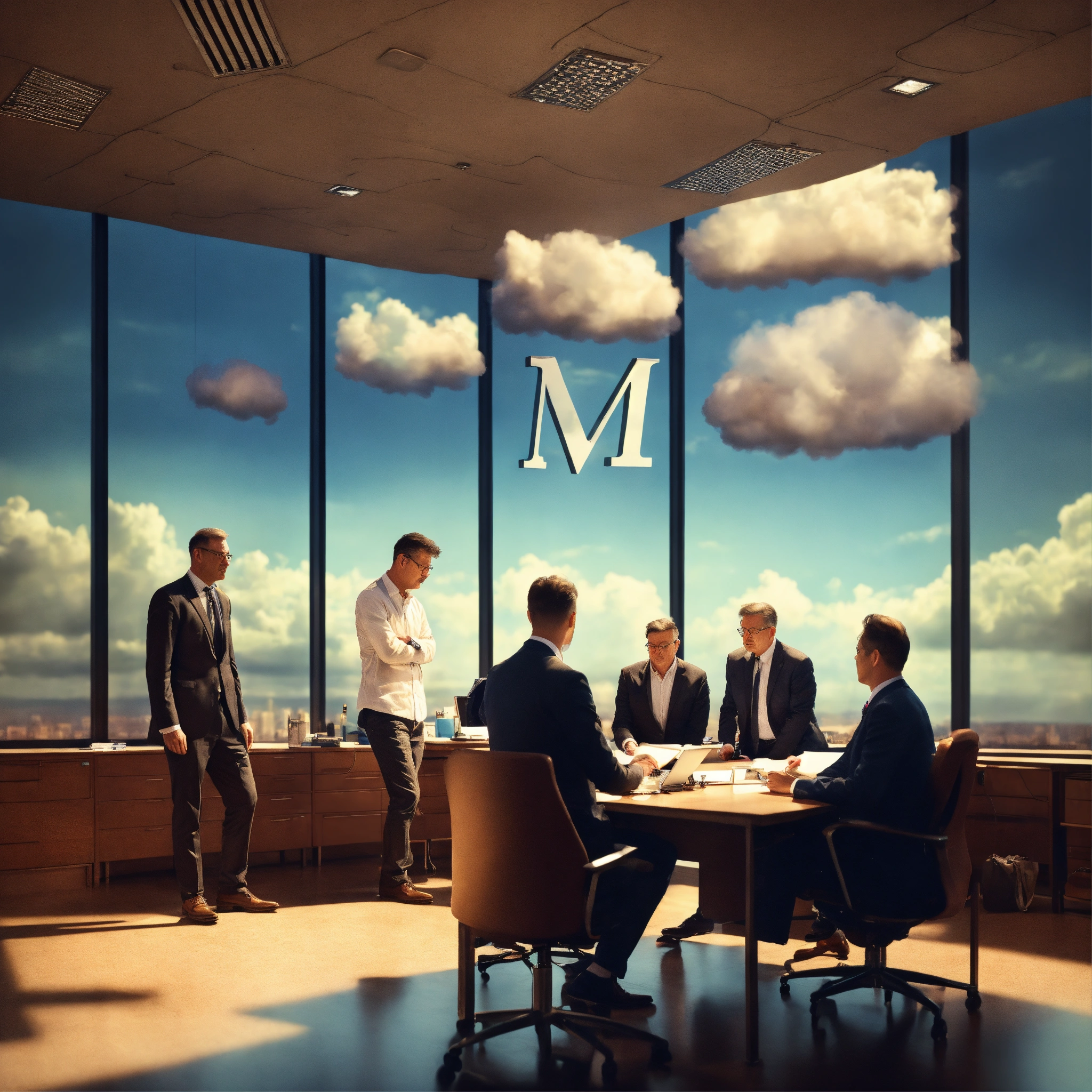 Tilt-shifted photo of a team, manager sad speaks to his team, in a modern open space office, there is a cloud with letter m inside over them, 8k, very coherent, surrealism, airbrush, realistic detailed image, in the style of francis bacon and syd mead and edward hopper
