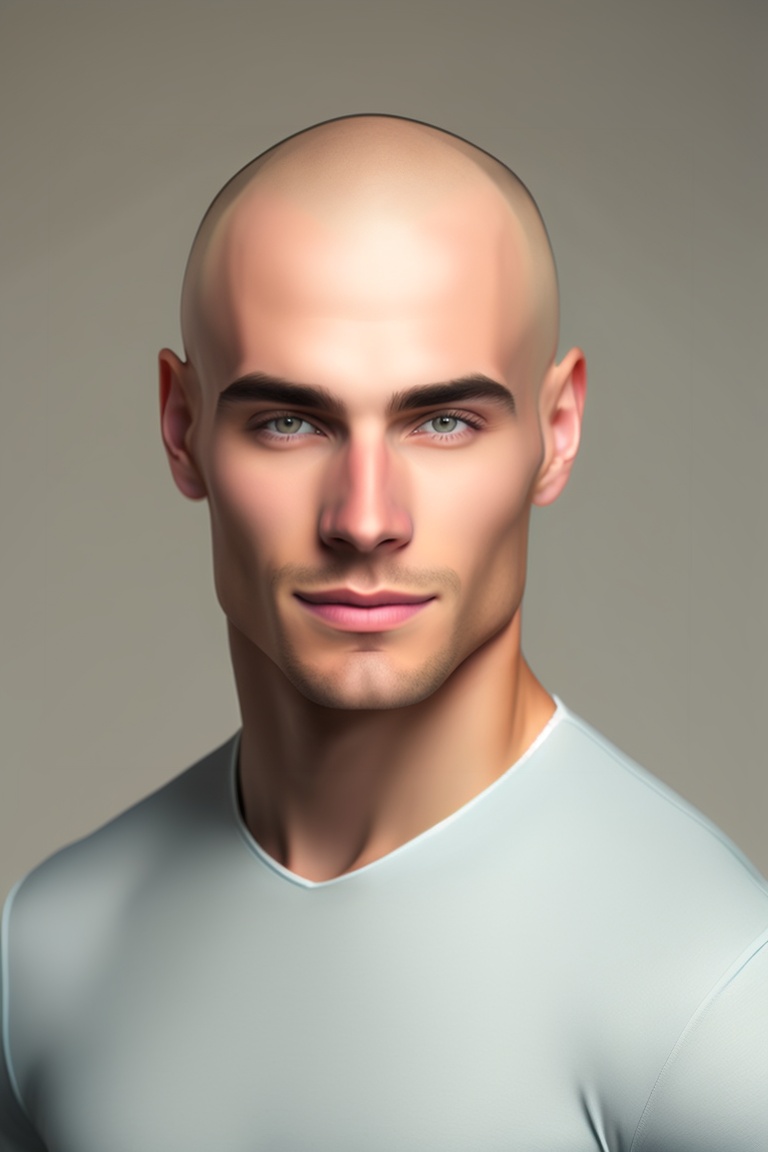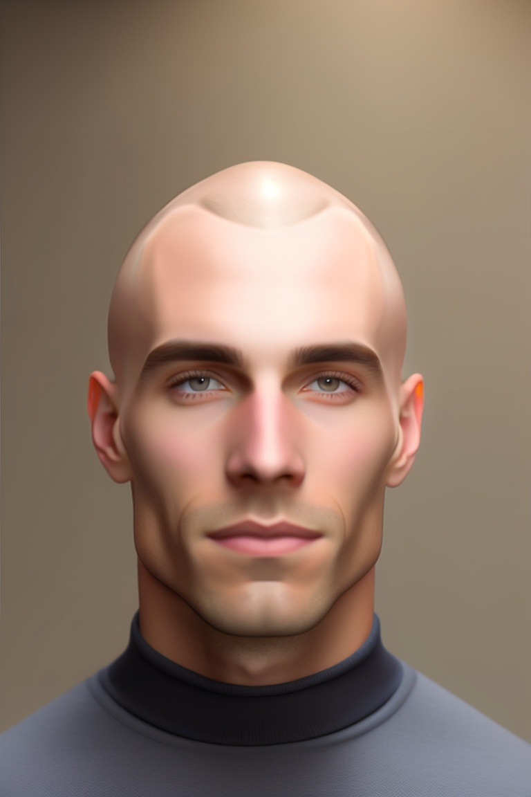 Generates an image of a ectomorphic man with a neutral facial expression and closed mouth should have a shaved head. the person must be standing straight, facing the camera and their entire upper body must be visible. the person's head should be relatively small within the image. lighting should be even and balanced, with no strong shadows or overexposed areas. the background should be discreet and simple, with no objects obstructing the person's face or body. please make sure the image is of high resolution and quality.