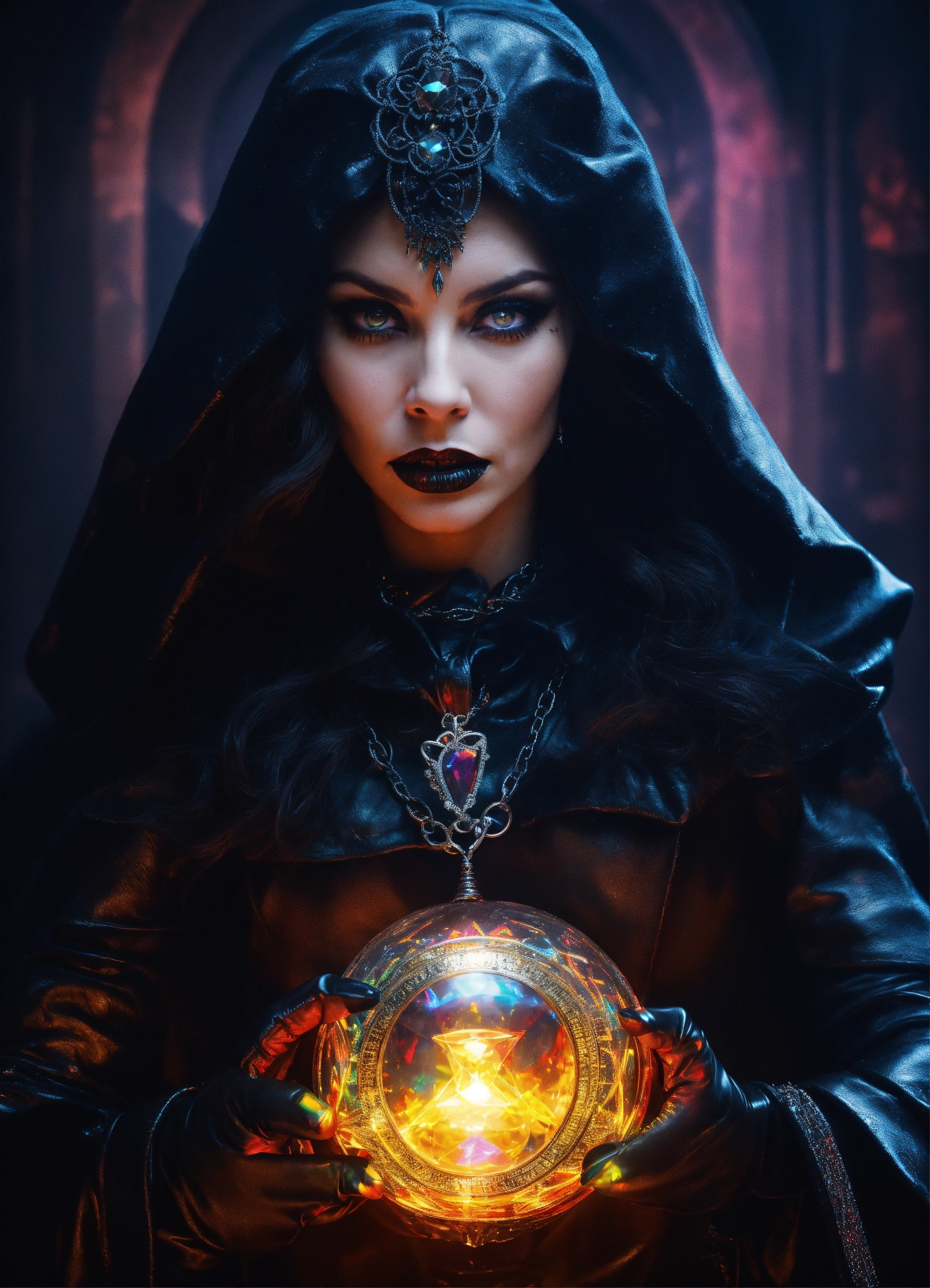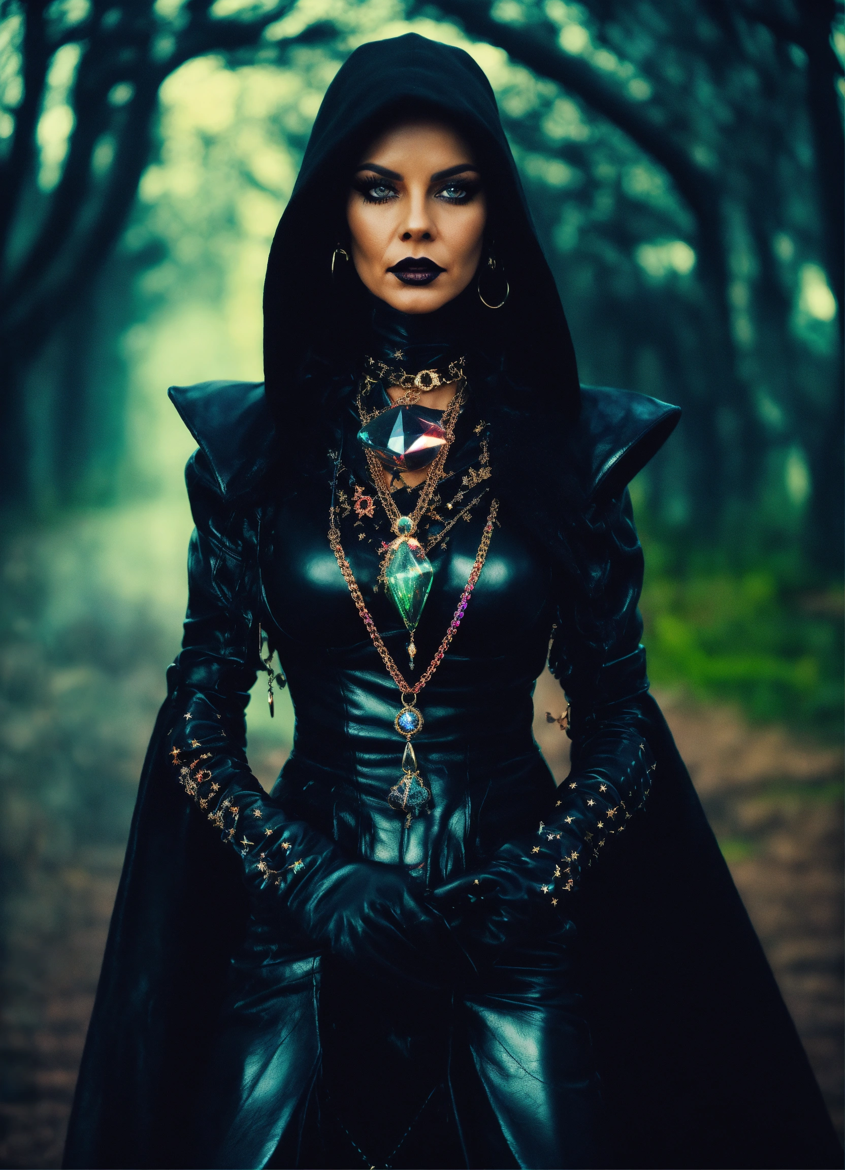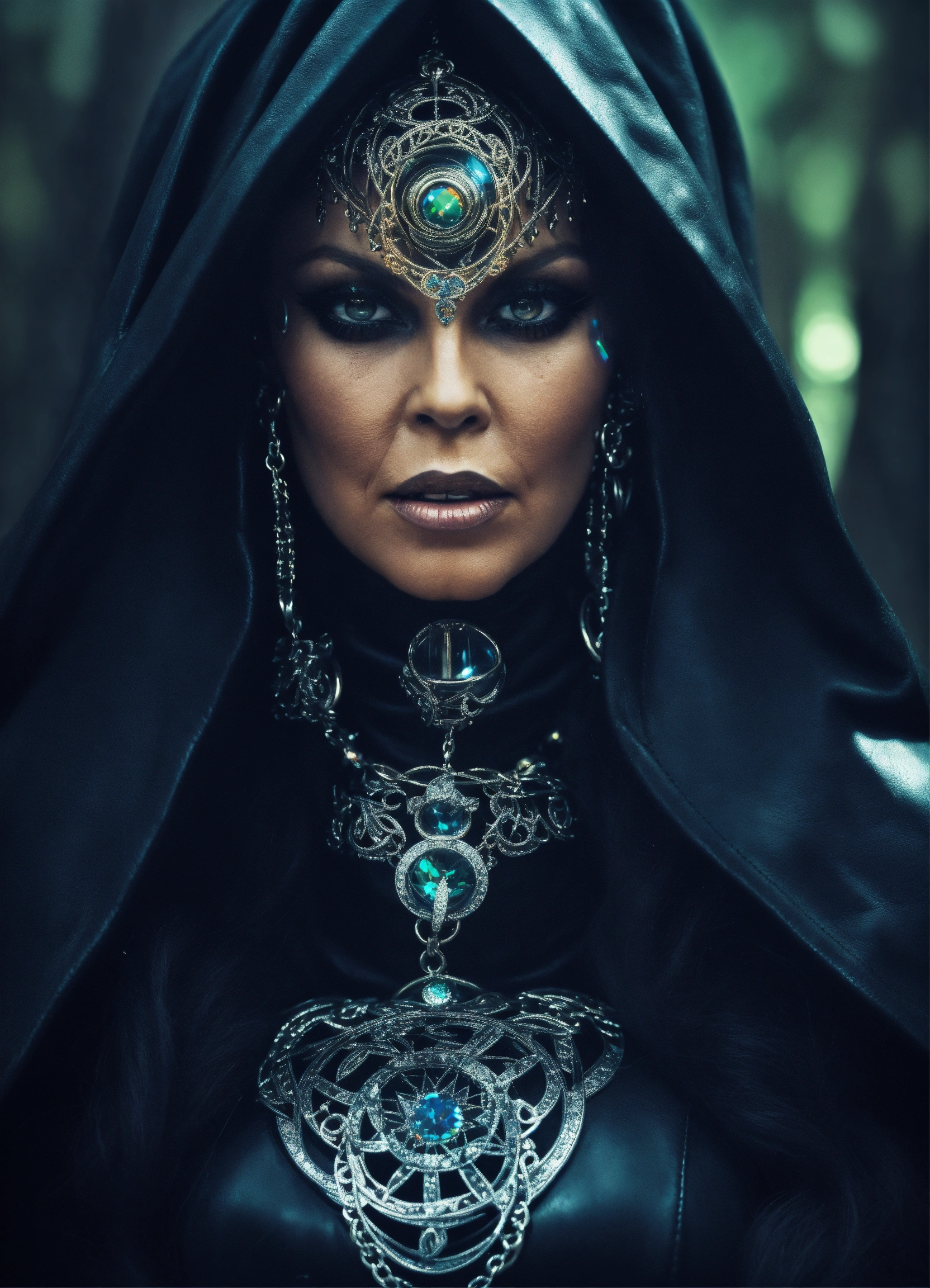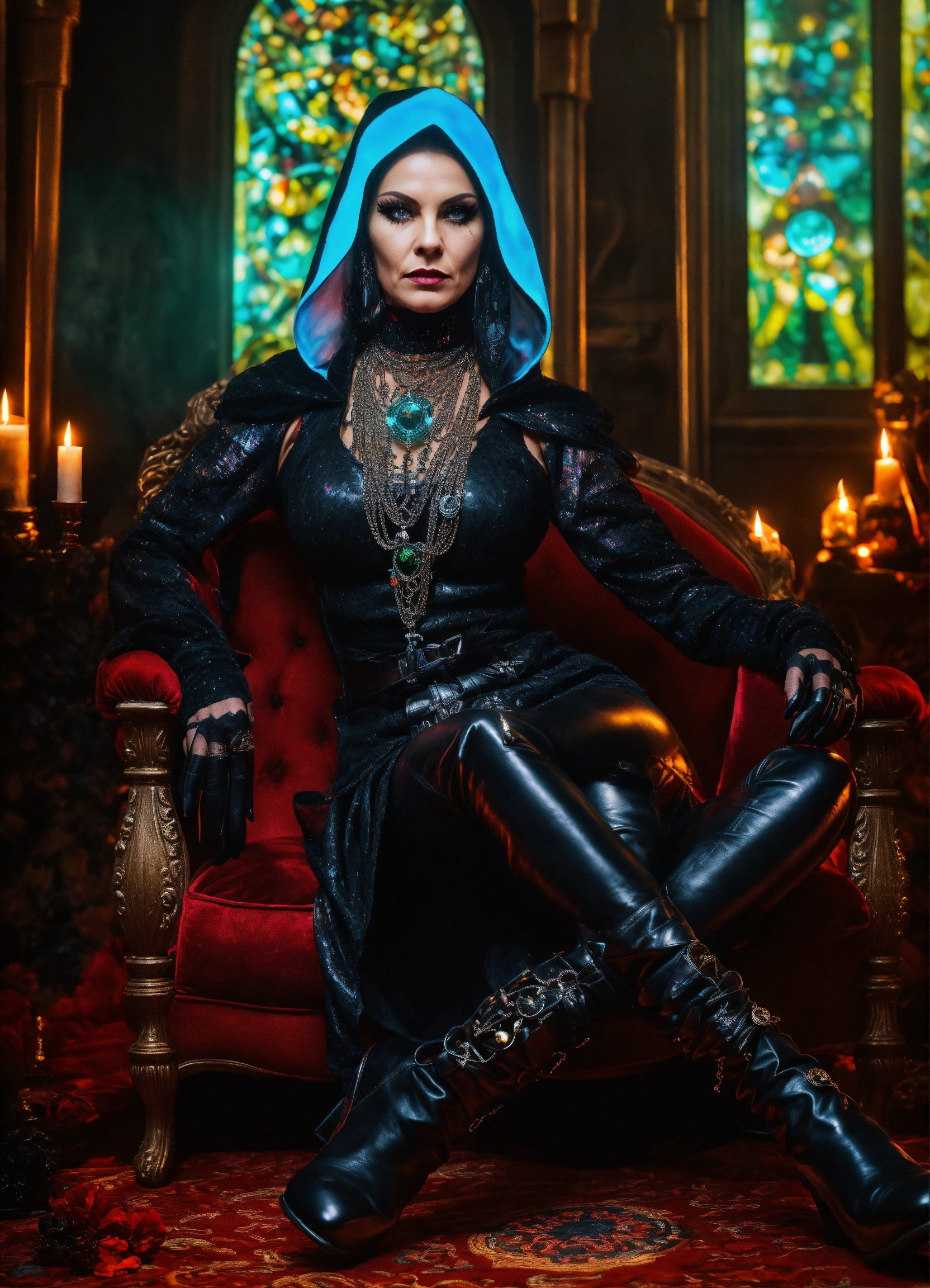 Hypnotic powerful bewitching stunning captivating grandmother wicked "occult black magic" wicked evil sith woman wearing holographic black leather boots & tip less gloves with evil deep spellbinding doom gaze eyes, hypnotizing with her powerful eyes, pendant, & manicured finger snap, her eyes & hour glass figure mind control every thought, mindless helpless with every powerful word