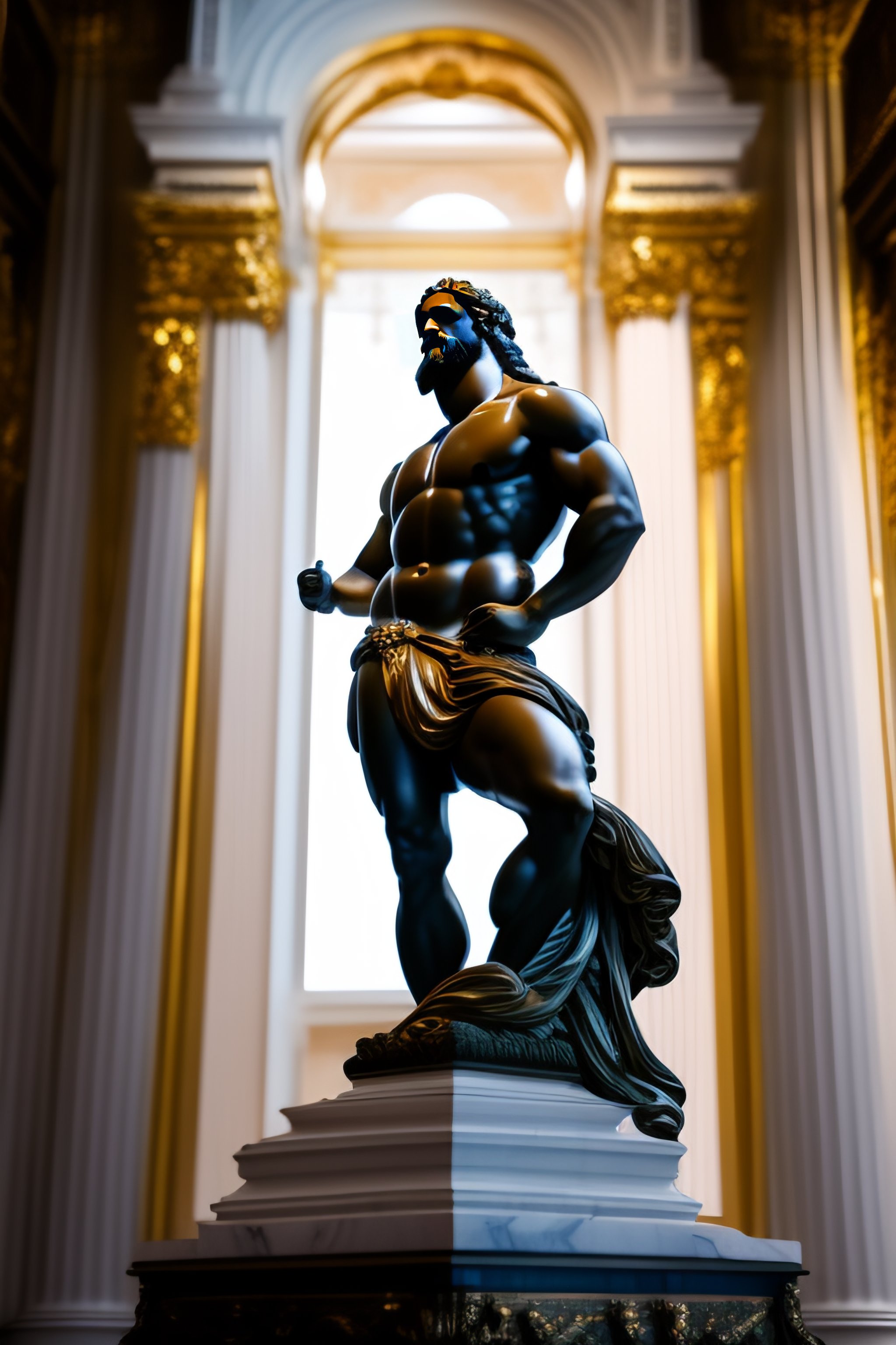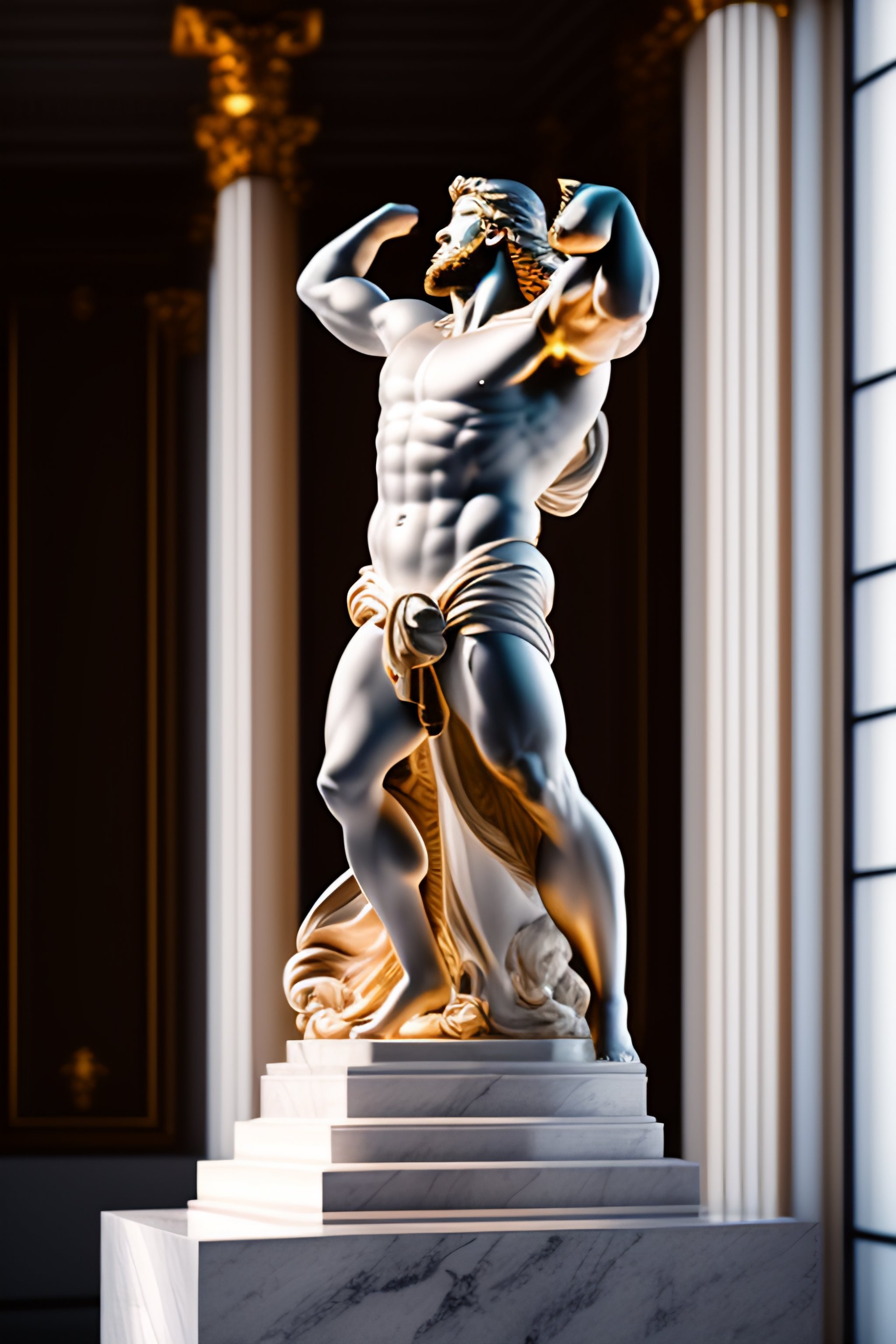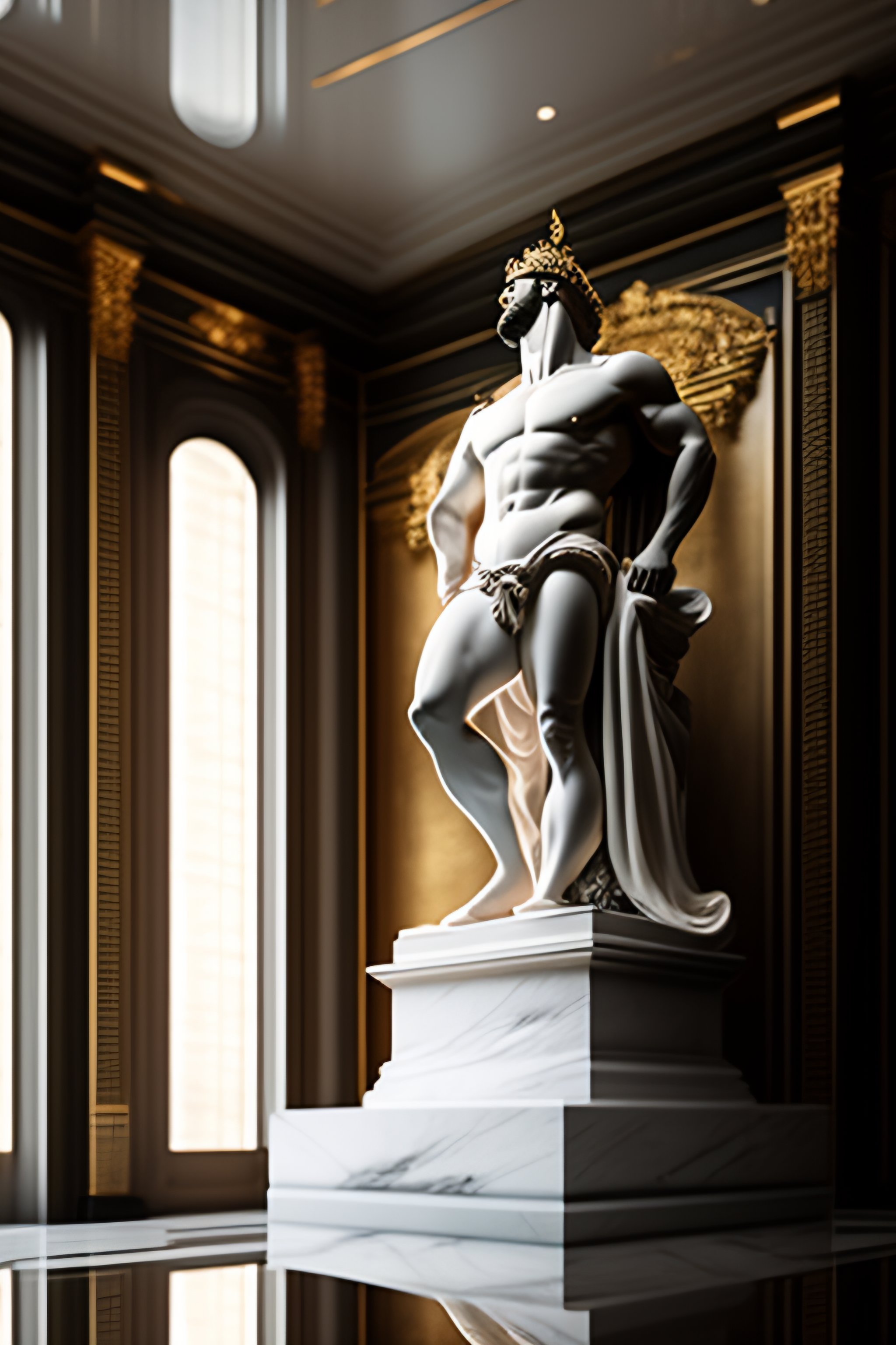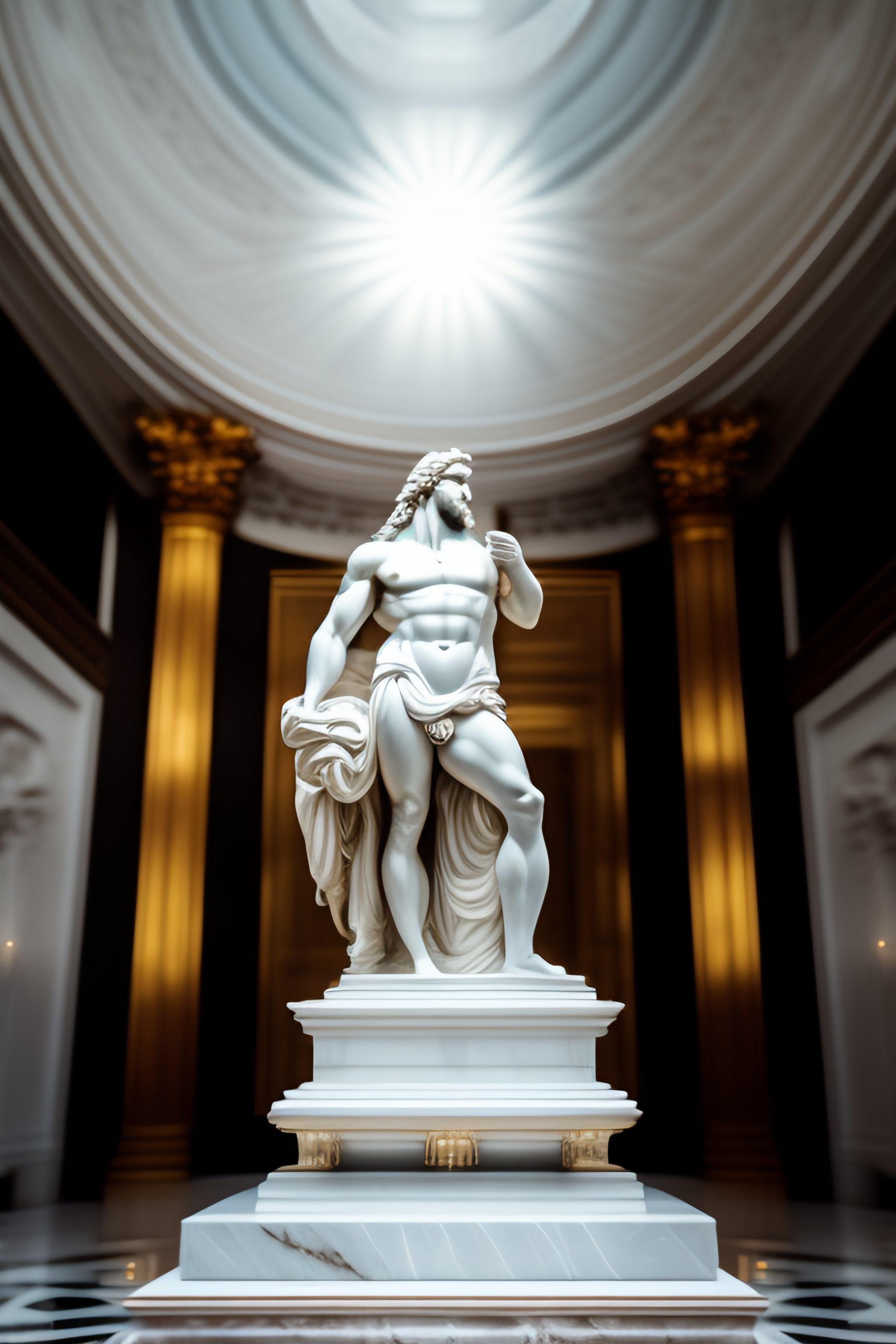 Photo of a bronze statue of zeus, gleaming, reflections, inside a white marble room, seen from below, in the style of michelangelo