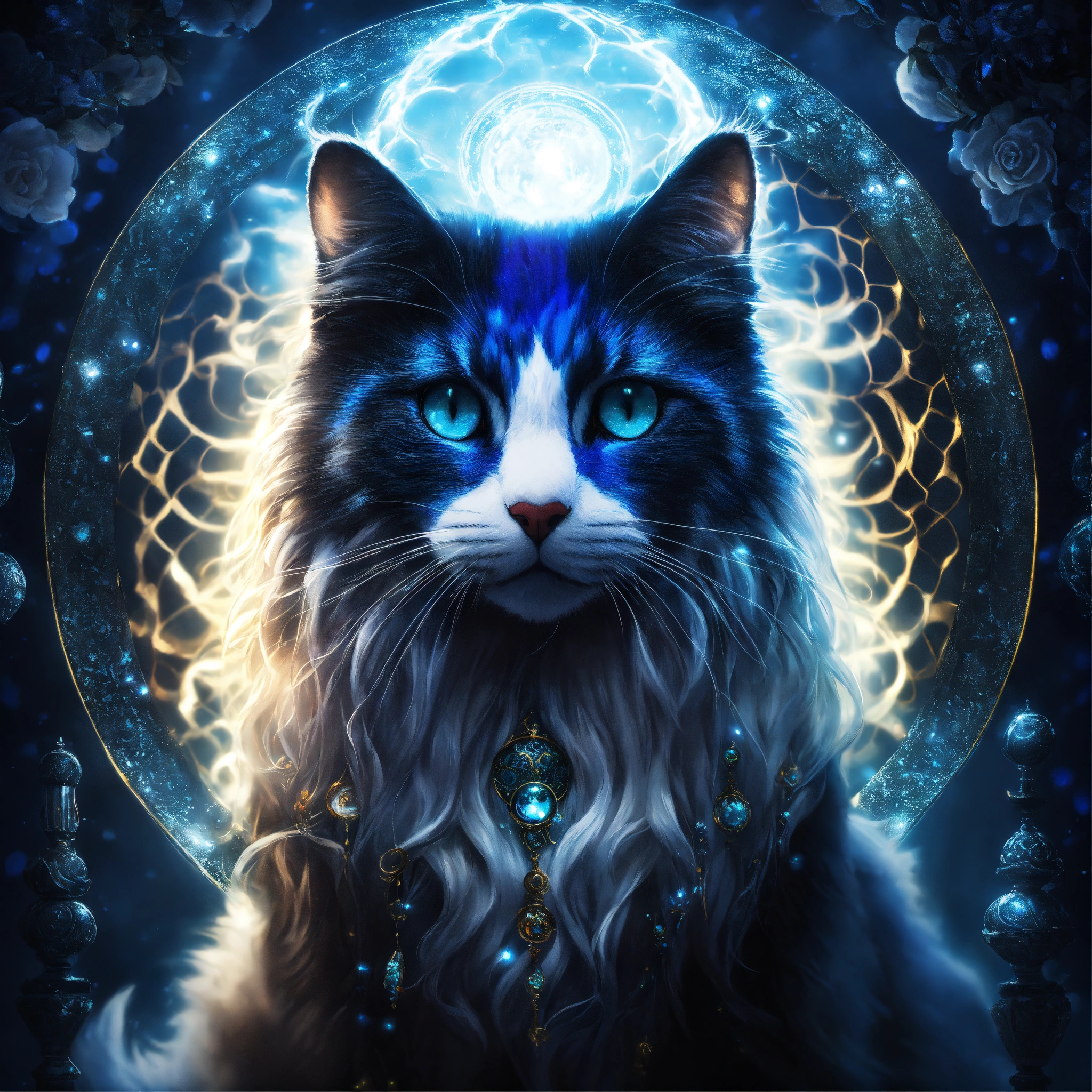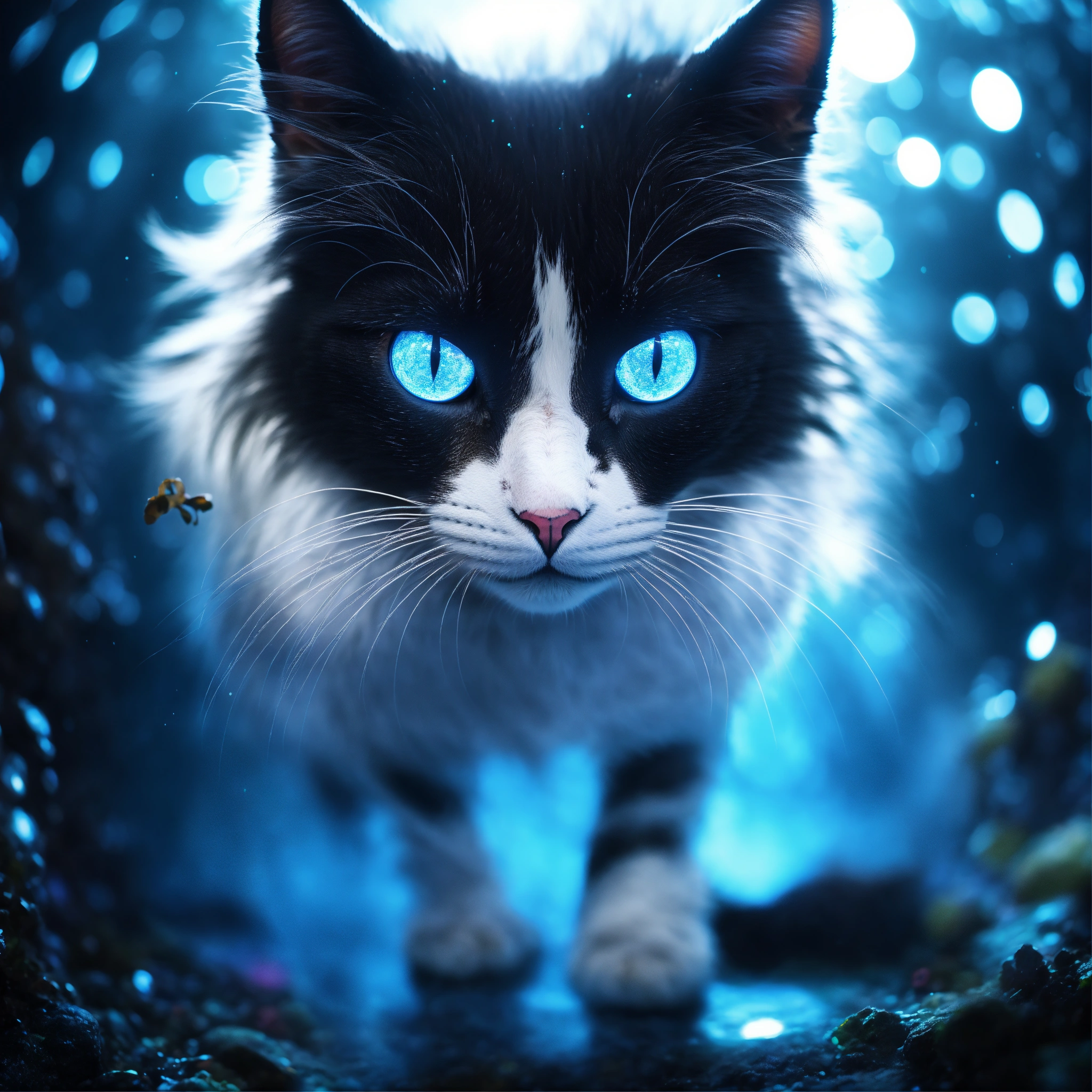 Underwater photography, long exposure, illustrate an athletic black and white mystic cosmic cartoon cat in the style of tim burton, alice in wonderland, and beauty and the beast. blue eyes. front view. front portrait. facing front, no angle. with black and white yin-yang patterns. enchanting. backlit, glowing orb, enchanted aura. backlit lighting, fractal, volumetric lighting, power of the god. white background, no background, zero background, 0 background.