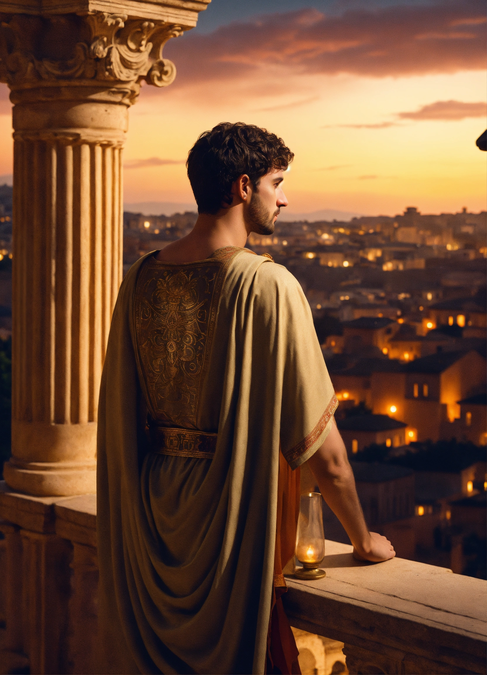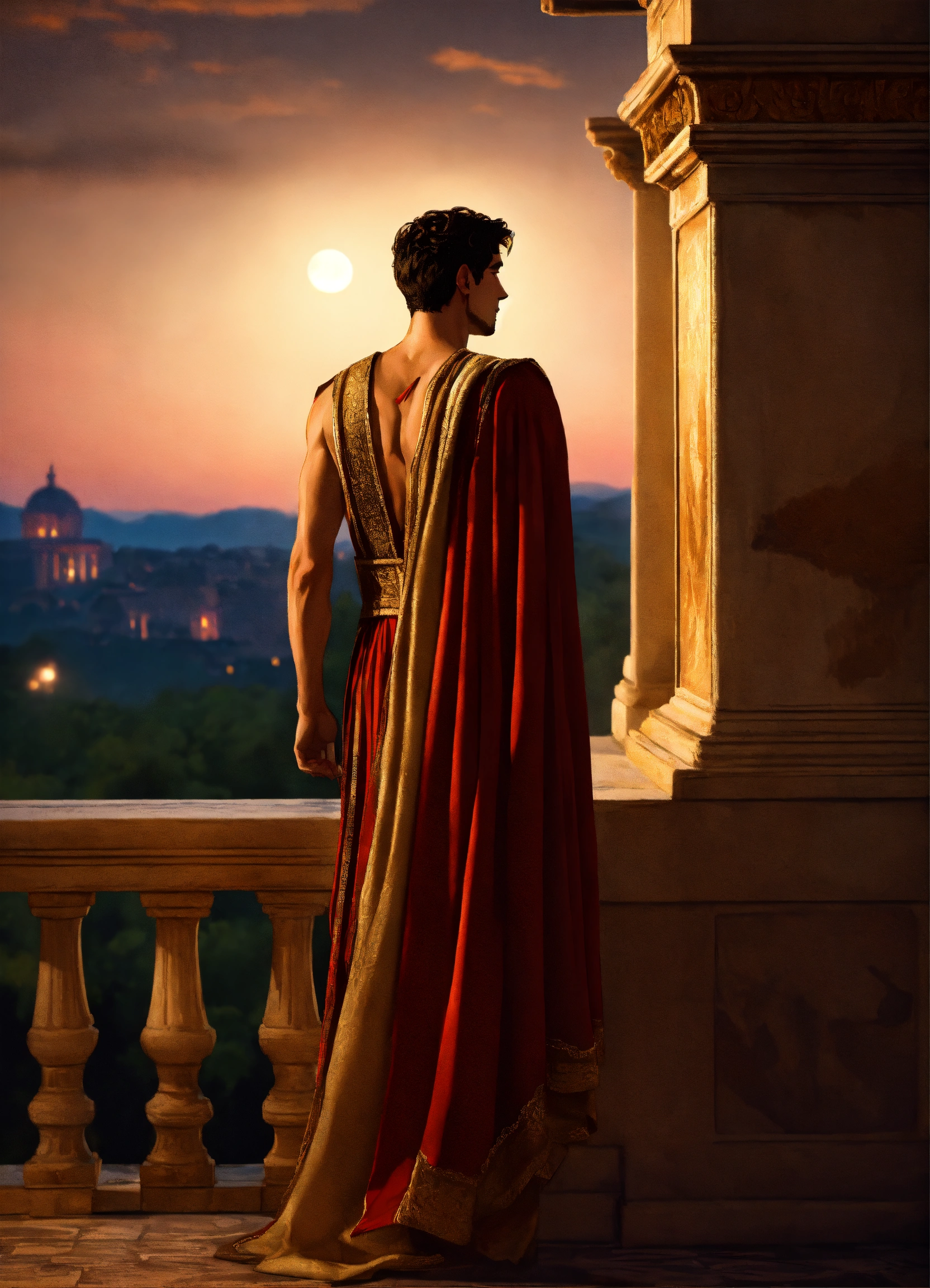 Back view of a young tall noble thin athletic hieratic handsome roman tribune wearing simple historical roman clothes, light-colored tunic, smart, solemn, amused, 30 years old, historically accurate ancient rome, he is looking to the landscape of vineyards from the balcony of his luxurious roman villa, detailed colored decor, photorealistic, hyperdetailed, 8k, at night, dark moonlight, dark, glamorous lights, short hair, dark-haired, portrait