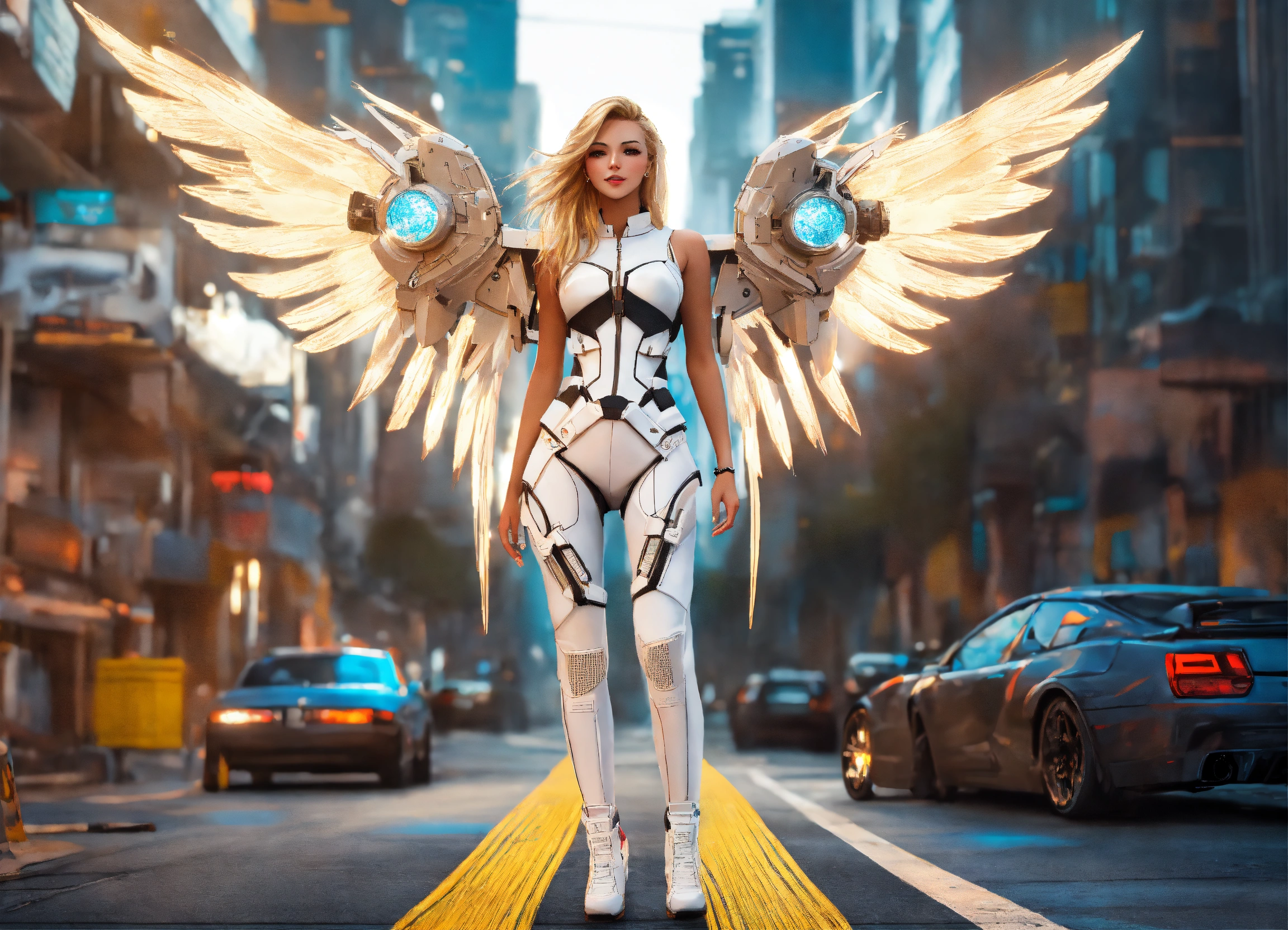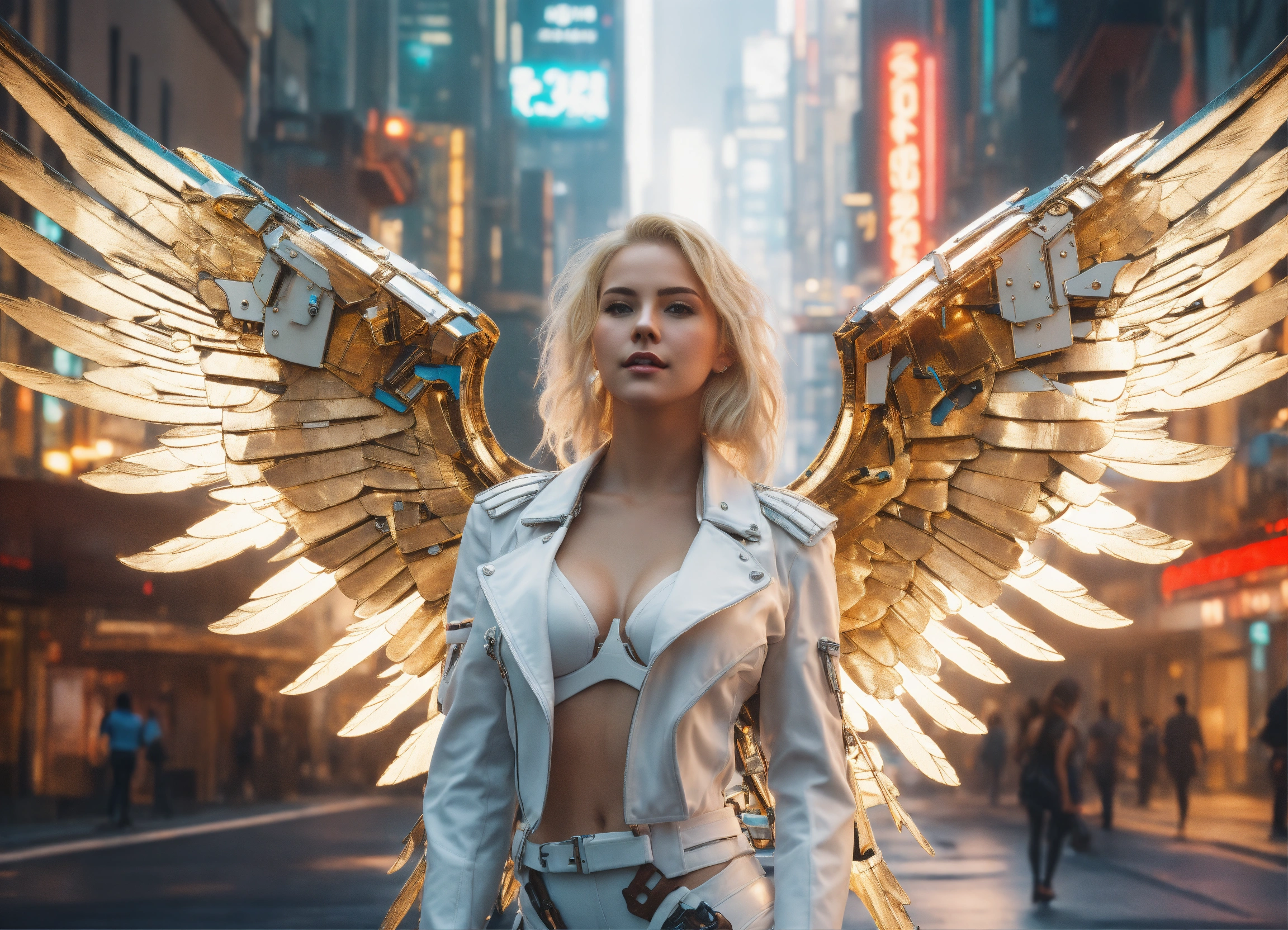 Real life photo top view full body digital art of a women looking aroused satisfied has blond hair 25 year old woman with big angelwing's wearing white mechsuite in a cyberpunk like city street