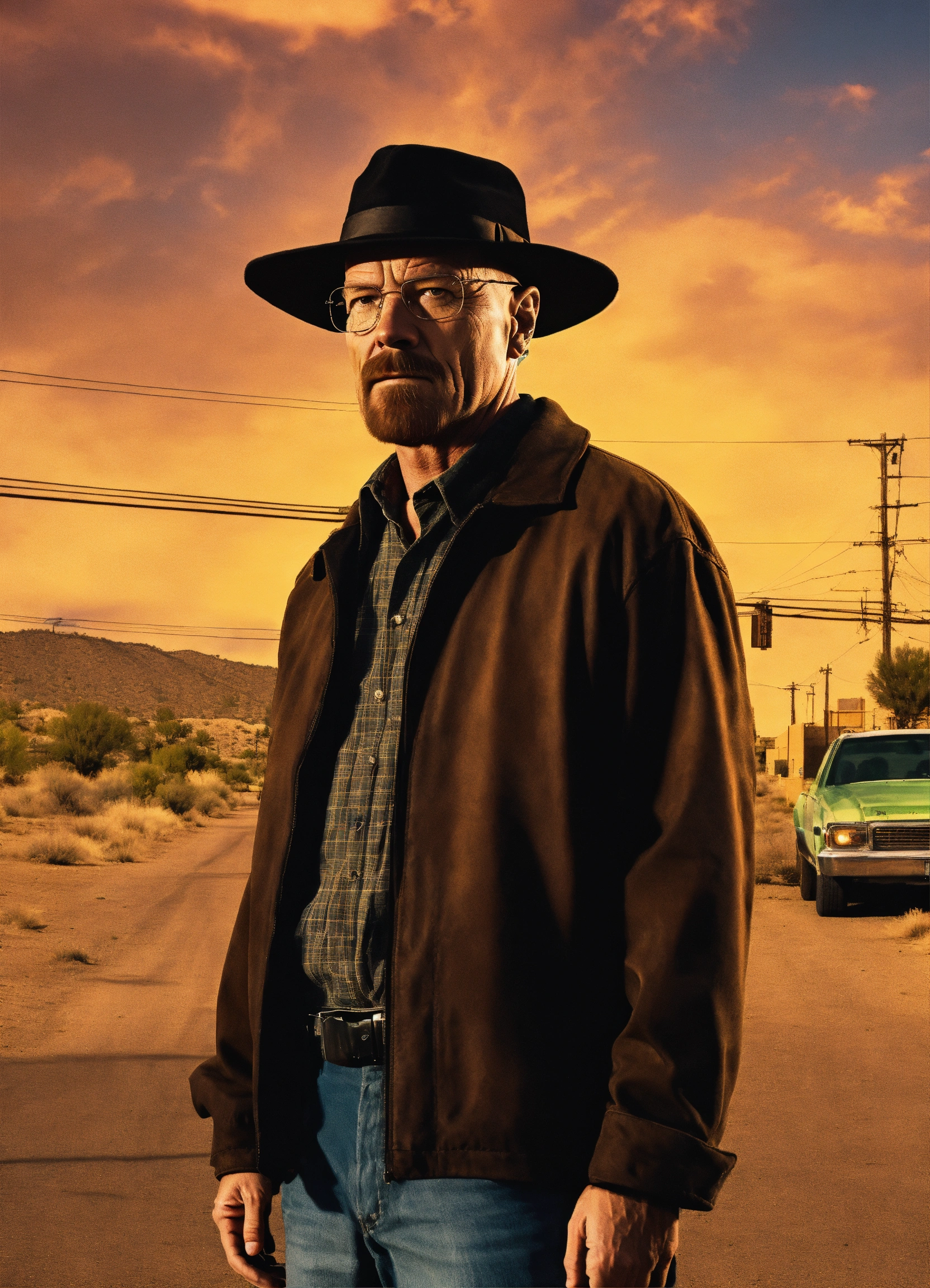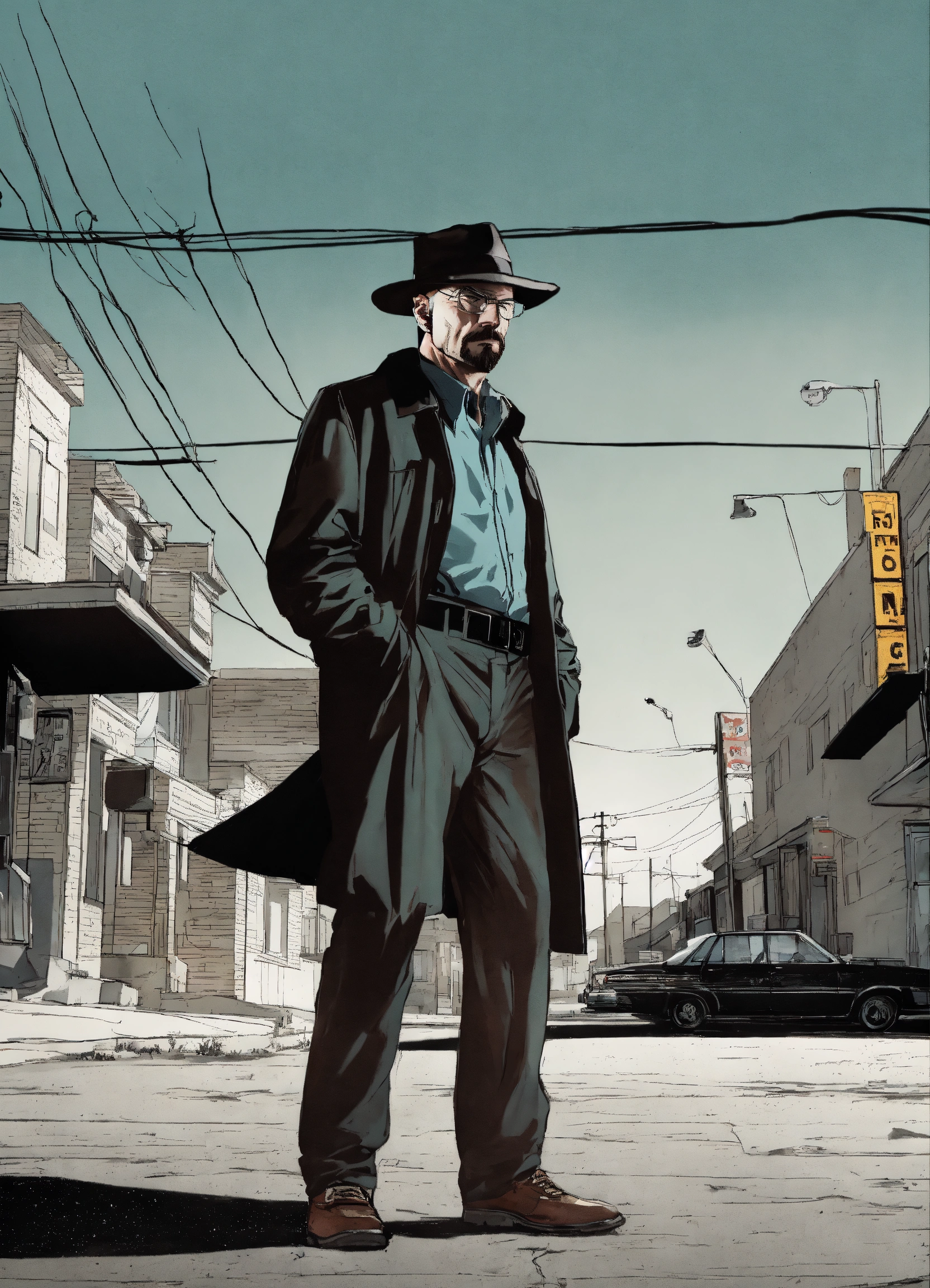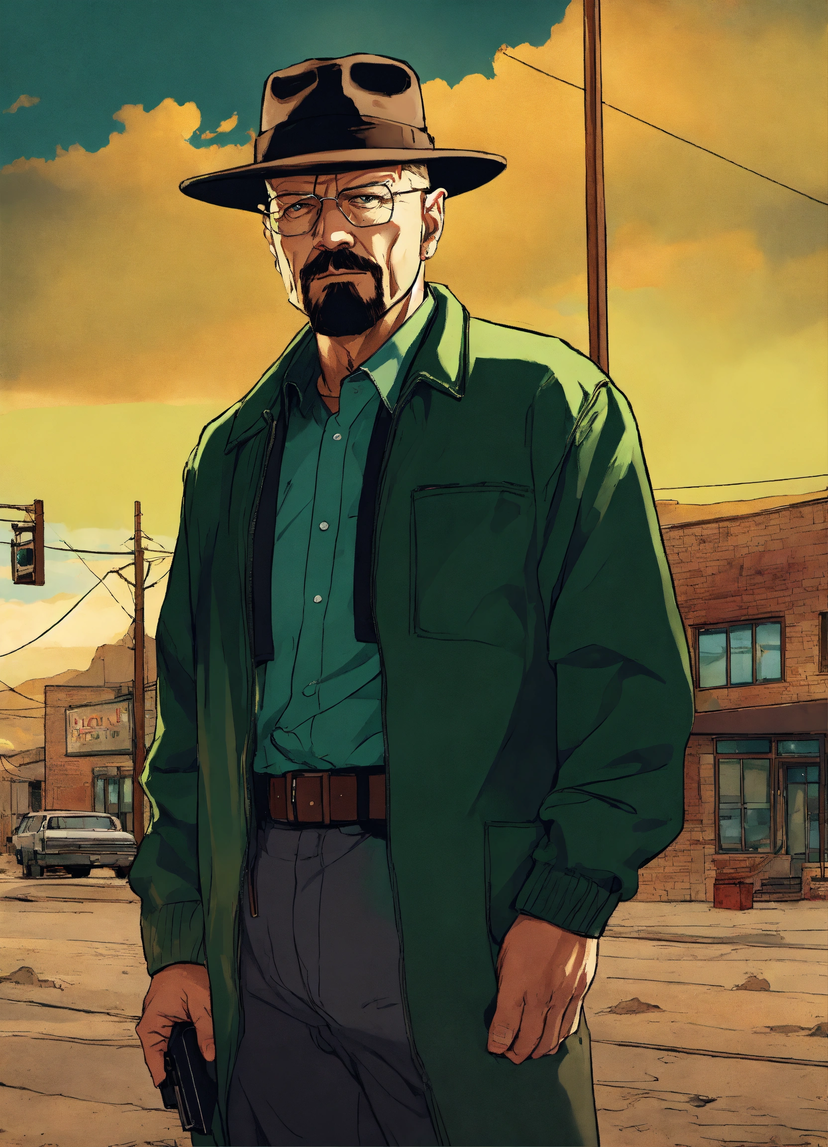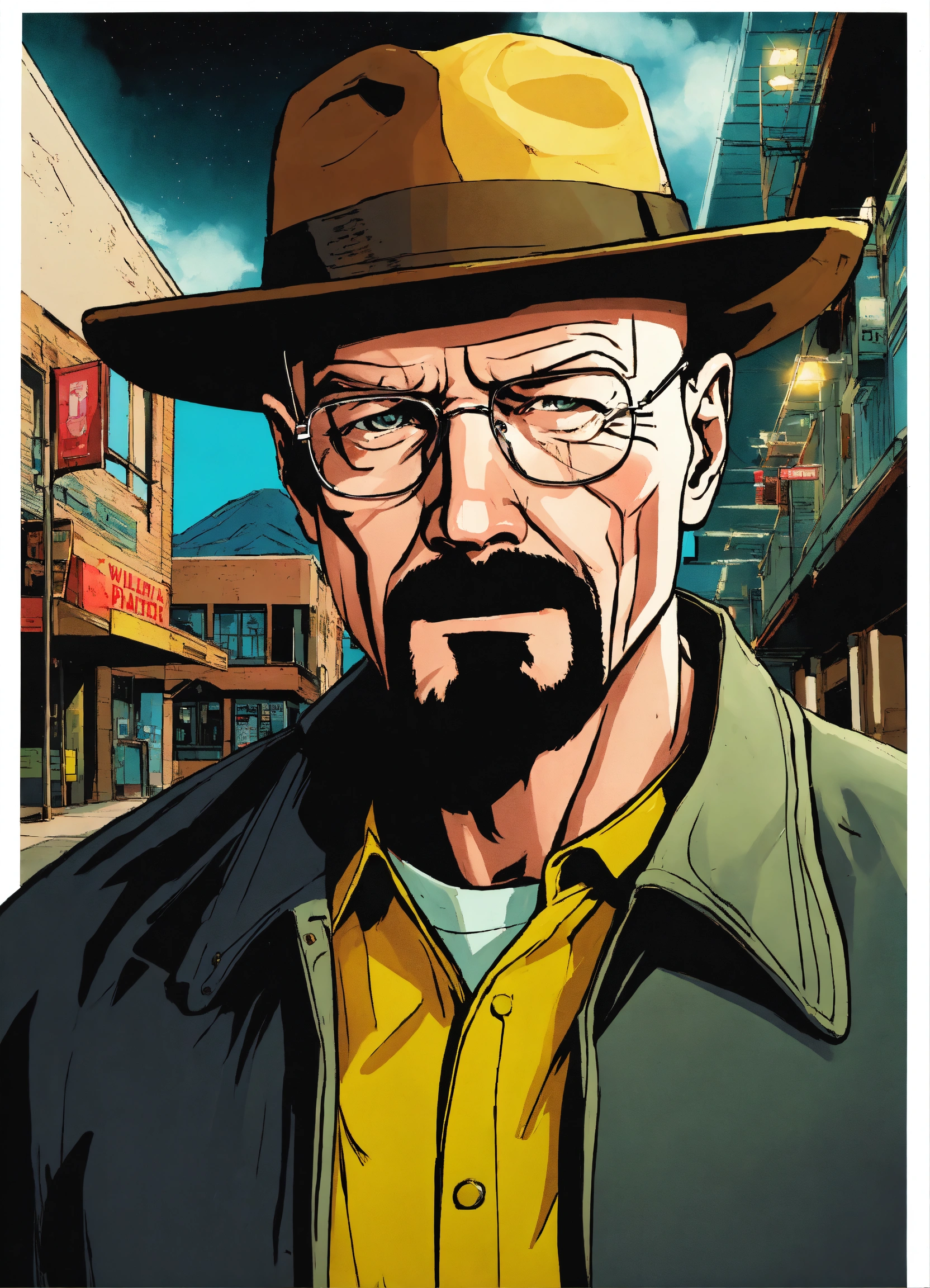 Profile picture, walter white, breaking bad, black hat, standing in albuquerque street with serious look, comic character