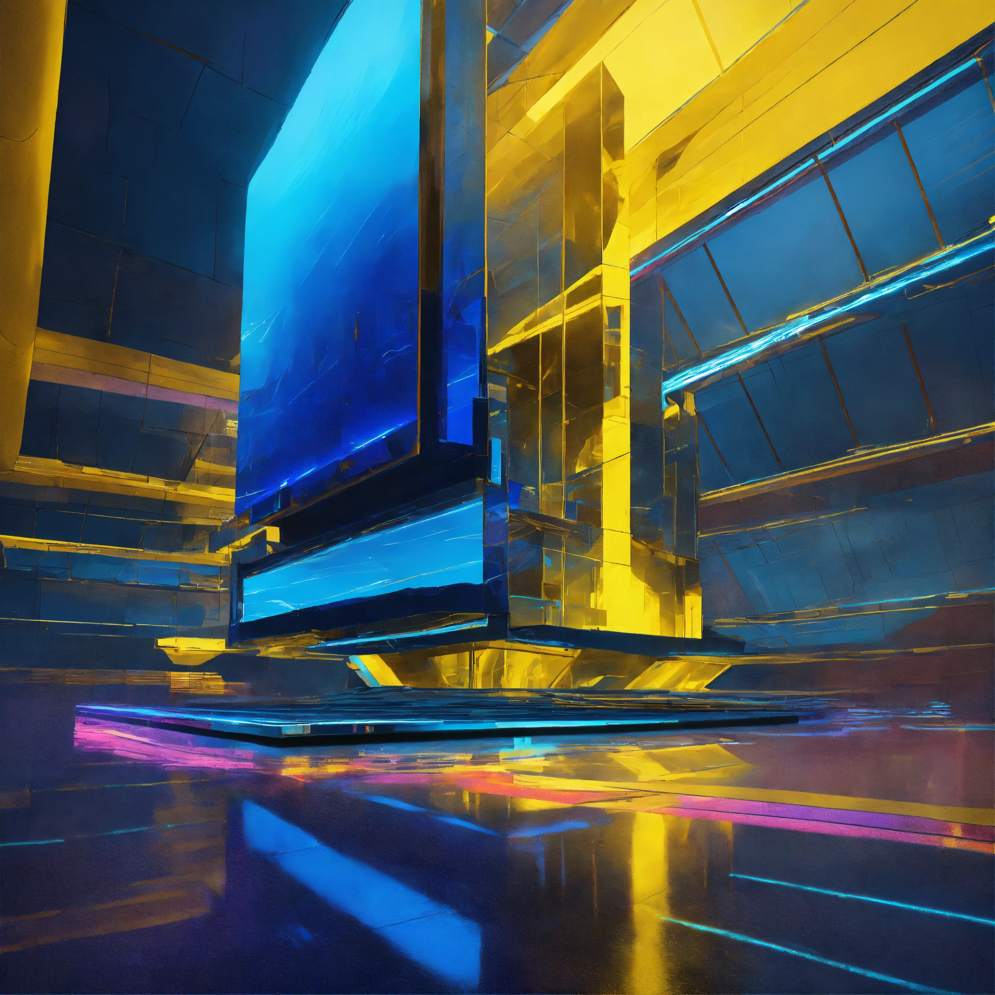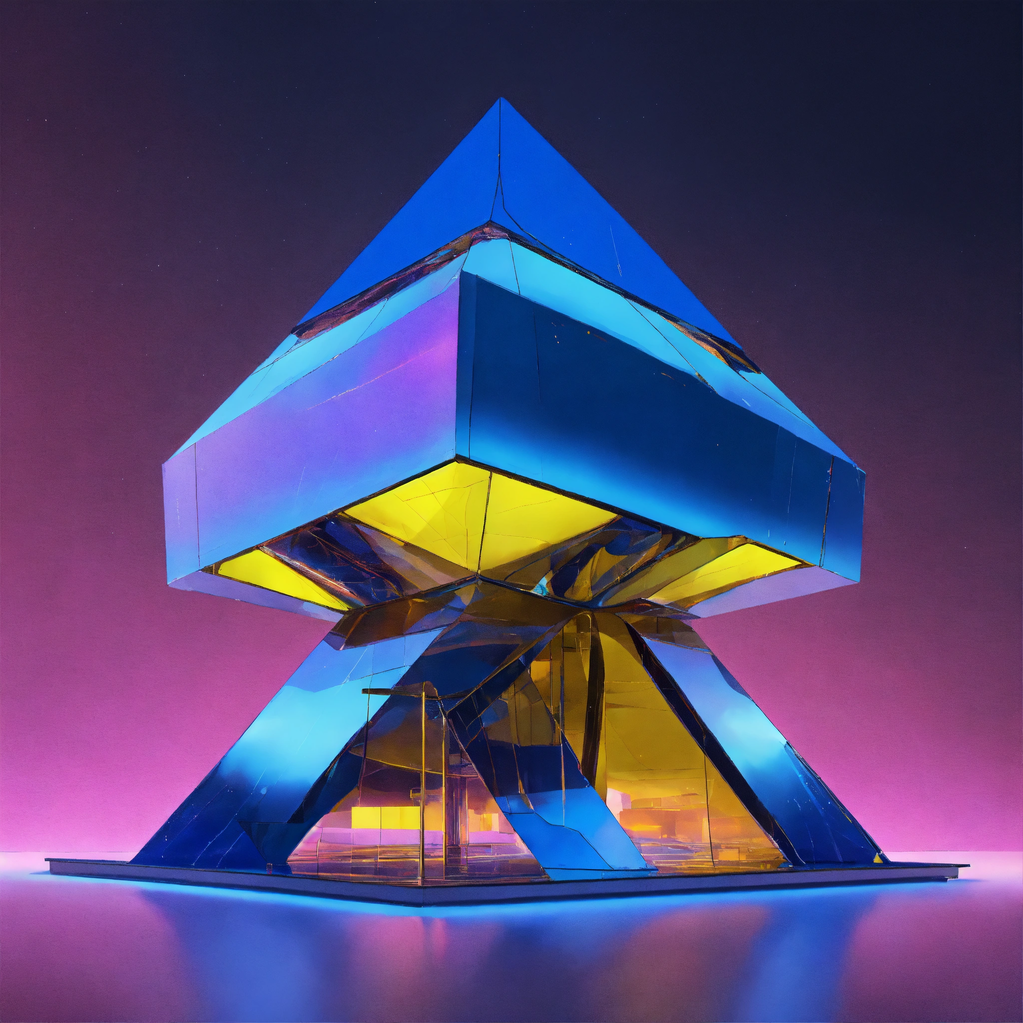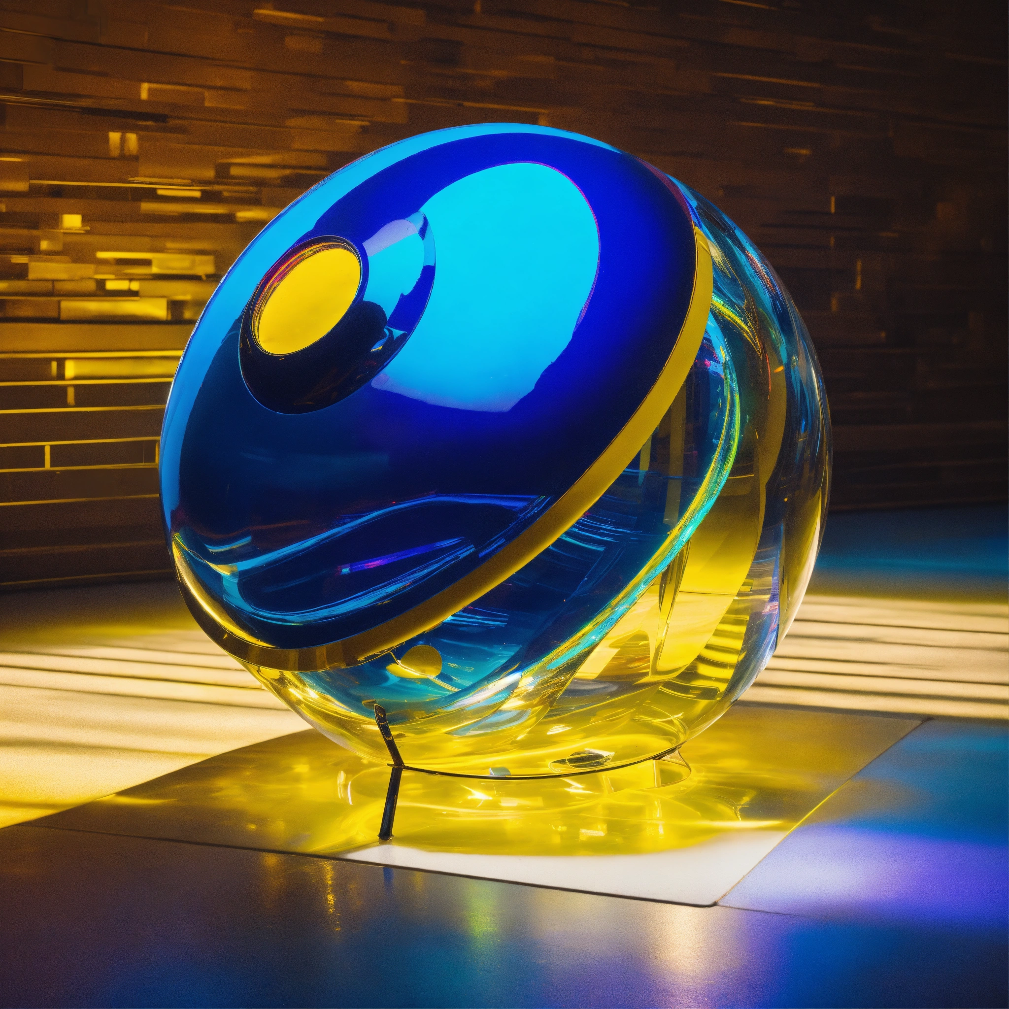 Metallic and glassy surface, vivid tones of blue and yellow, surreal futuristic neat object, heavenly light and intense neon lights, a medium-sized structure that towers above you. one abstract representative object floating --ar 169 --s 1000 --c 15