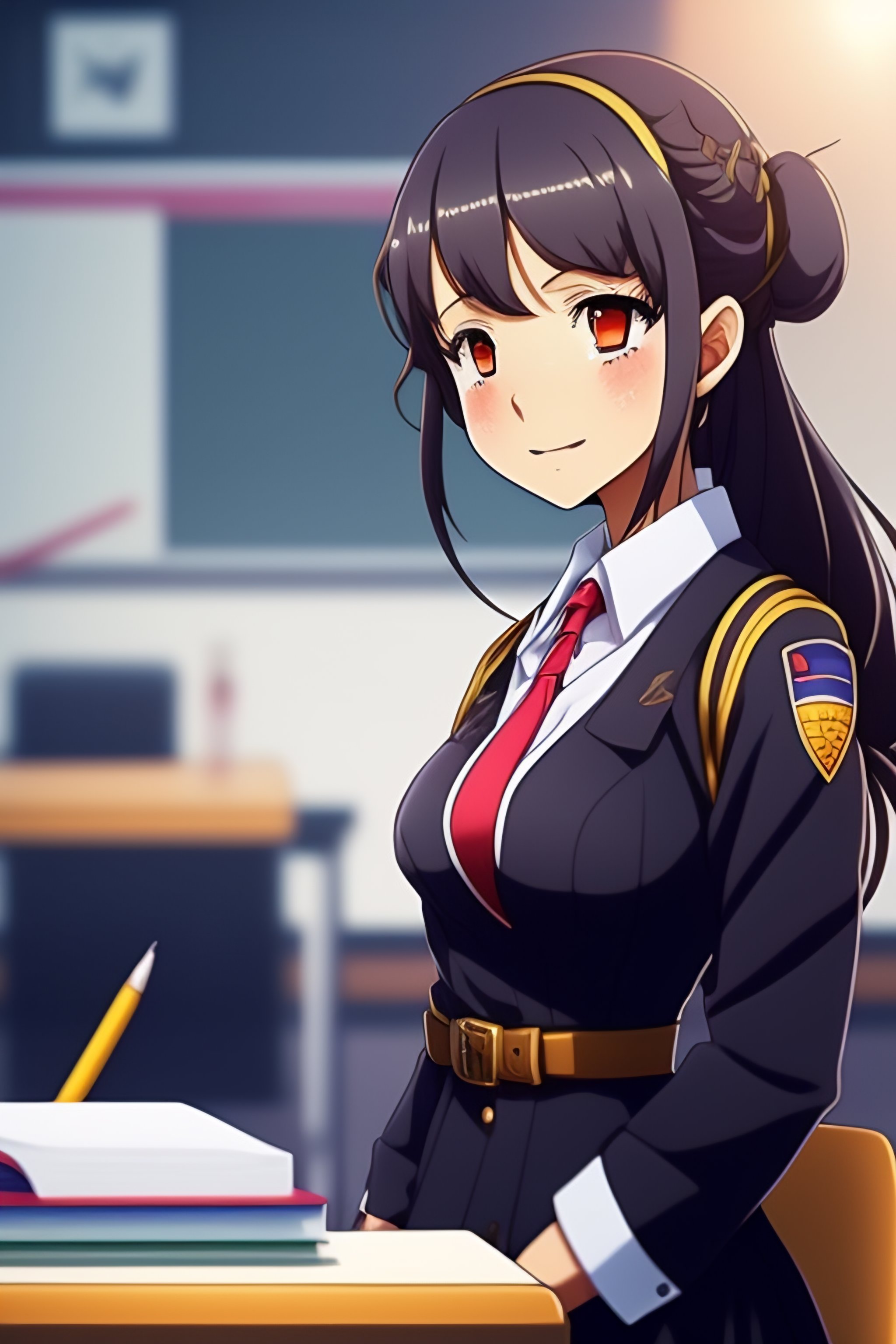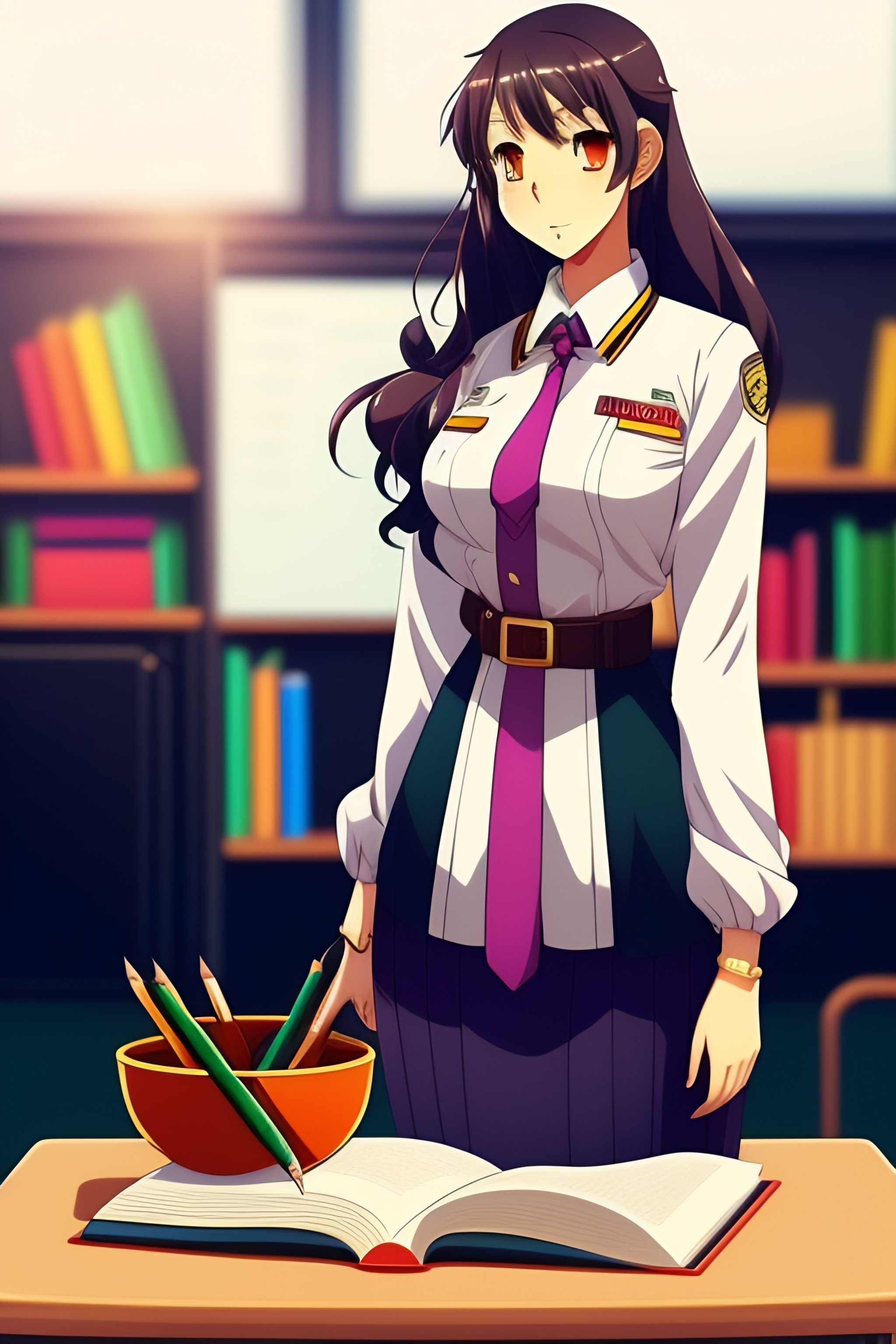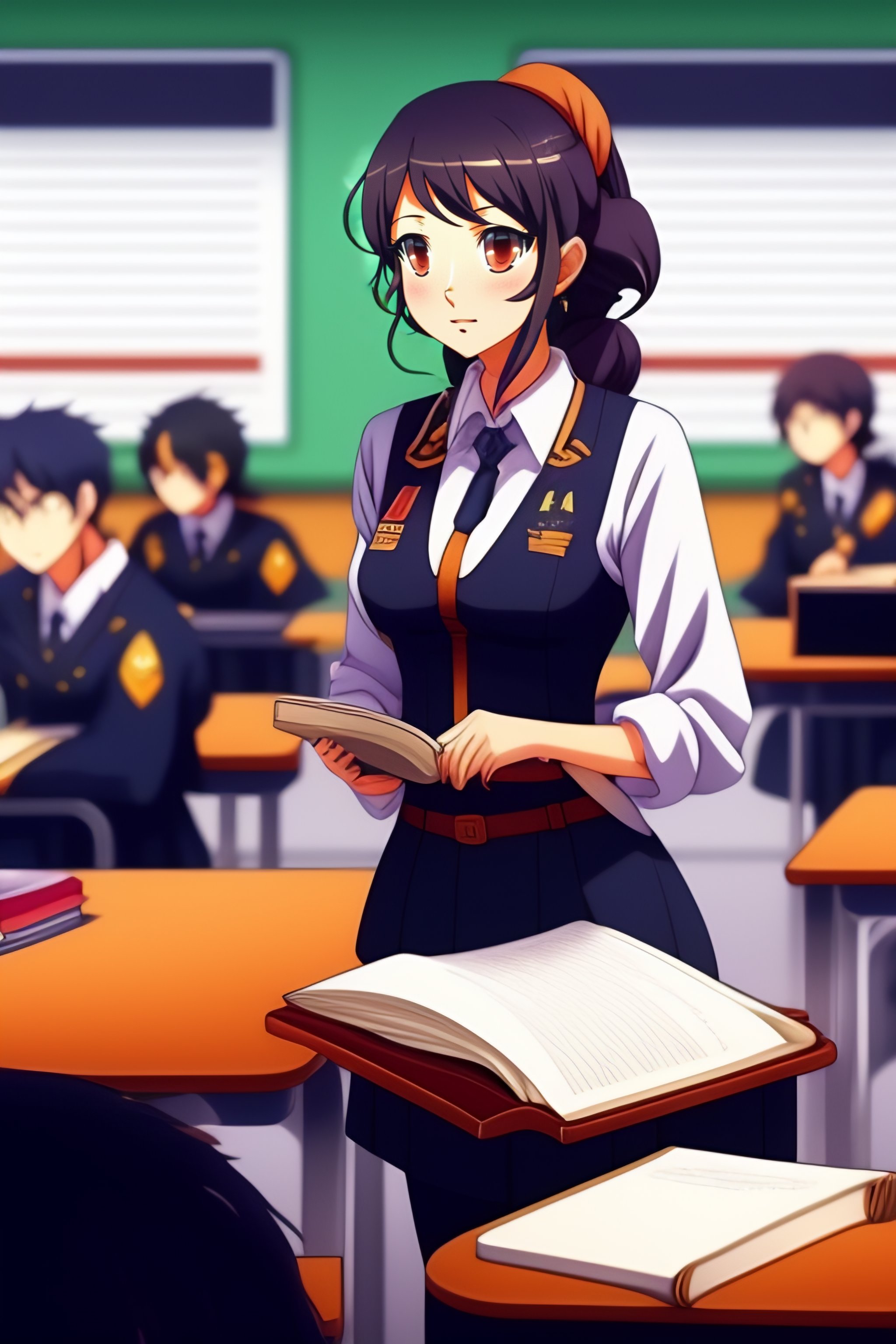 A beautiful female teacher, wearing a uniform, holding a textbook, is teaching in the classroom, anime style,anime line art