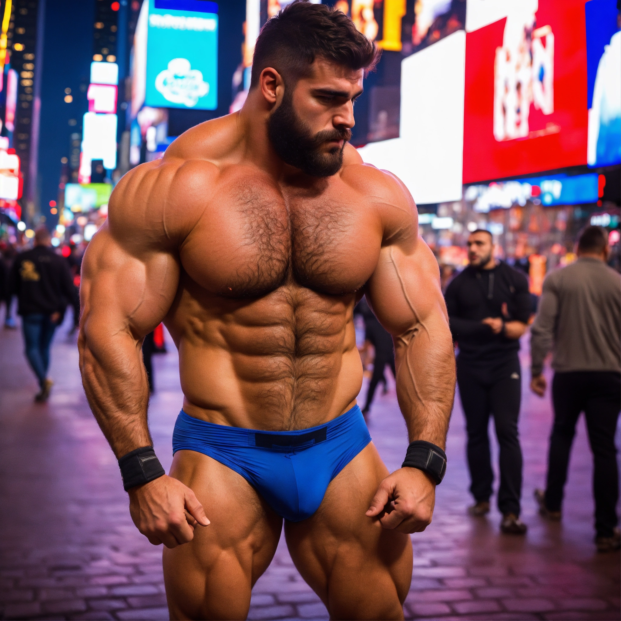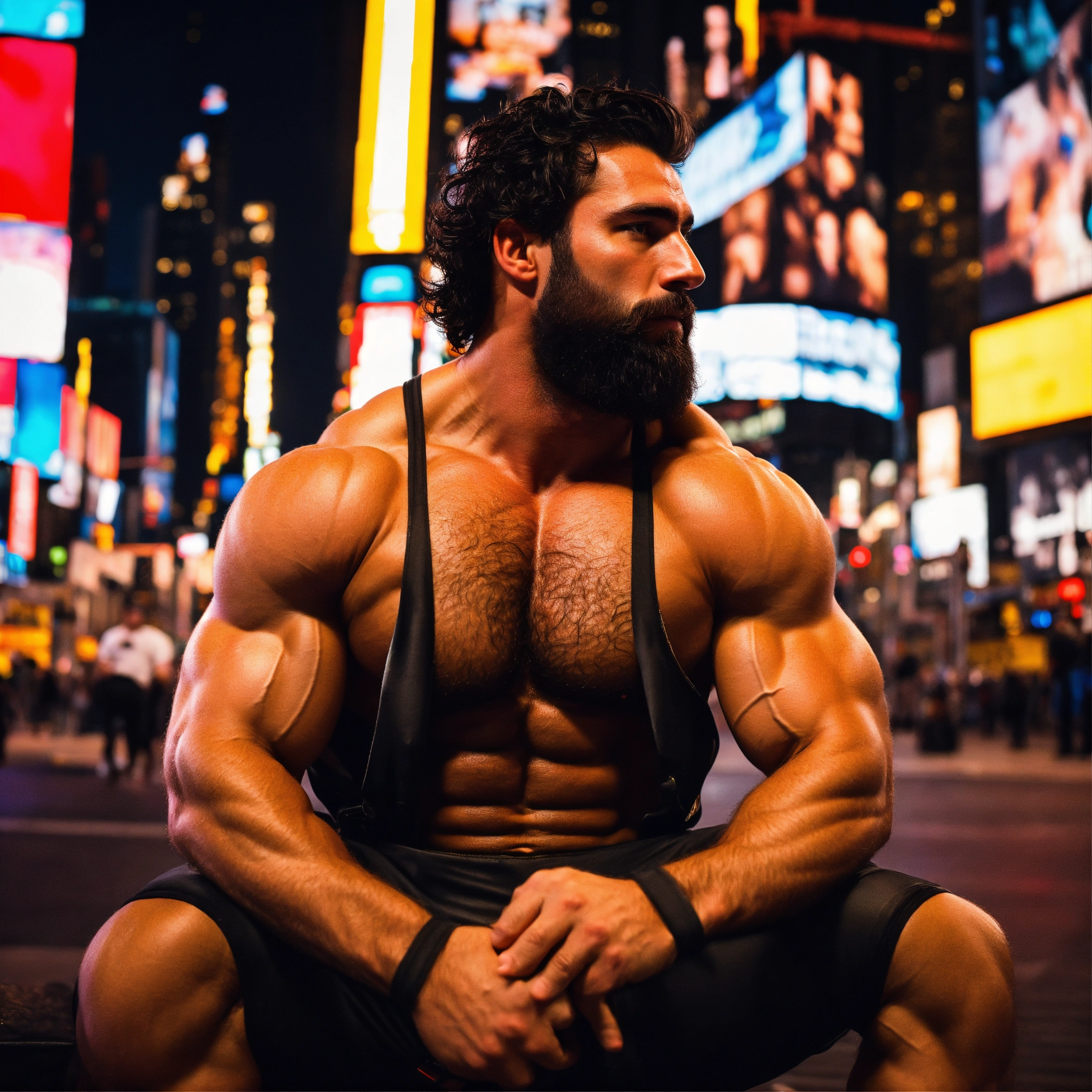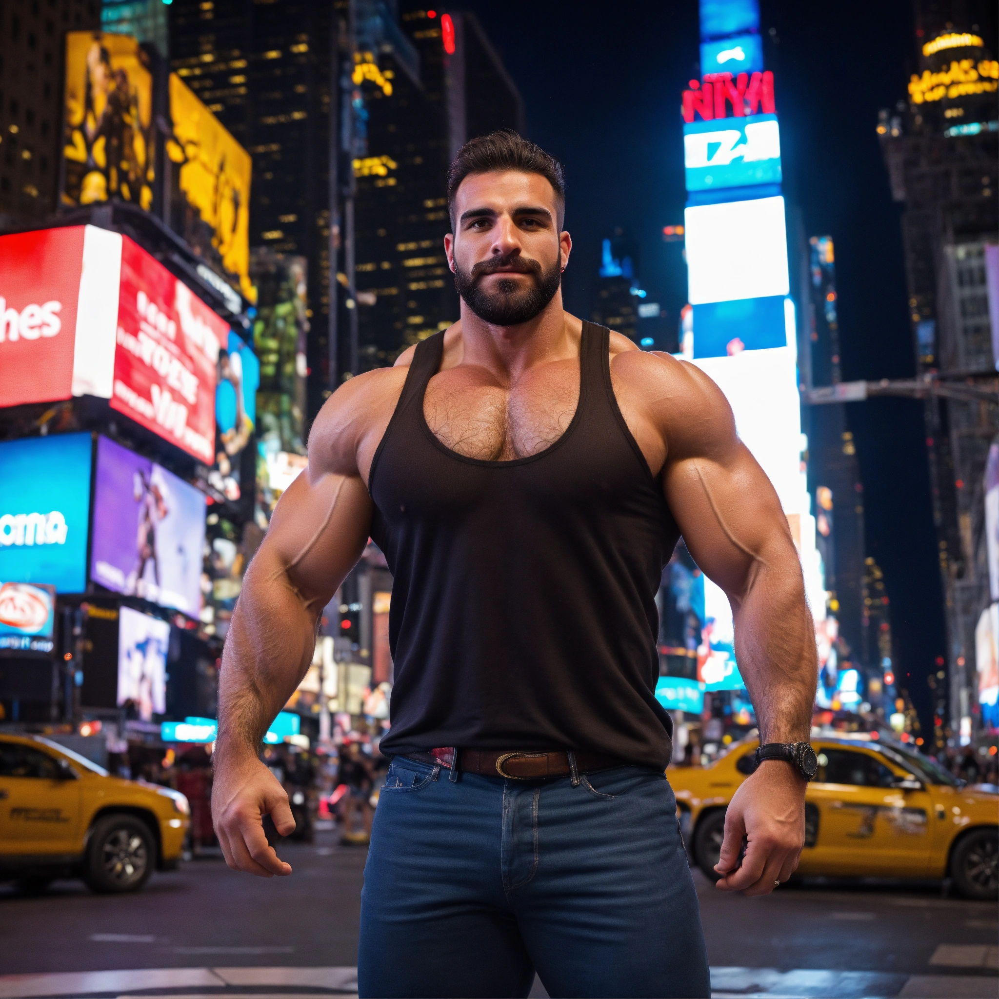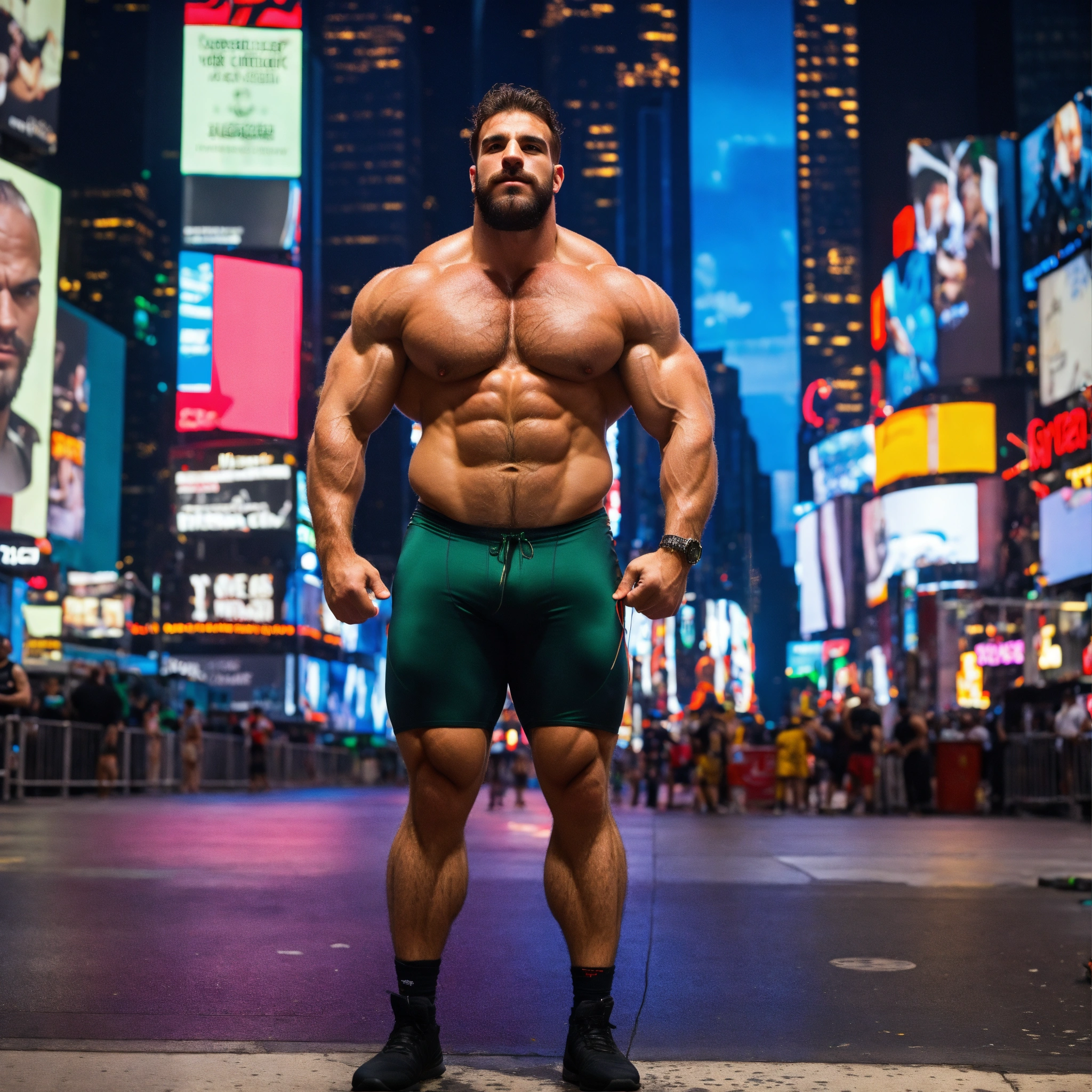30-year-old hairy italian man with big muscles, big bodybuilder, body like a wrestler, in times square at night
