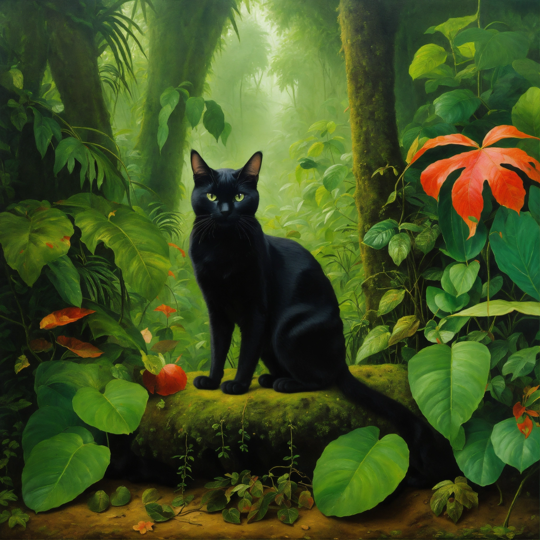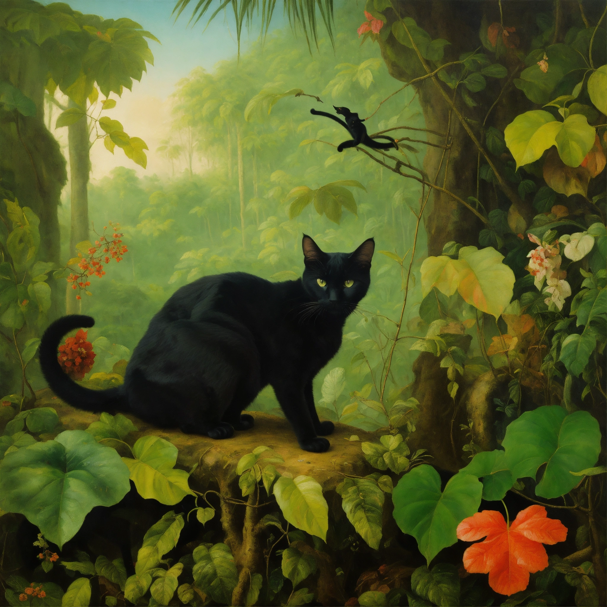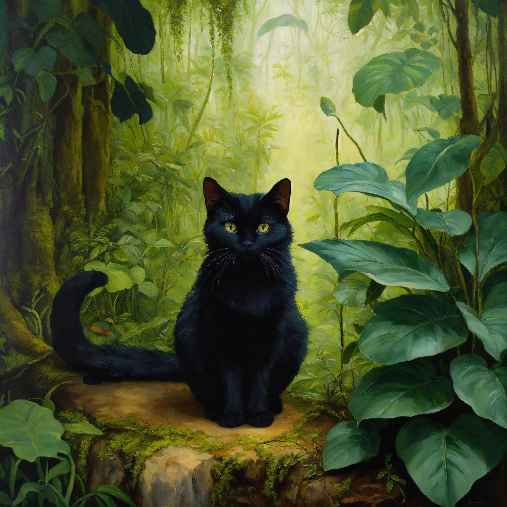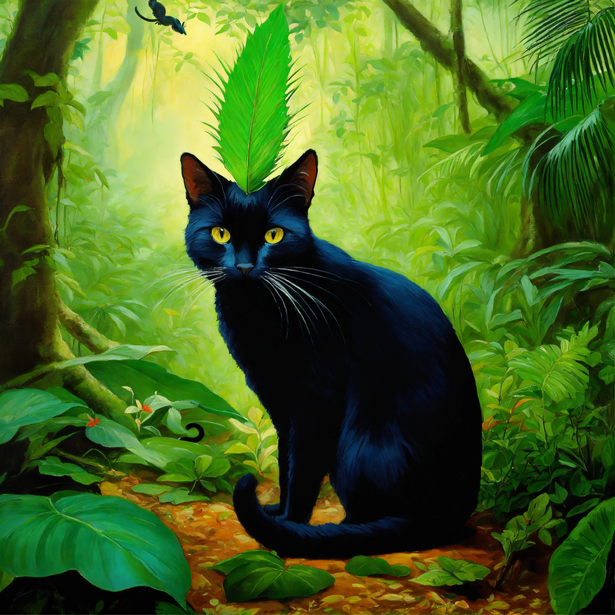 Hieronymus bosch the younger, oil painting, brushtrokes, oil on canvas, realistic, highly detailed painting, soft glow, vivid colors, highly detailed rainforest landscape, dense landscape painting of a rainforest, mist, soft glow, highly detailed, complex, vivid green, vines, lush, tropical, hidden black cat with a leaf on its head, cute black cat in a jungle hiding with a big leaf on his head, distant dumbfounded black cat hiding in the rainforest with a leaf hat, far away confused black cat with a leaf on his head, hiding black cat standing in the jungle with a big lead hat, intense green, bright green, lush, dense rainforest, streams.
