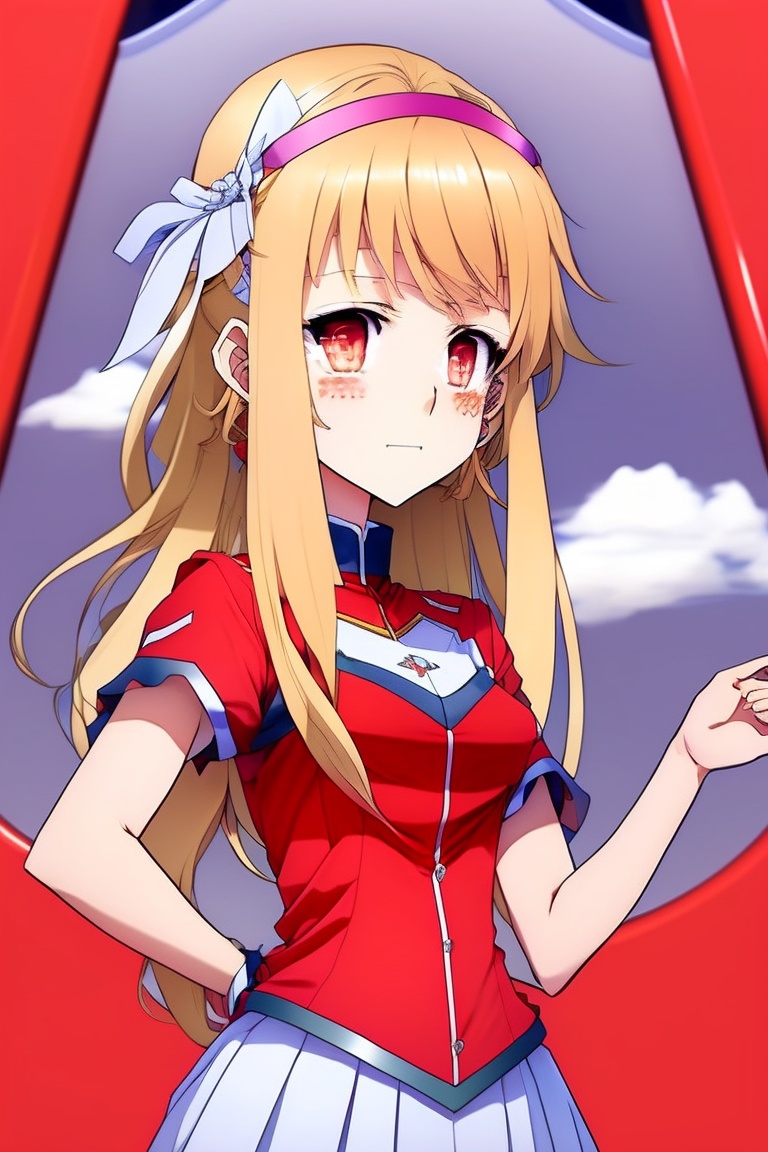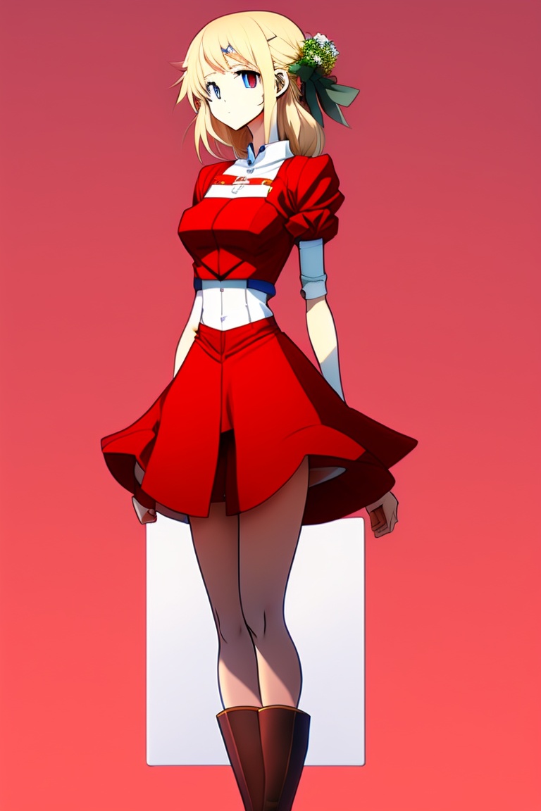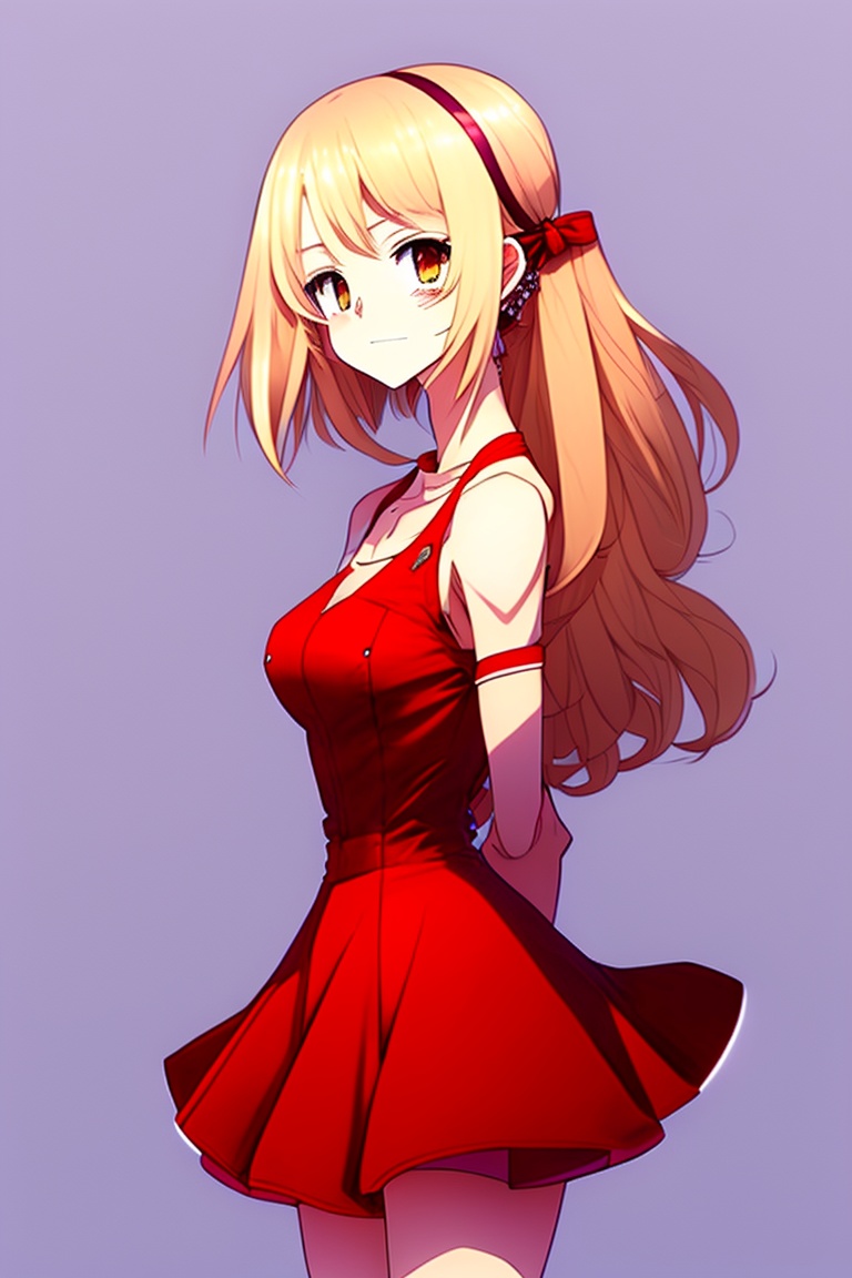 Aquilia preparing for dance: aquilia is a tall, skinny anime girl with blonde hair wearing a red dress. make her full body in anime style, ready for the great manga concert.
