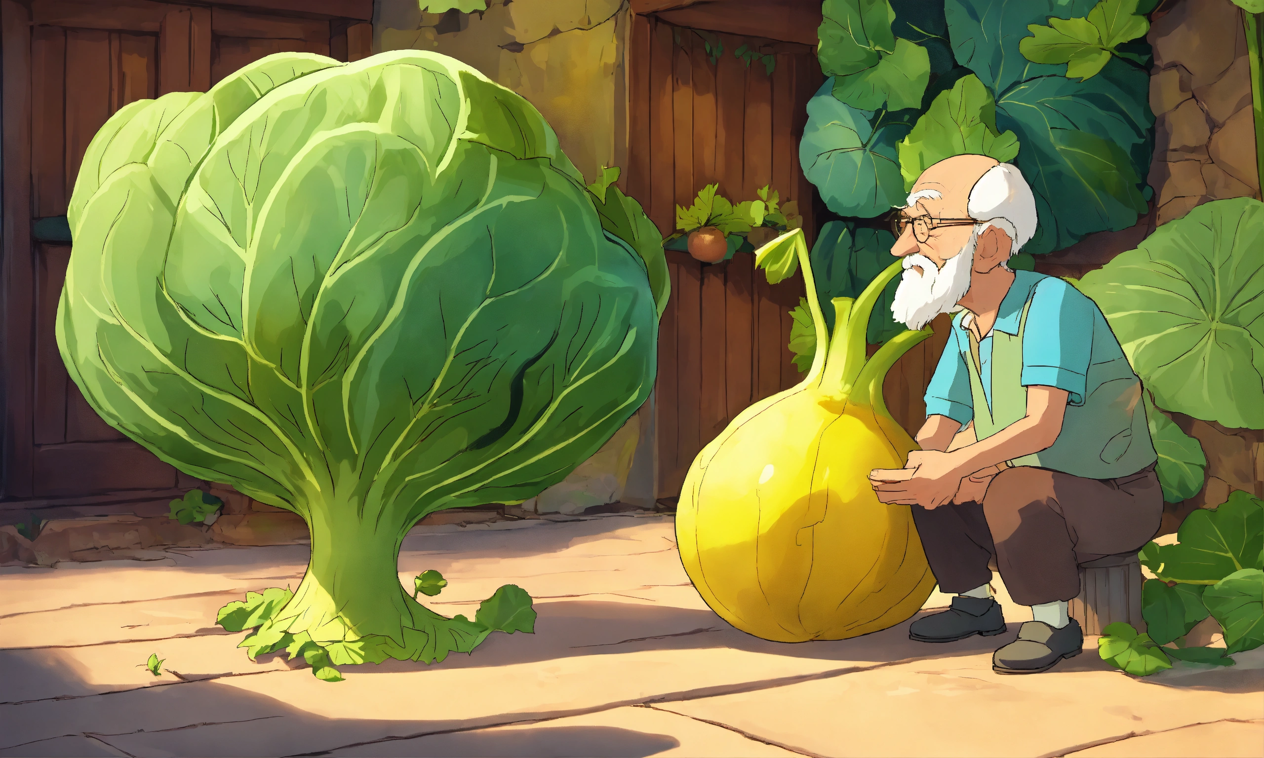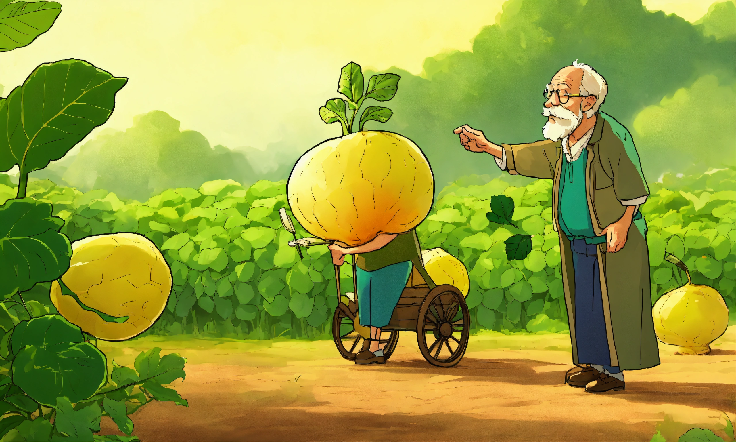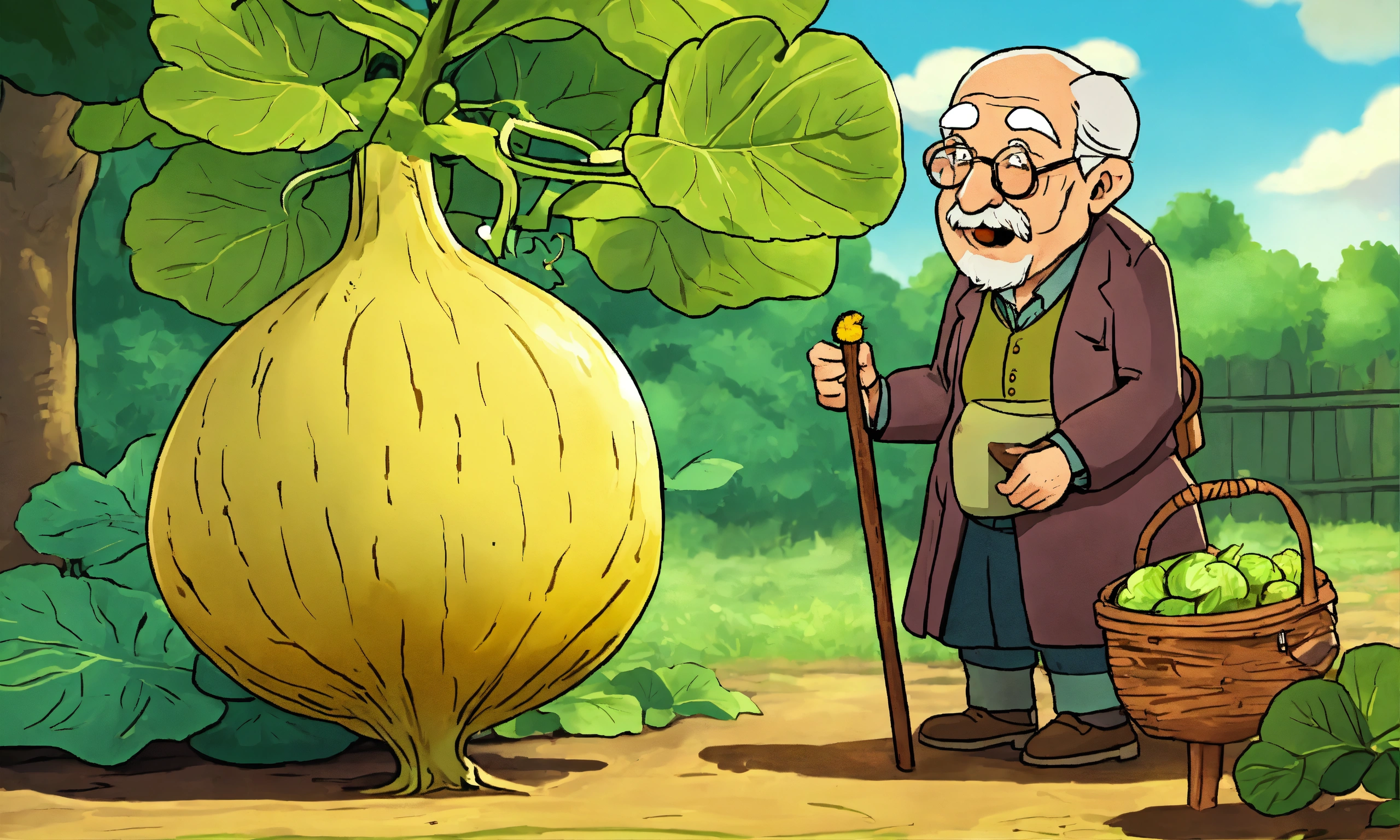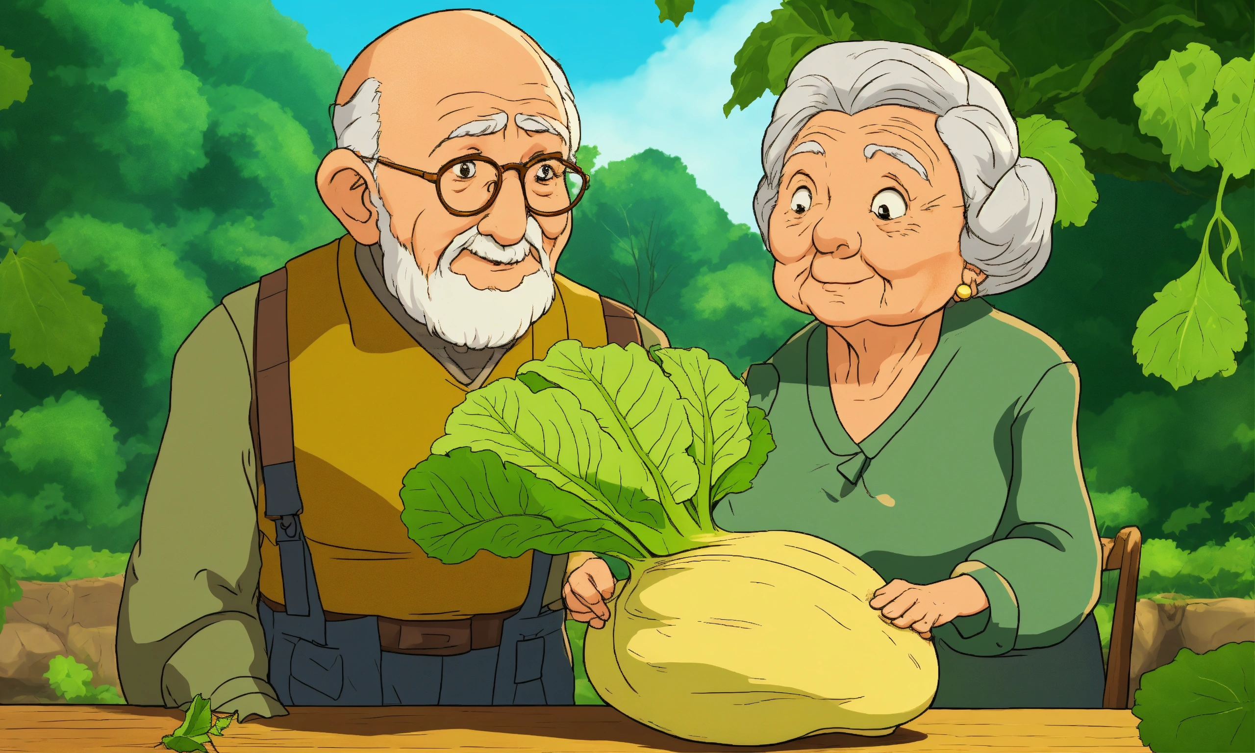 Cartoon style old man and old woman are talking and a giant yellow turnip with huge green leaves is on the background