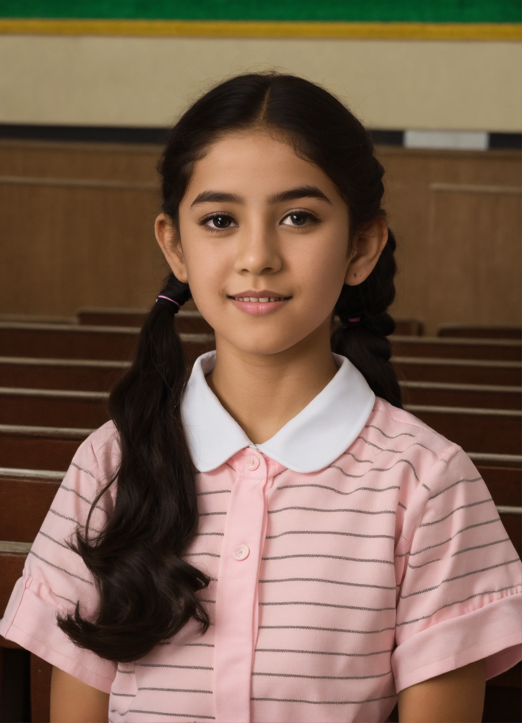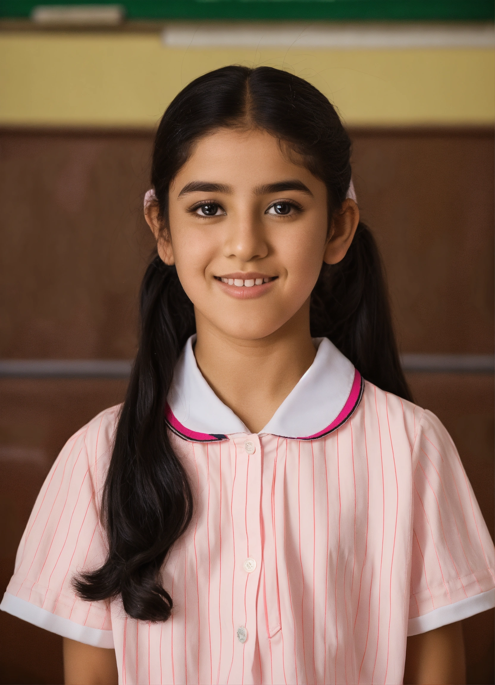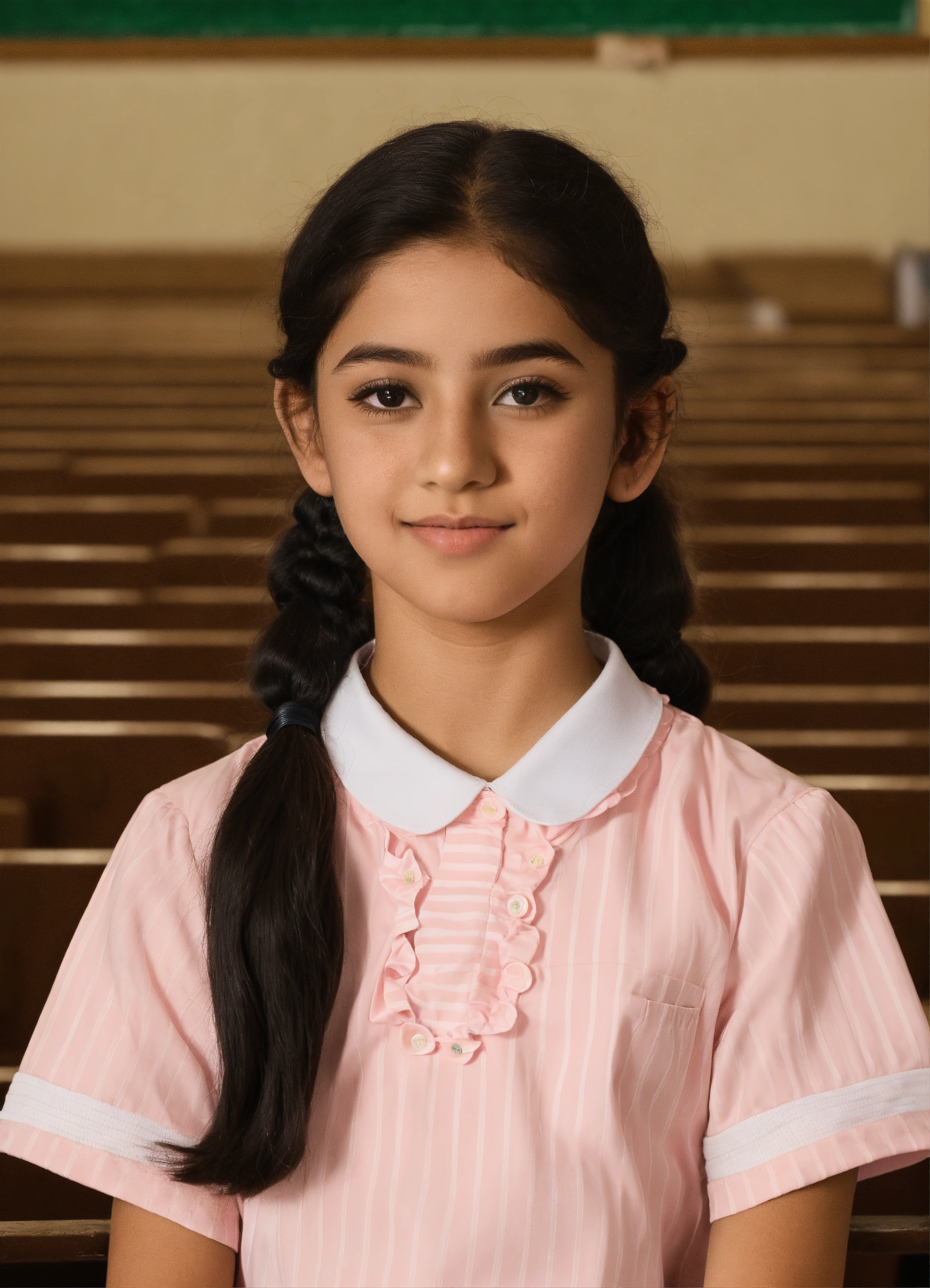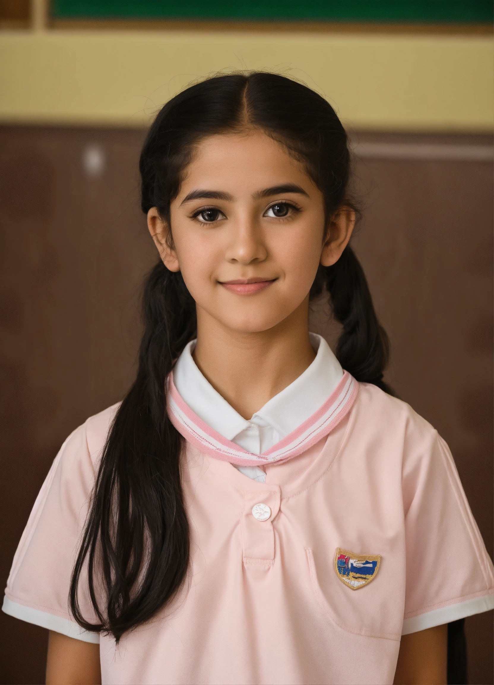 A student from the state of kuwait in the primary stage appears in a school photo in which she wears a school uniform consisting of a long-sleeved, light pink shirt with white stripes and a light pink dress. she has beautiful features, light skin, black eyes, and black hair with a ponytail. she wears black school shoes and white socks.