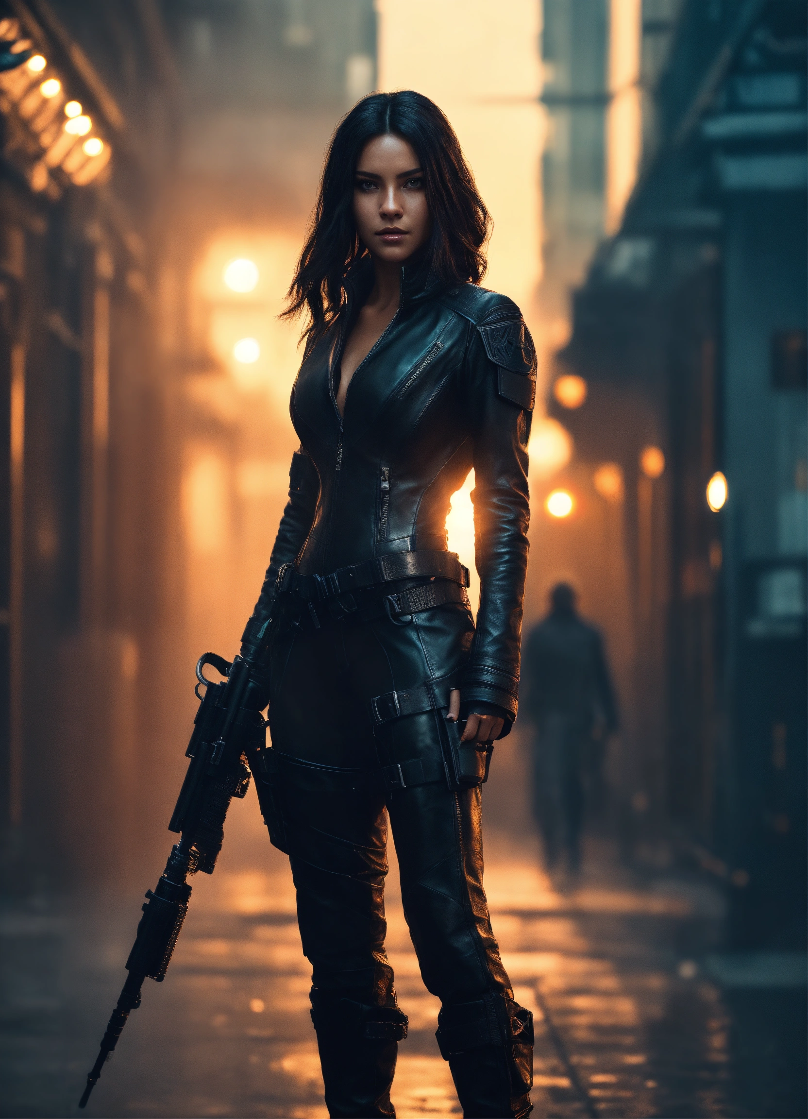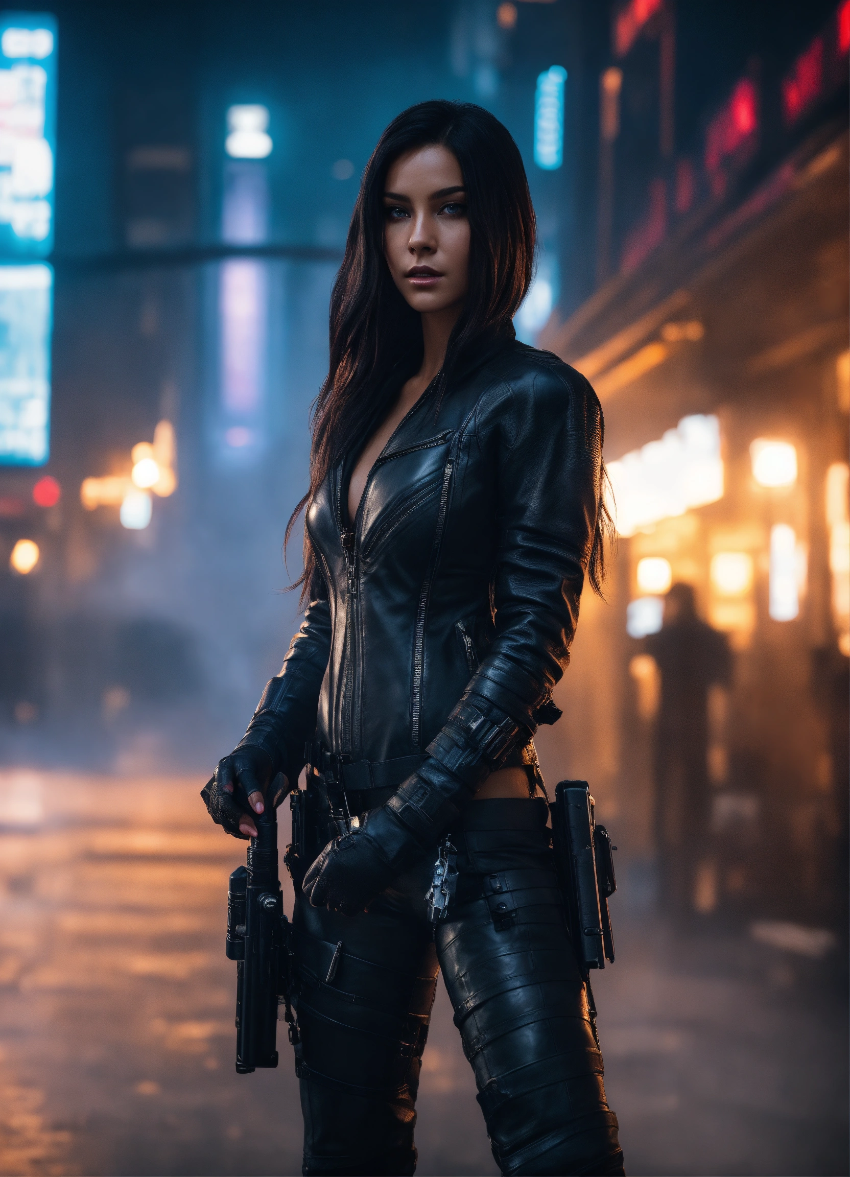 Beautiful young female assassin waiting. full body dangerous stunning body, beautiful fave, tanned skin, long dark hair, glowing eyes, leather stealth suit, cyberpunk city setting. foggy. she is wearing a black leather stealth suit. full body. beautiful but deadly. 8k, hyperrealistic