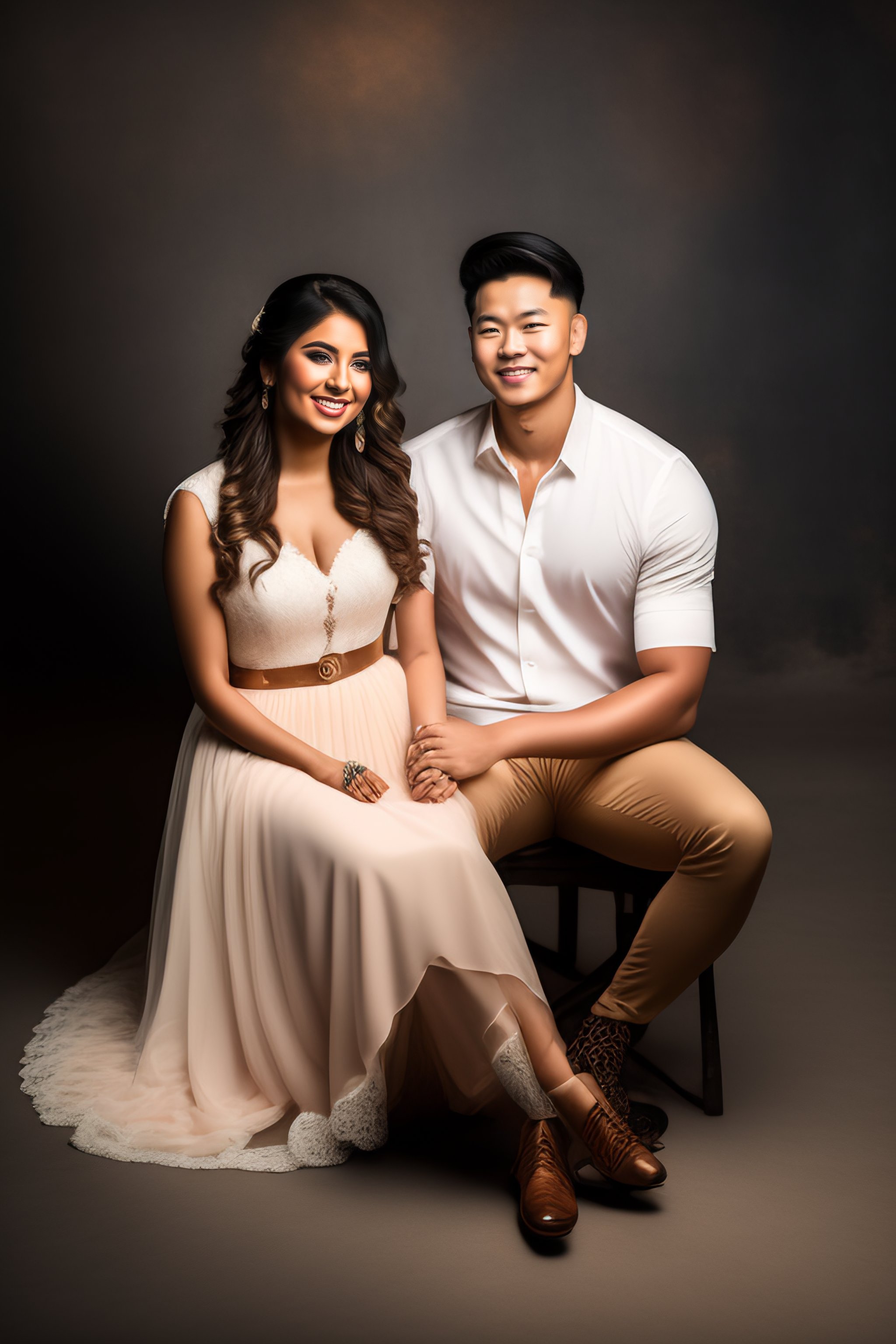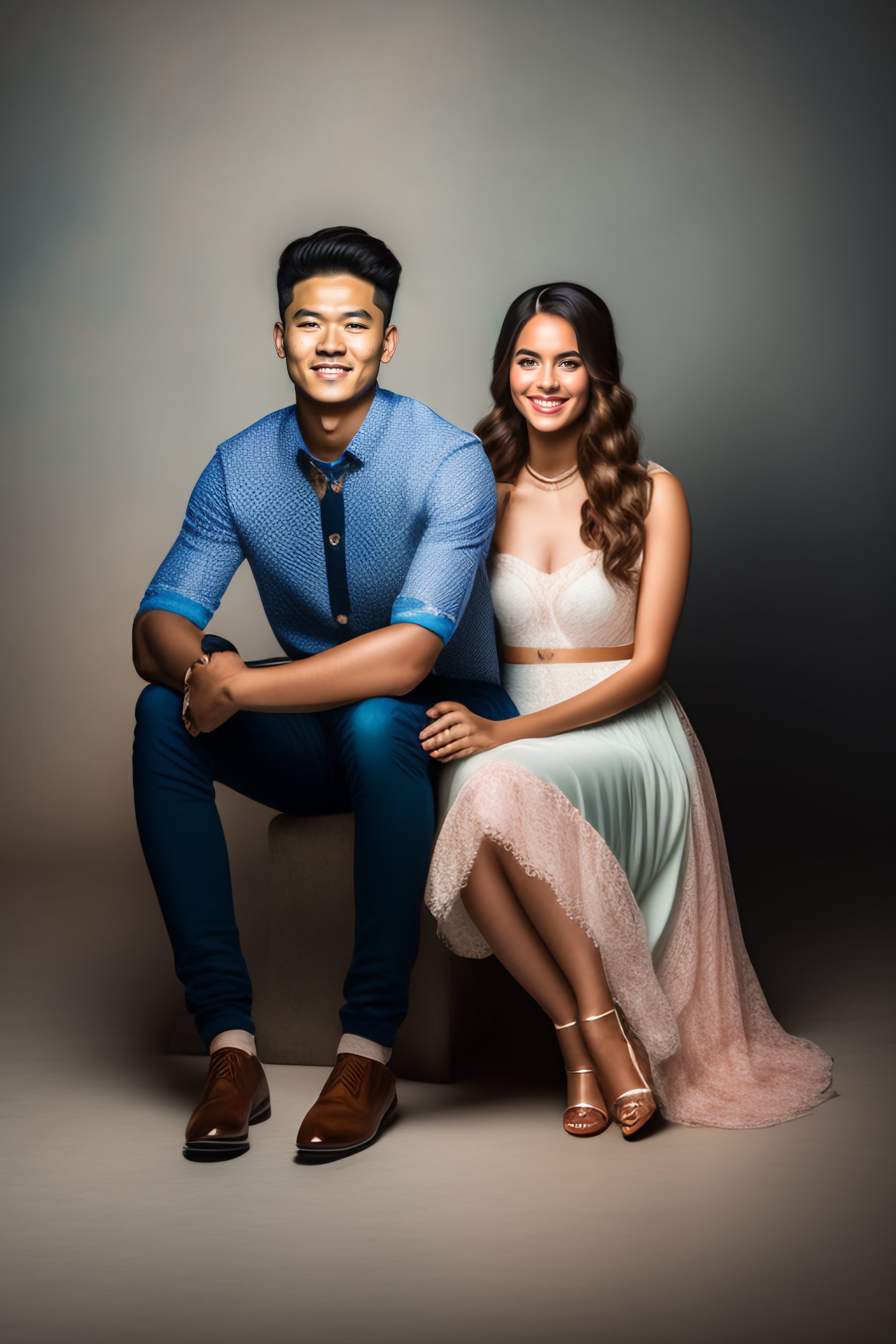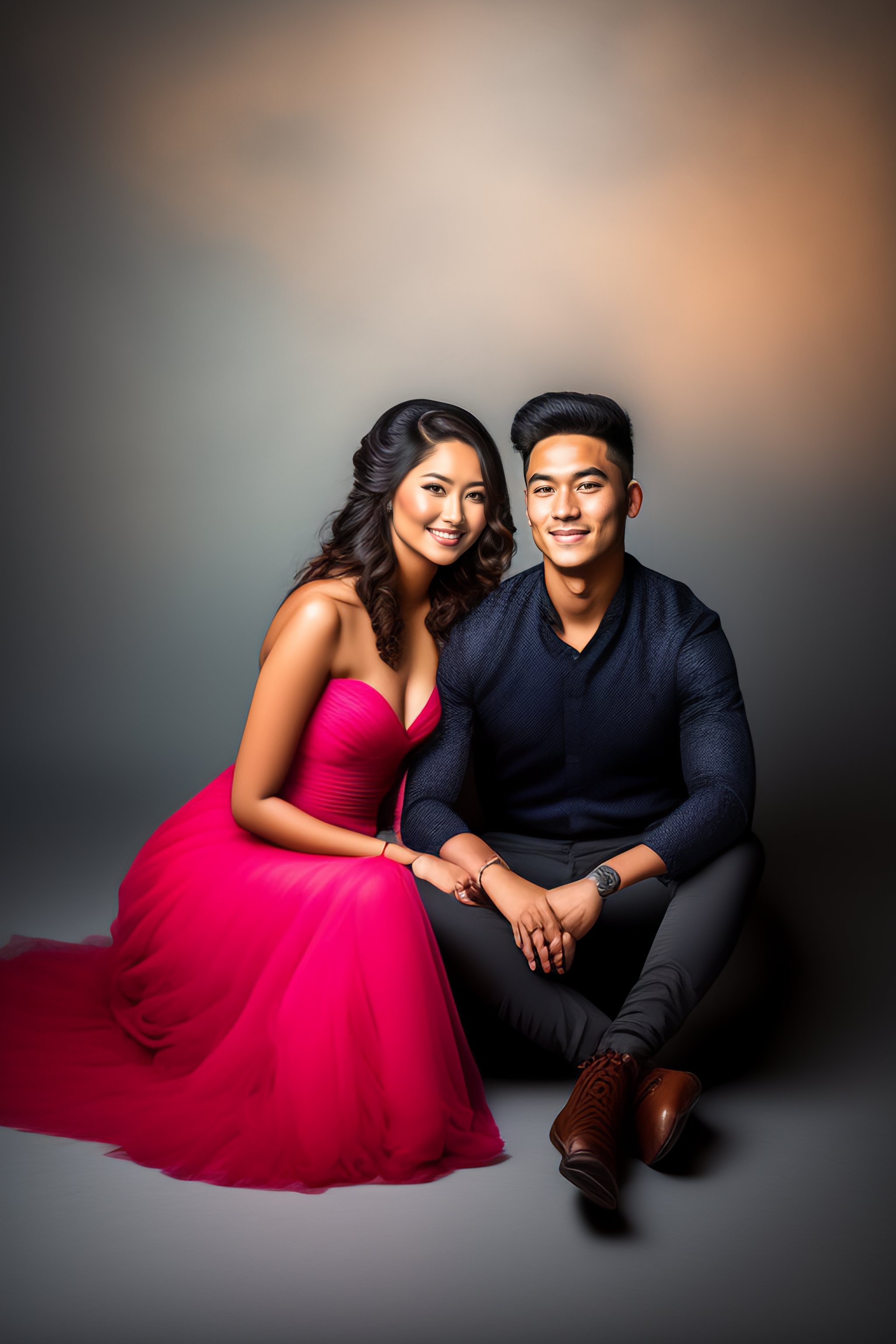 A beautiful young age couple in the photography studio posing to the photographer, sitting on the ground