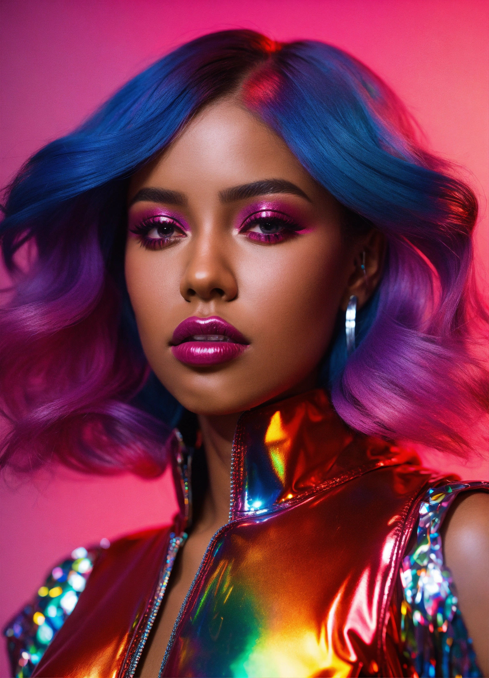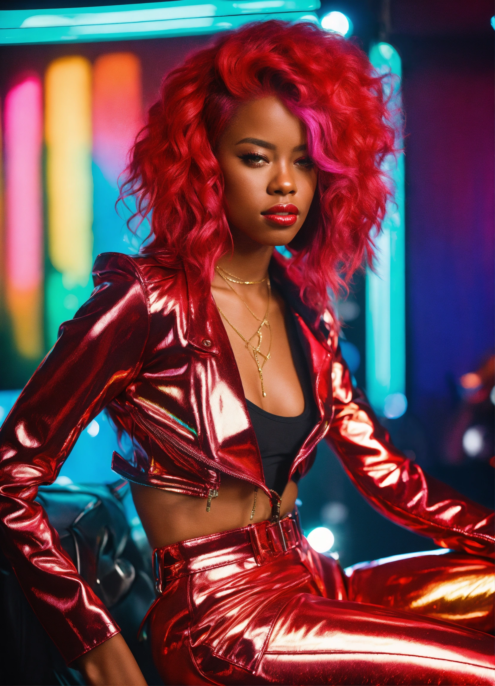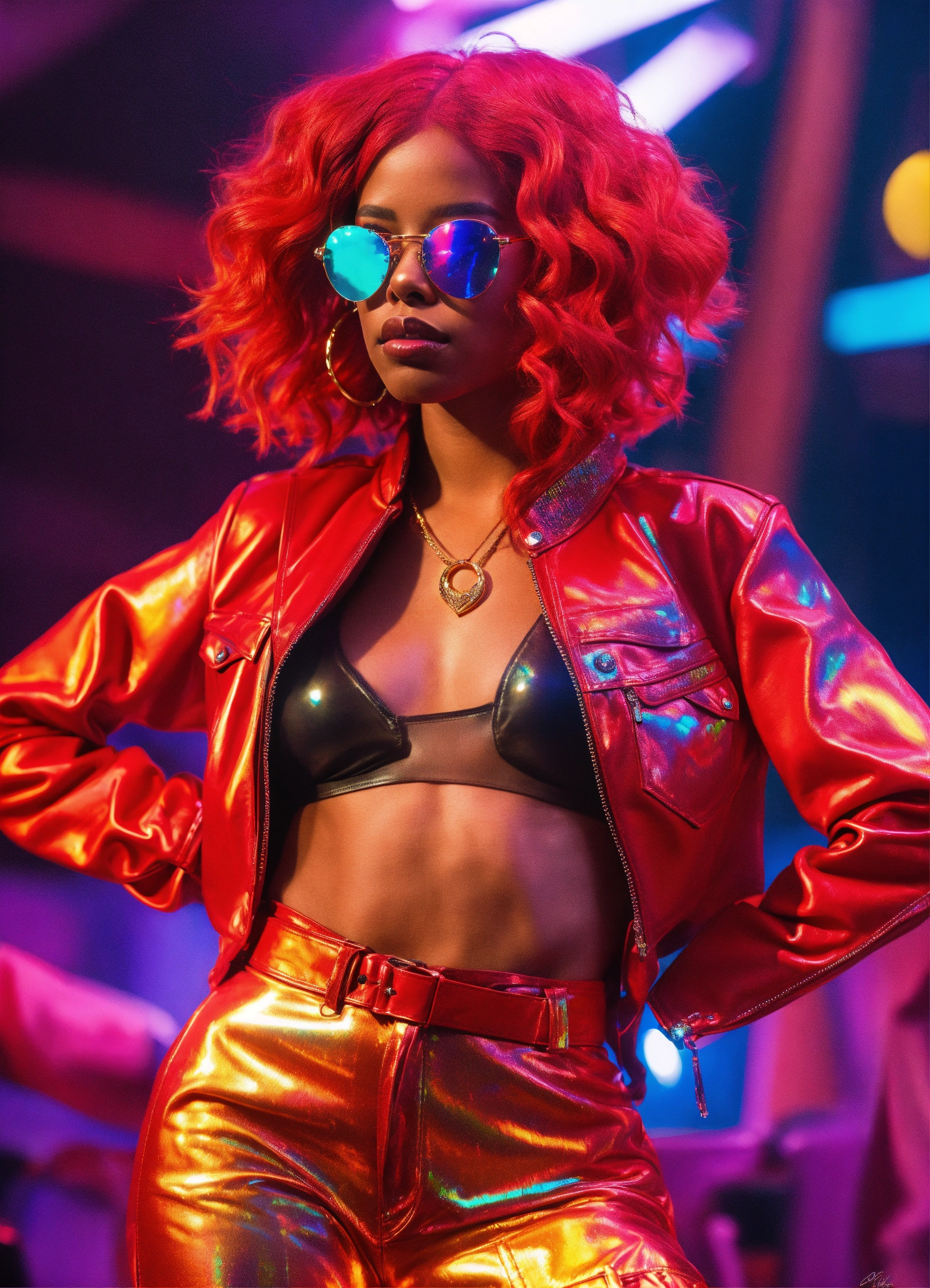 Aaliyah glamorous holographic style red leather full outfit with colorful hair