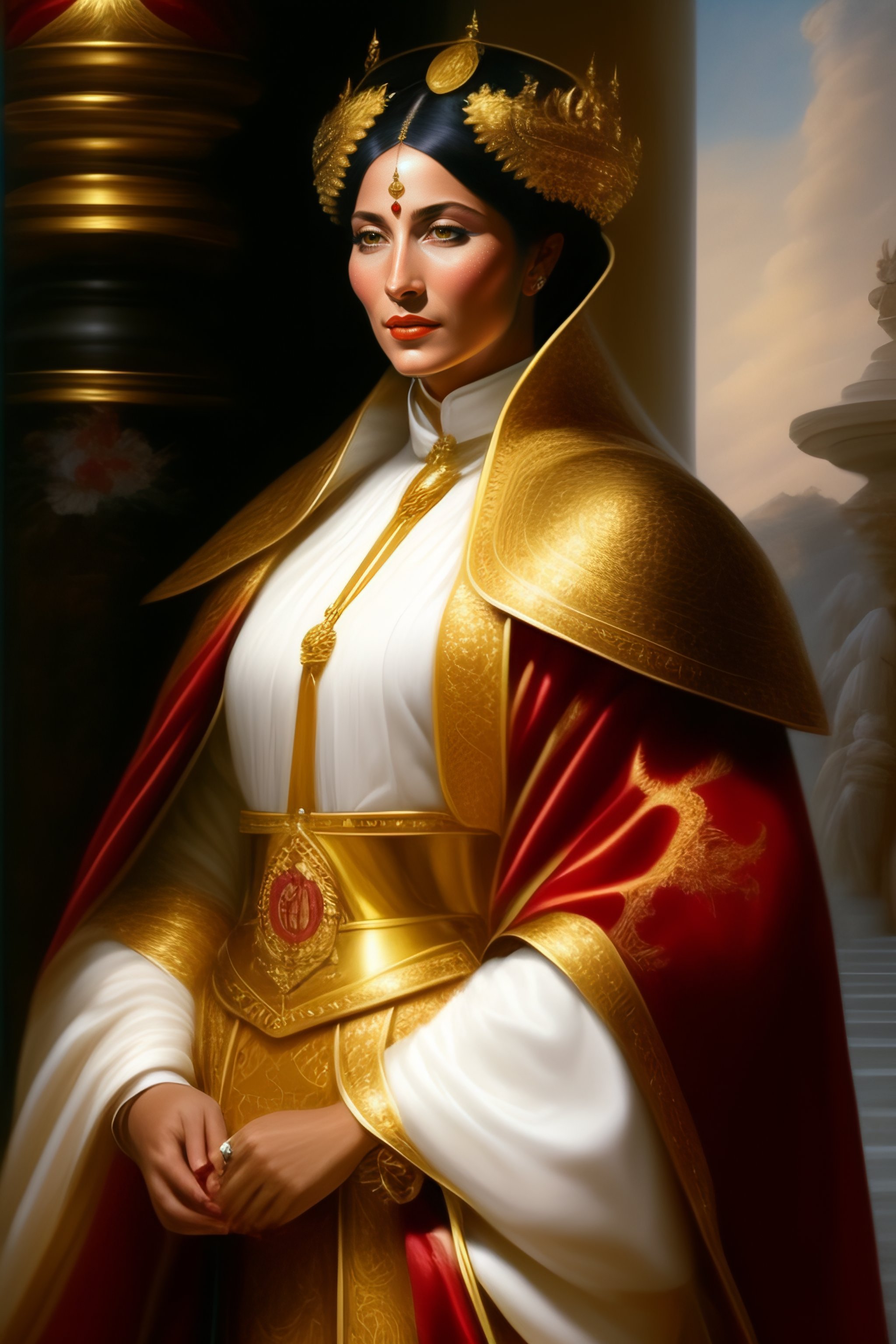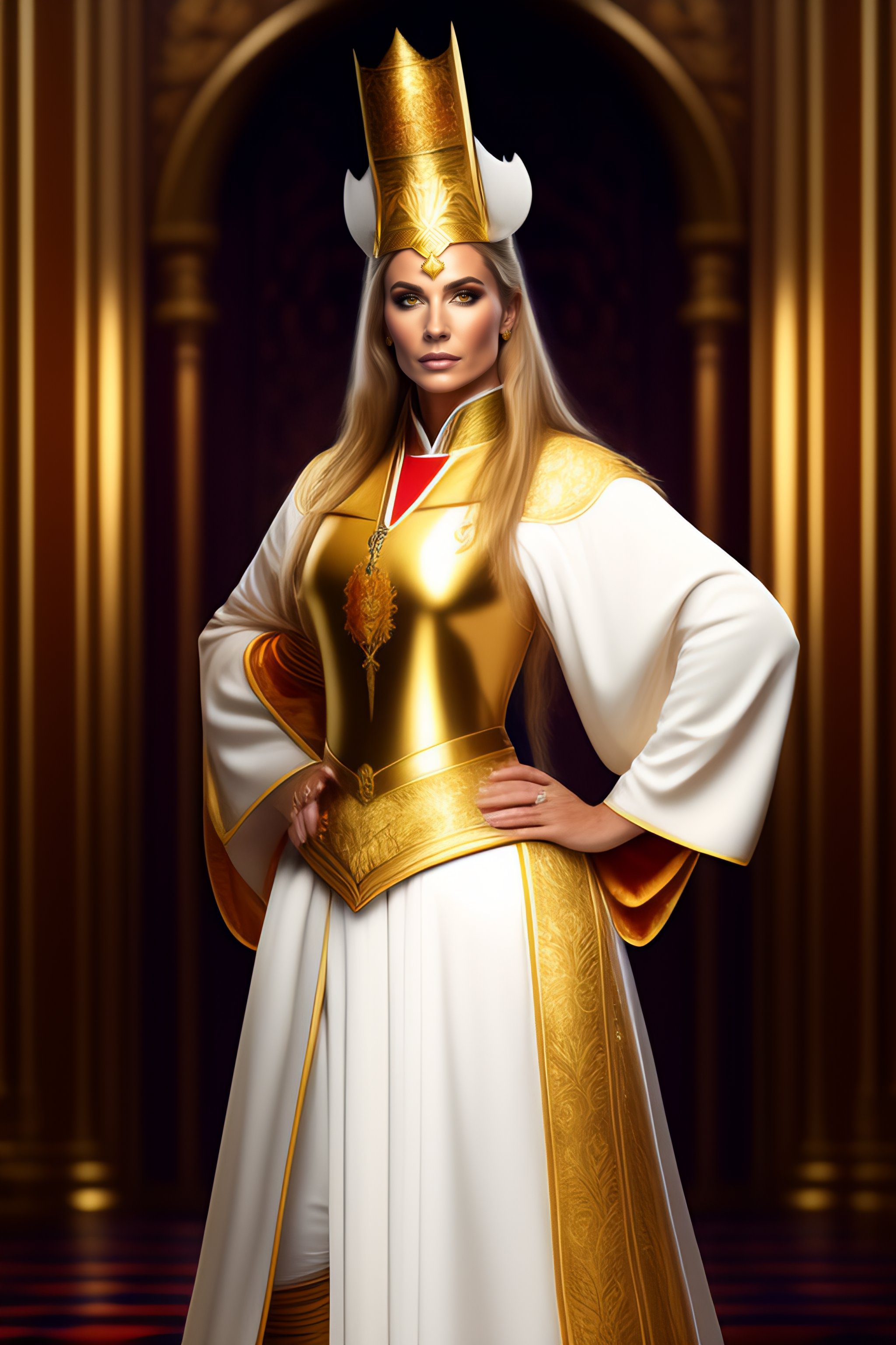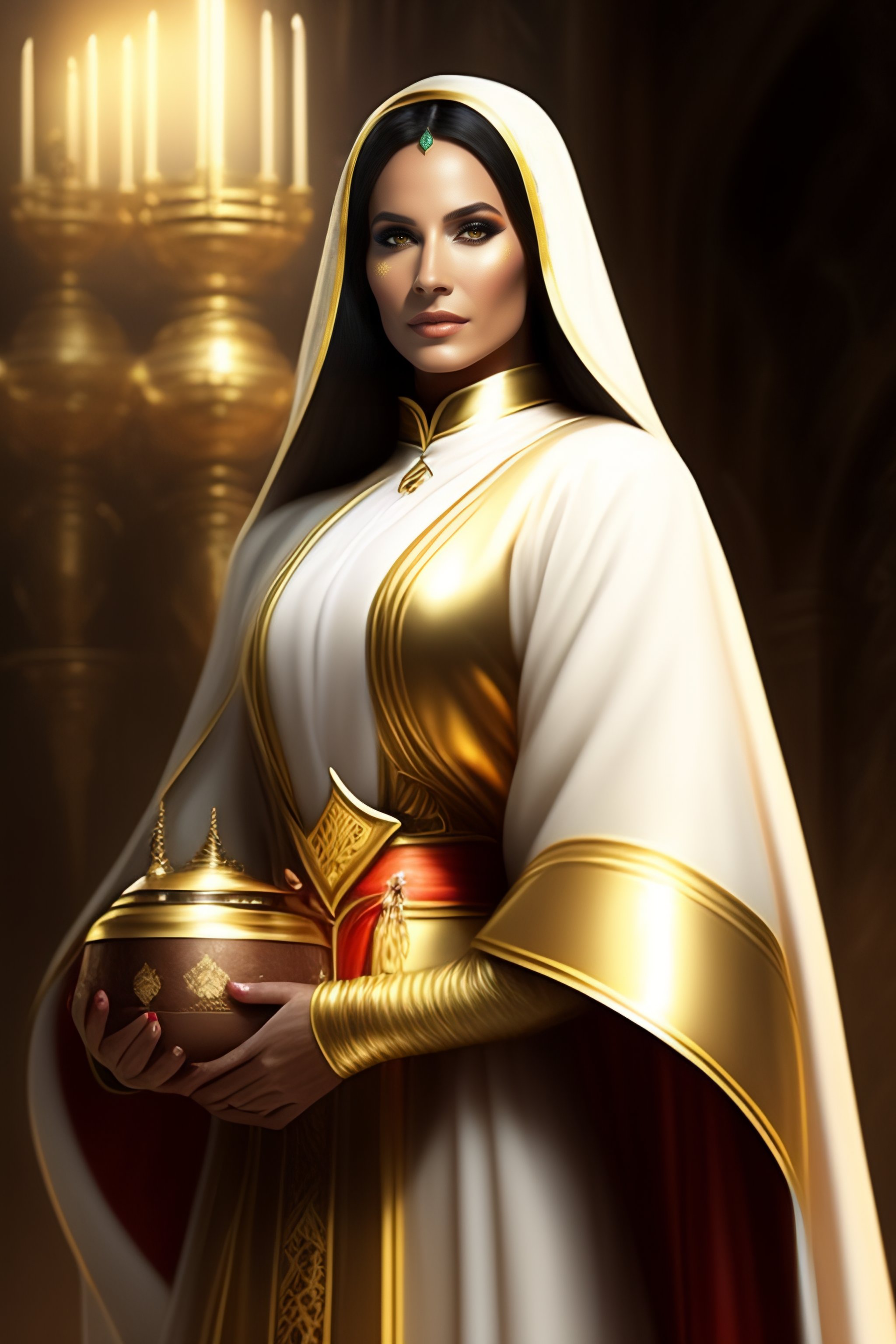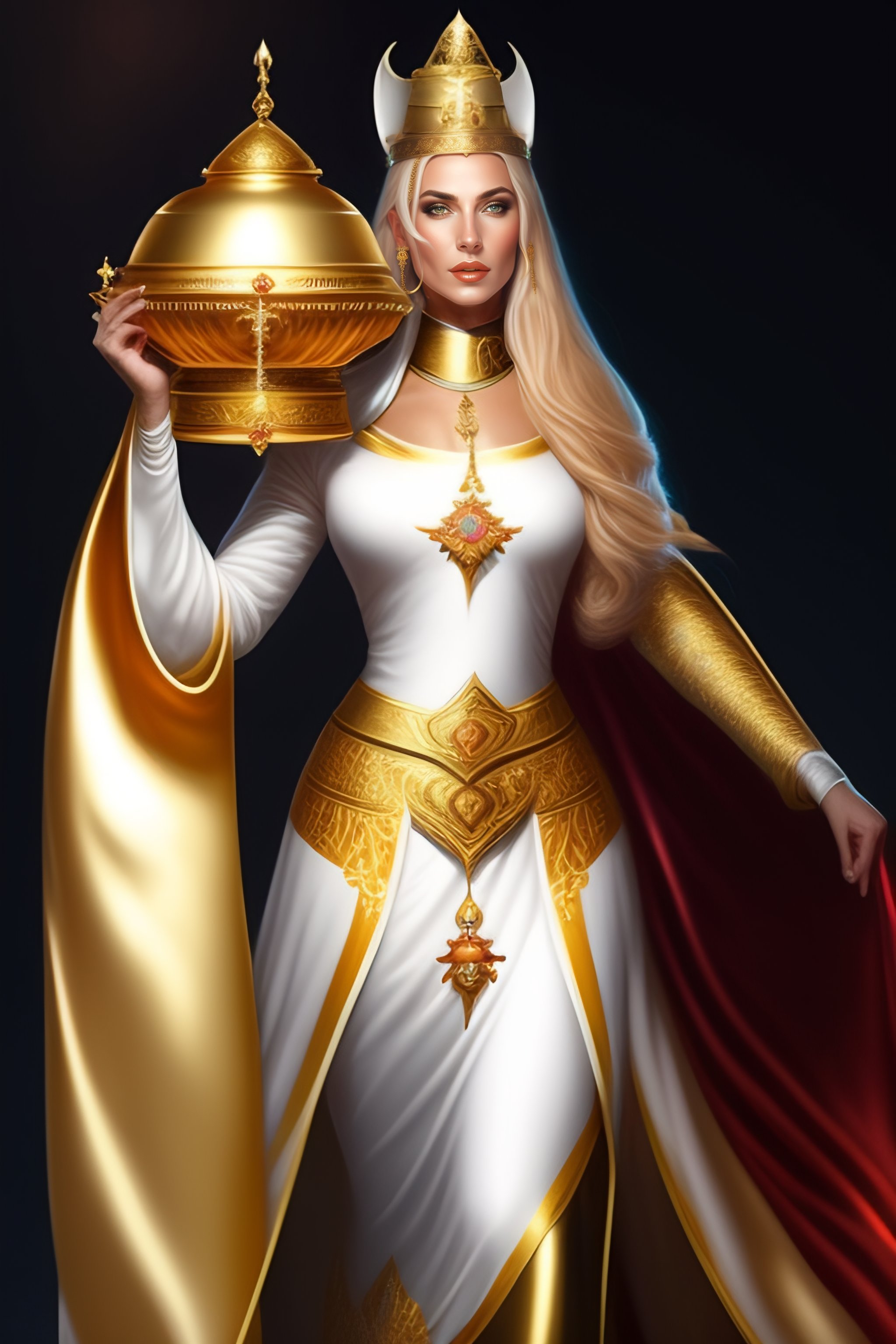 Female magician, wearing a white priest's robe with golden stripes, carrying a chest on her back, fantasy style