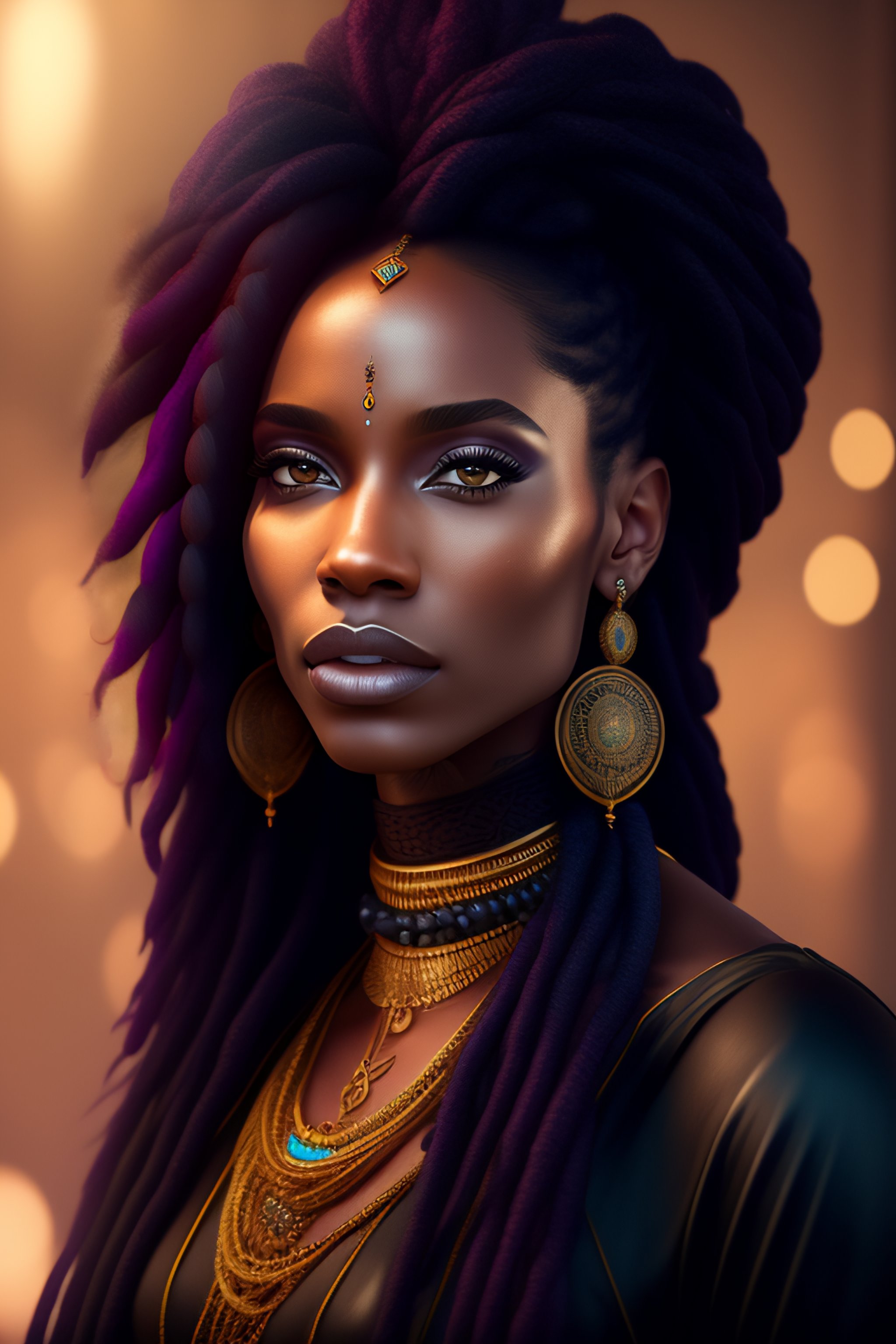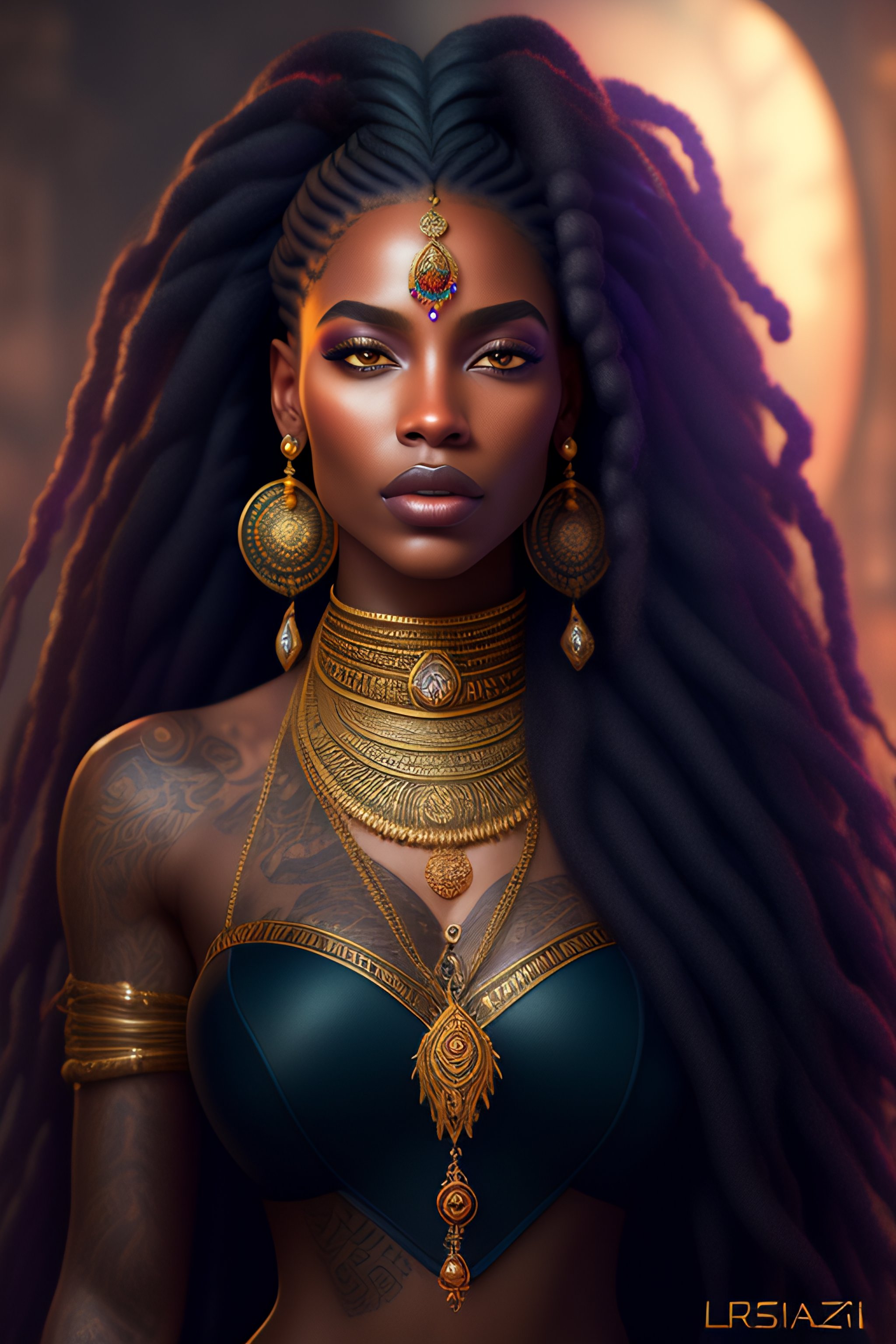 Stunningly beautiful black woman, dreadlocks, rapunzel long hair, tattoos, african bangles, earrings, medusa, full portrait detailed digital concept art, deep color, serious, intricate detail, art by deviant art, splash screen, complementary selective colors, 16k resolution unreal engine 5