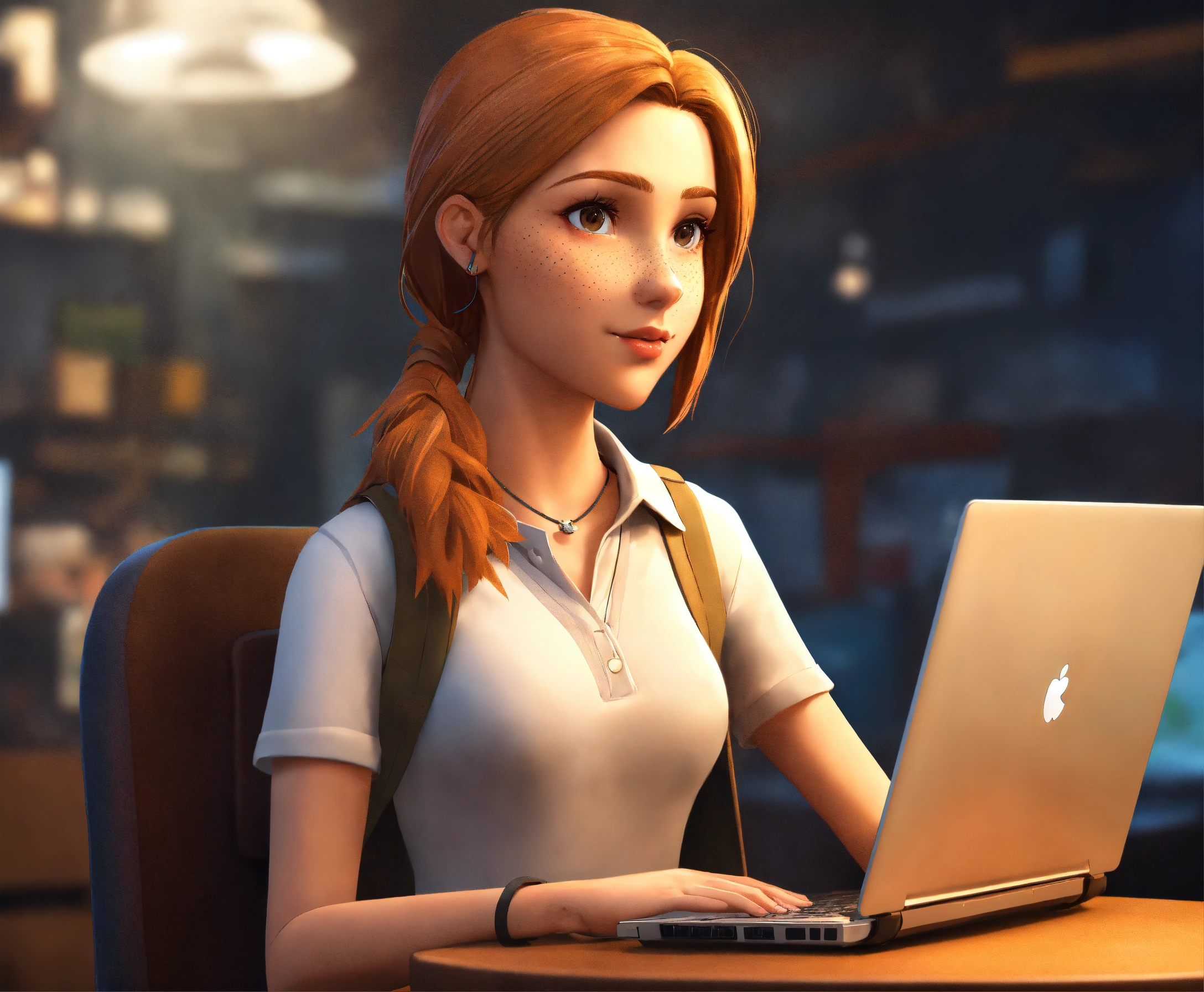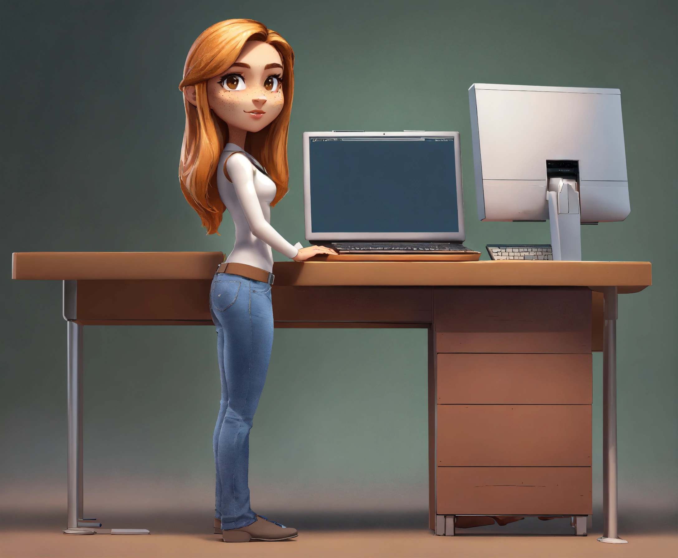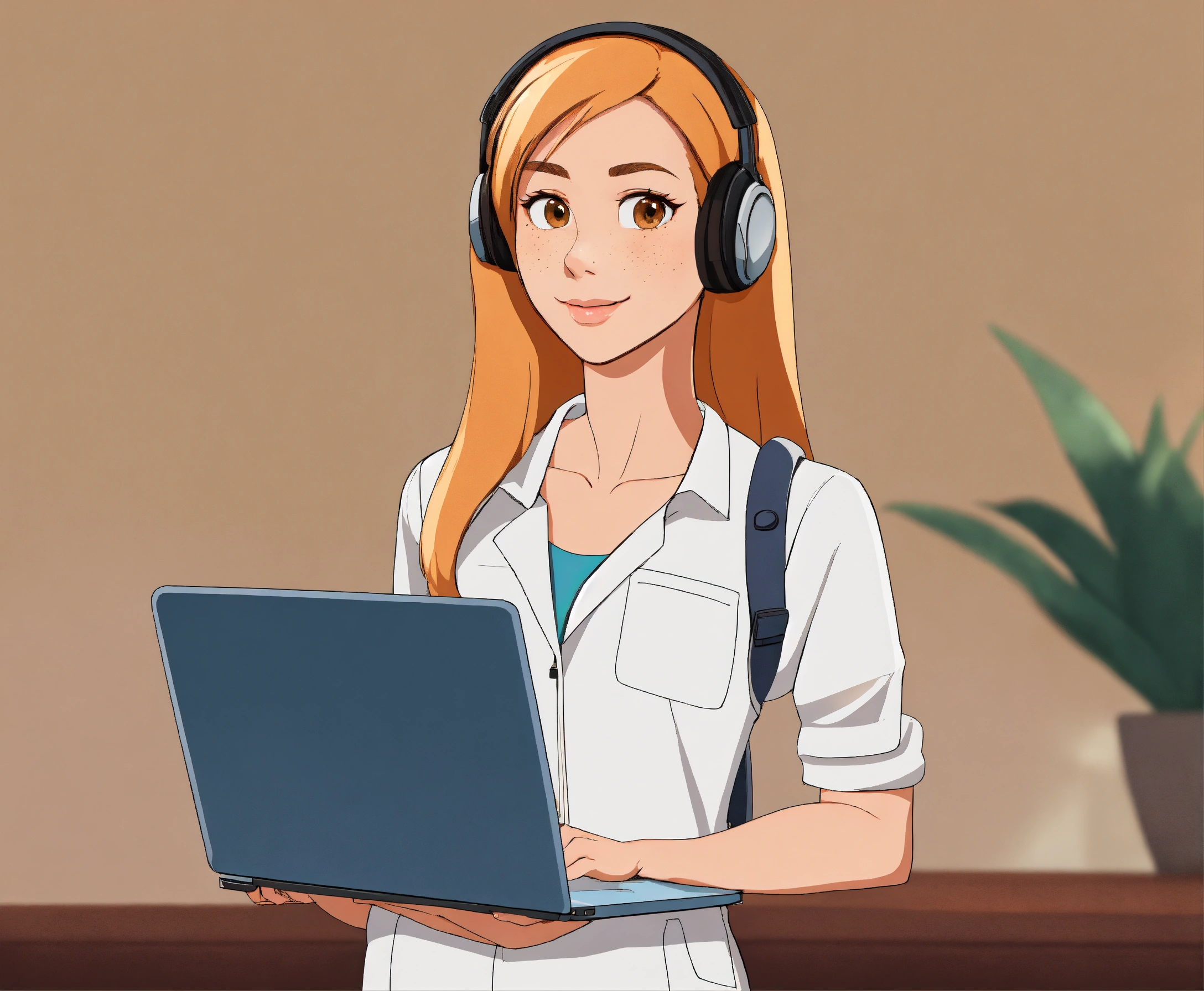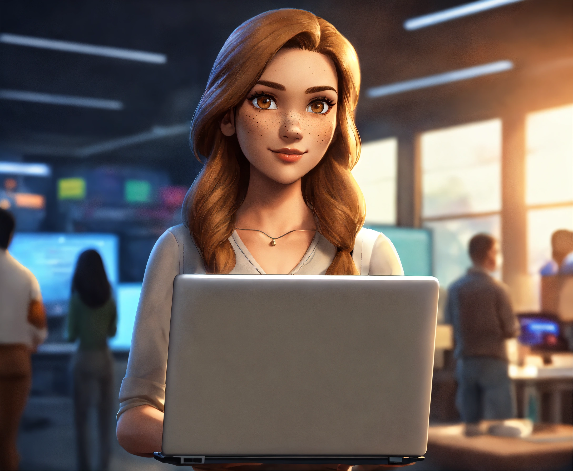 A white intelligent, attractive female cartoon character avatar. you can see her whole body as she is standing upright with nothing in front of her. she is standing while holding a laptop in her hand. she has light brown straight hair, brown eyes, and freckles. she is a computer programmer and her features are exaggerated. she is standing on both feet.