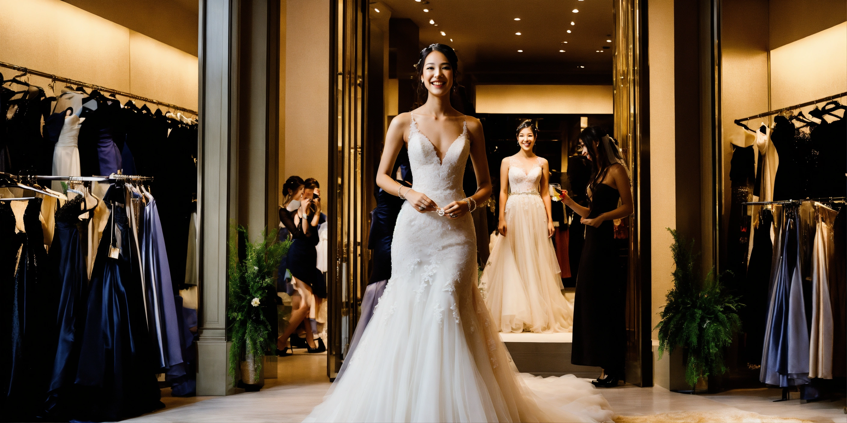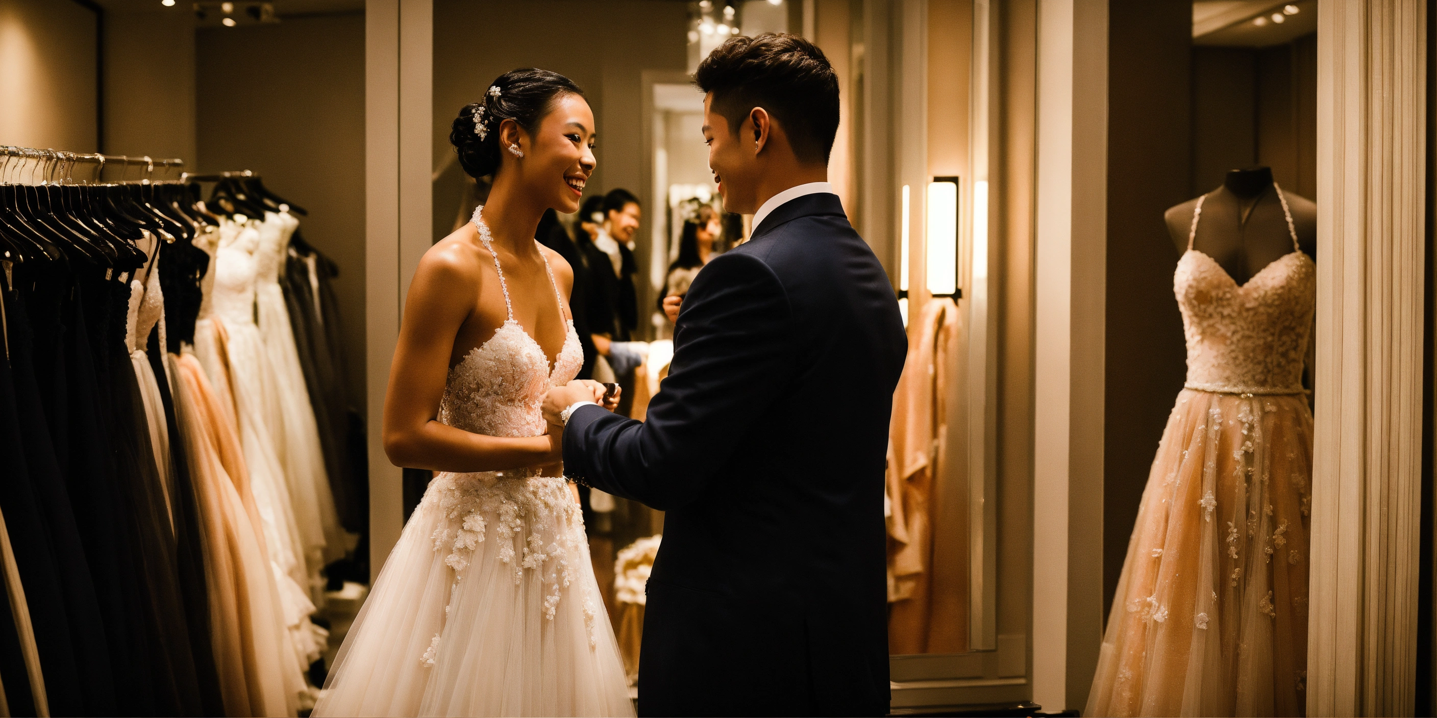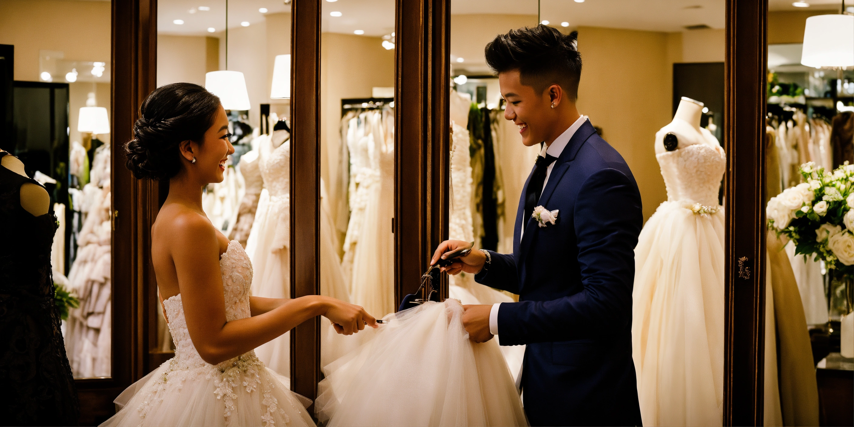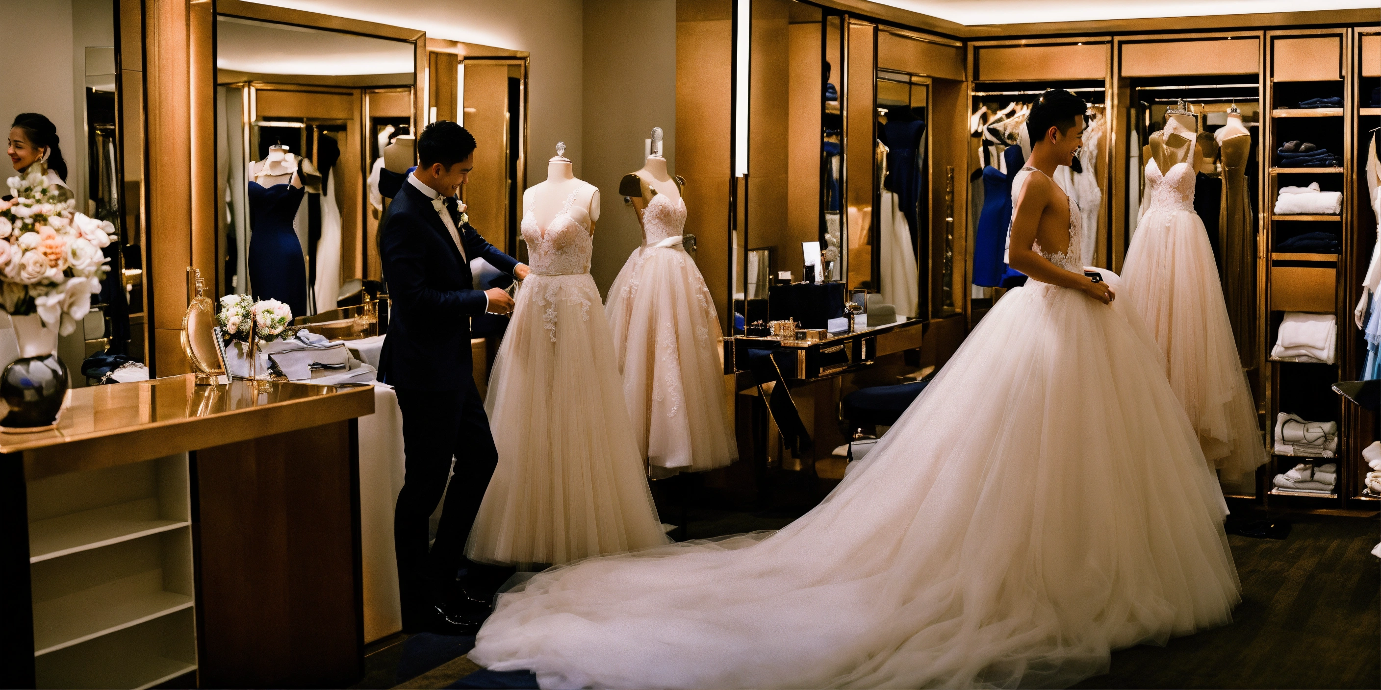 The bridal boy, a young man in nyc, working as a freelance bridal stylist for luxury client base, setting is inside vera wang on madison avenue with one of his clients, a female-trying on bridal gowns at the posh fashionable designer bridal salon. he is making her happy, she is excited. cheers!