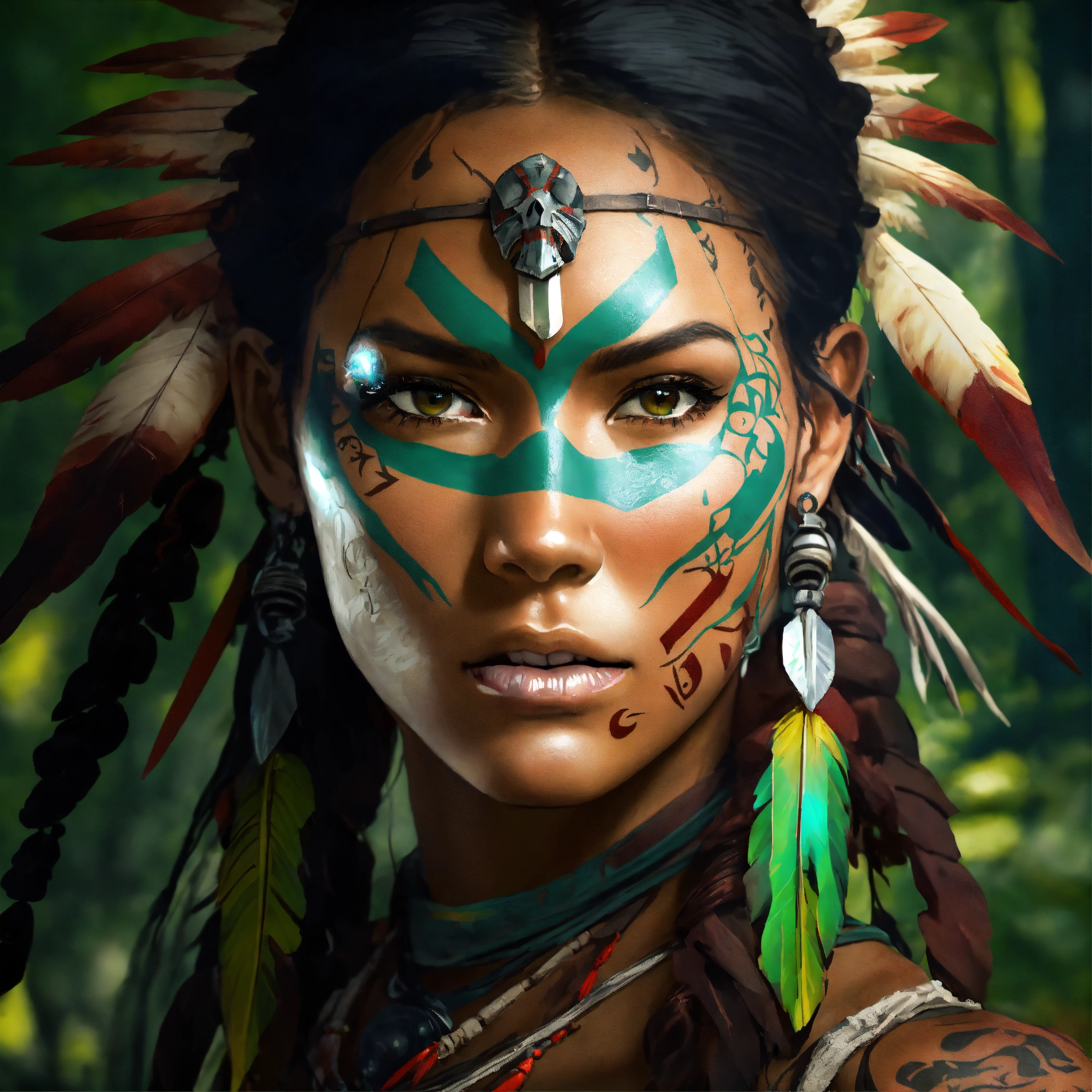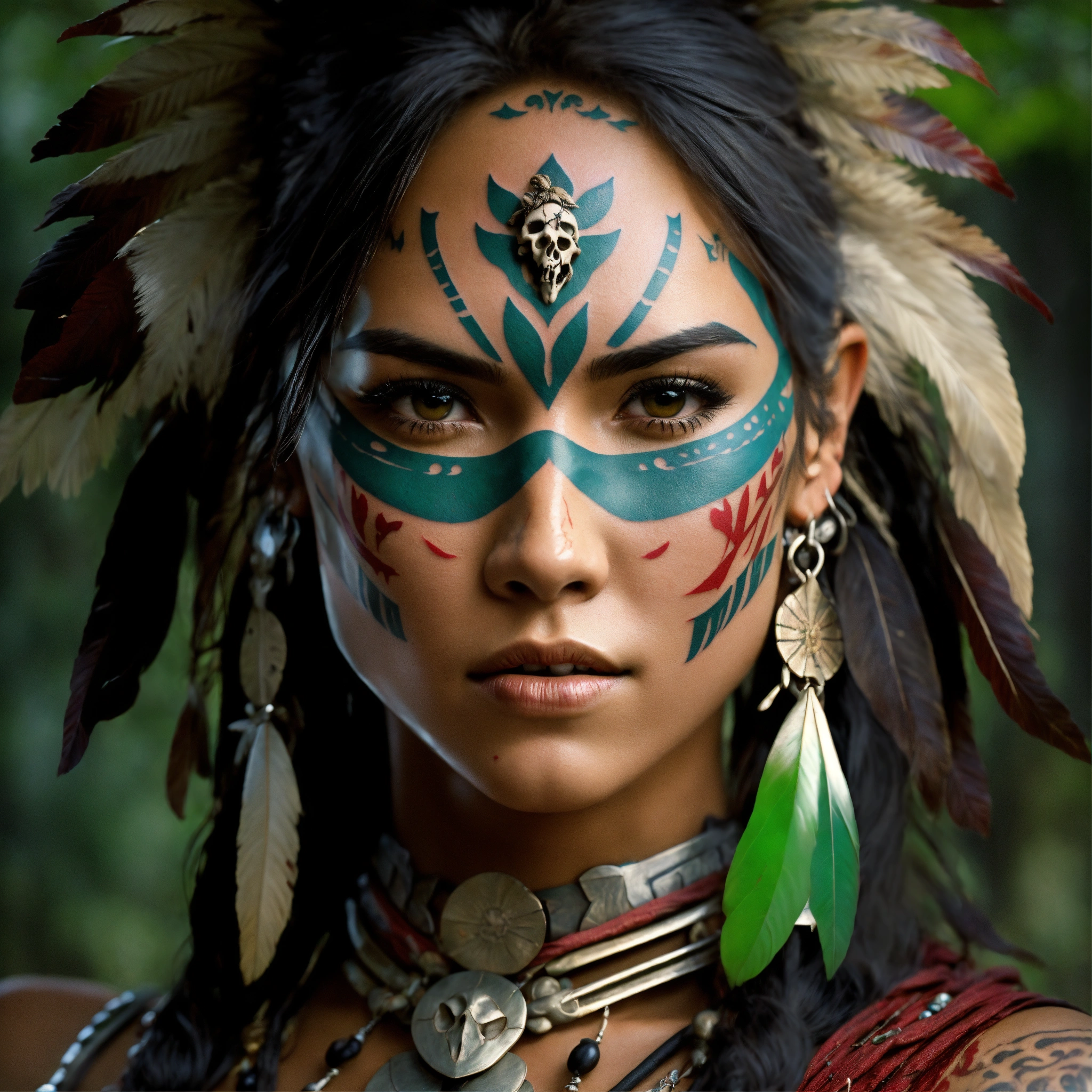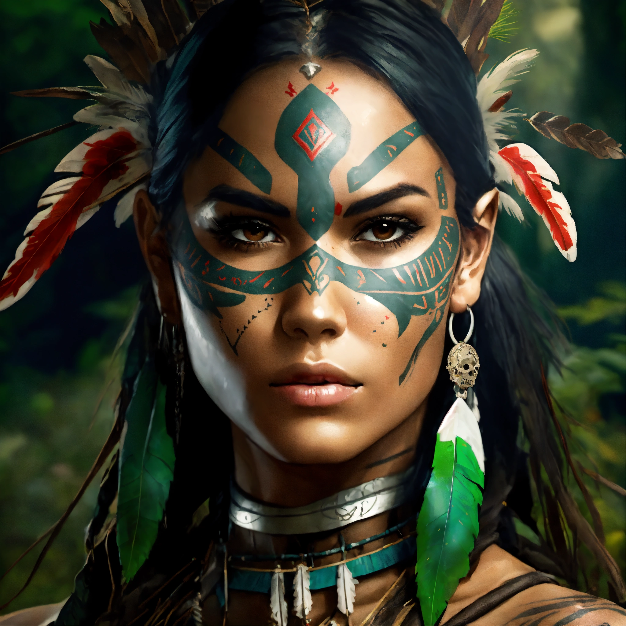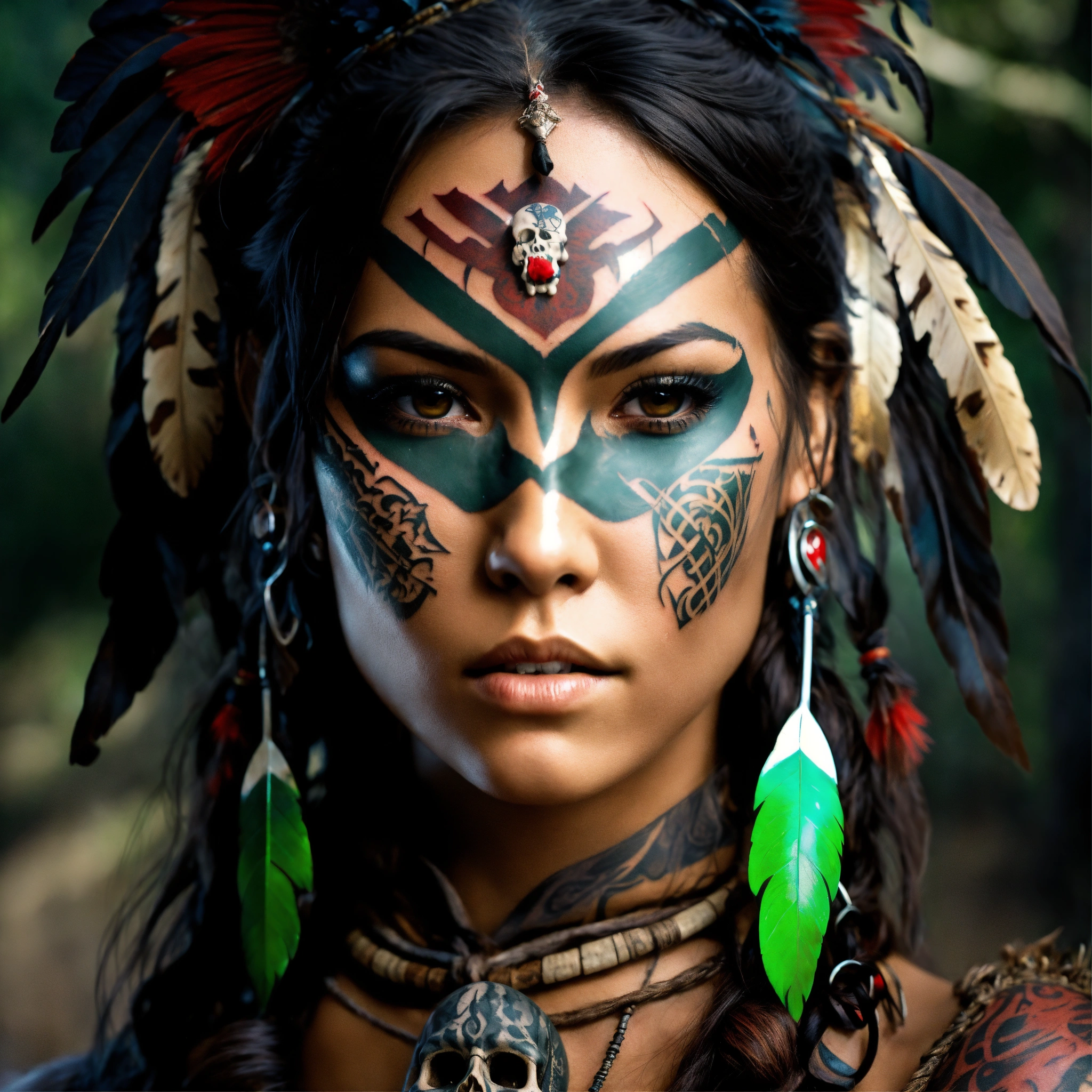 A fierce beautiful native american warrior in an enchanted forest. wild tribe girl, tanned, red and white marks and tattoo on face and body, primeval tribe female shaman, bone armor, skull mask, shaman necromancer female, manga, louis royo style, anime, cinematic, image creation lexica v3.0