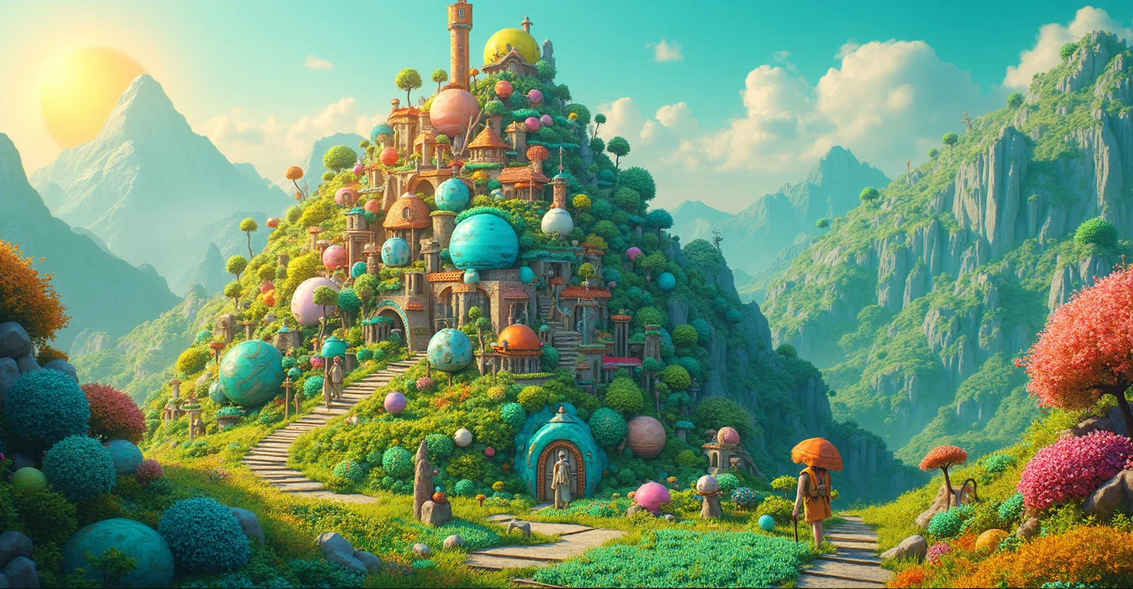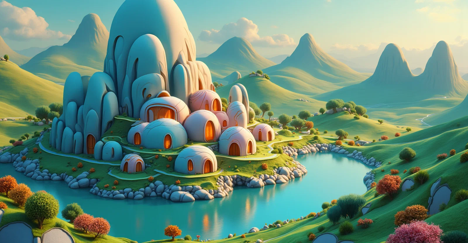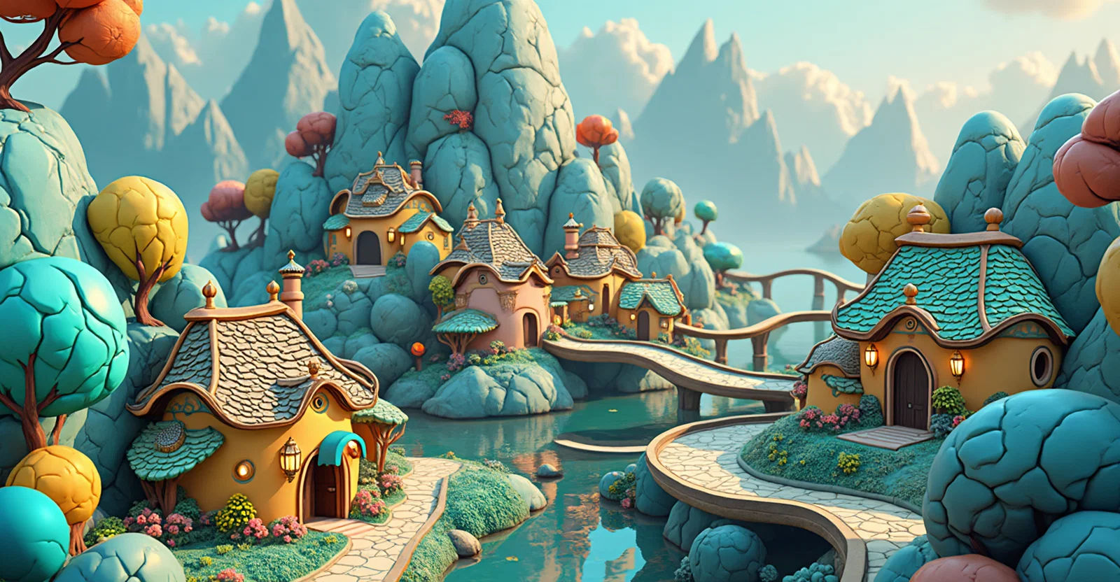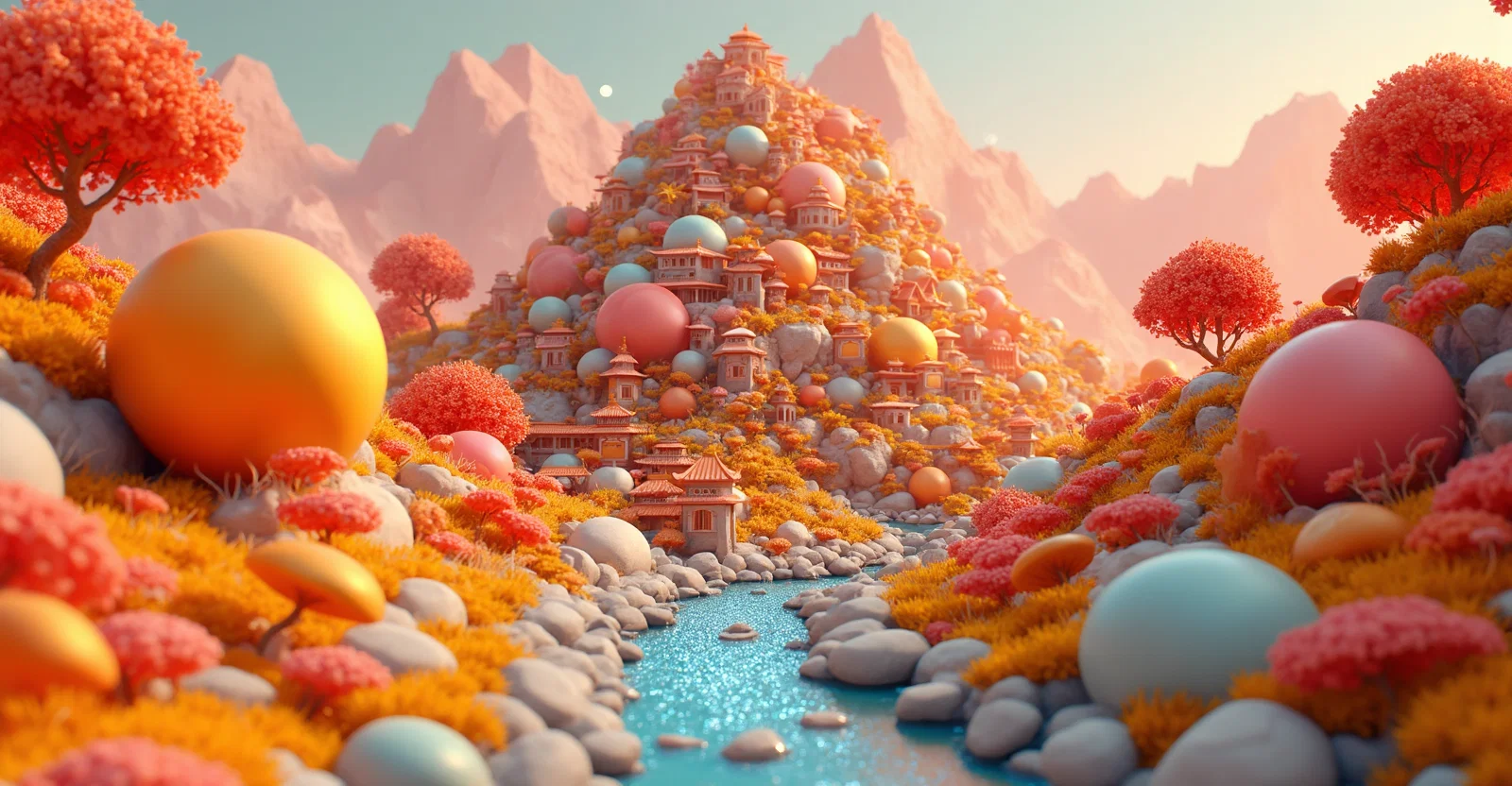 A mountain landscape with a village on top of the mountain, everything is created from round figures in the third dimension. very colorful and eye-catching.