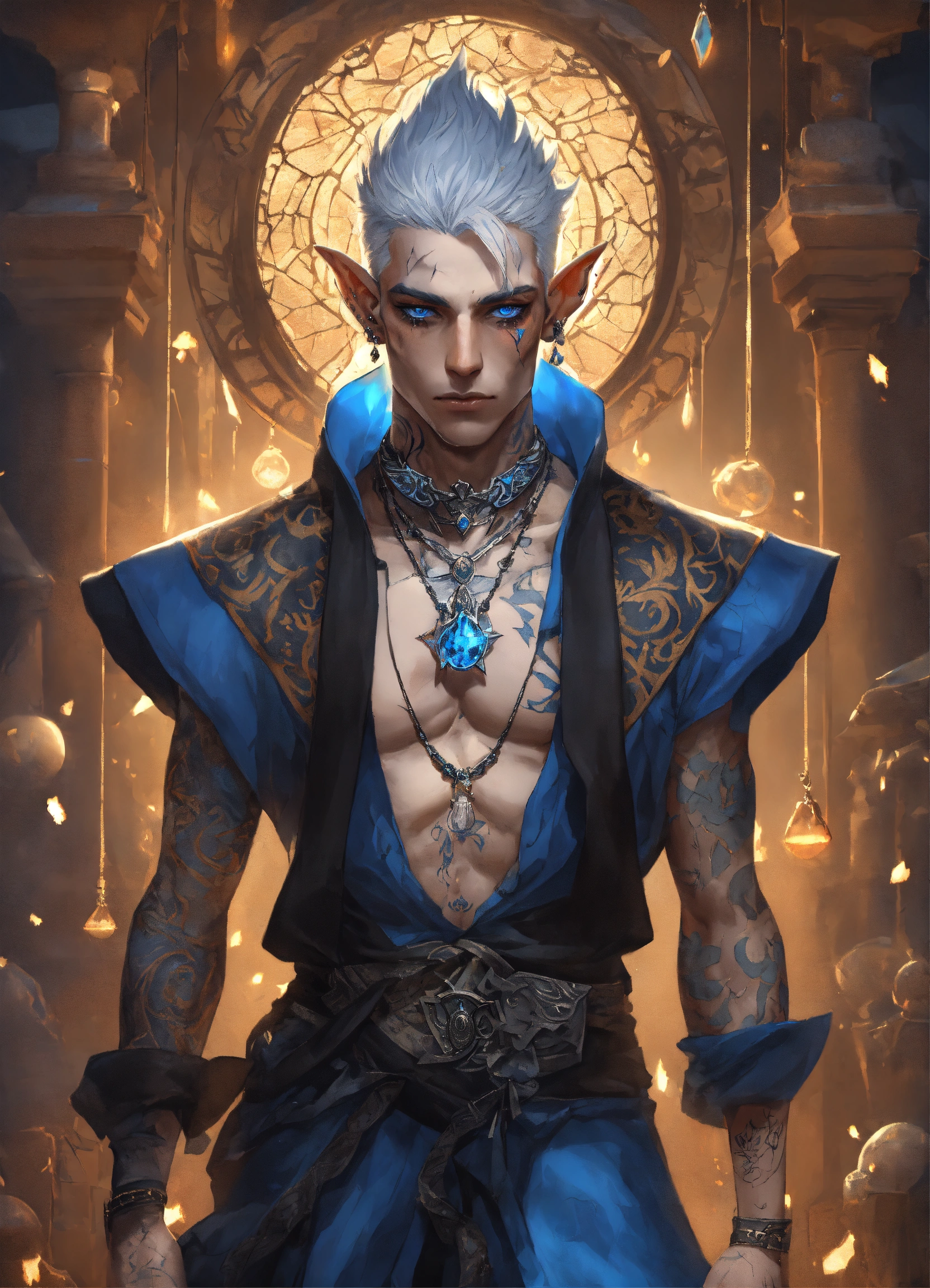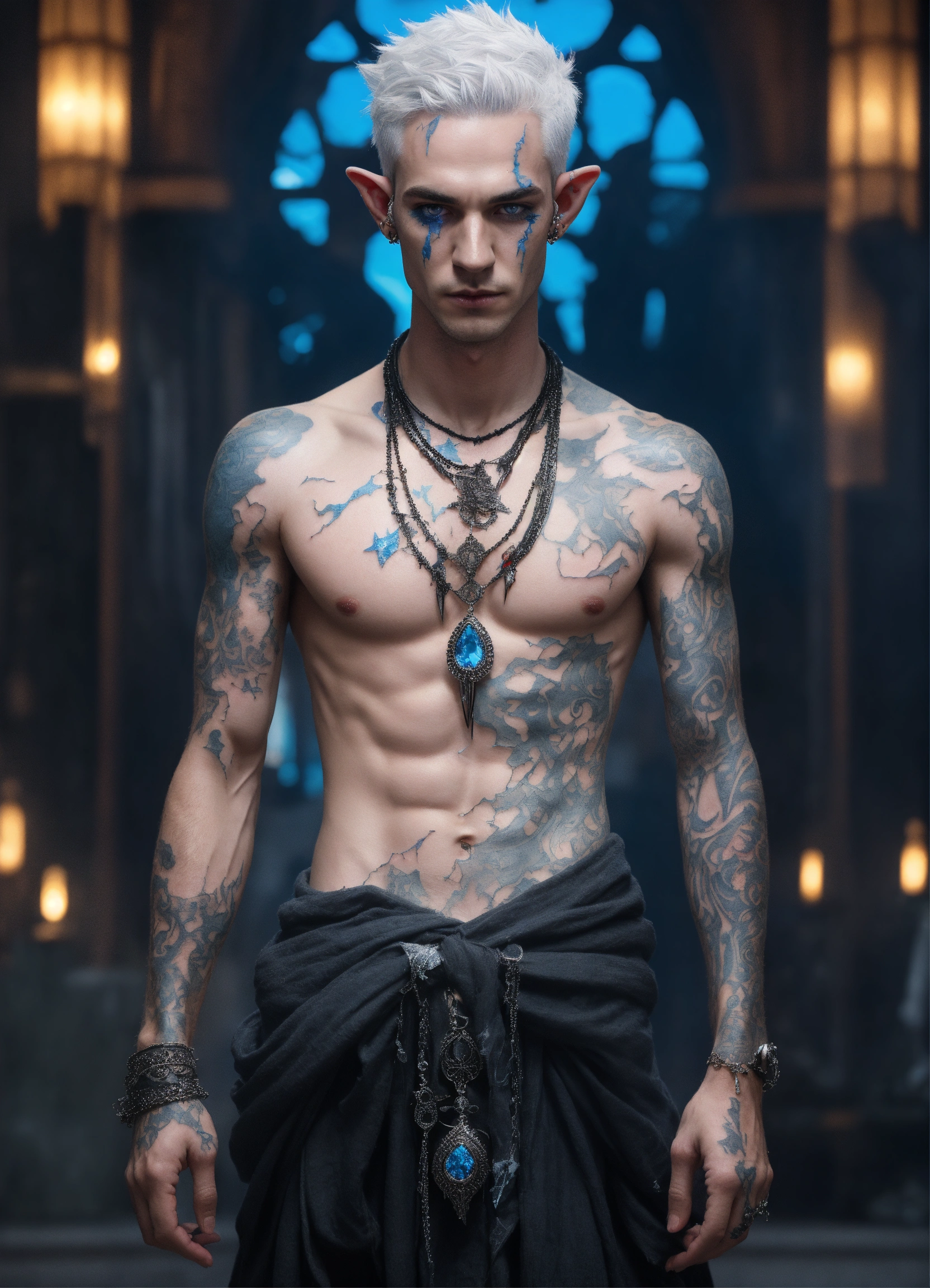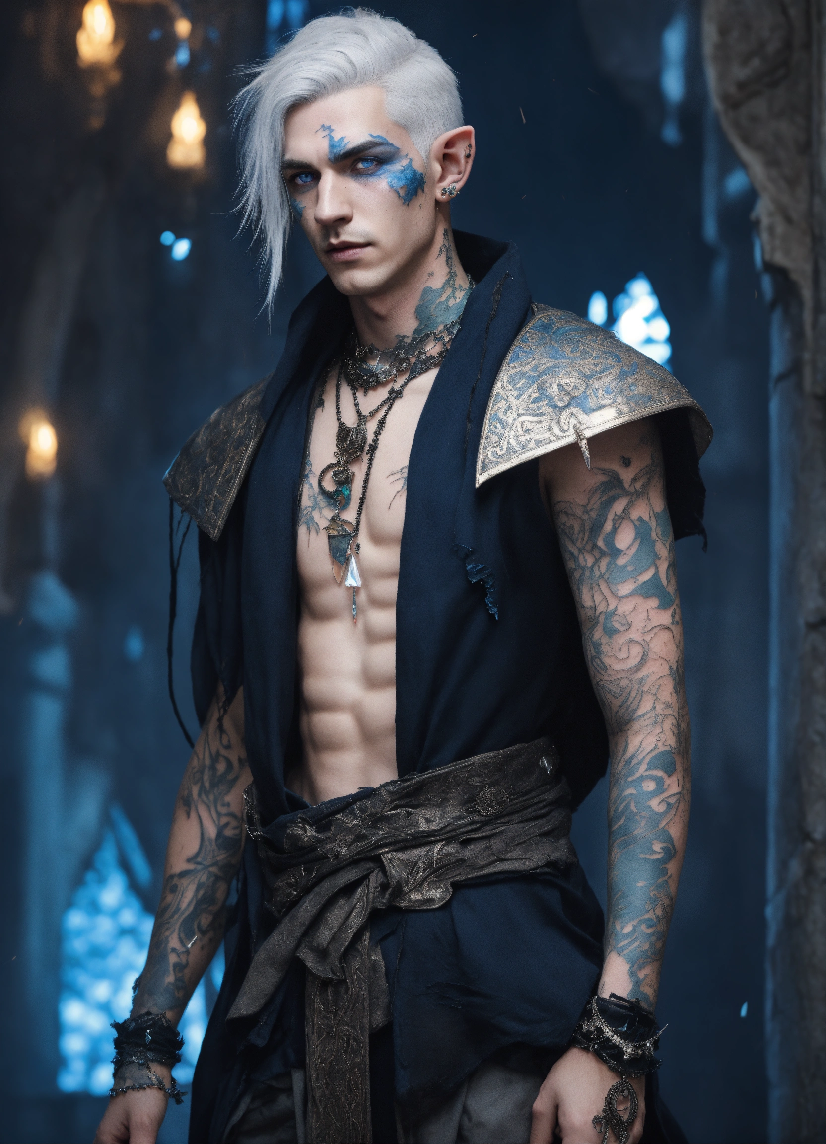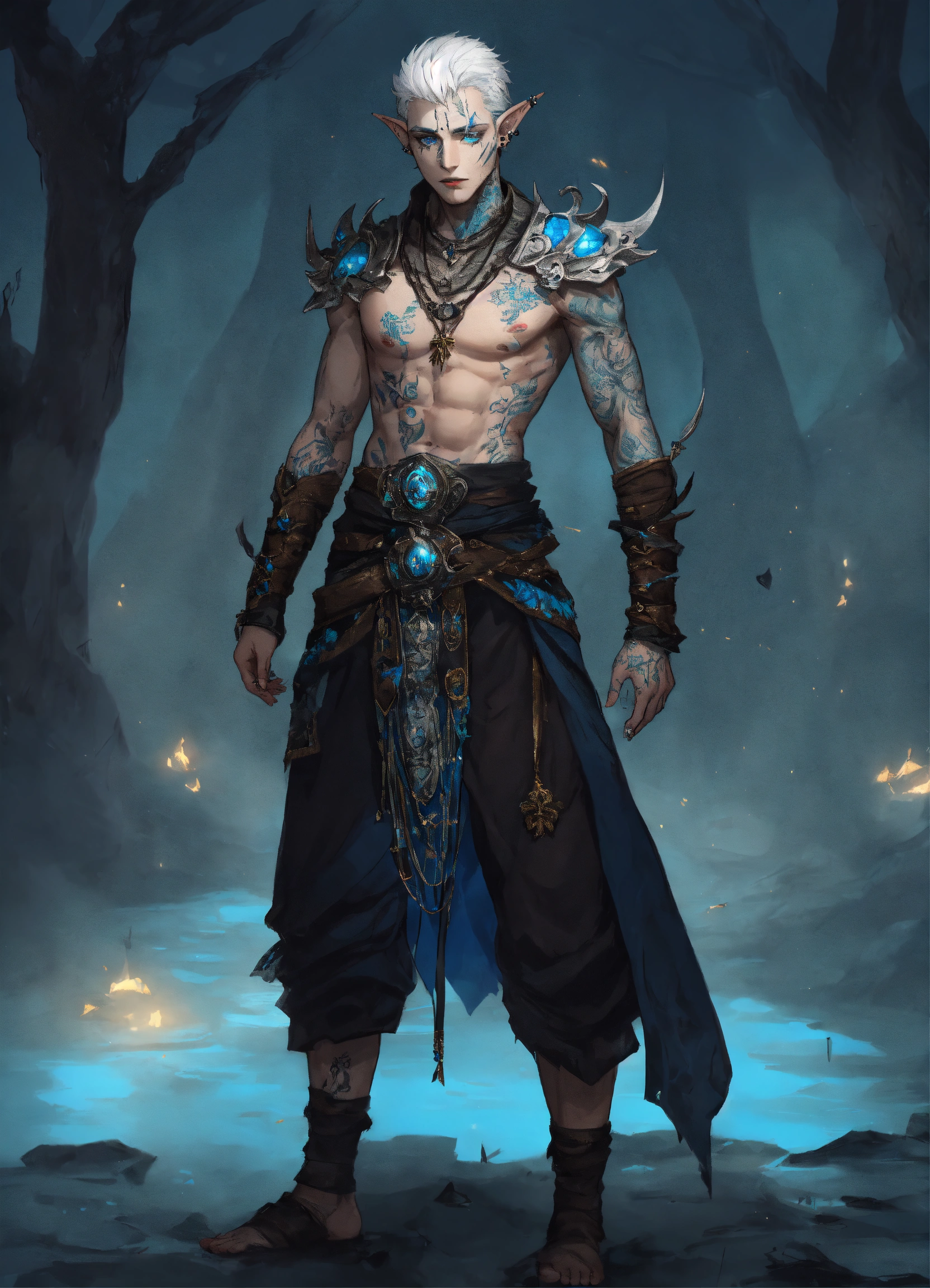 Full body shot of a tatooed male elf, monk, sickly thin, pale grey skin, black shattered skin, cracked face, broken skin, peeling skin, vacant blue eyes, pointy chin, glowing white hair, black and blue shadow magic, ultra detailed, necklace, piercings