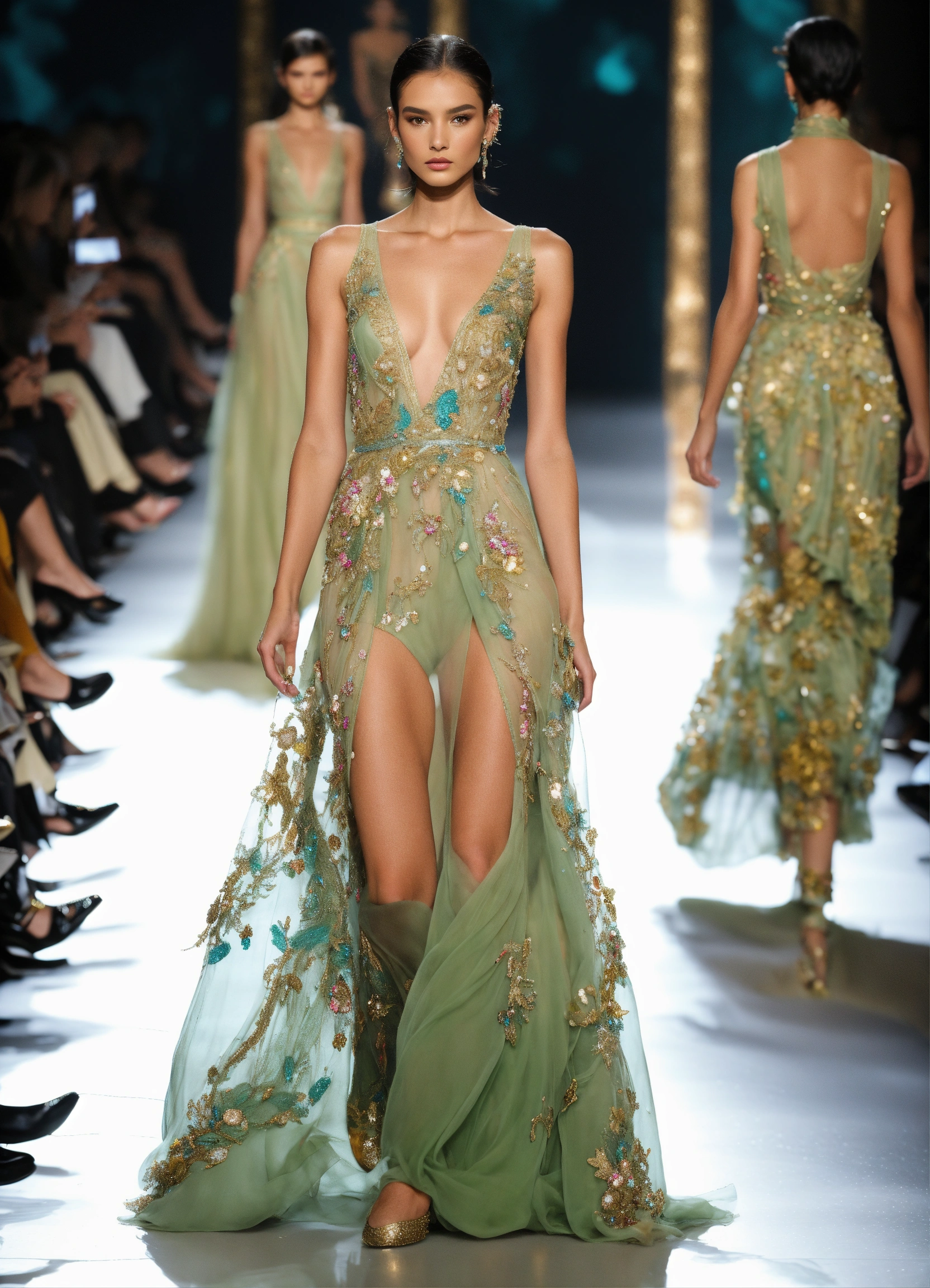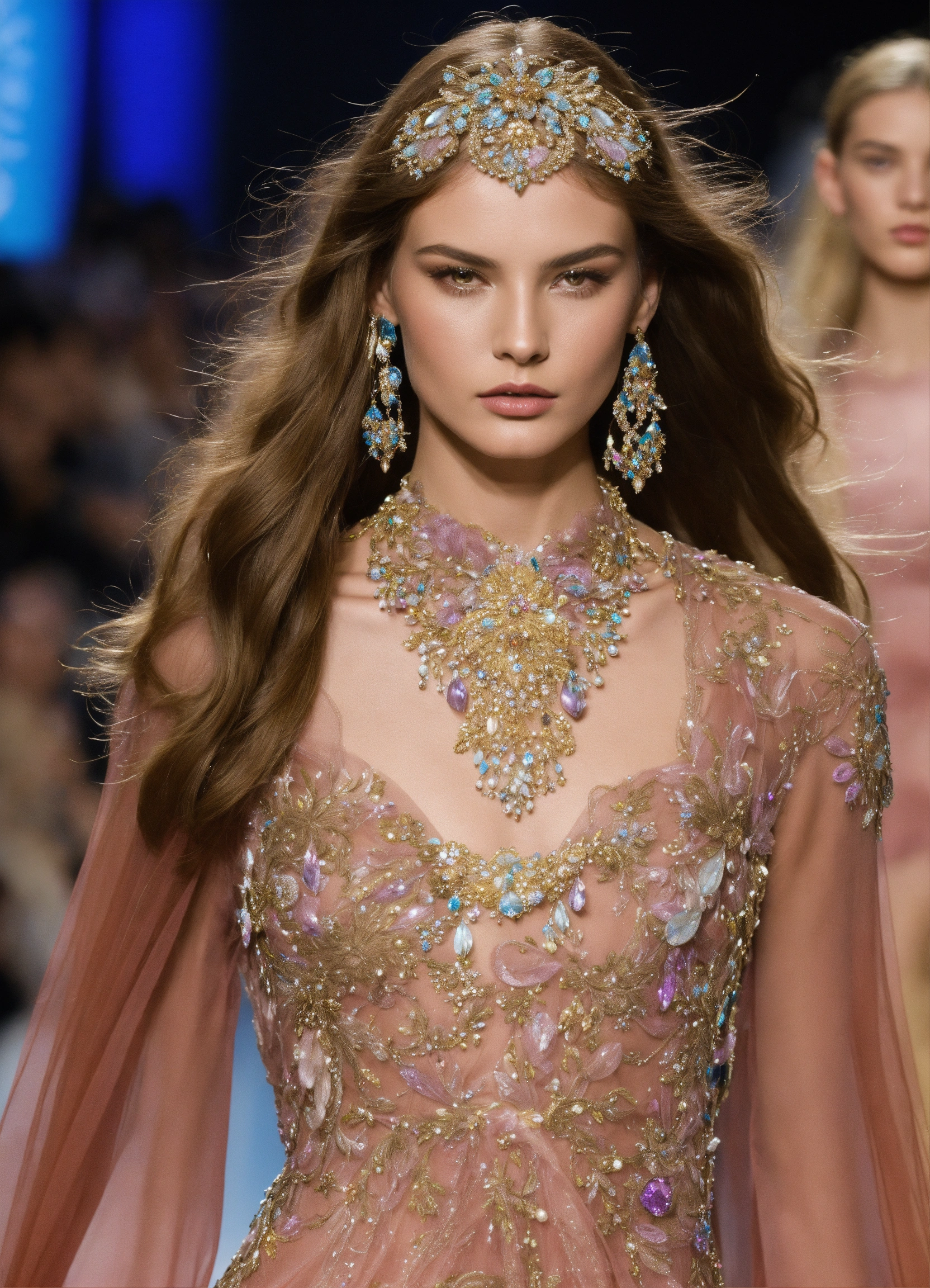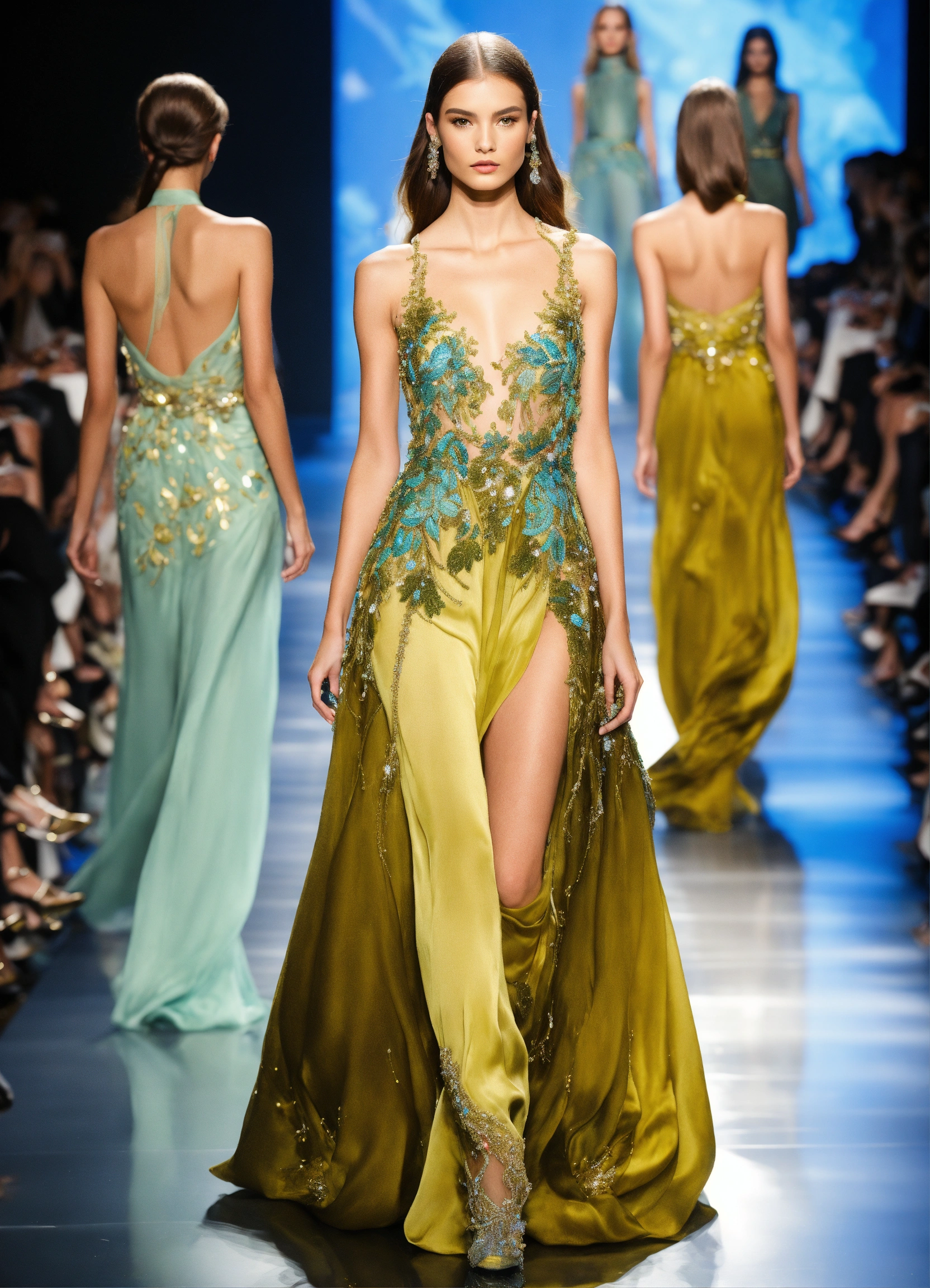 Models walking in a fashion week runway show, for elie saab, year is 2050, history and fashion entwine, we are on the brink of collapse and aliens have joined earth. these designs need to incorporate and become a sign of the times, yet dont make the garments too wildly out there, they need to be wearable couture. finest embellishments, silks, laces, beadworks, crystals, etc. expensive
