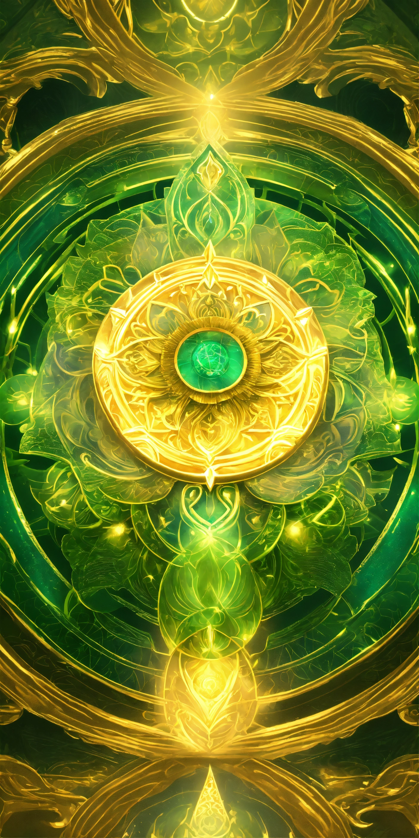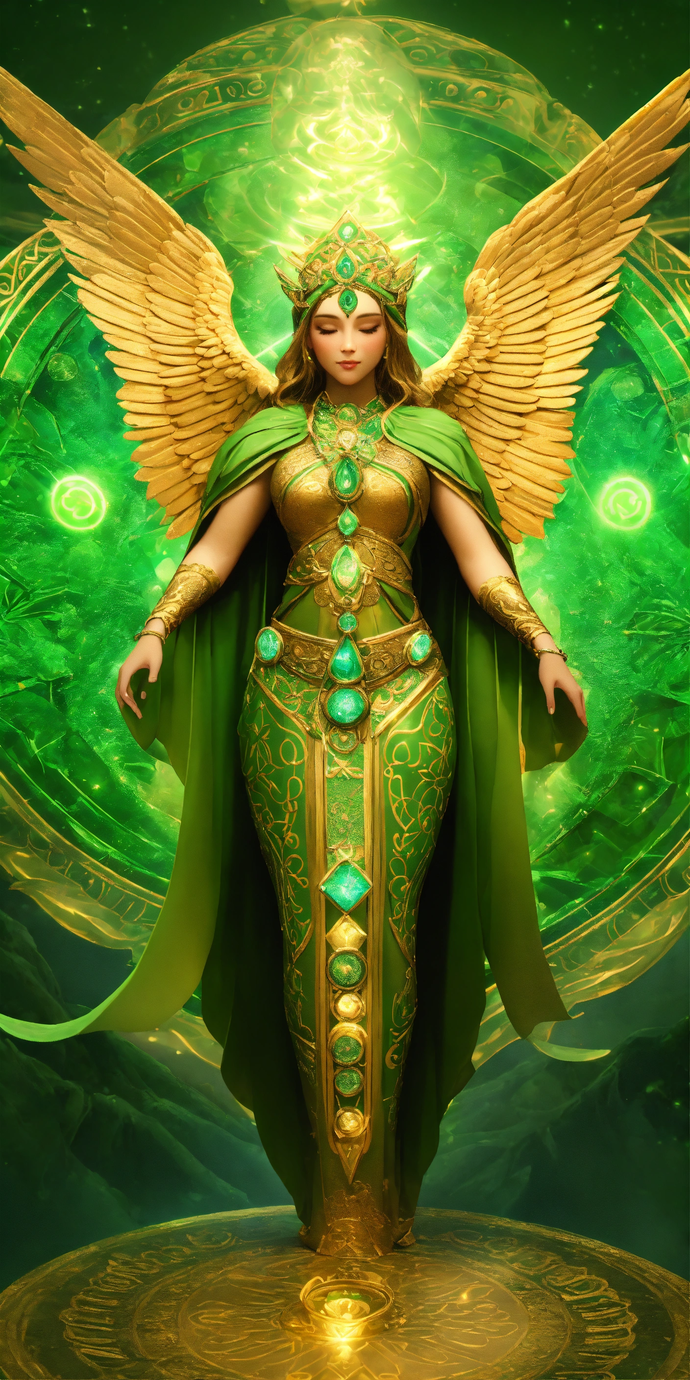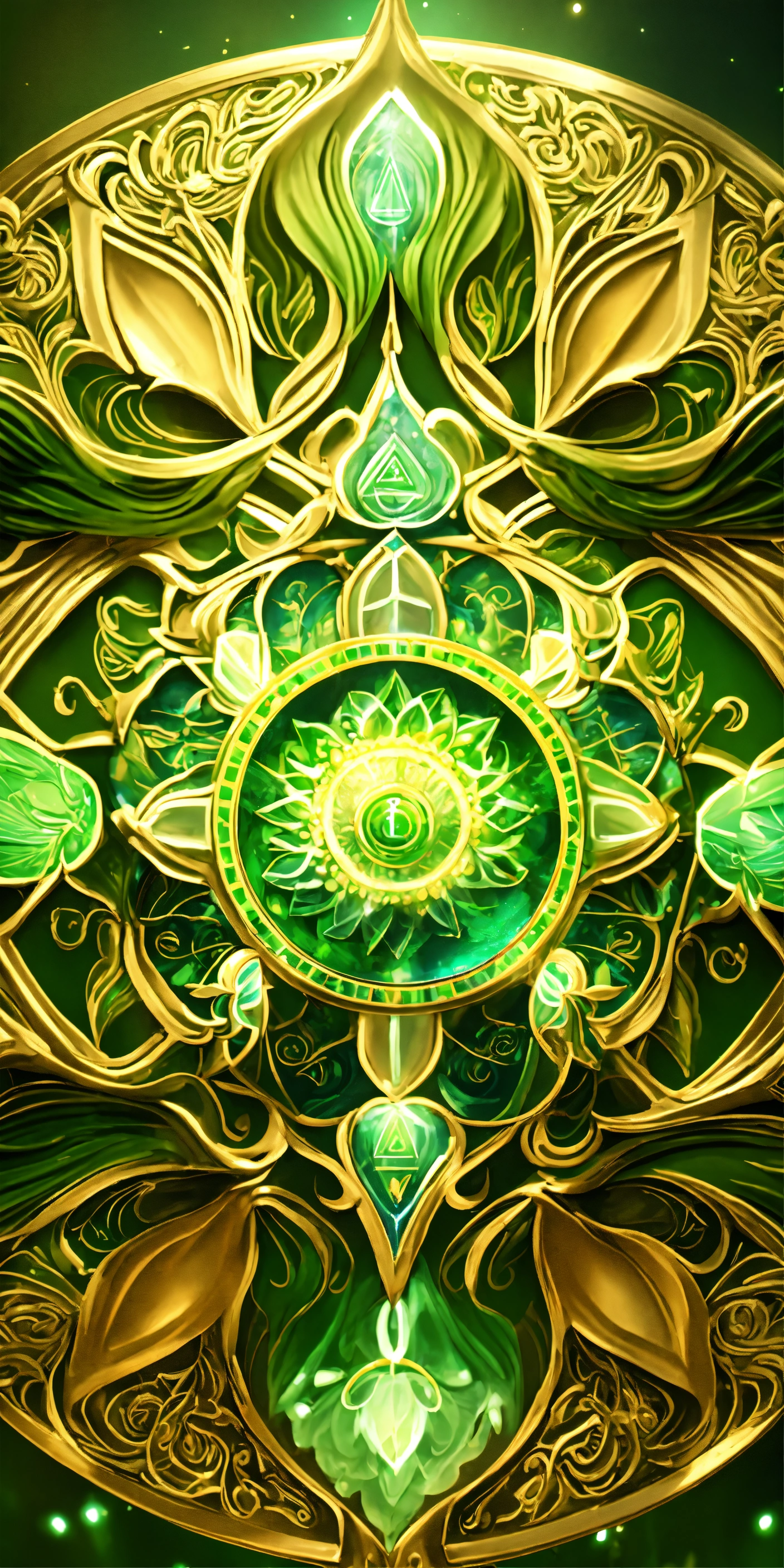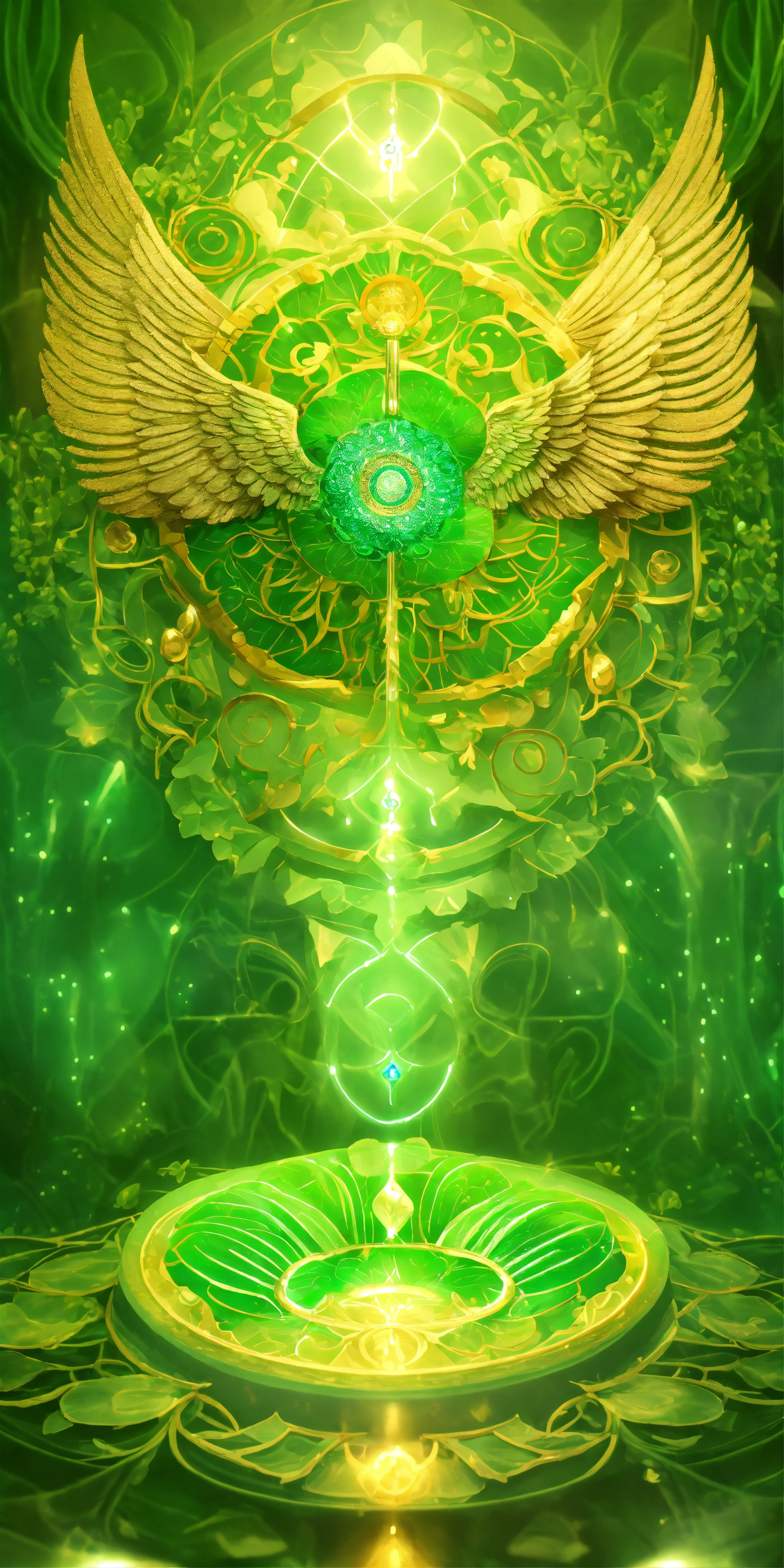 Symbol of the seven chakras and spiritual energy, beautiful and perfect, detailed, digital illustration, real, 3d, symbol of the archangel saint raphael in green color and subtle golden details, on each side there are detailed and large green wings, luminous background of luminous mandala shape, sharp focus, cinematic illustration, 8k, hyper-realistic digital painting, hd, high quality and resolution.
