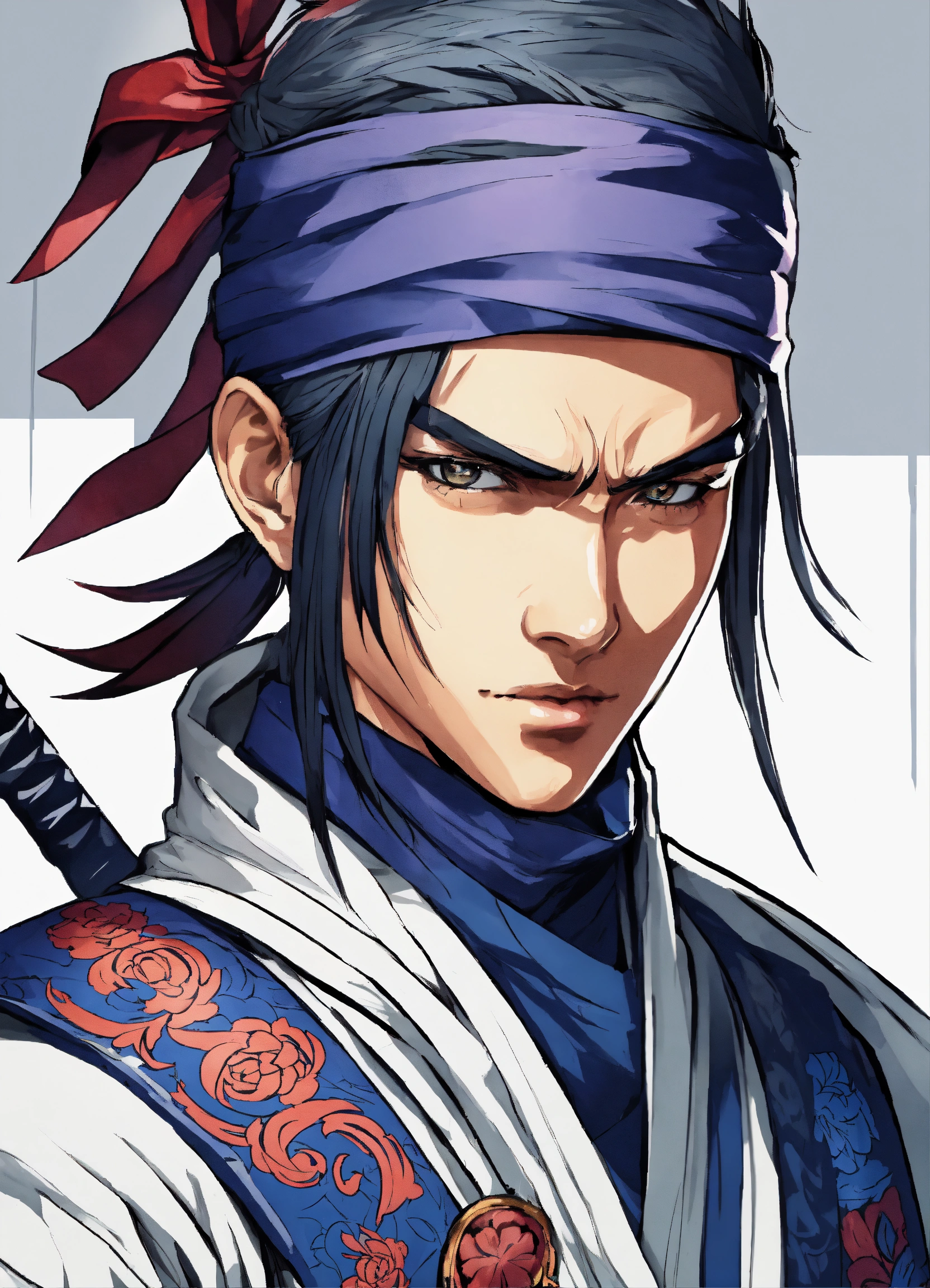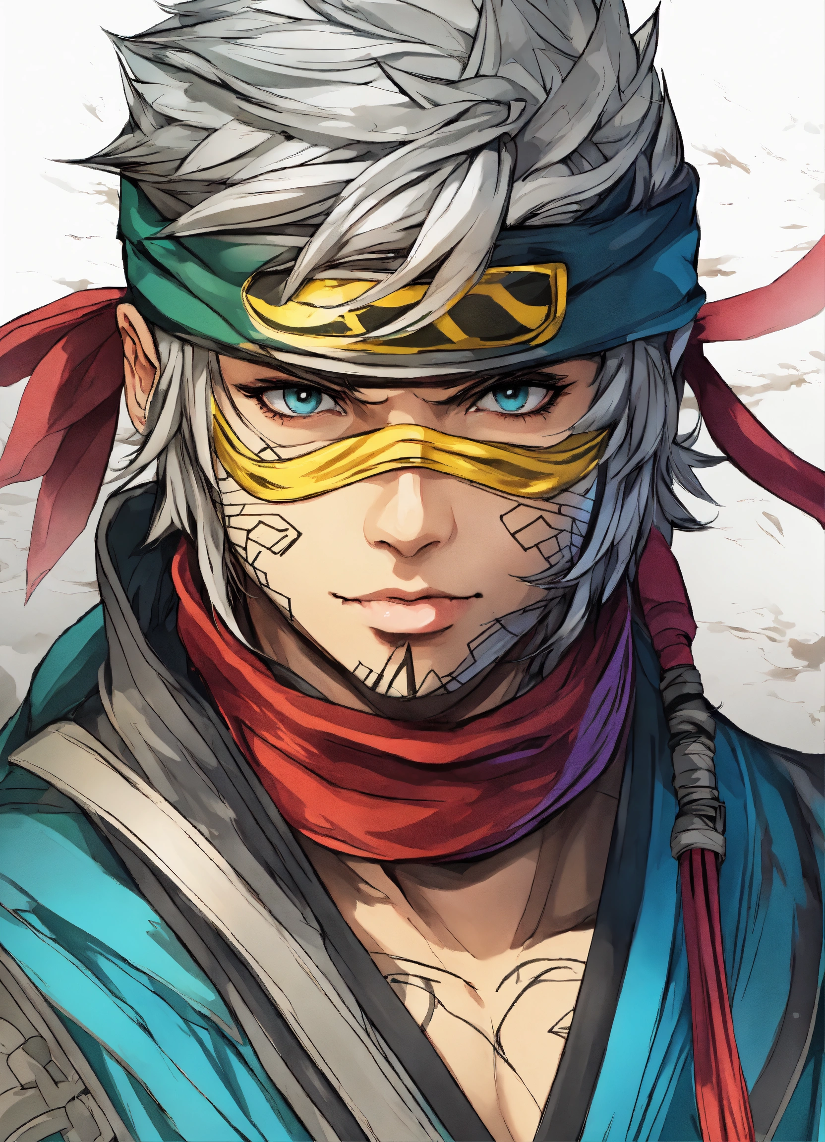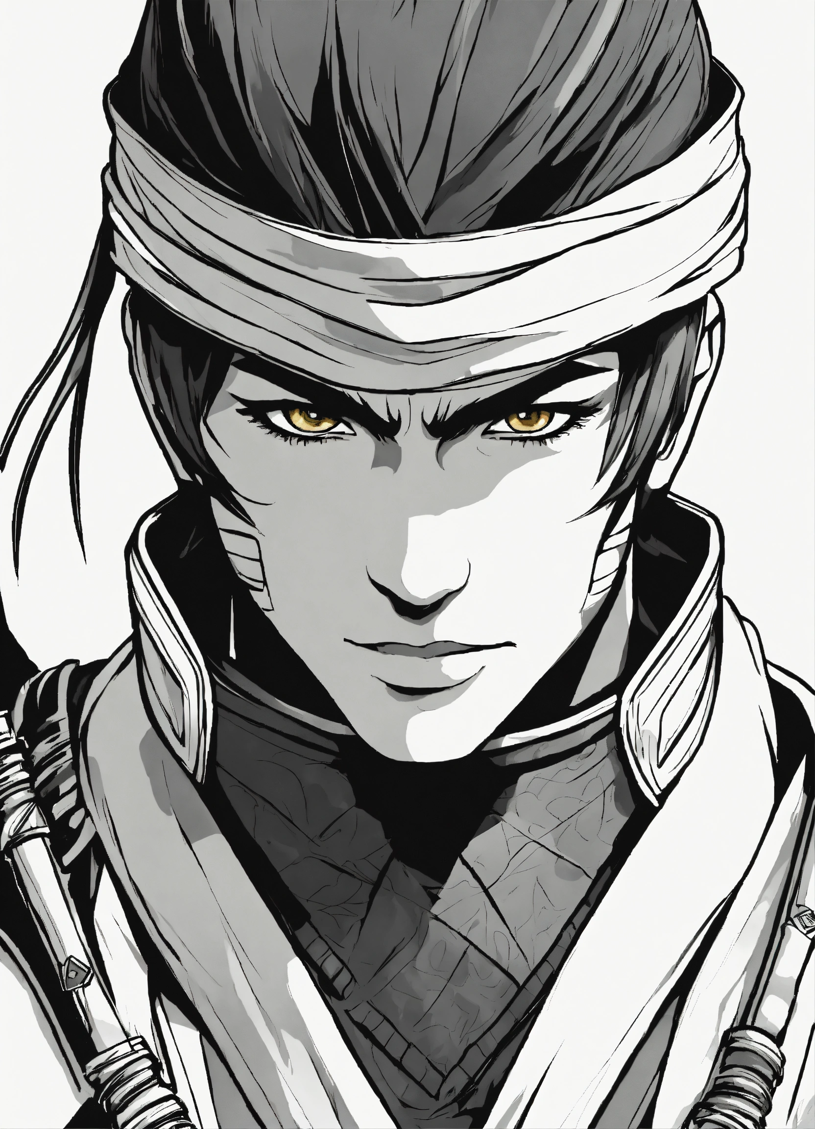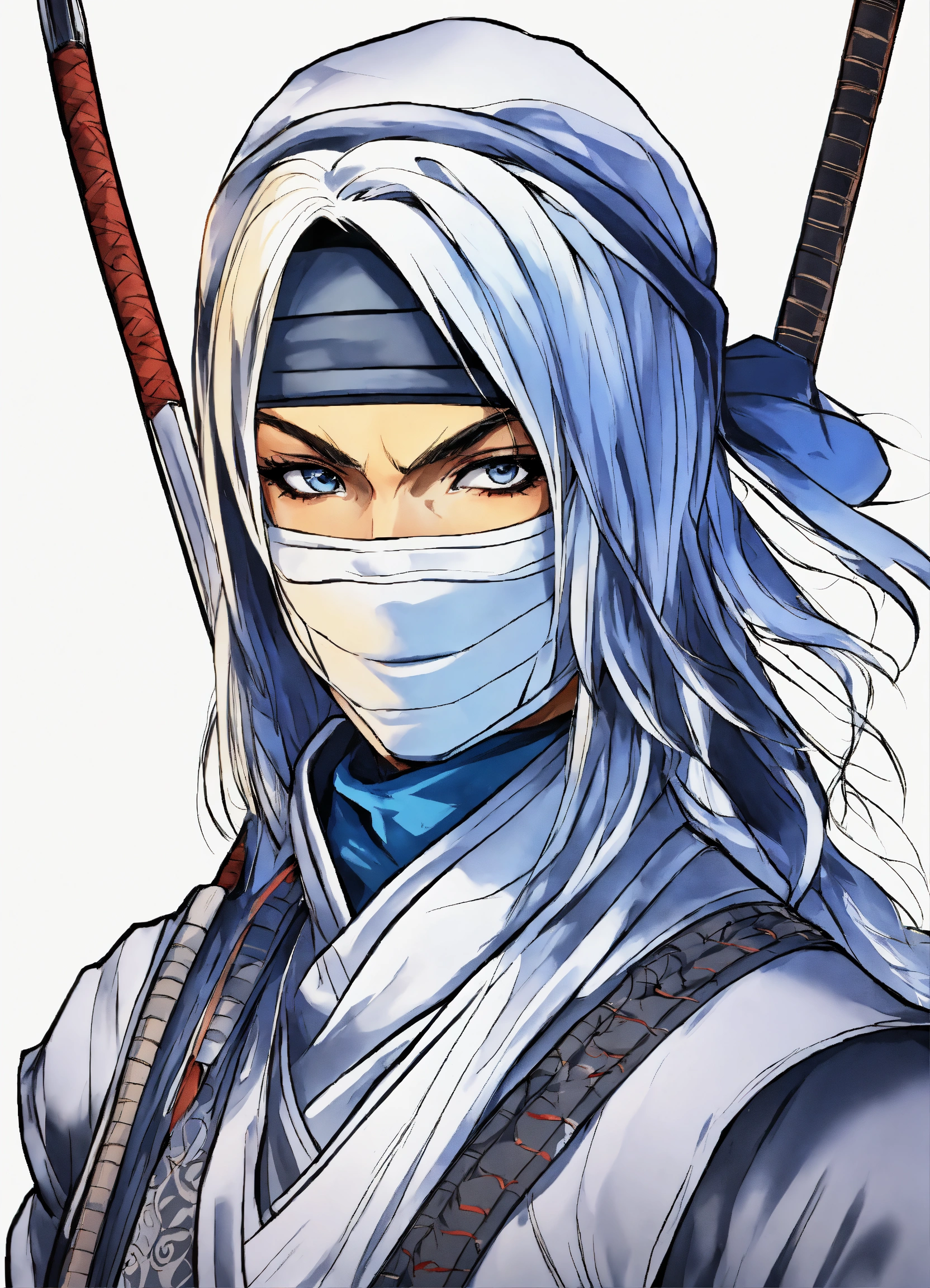 Generate a portrait of a ninja, 4k resolution, anime line art, with clear lines, no shadows, on a pure white background suitable for a adult's coloring book, fully colored with stunning colors