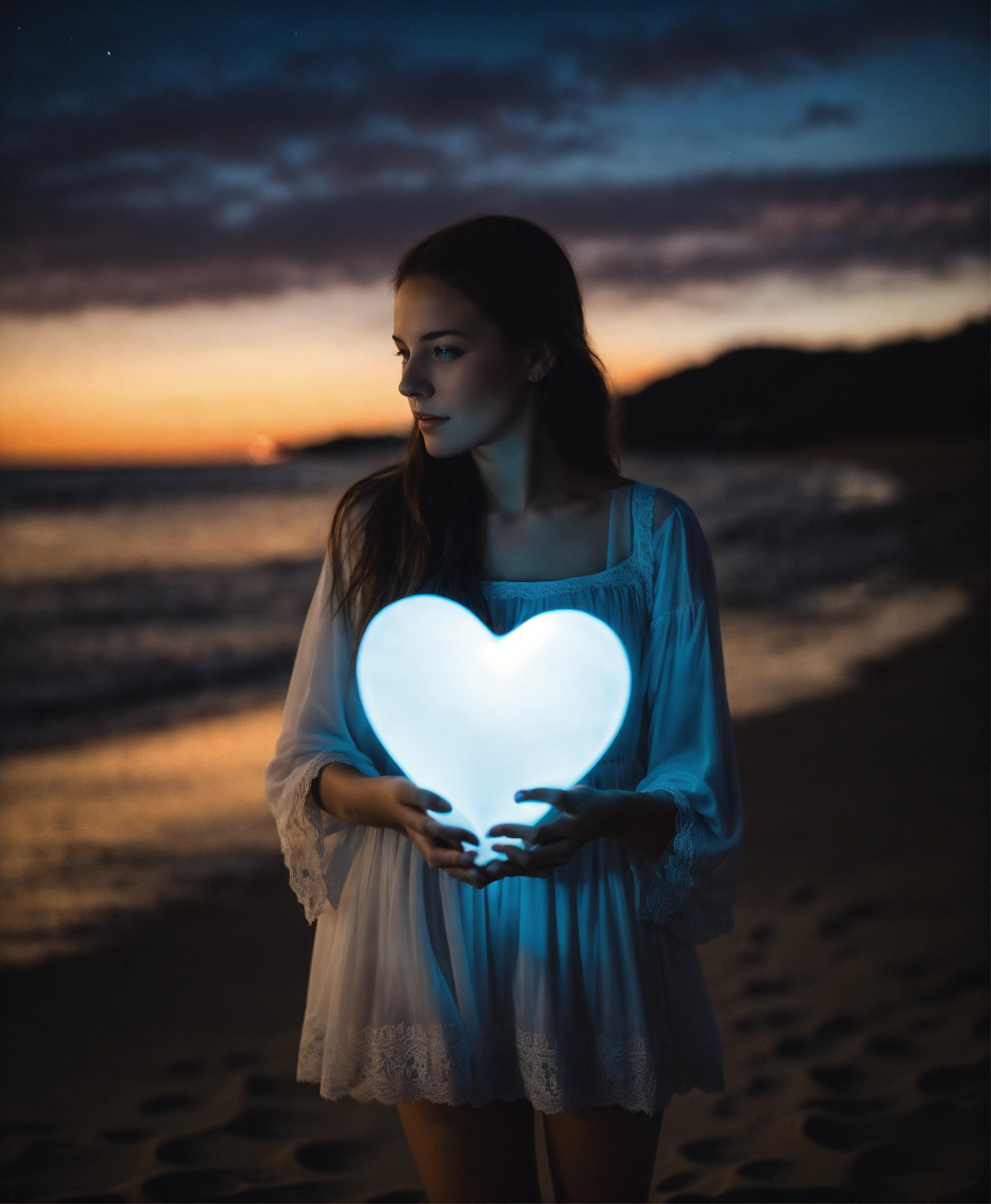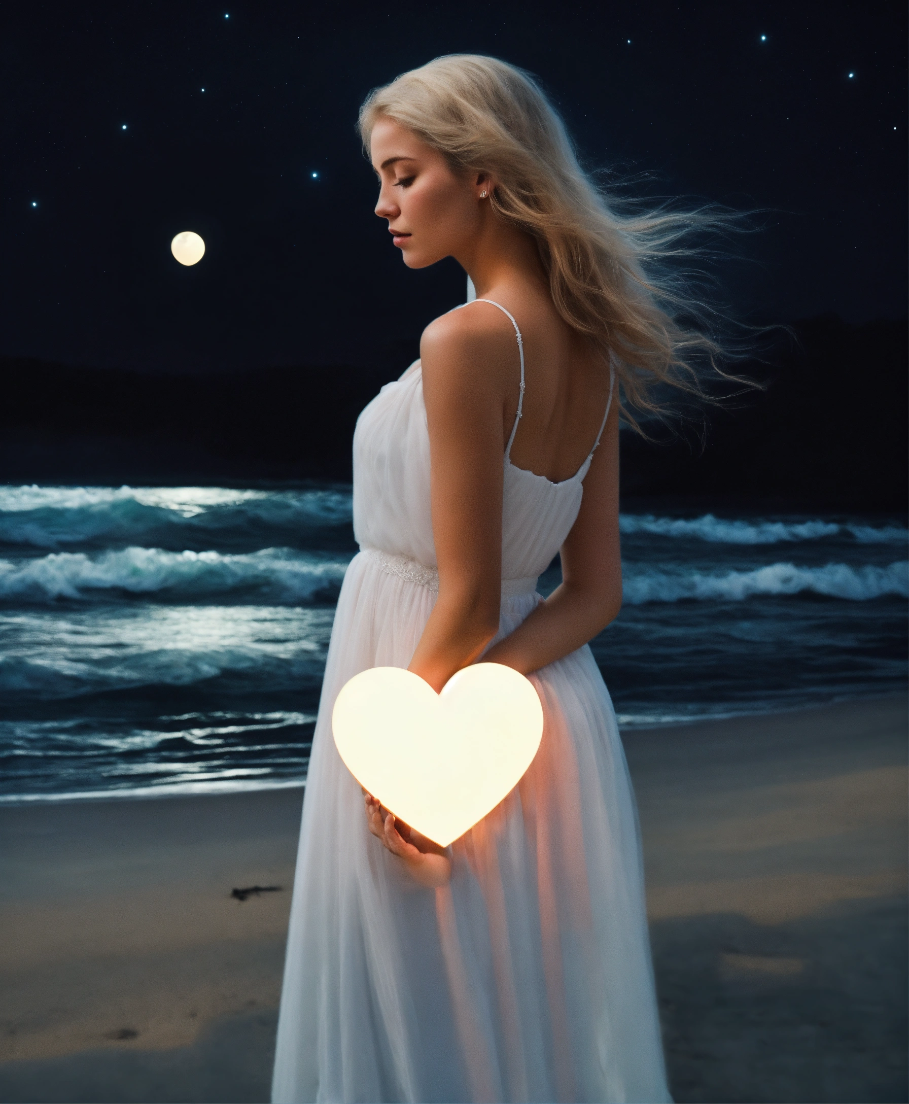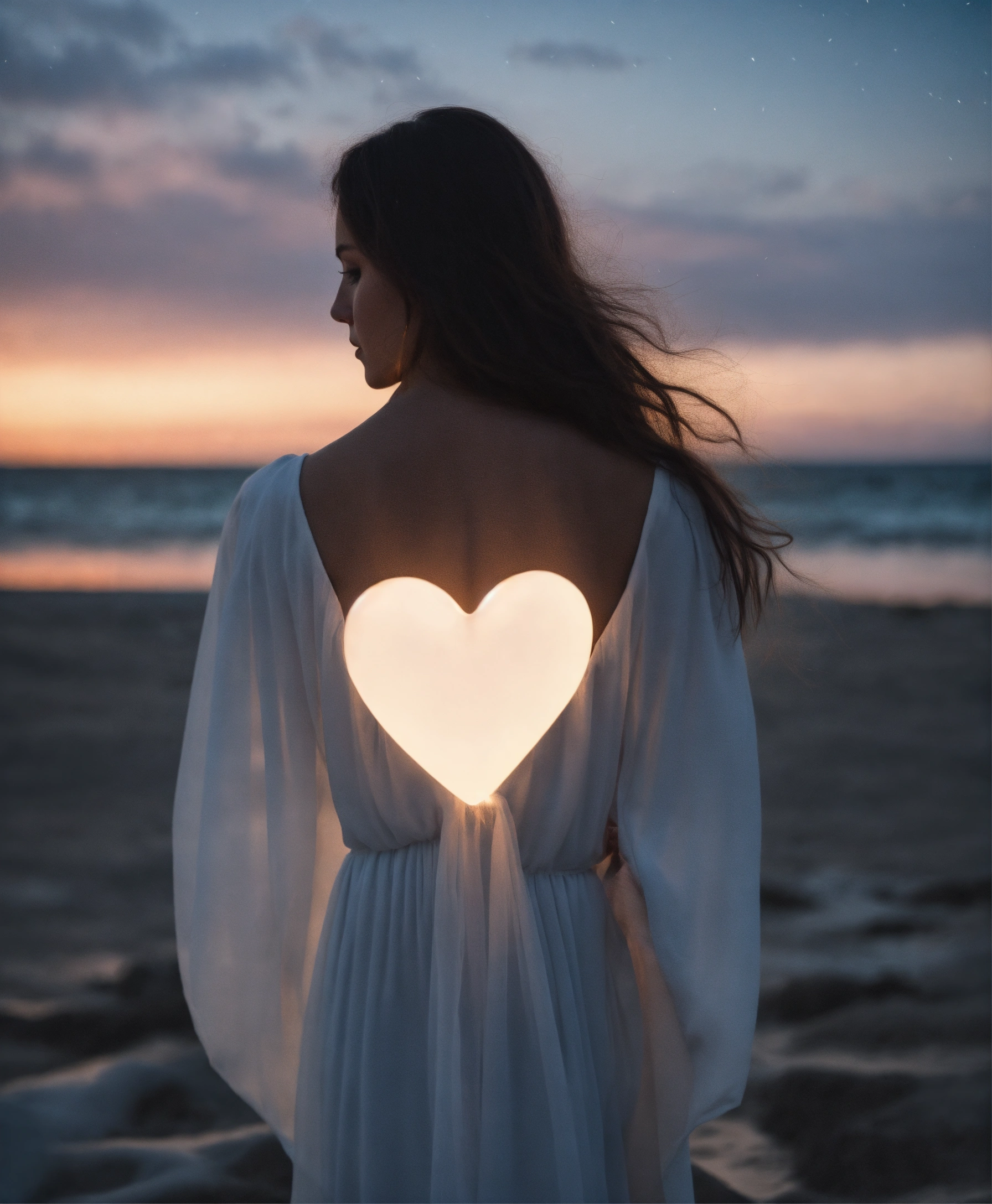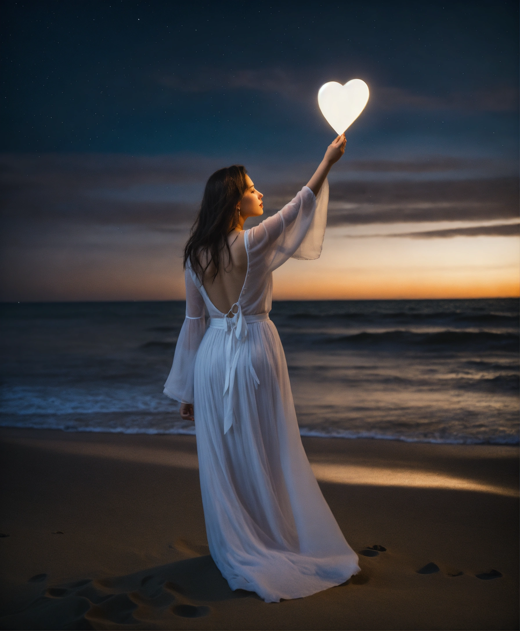 On the beach at night young white woman, without a veil, she faces back and holds the white heart up with her hands says our heart is not black, rather, it is white.