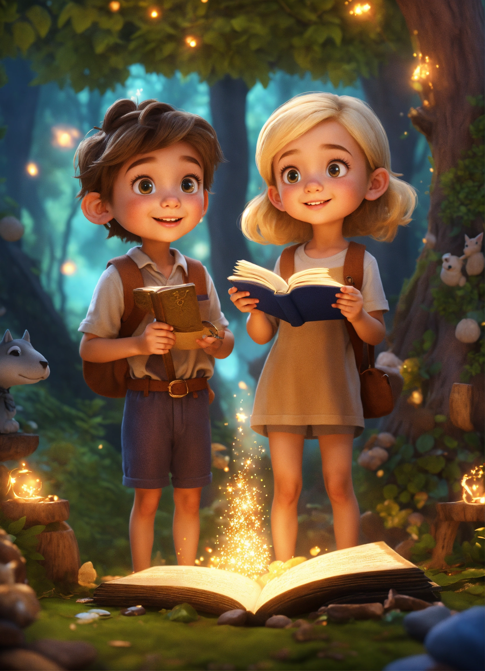 Cartoon style-short boy with dark brown hair face of surprise and exited and tall girl long blonde hair hazel eyes, both wearing casual clothing, girl is holding a magic wand, and boy is holding a brown old spell book. show magic sparkle dust similar to fairy dust surrounded the characters from the magic treehouse in a magic enchanted forest unreal engine render, 8k