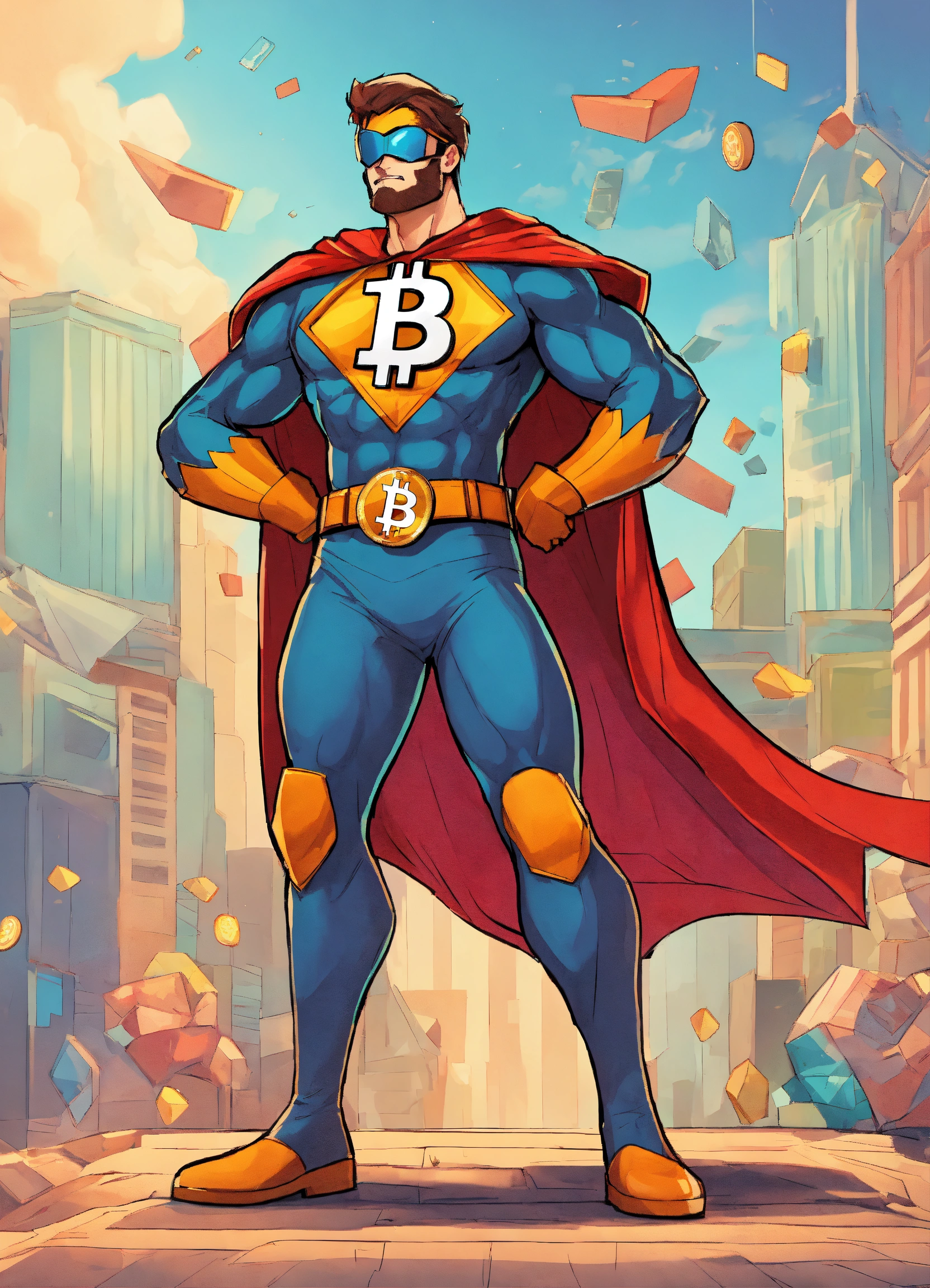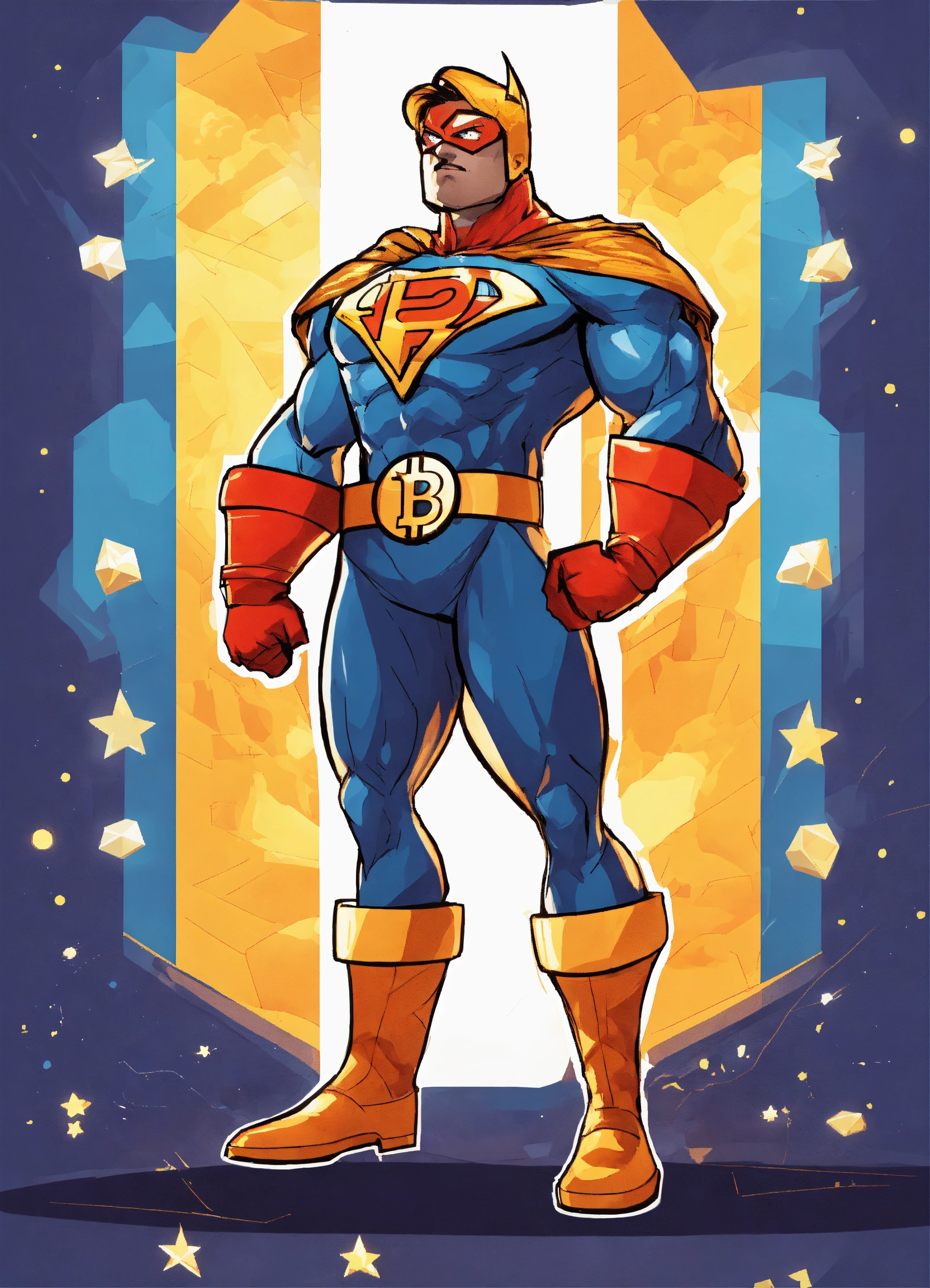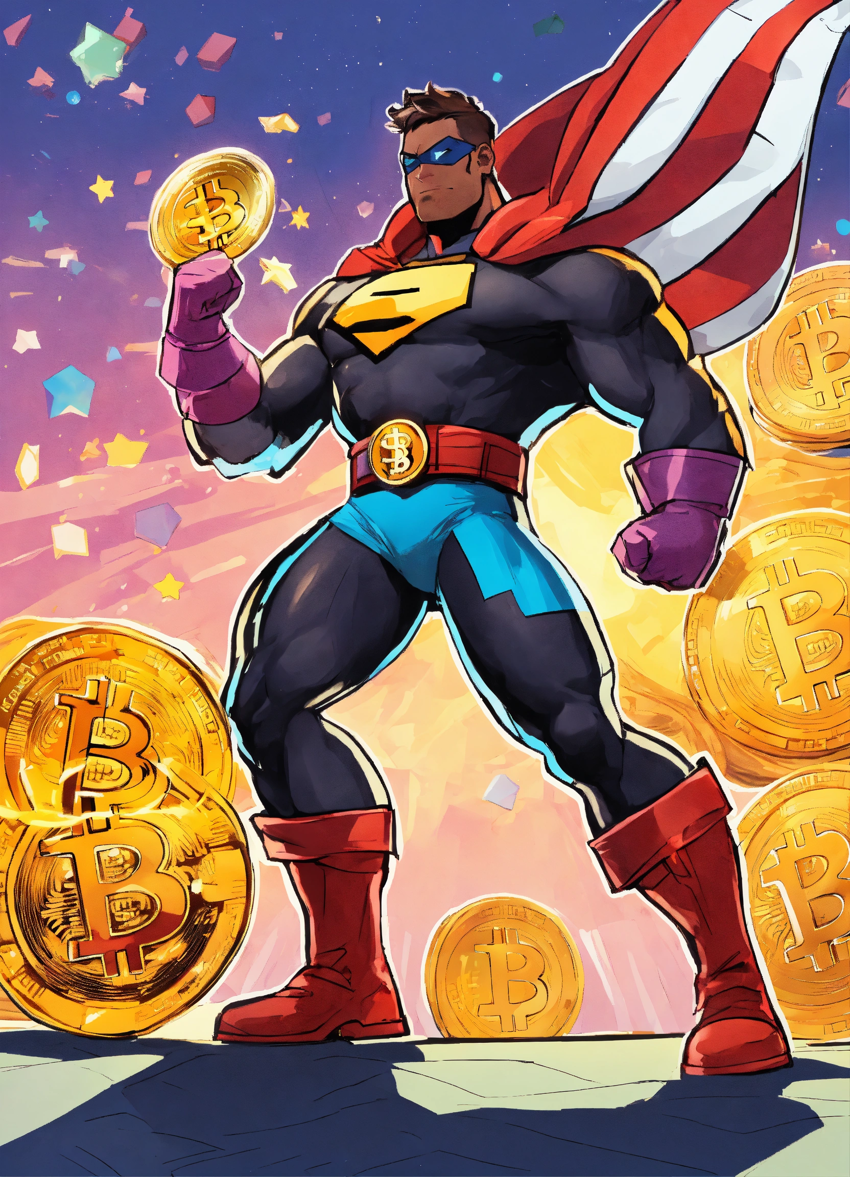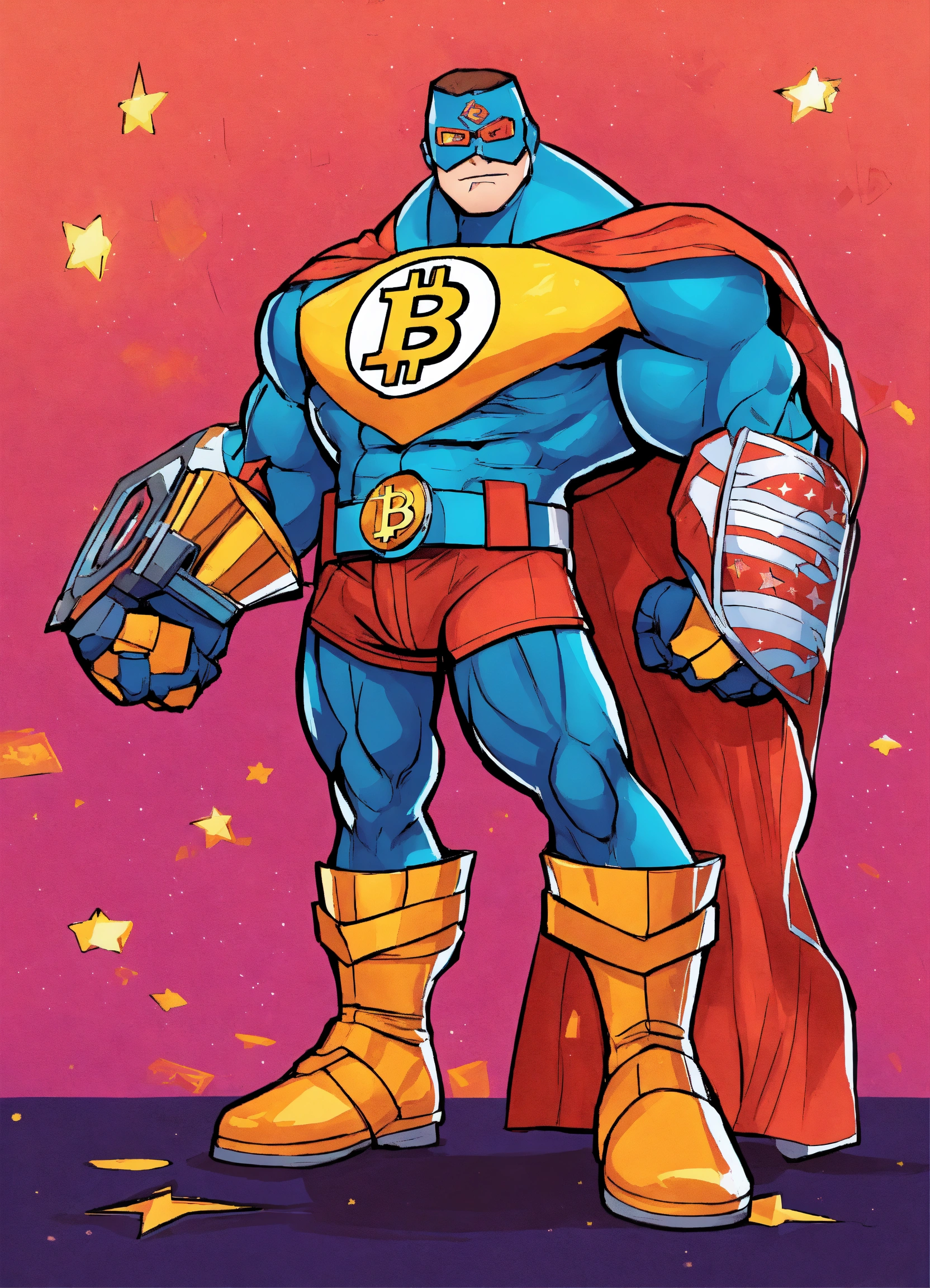 This image depicts a cartoon character of a bitcoin superhero wearing a brightly colored garment with a variety of details. the character is wearing a pair of gloves, boots, and a belt, and the garment has a variety of designs, including stars, stripes, and geometric shapes. the character also has a big bitcoin logo on his chest. the character has a determined expression, with his eyes focused and his mouth set in a determined line. he stands in a heroic pose, with one arm raised and one leg slightly bent. he looks powerful and determined, ready to take on any challenge. prompt cartoon character of a bitcoin superhero, strong, confident, white background