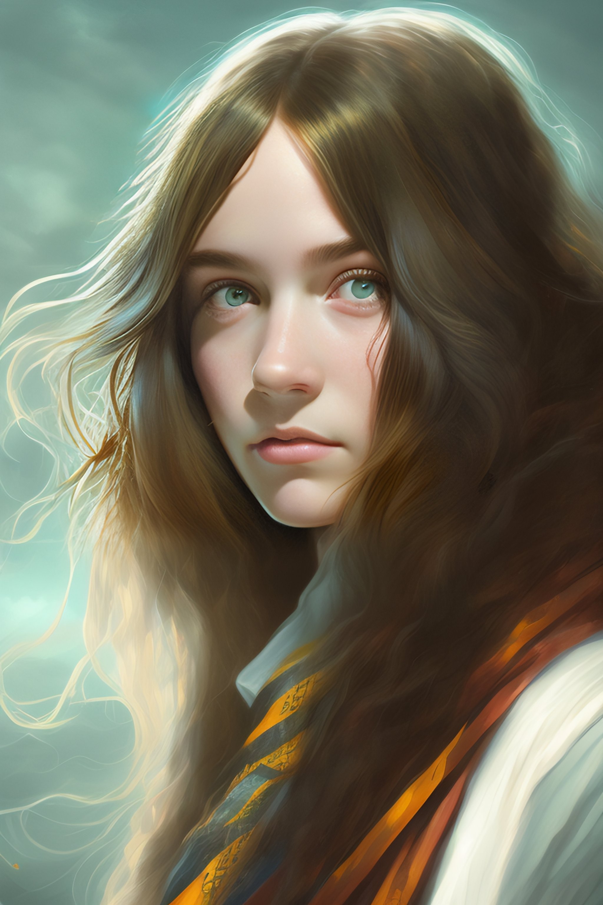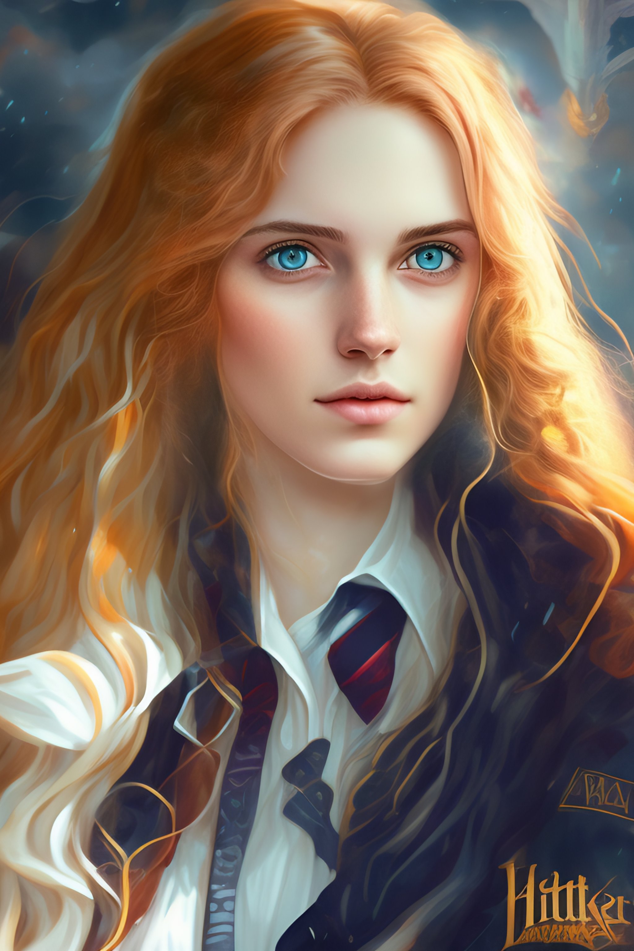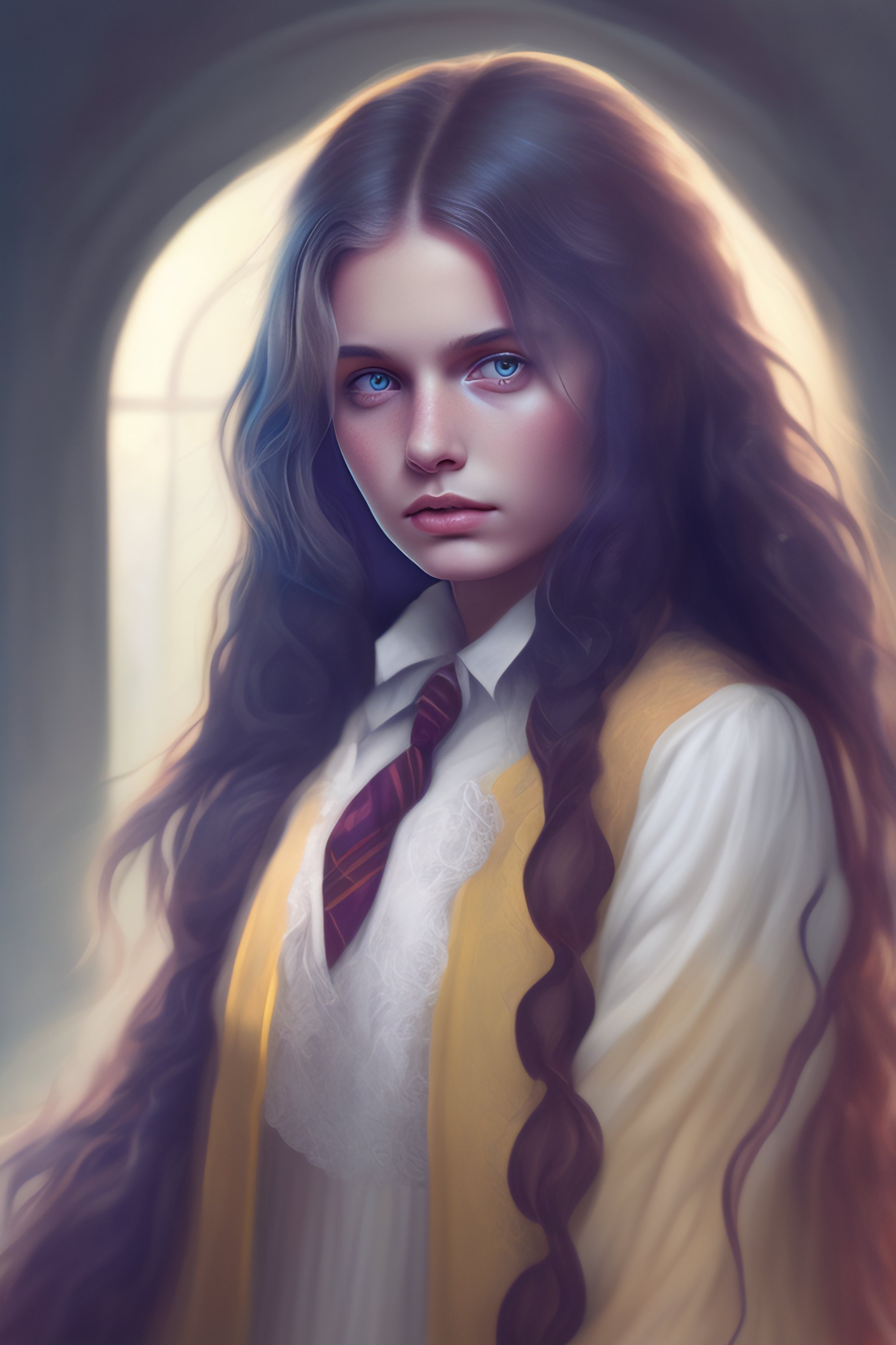 Girl, long hair, blone, white skin, blue eye, me as harry potter, in hogwarts, high details, hufflepuff
