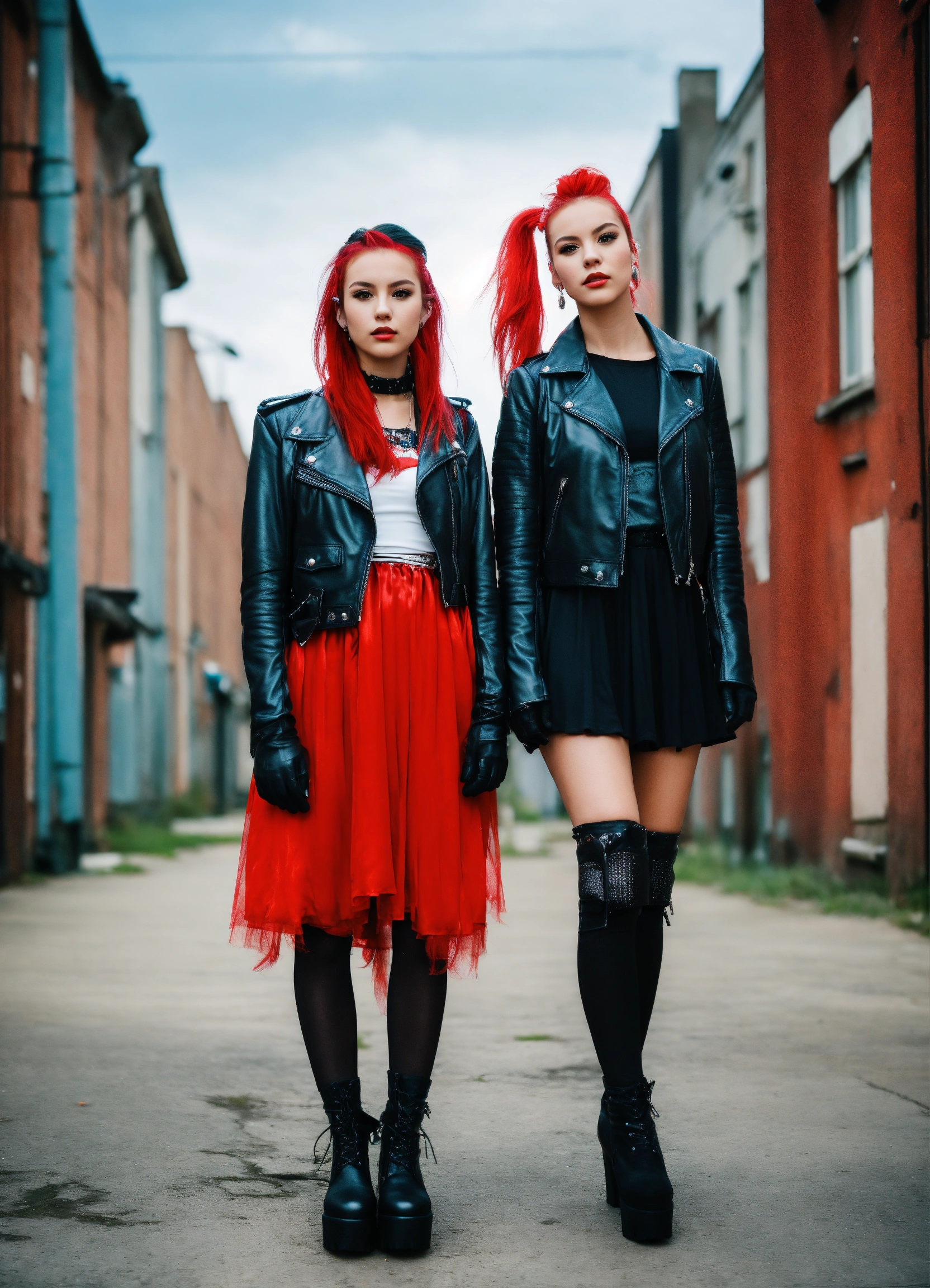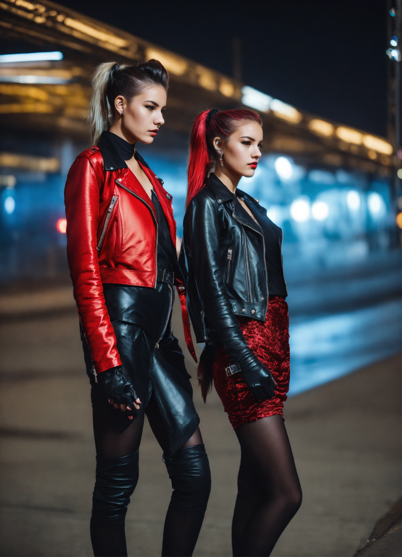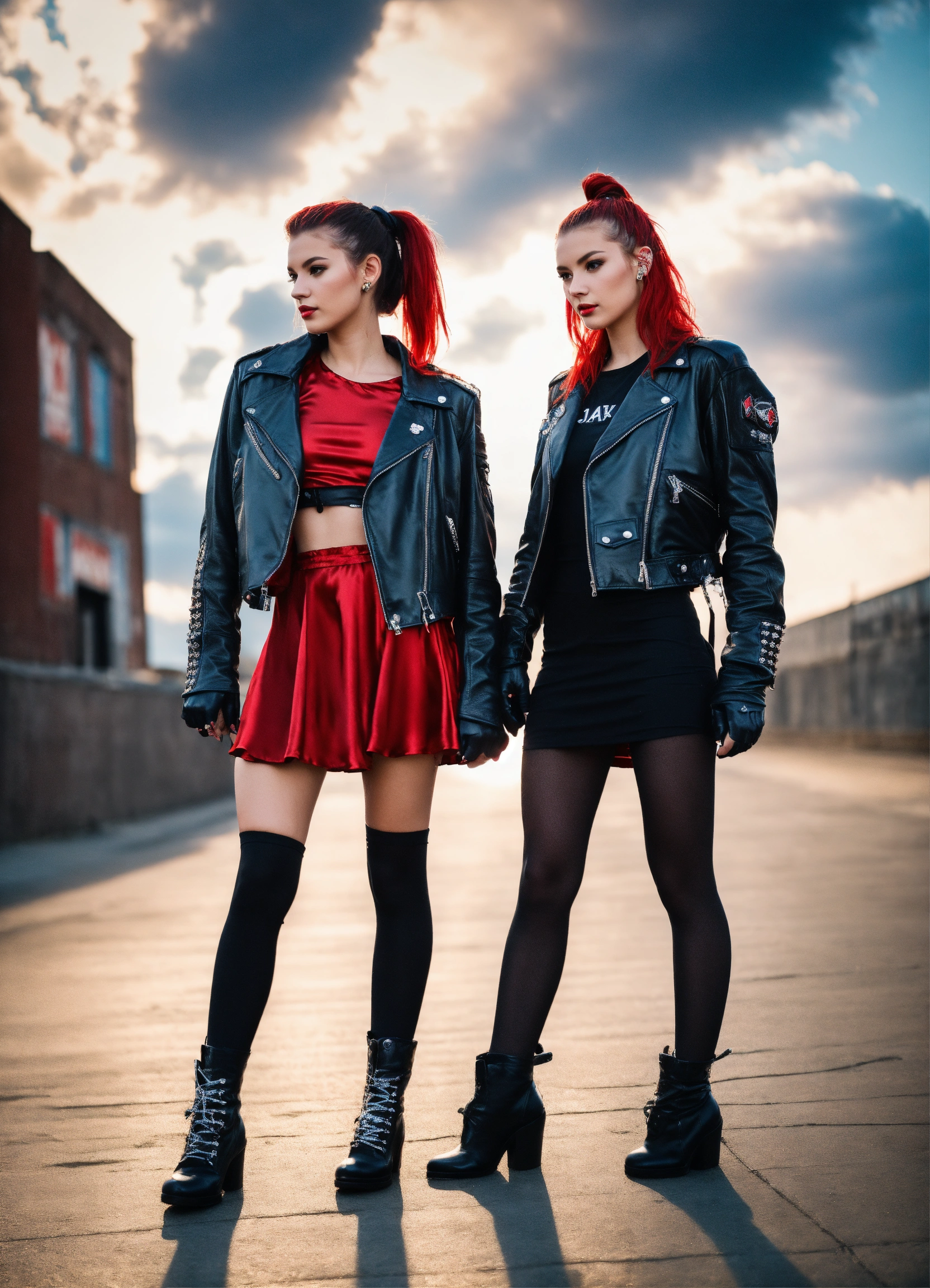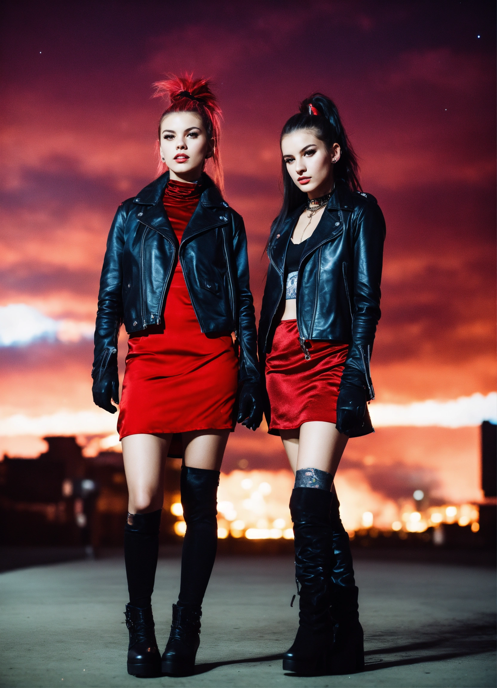 A real photo of two 25 year old punk girls with a ponytail hairstyle, long hair, wearing a short red satin dress and black leather jacket and gloves. urban background in the sky we see the galaxy. full body