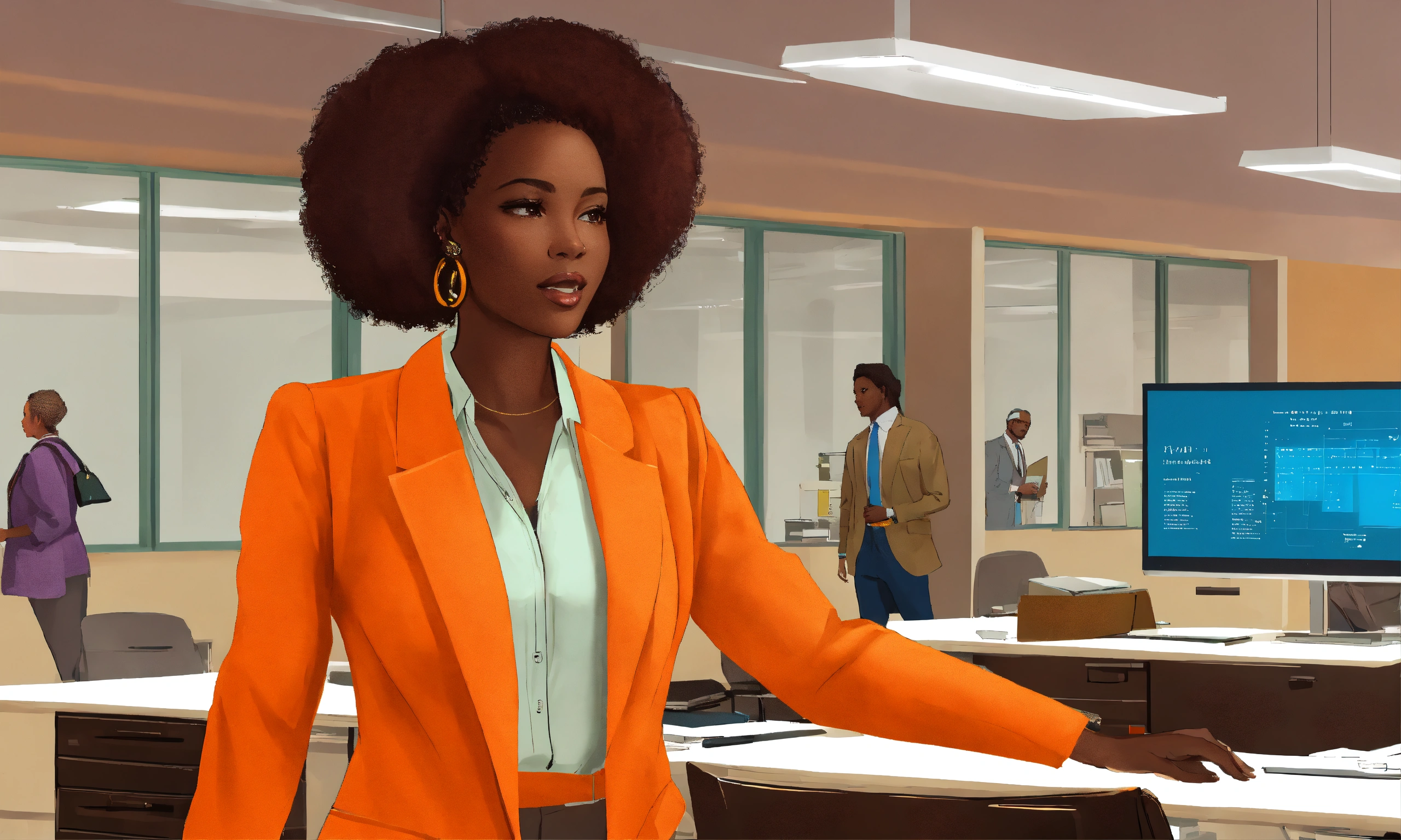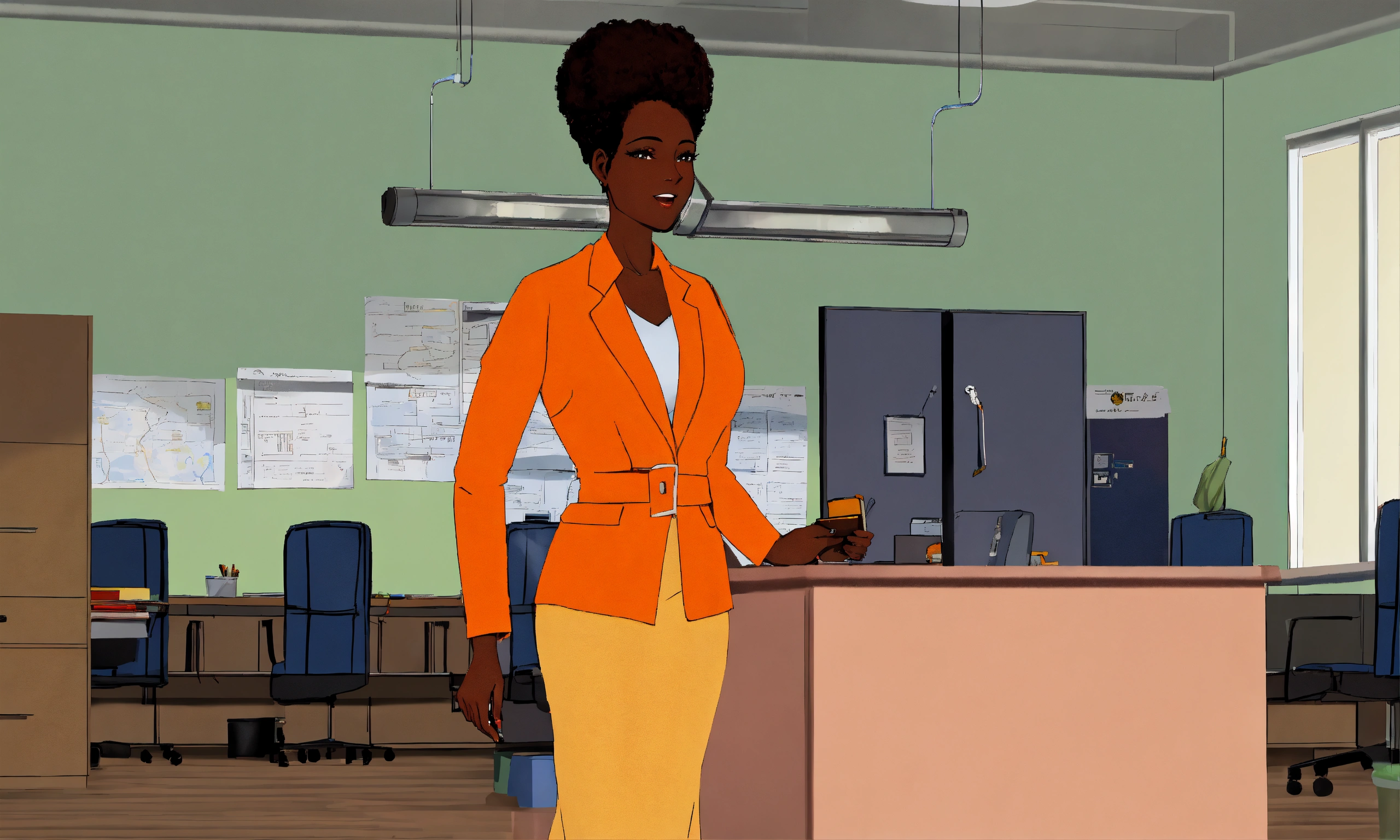 African woman age 40 waring orange coat