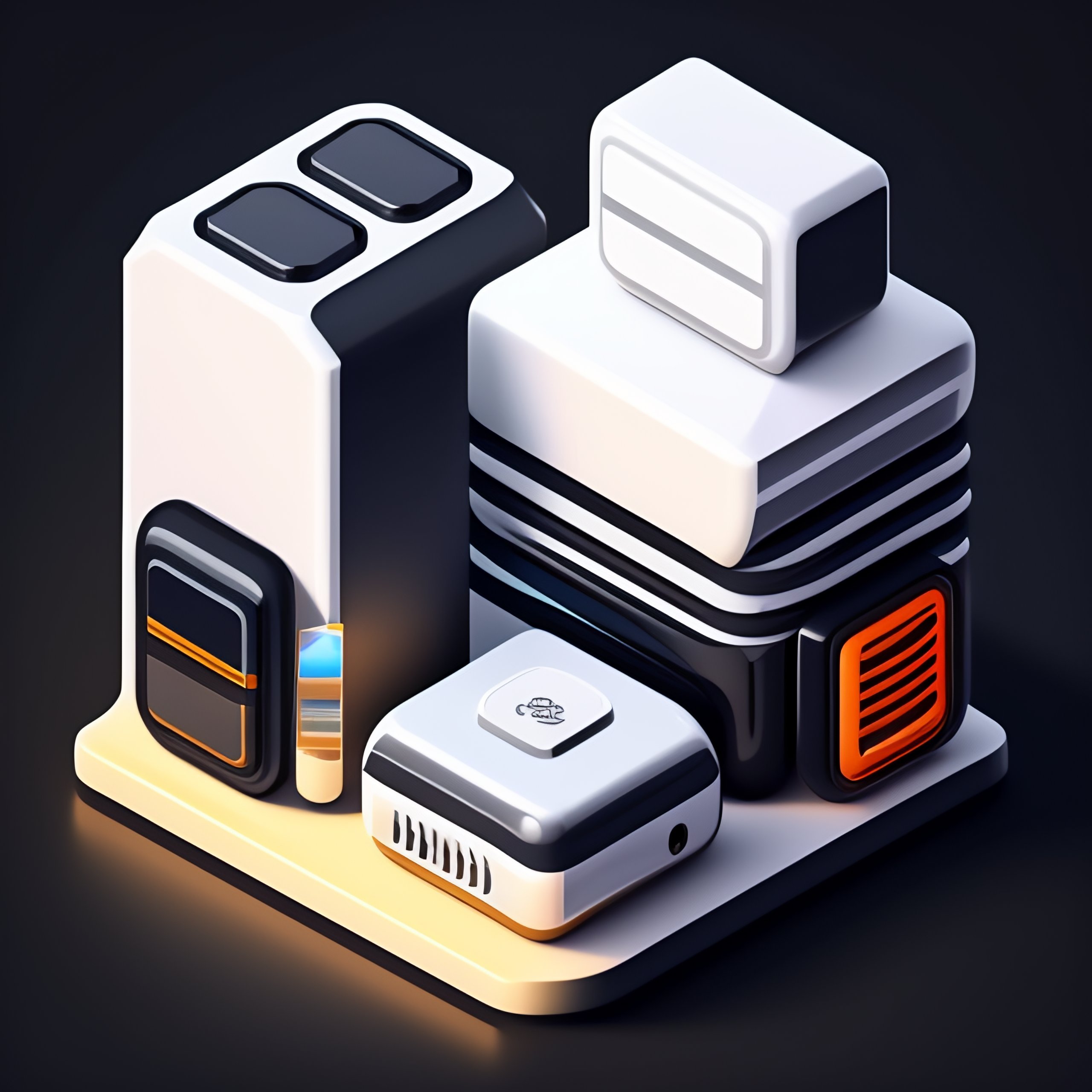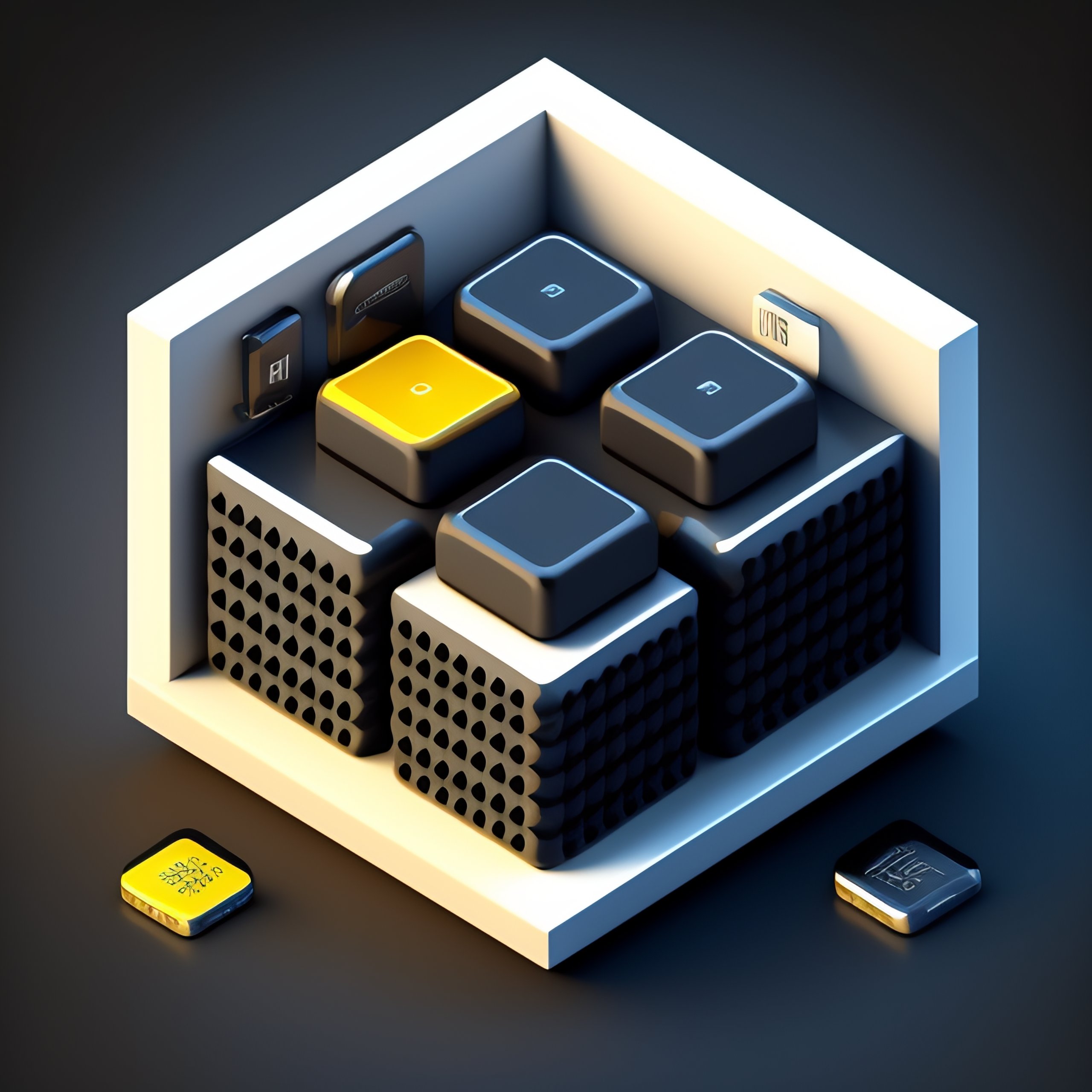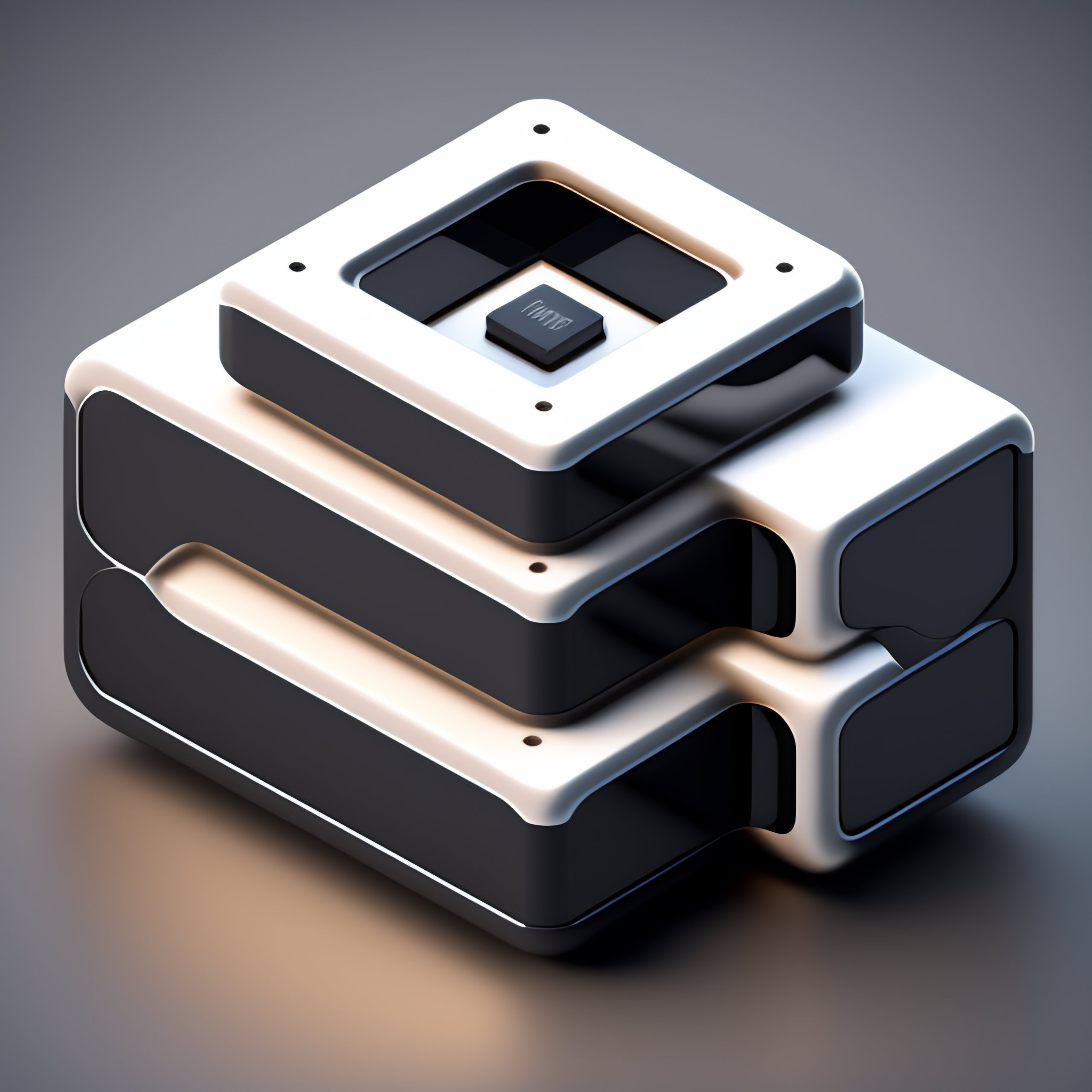 Hard disk storage array, isometric, low poly, ultra-details, vector art, surreal, 8k, no raytracing, dual tone, black and white, black background